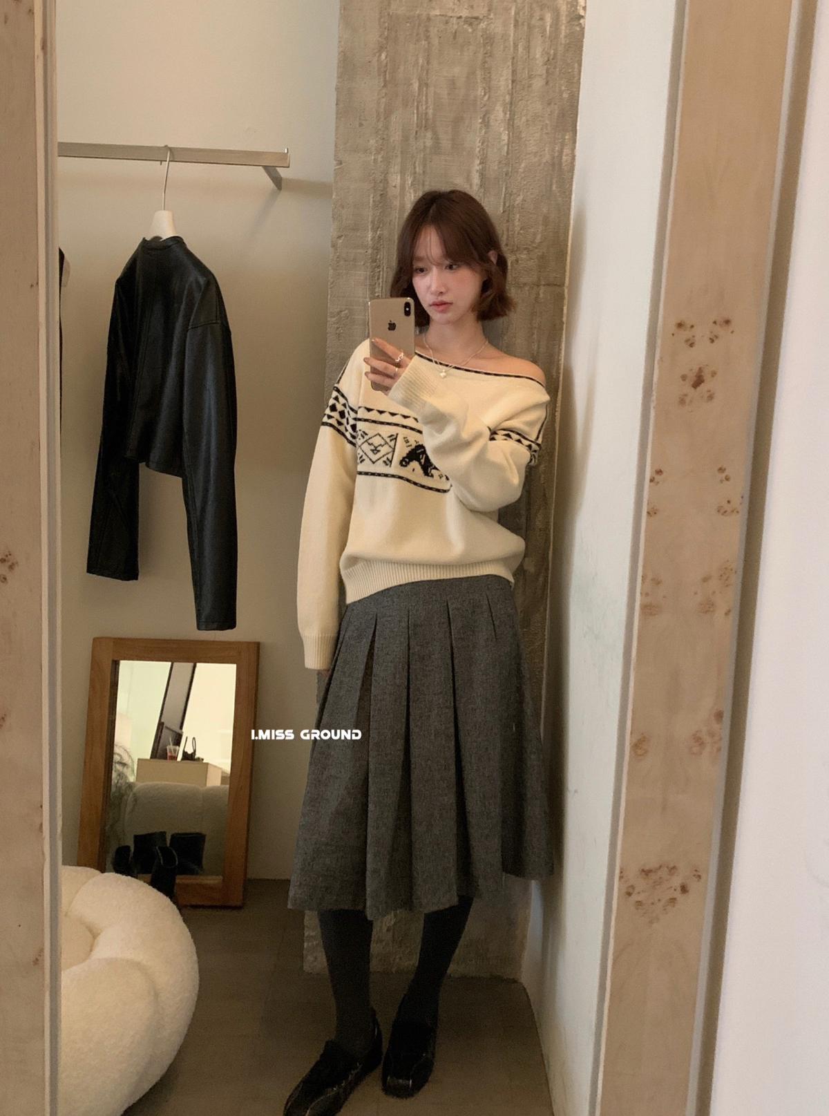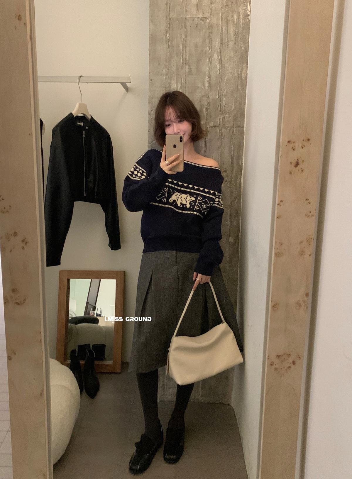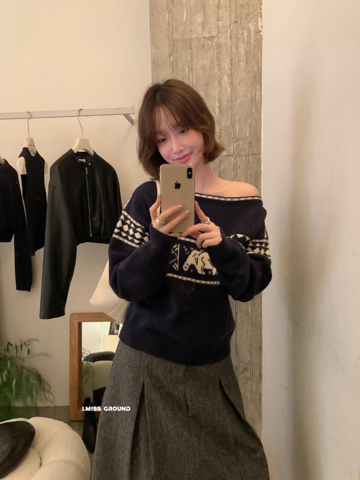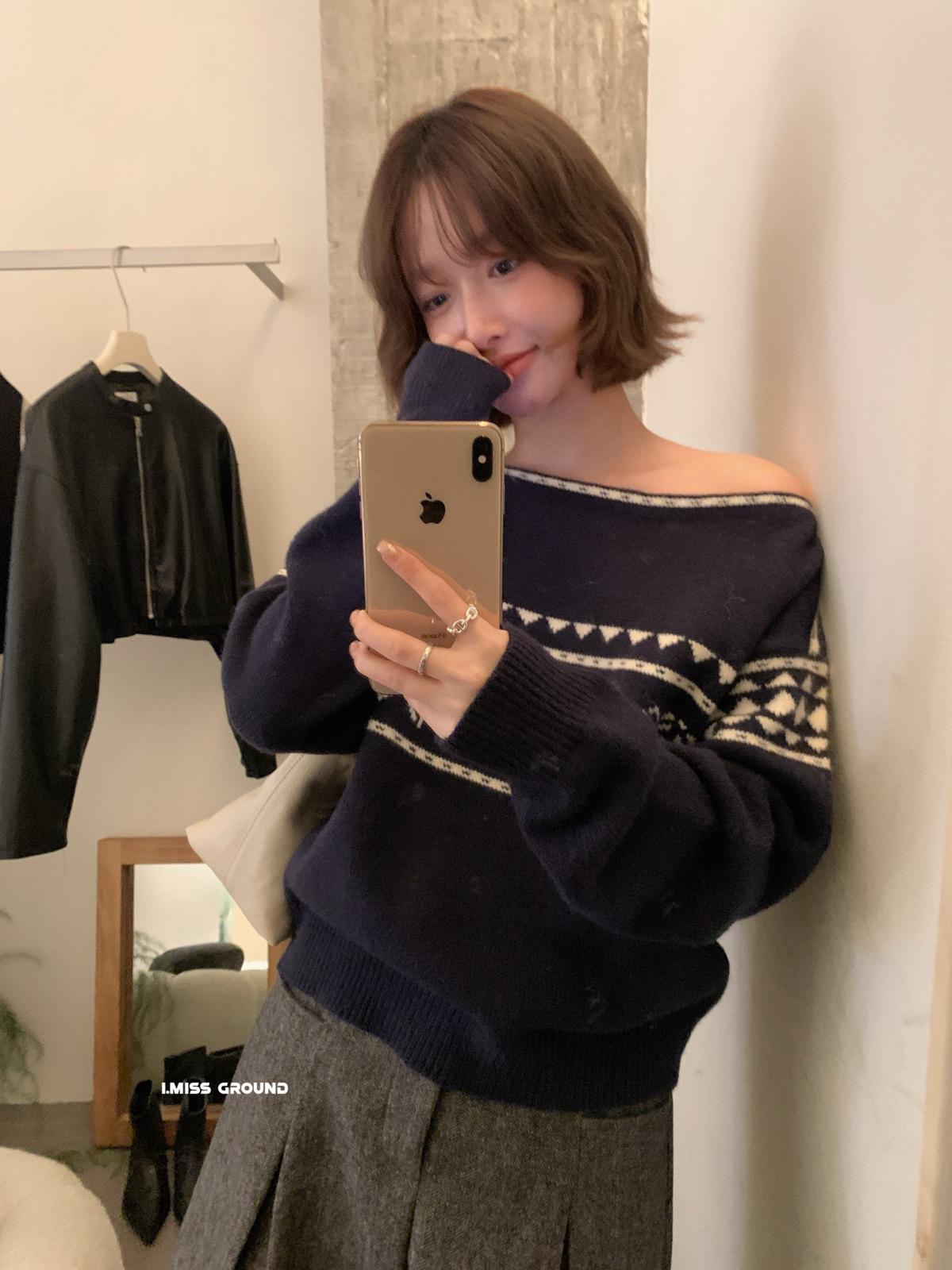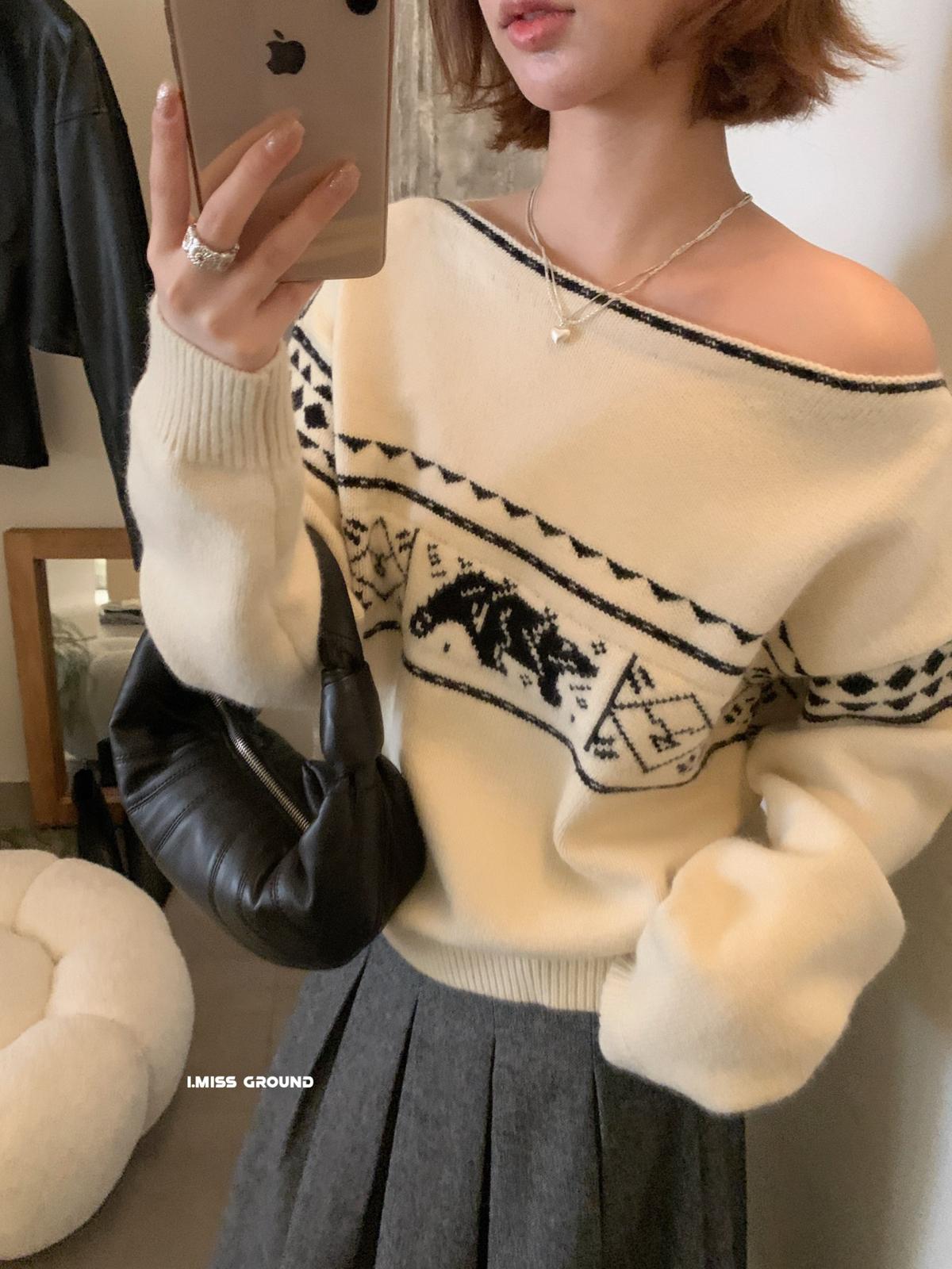 【C7868】聖誕款!兩穿復古提花斜肩保暖毛衣