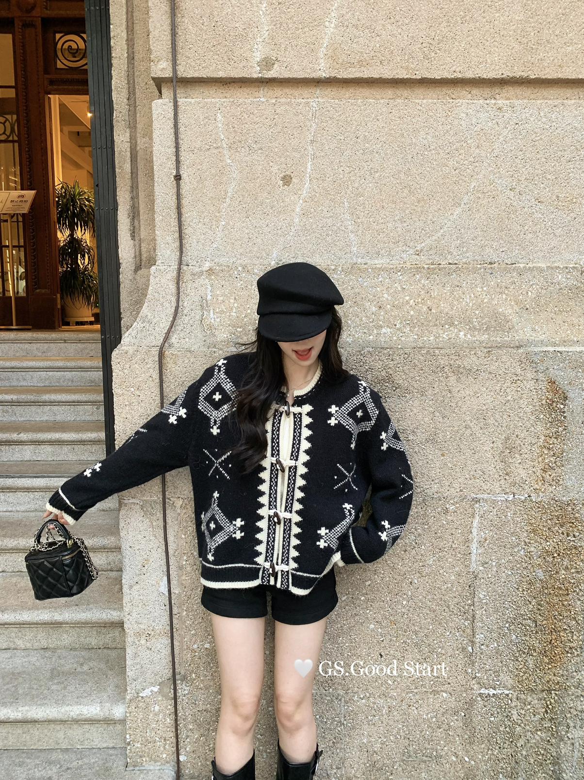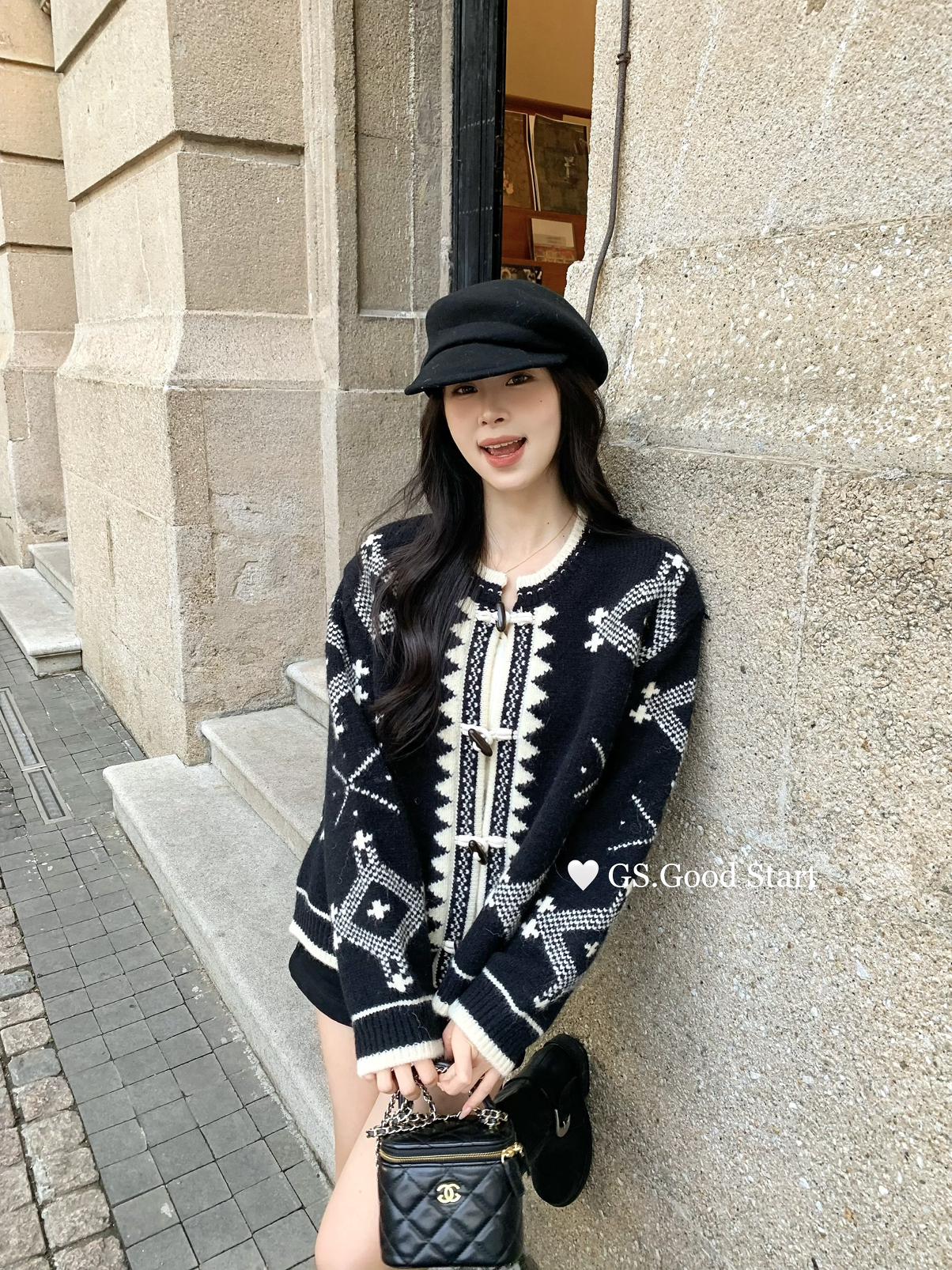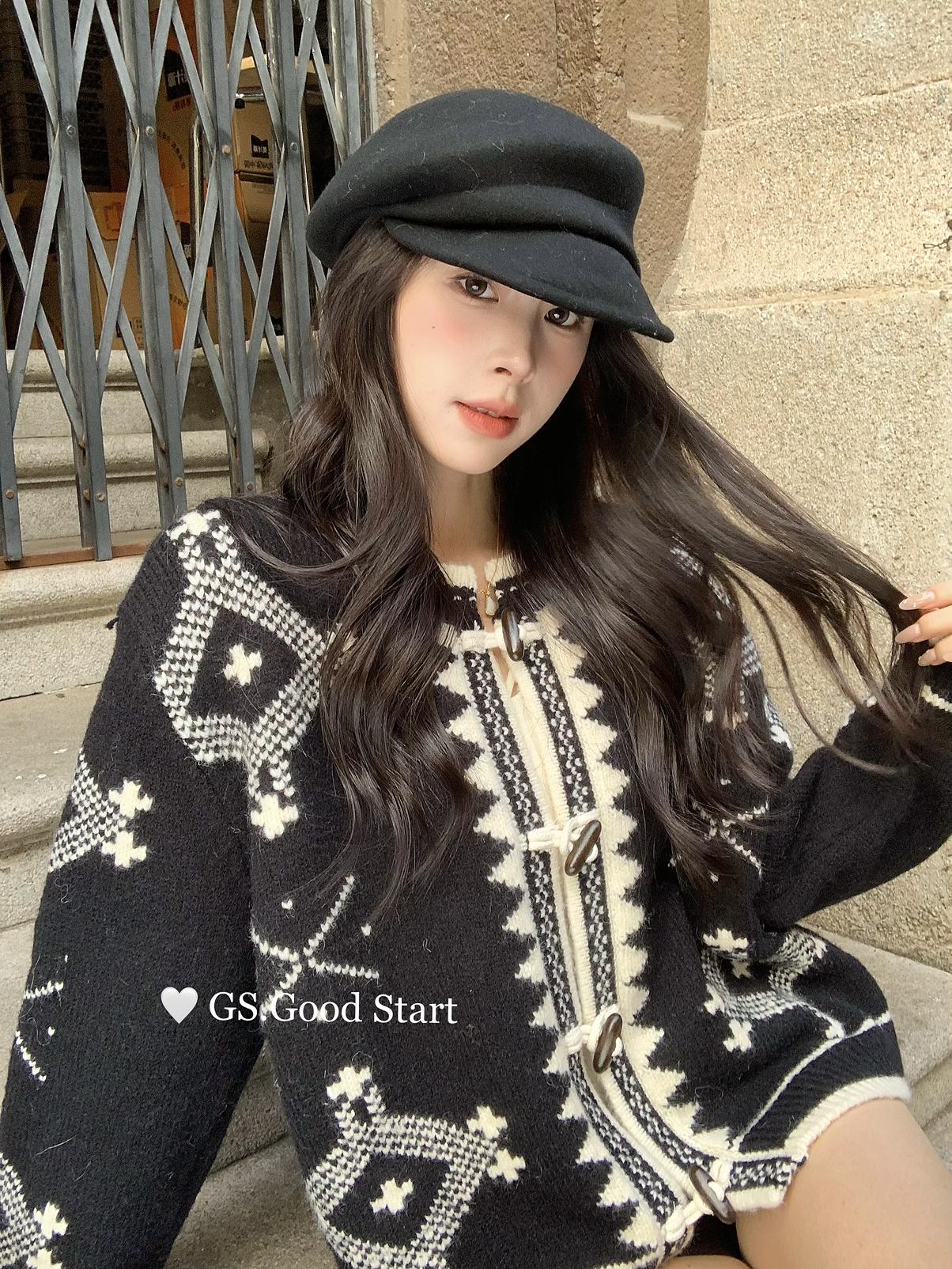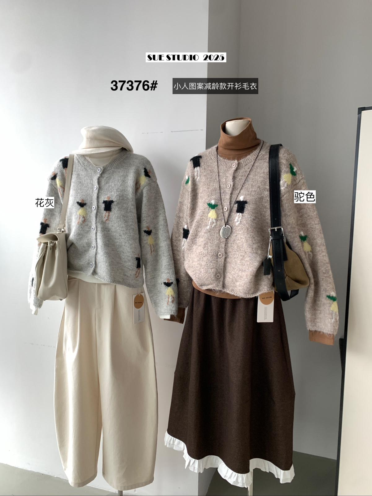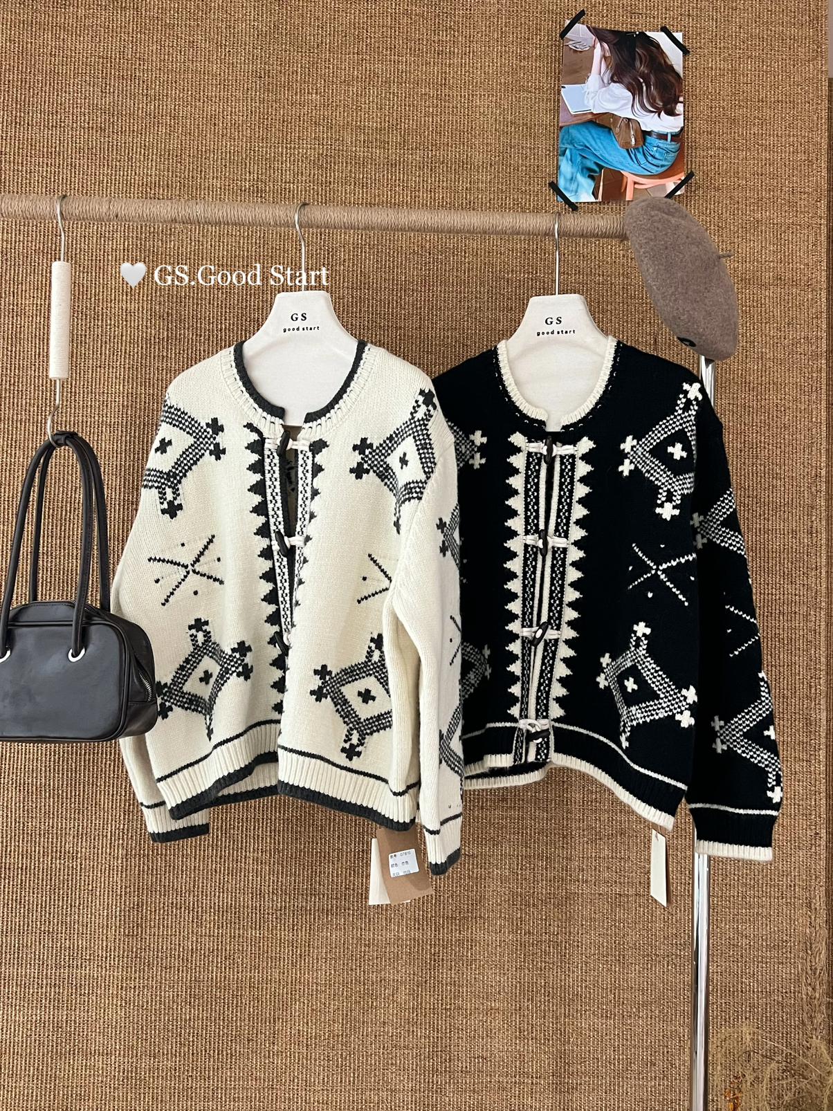 【C7928】韓系復古小人拼色圖案保暖開衫保暖毛衣