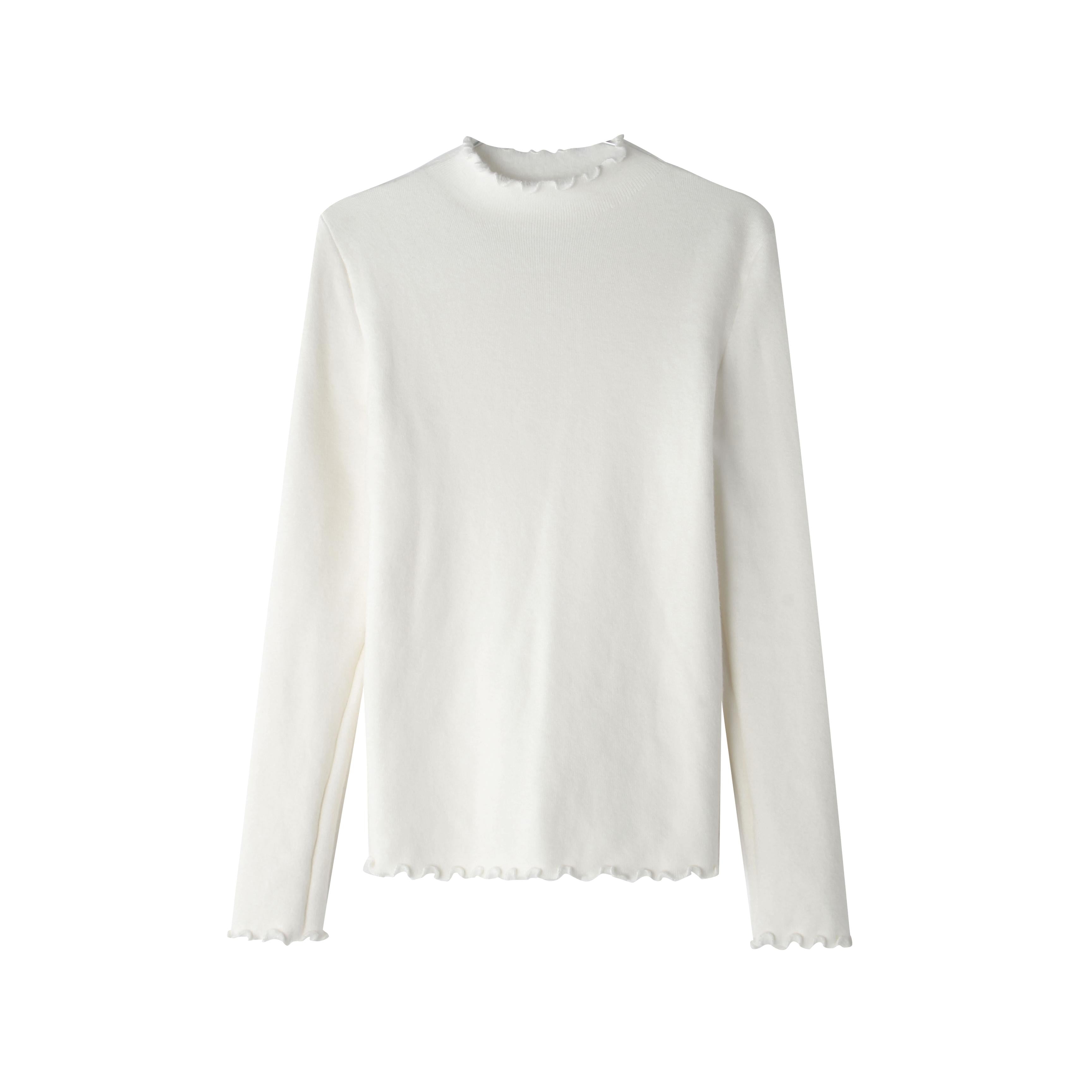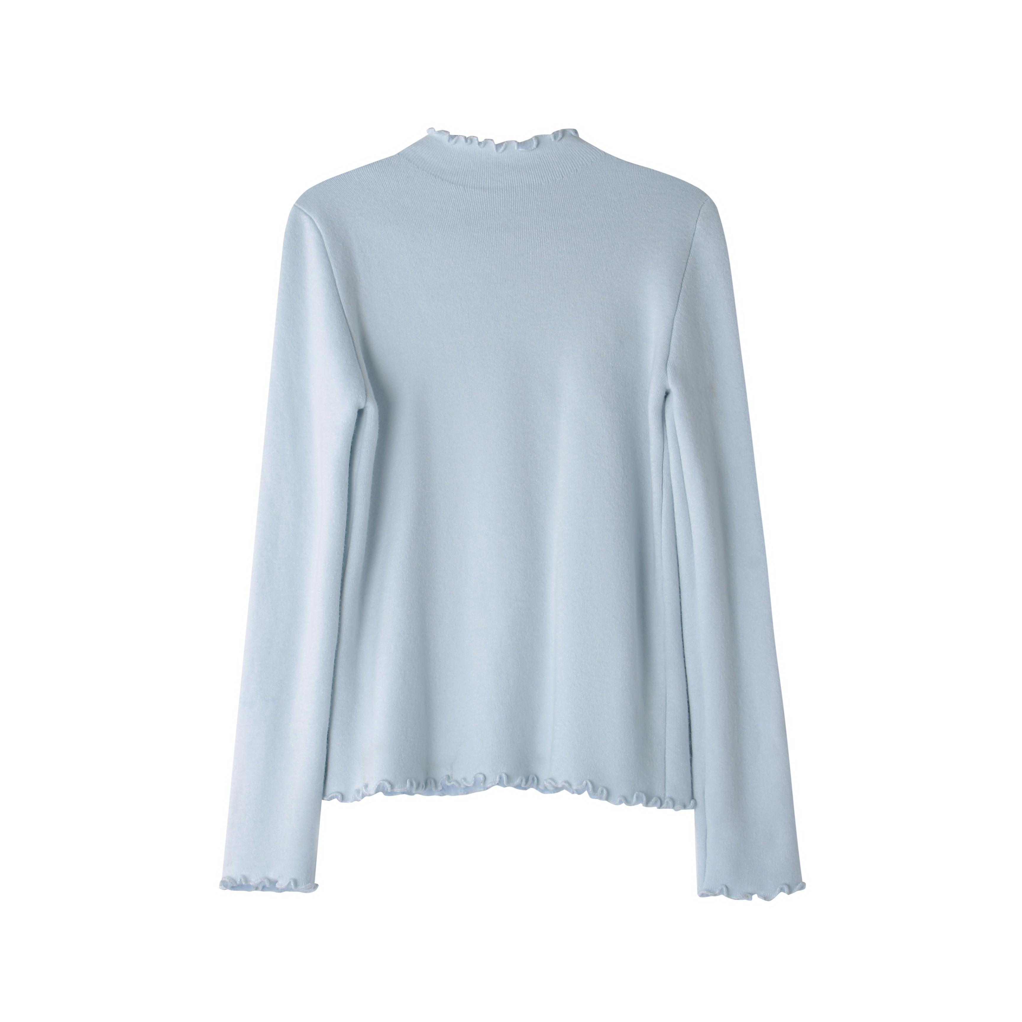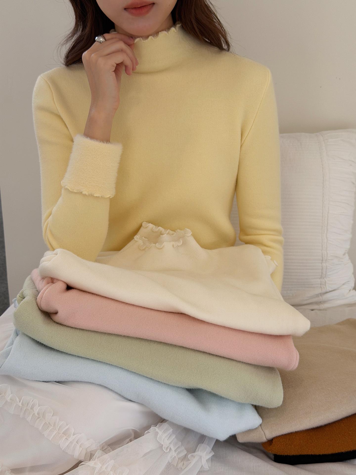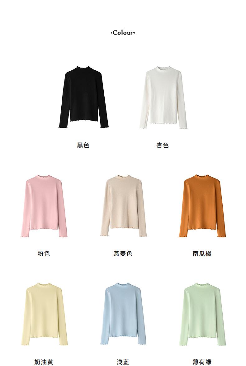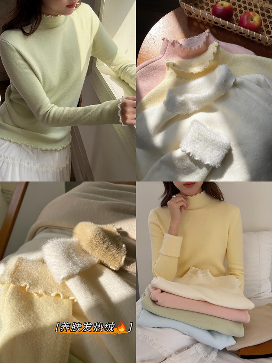 【C7924】冬上新!法式復古木耳邊加絨半高領內搭T恤打底衫