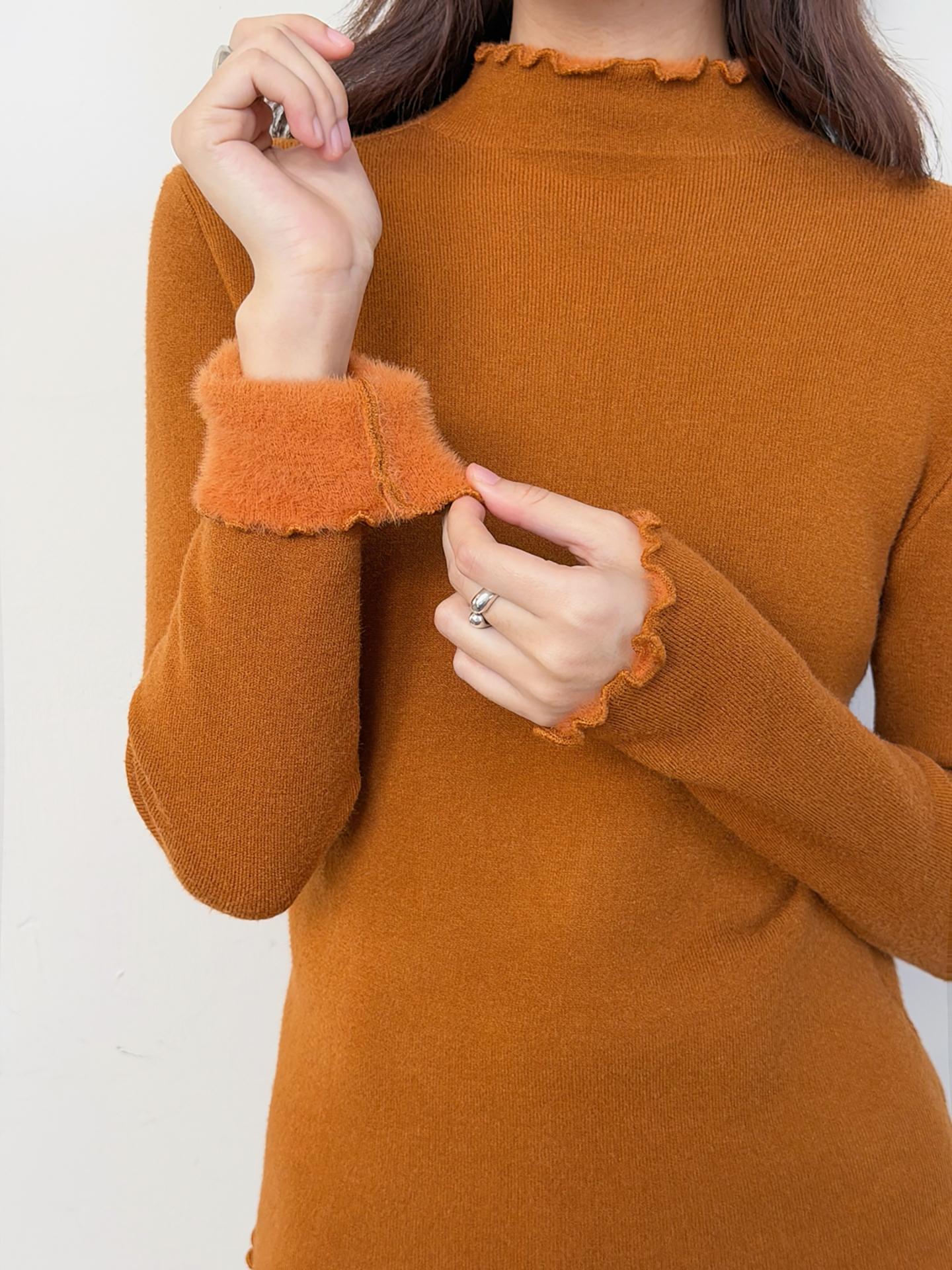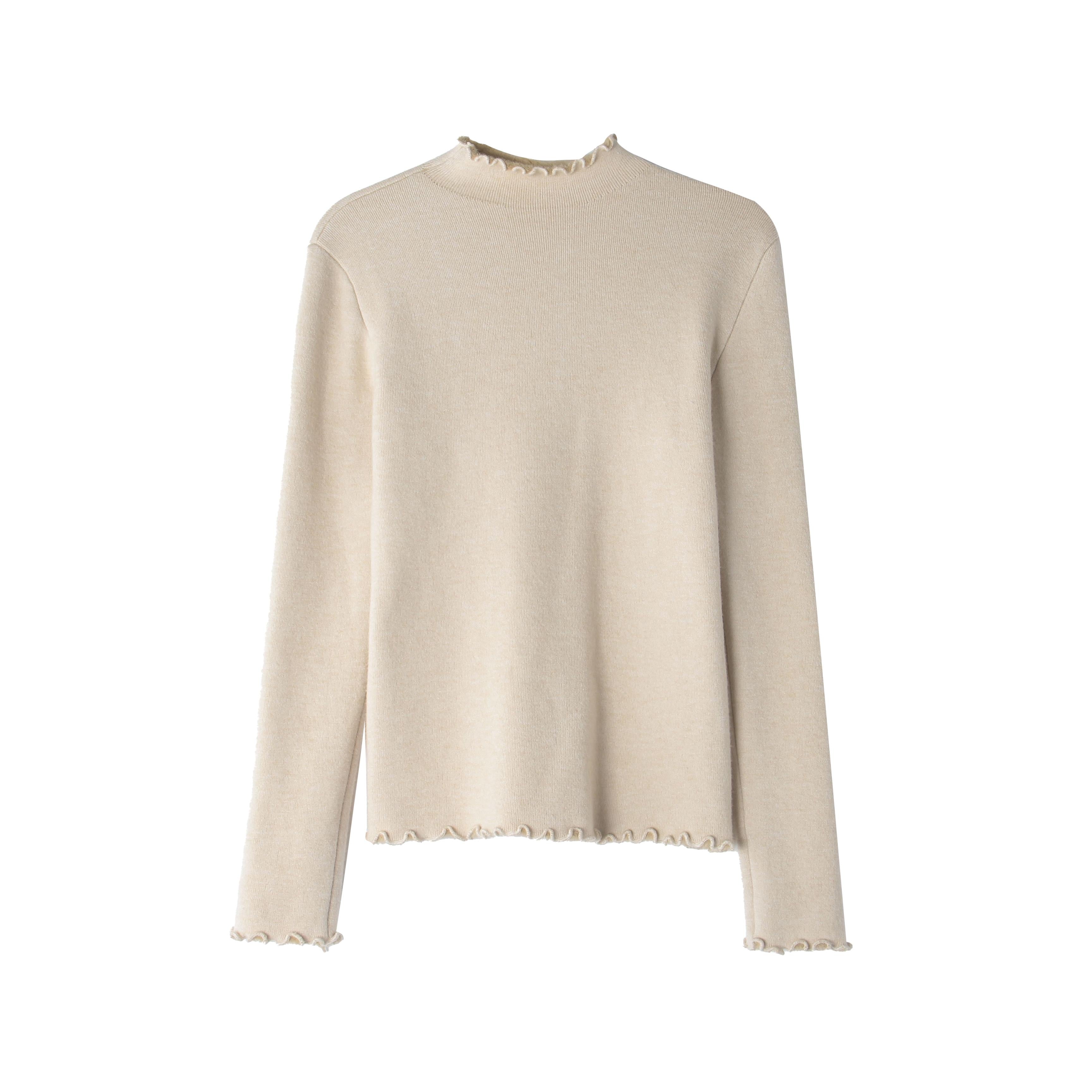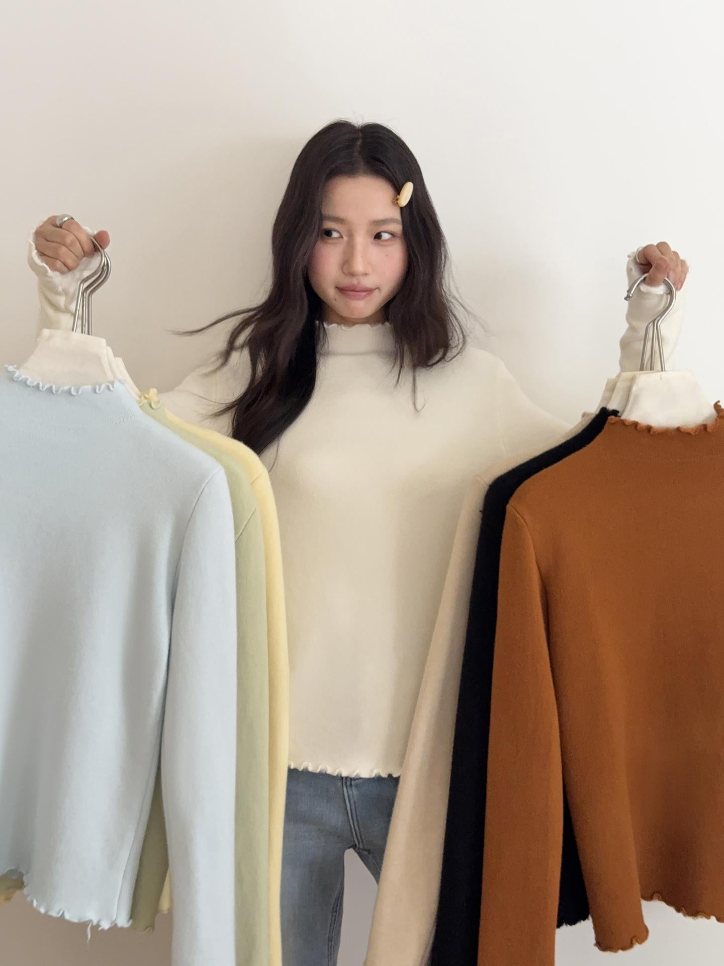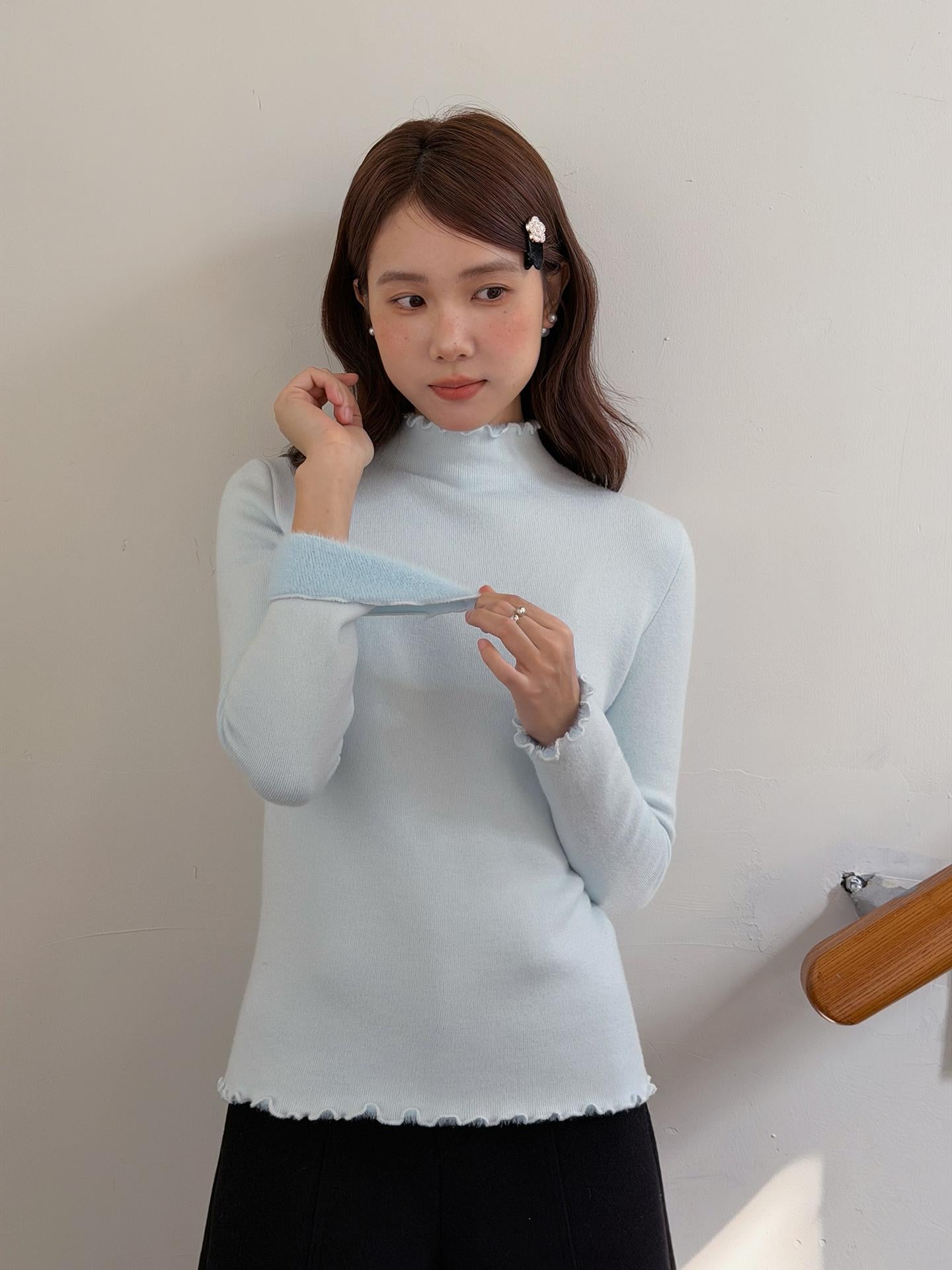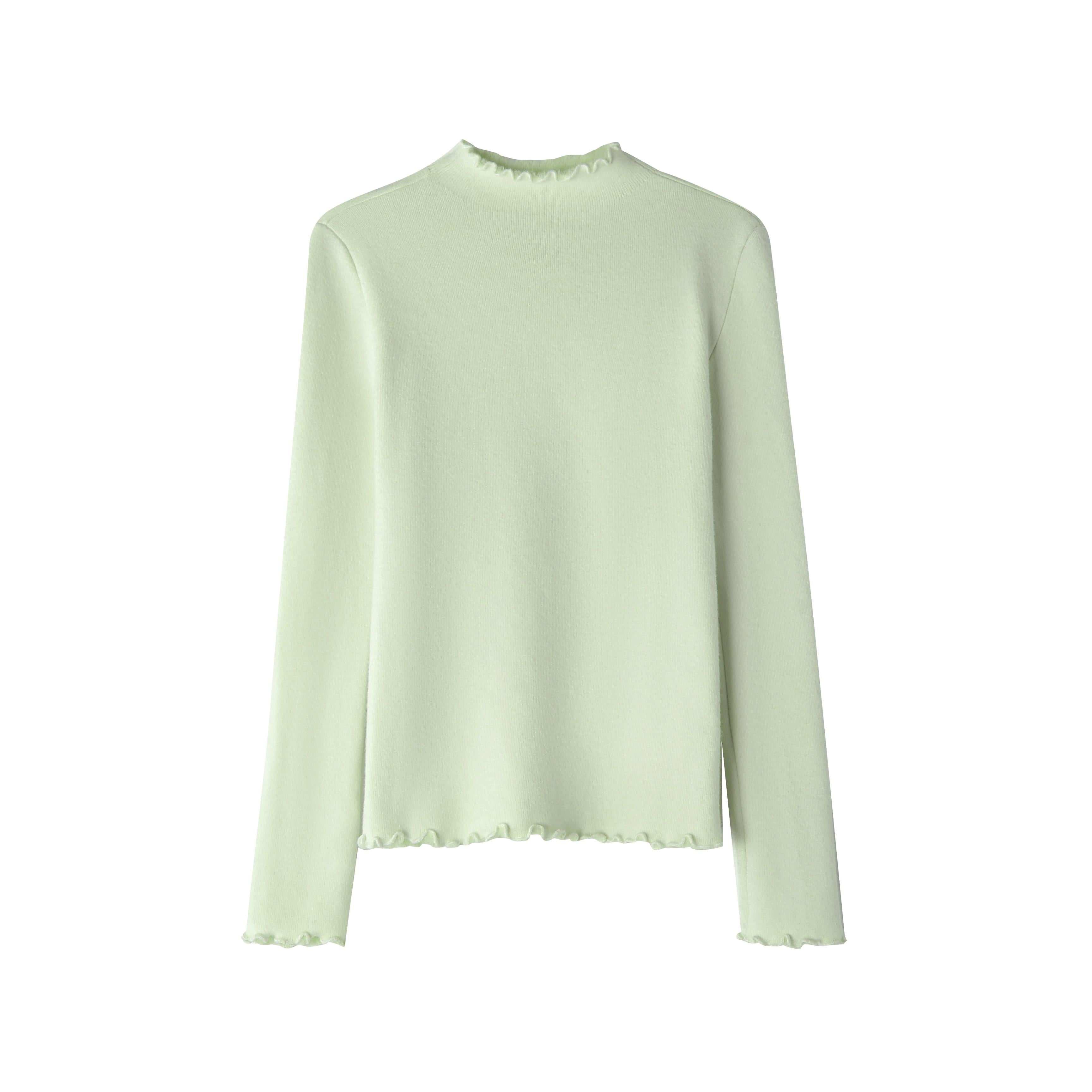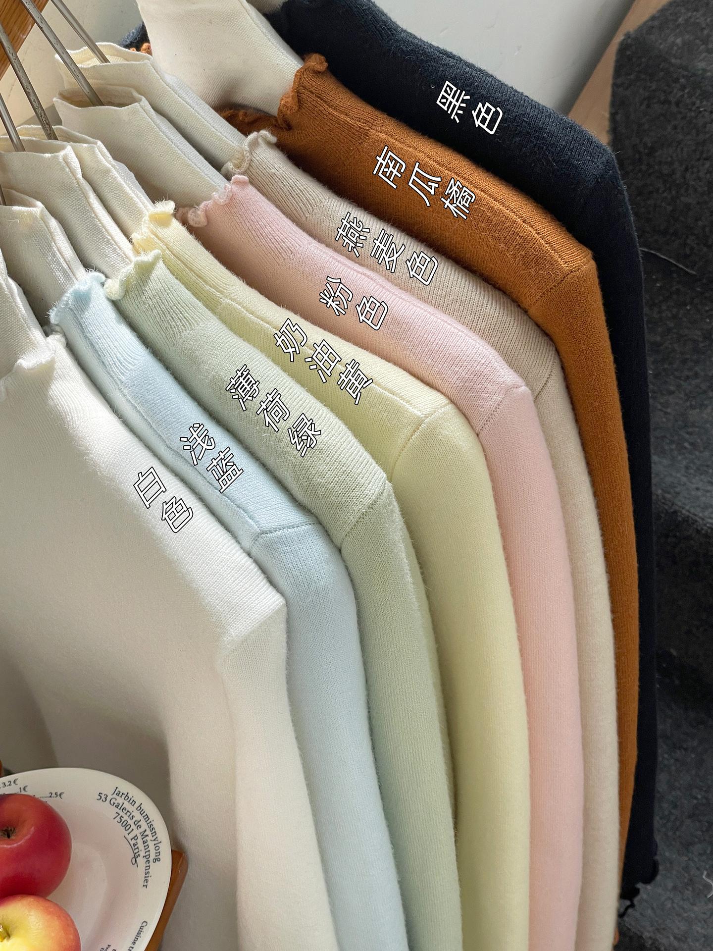 【C7924】冬上新!法式復古木耳邊加絨半高領內搭T恤打底衫