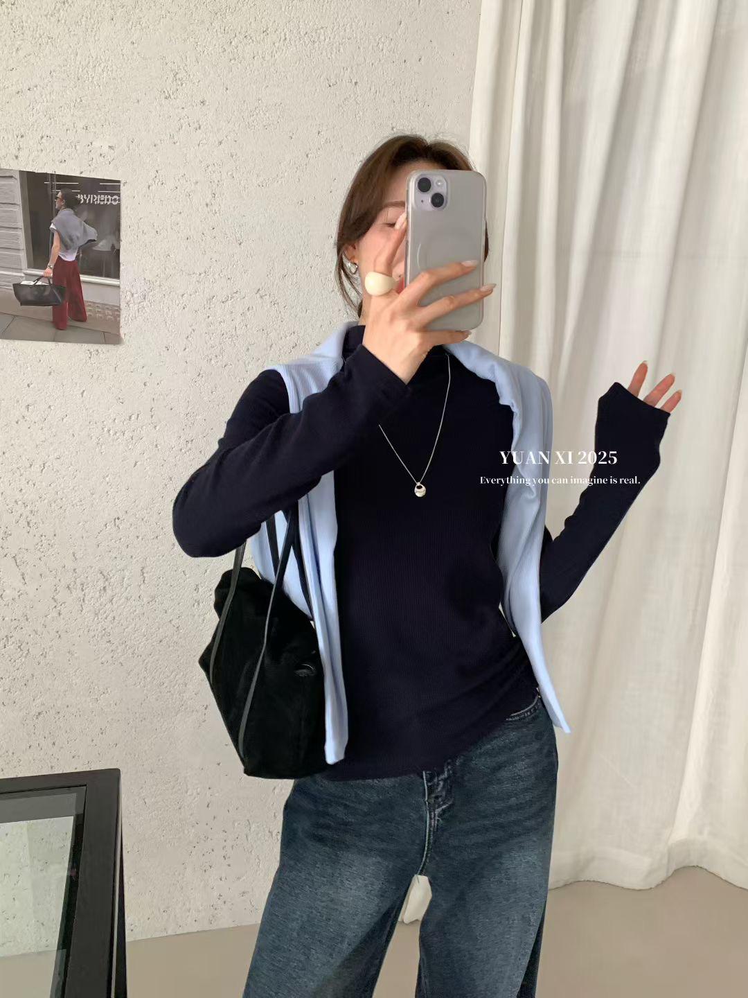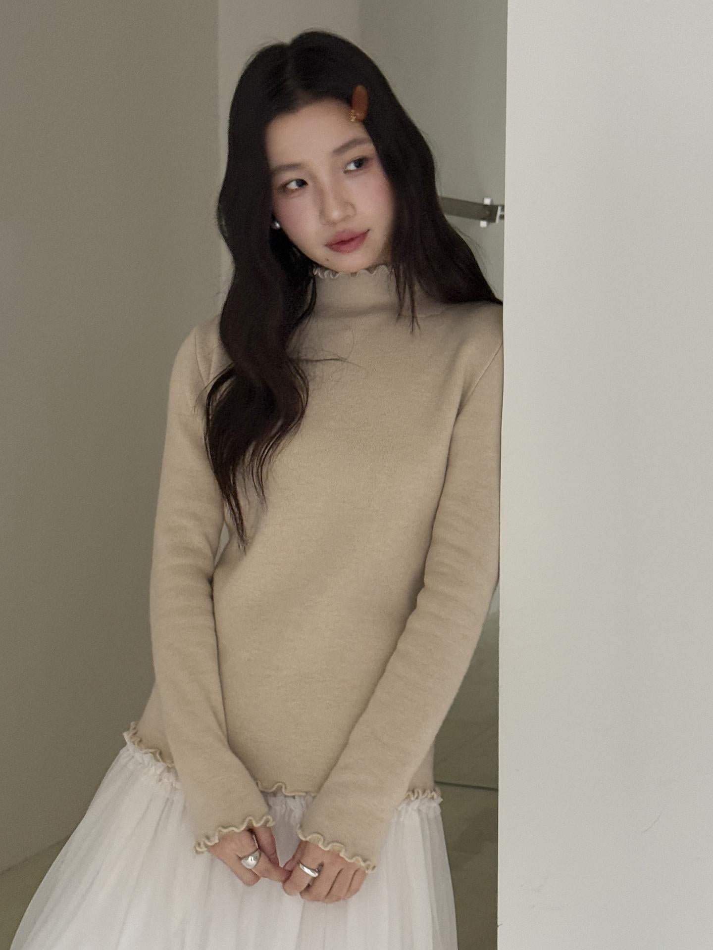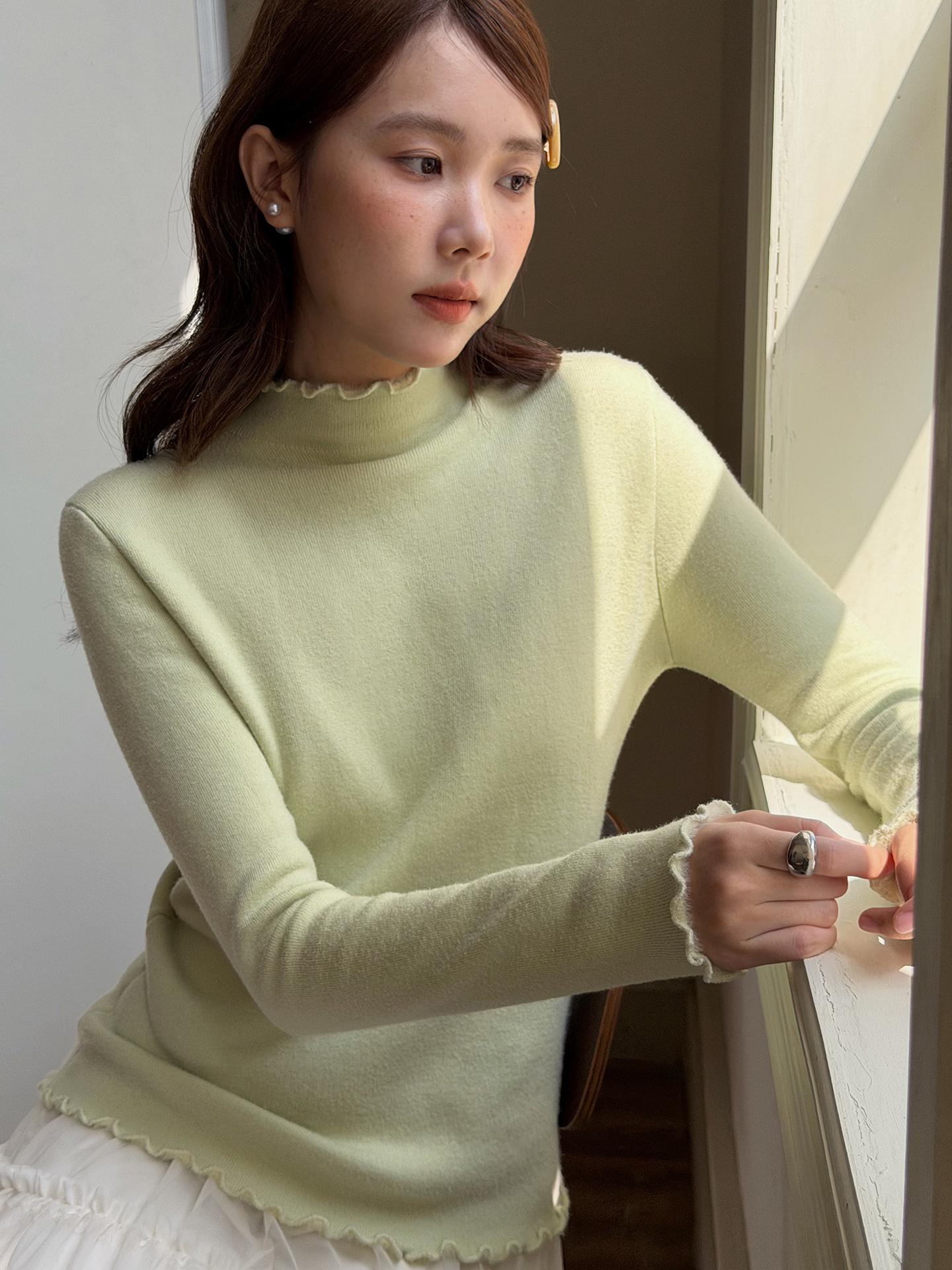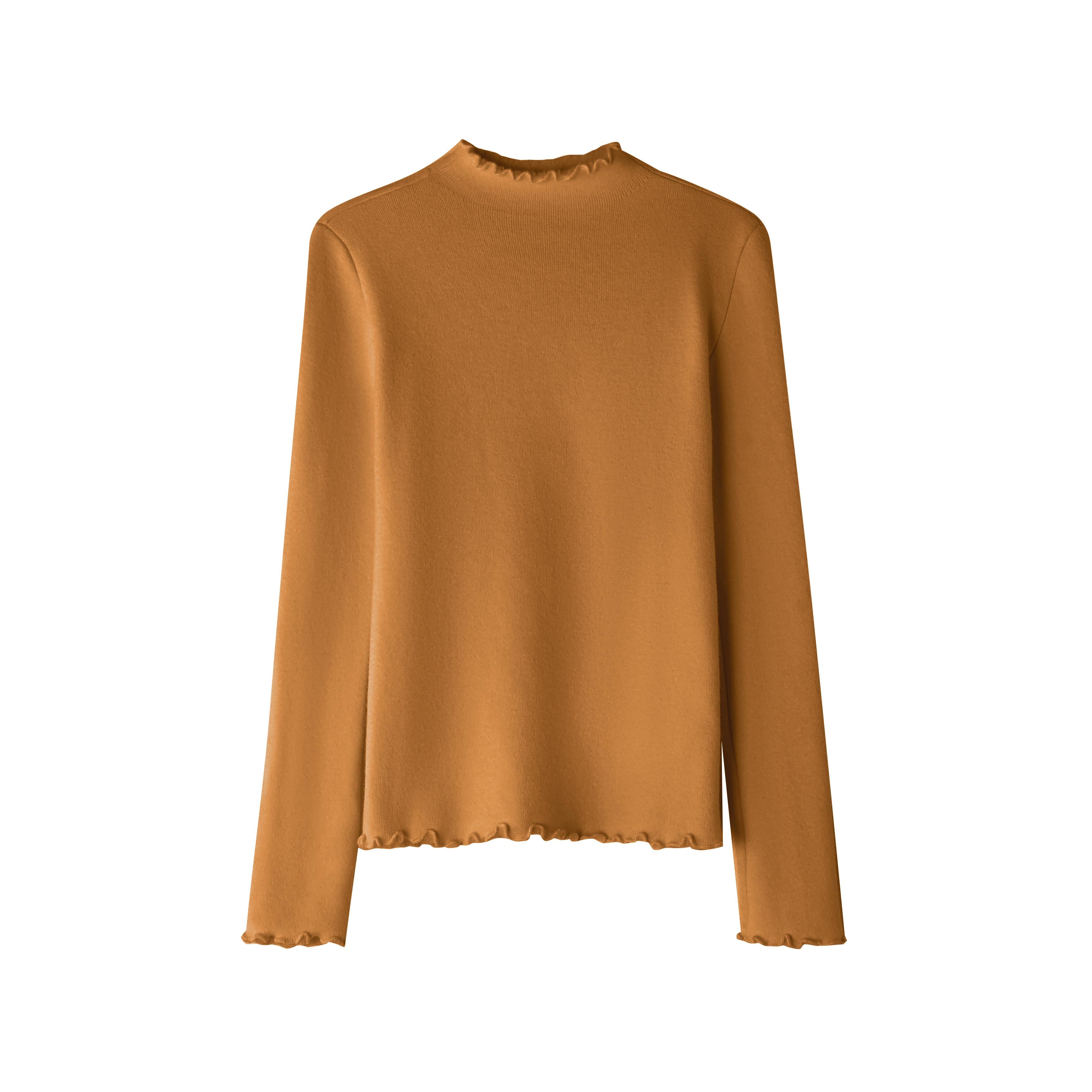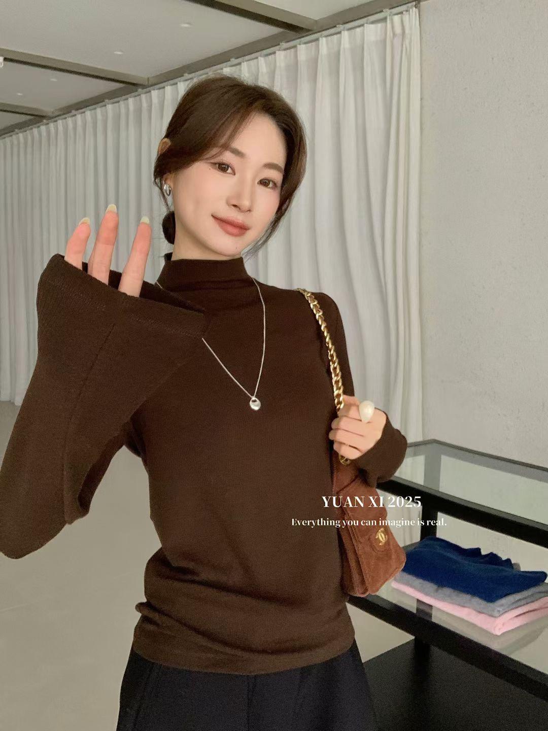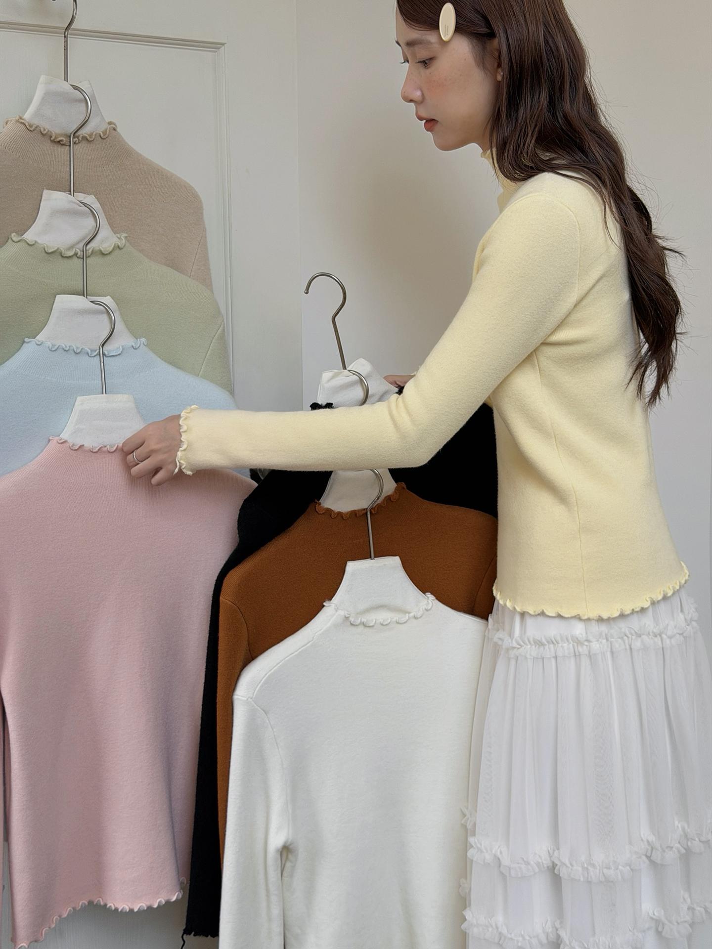 【C7924】冬上新!法式復古木耳邊加絨半高領內搭T恤打底衫
