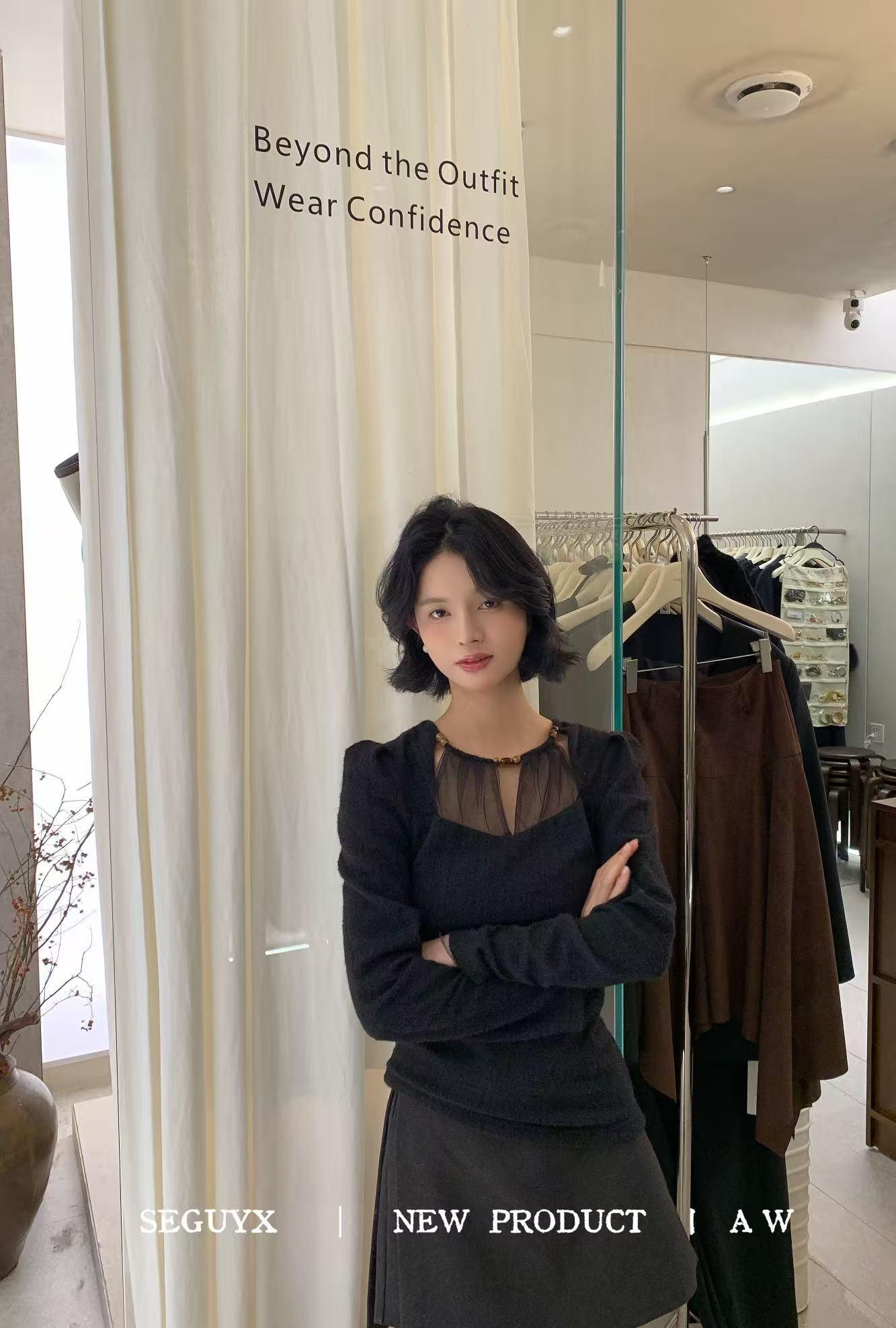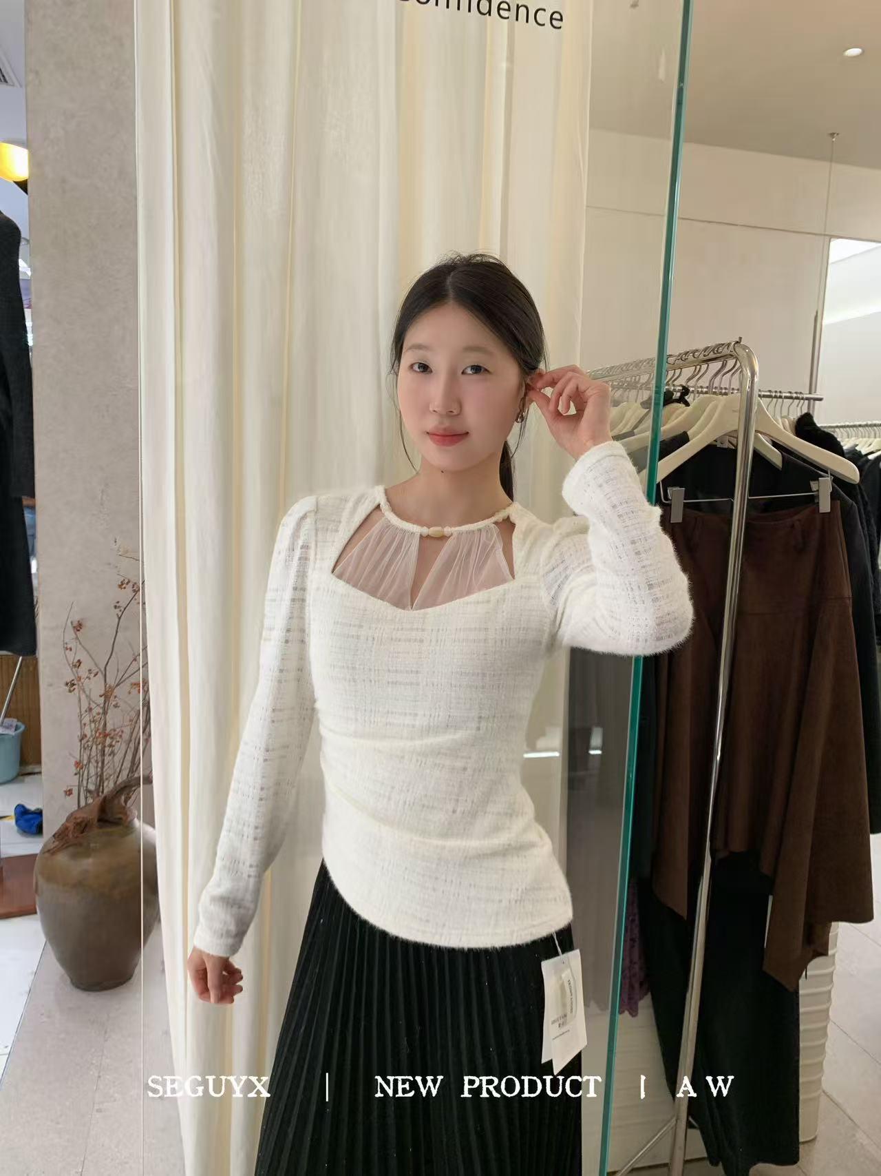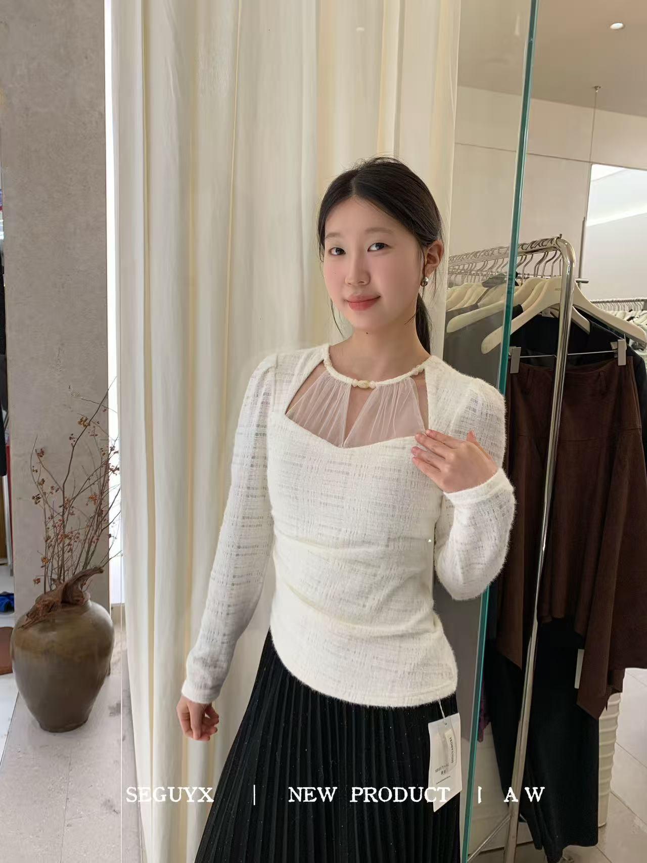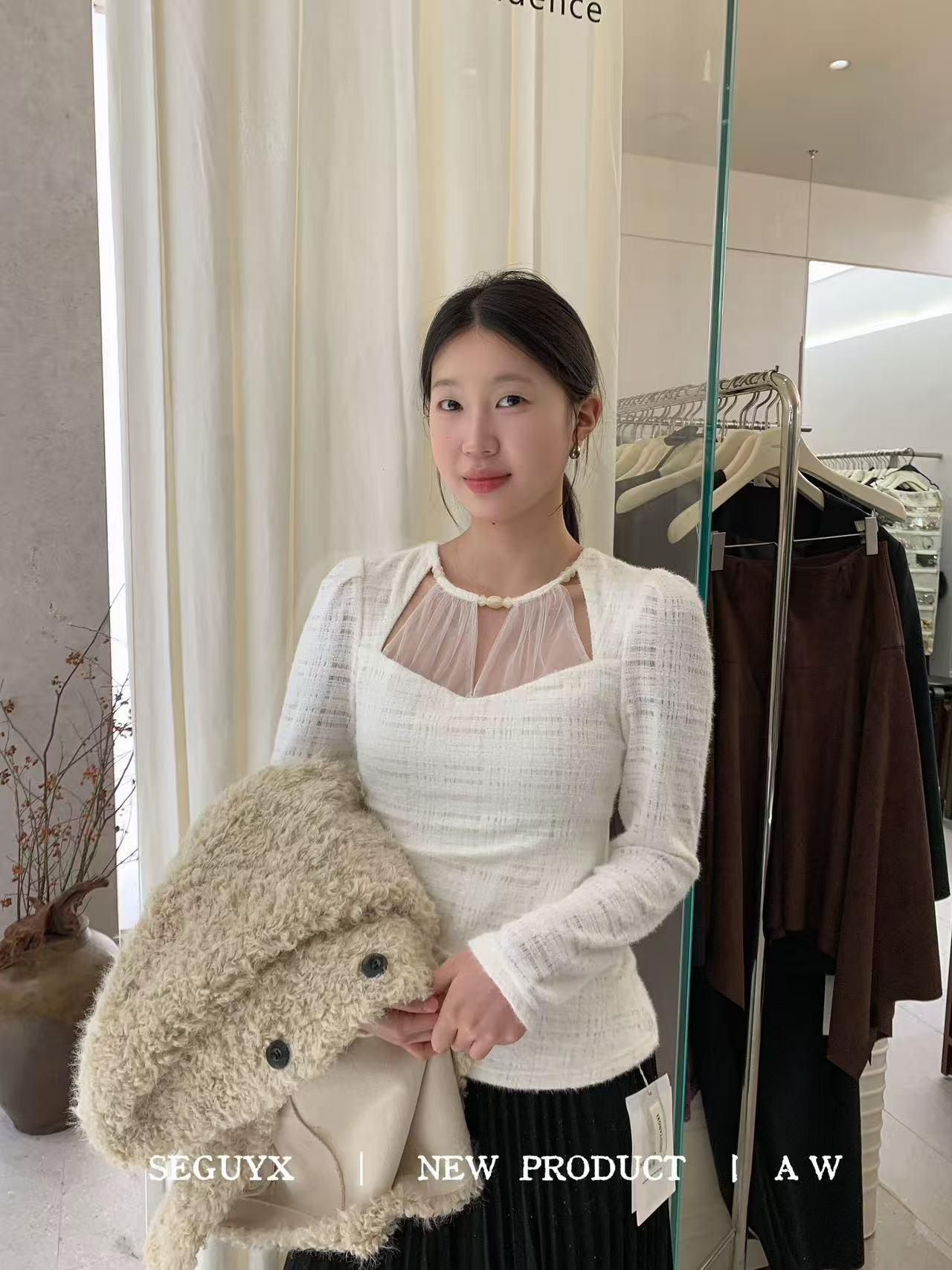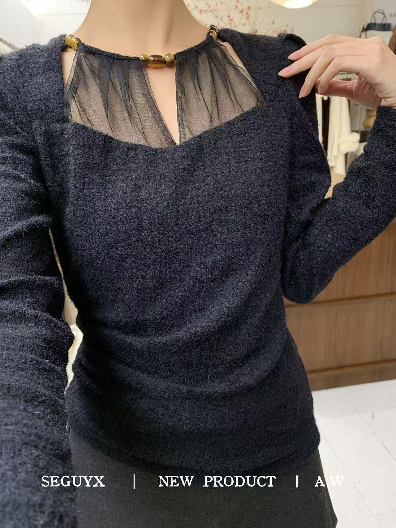 【C7934】冬上新法式純欲風小衆設計感網紗拼接長袖打底小衫