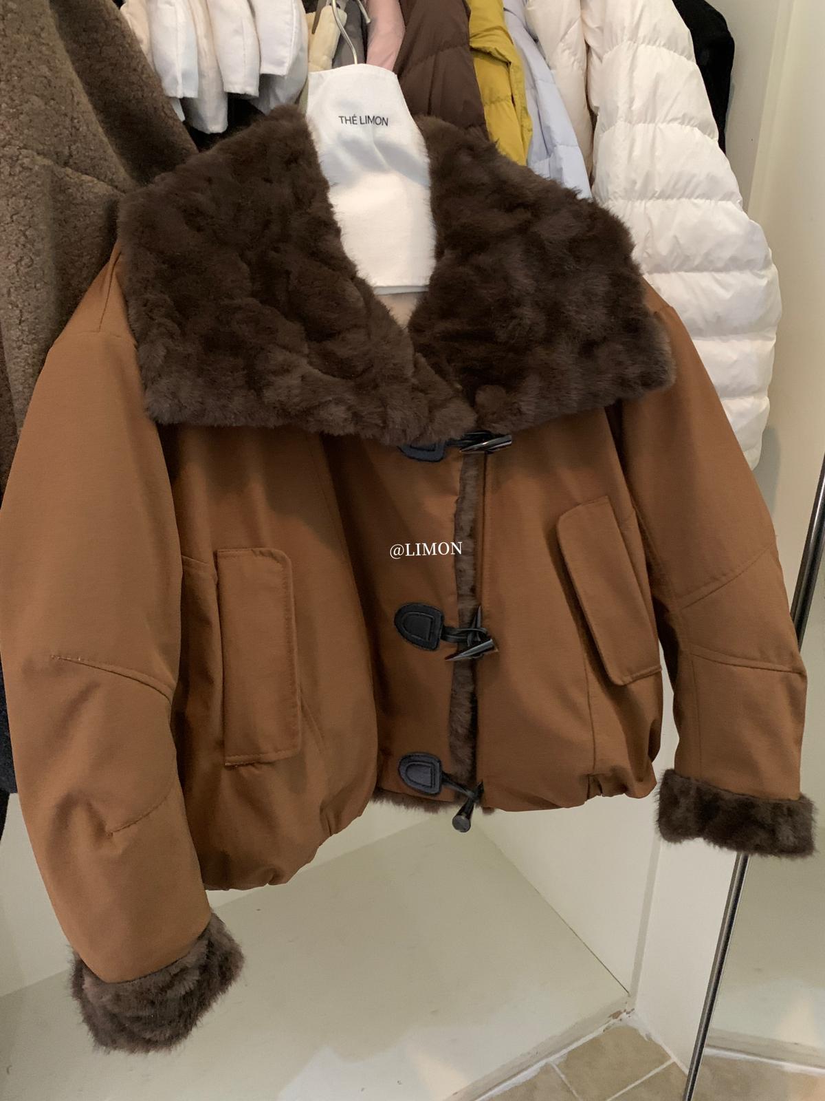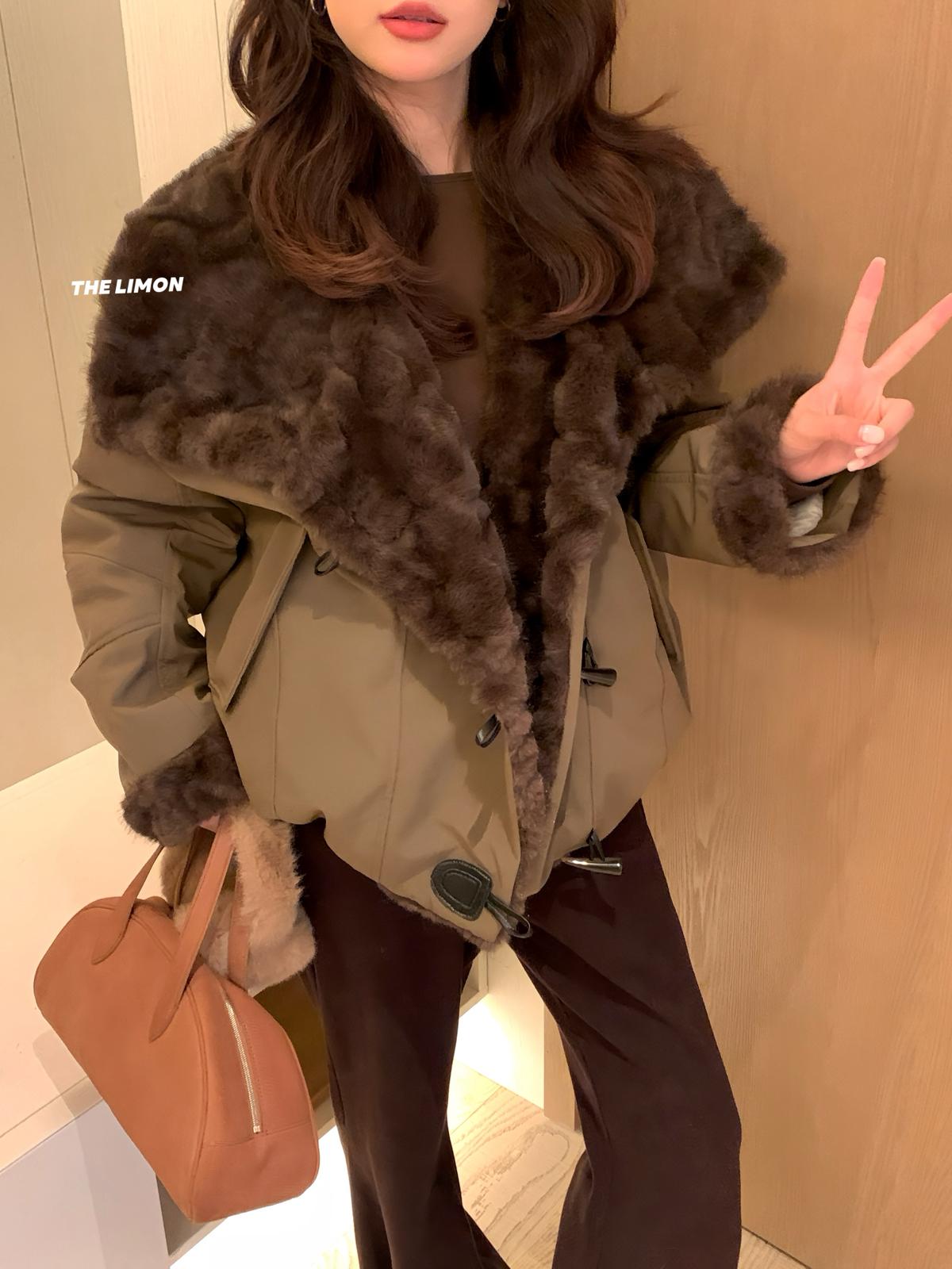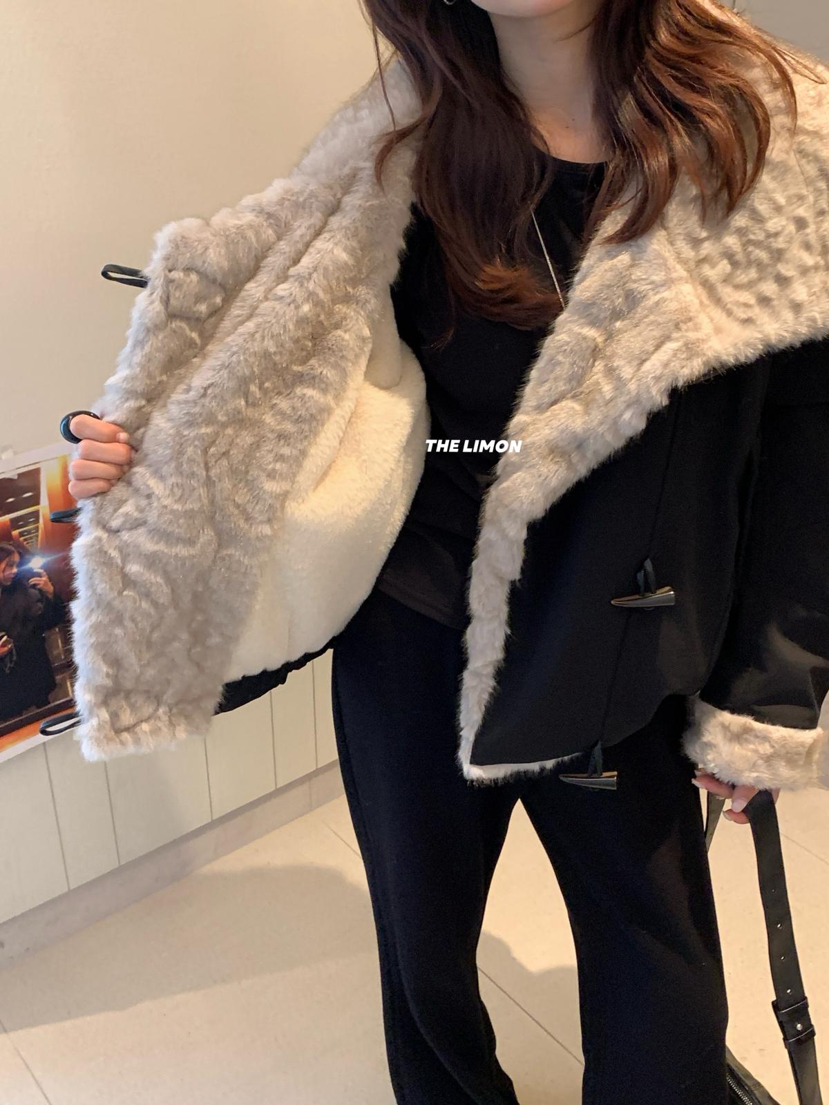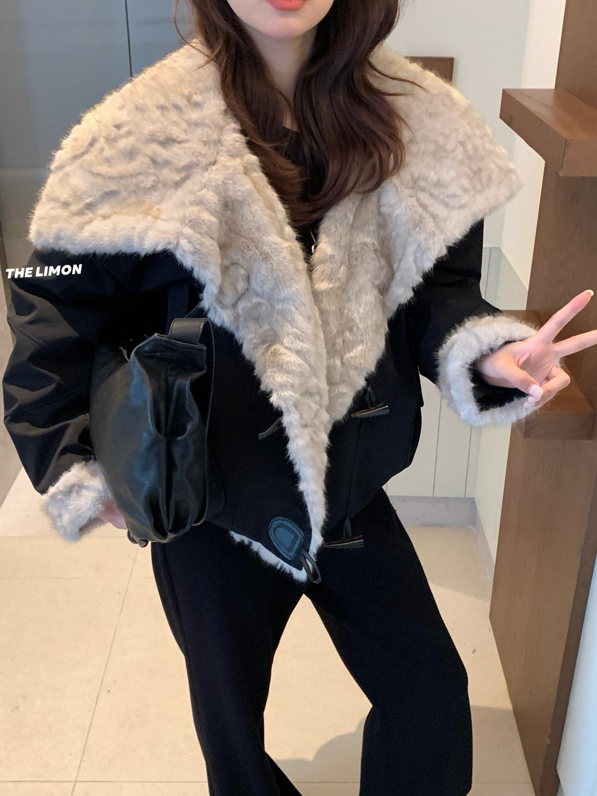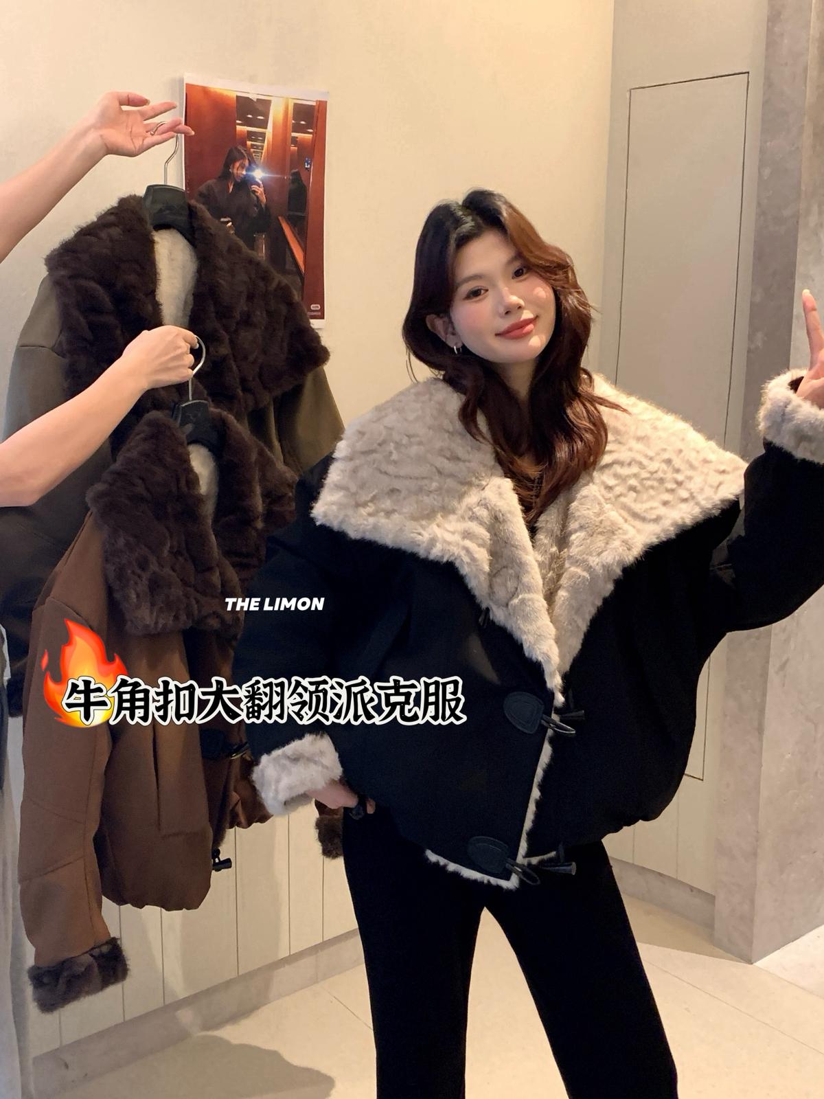【C7909】環保毛翻領百搭牛角扣毛毛短外套