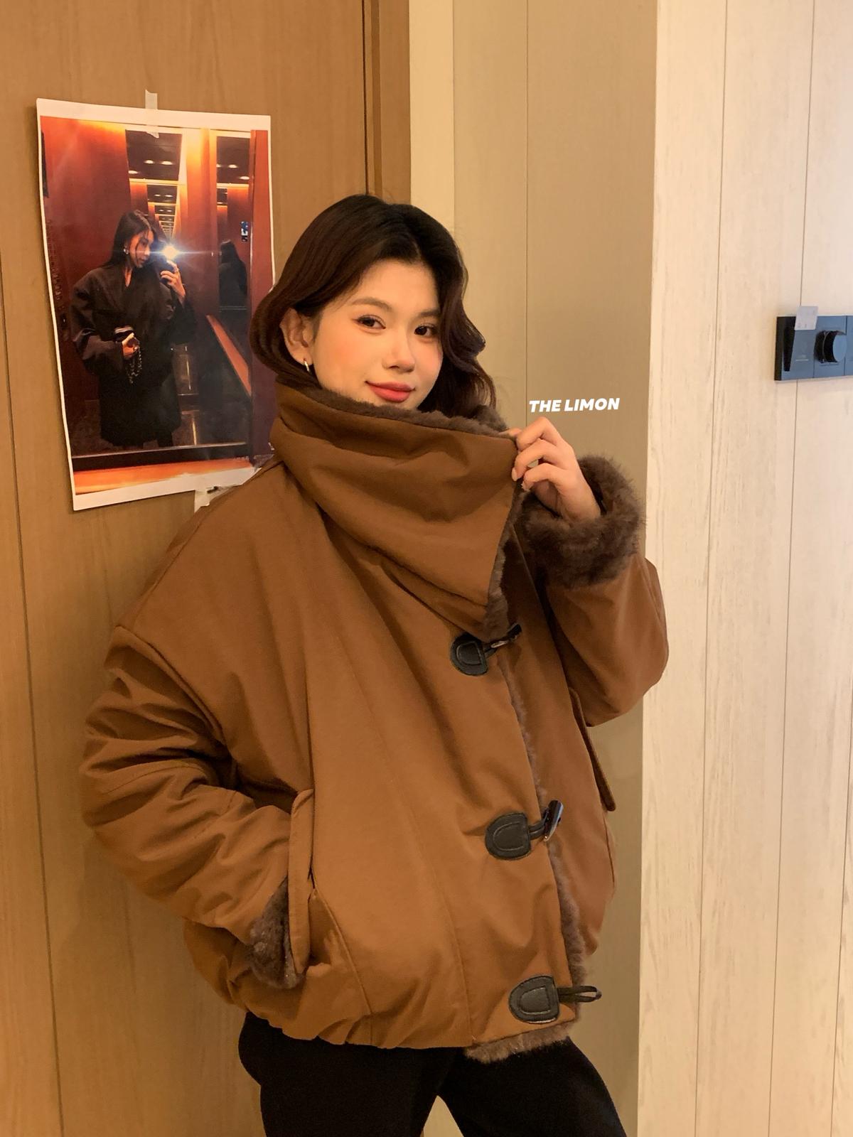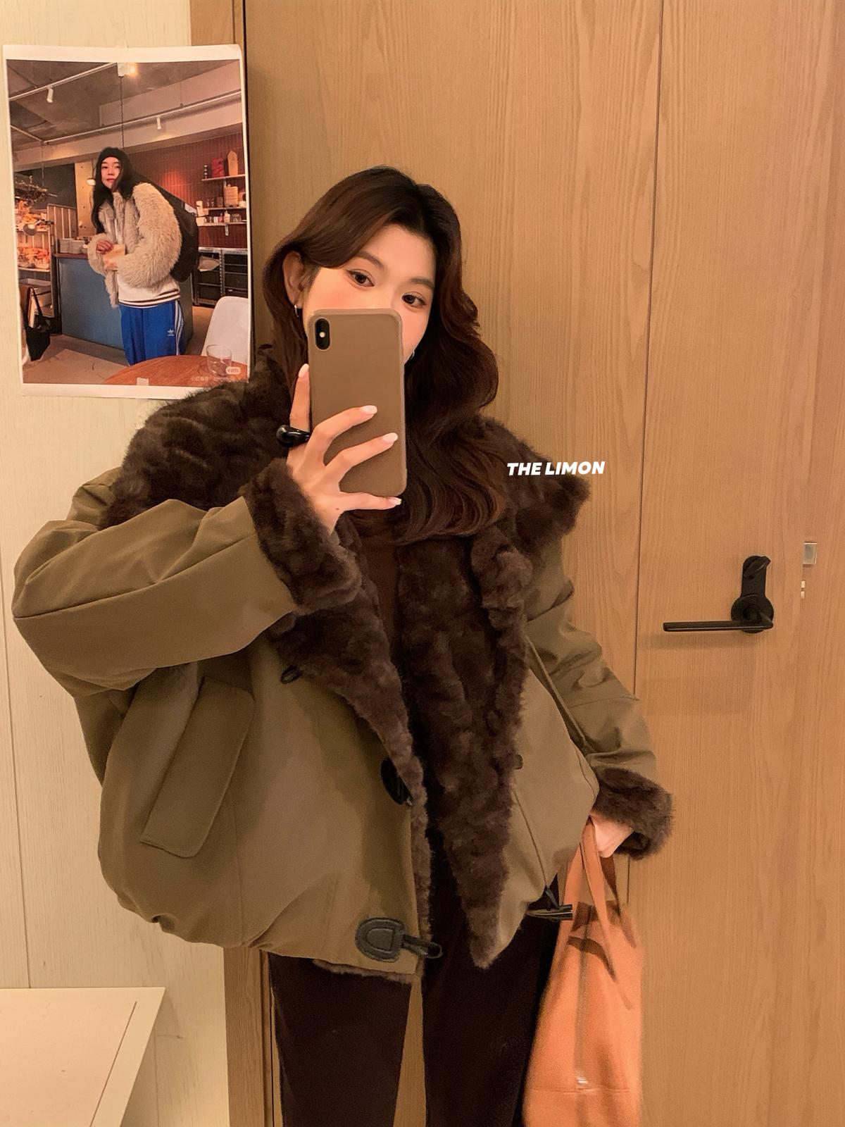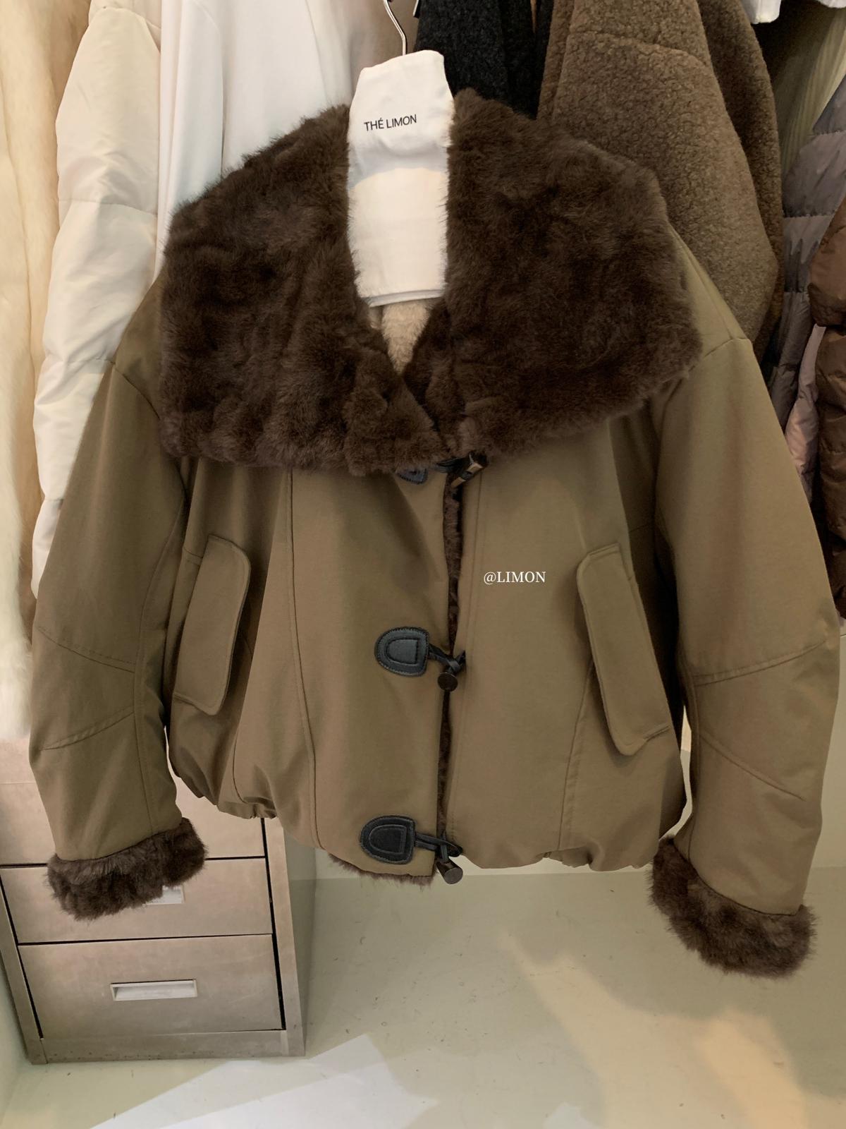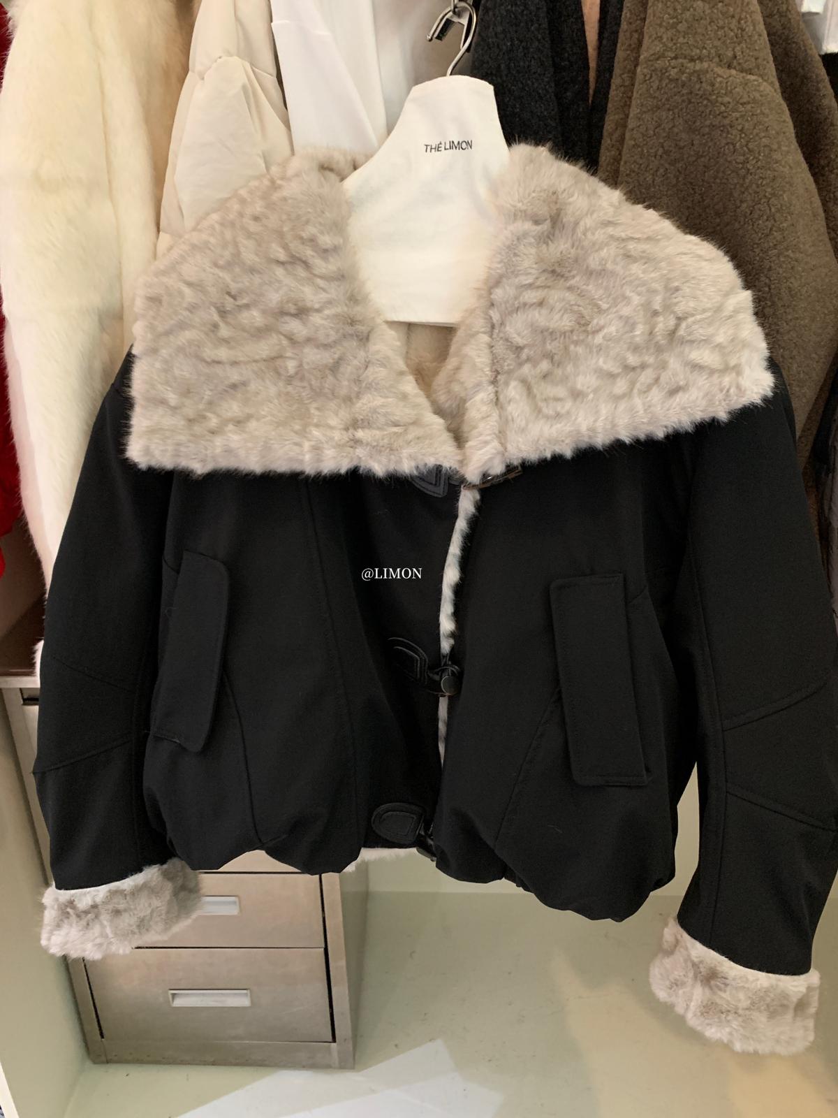 【C7909】環保毛翻領百搭牛角扣毛毛短外套