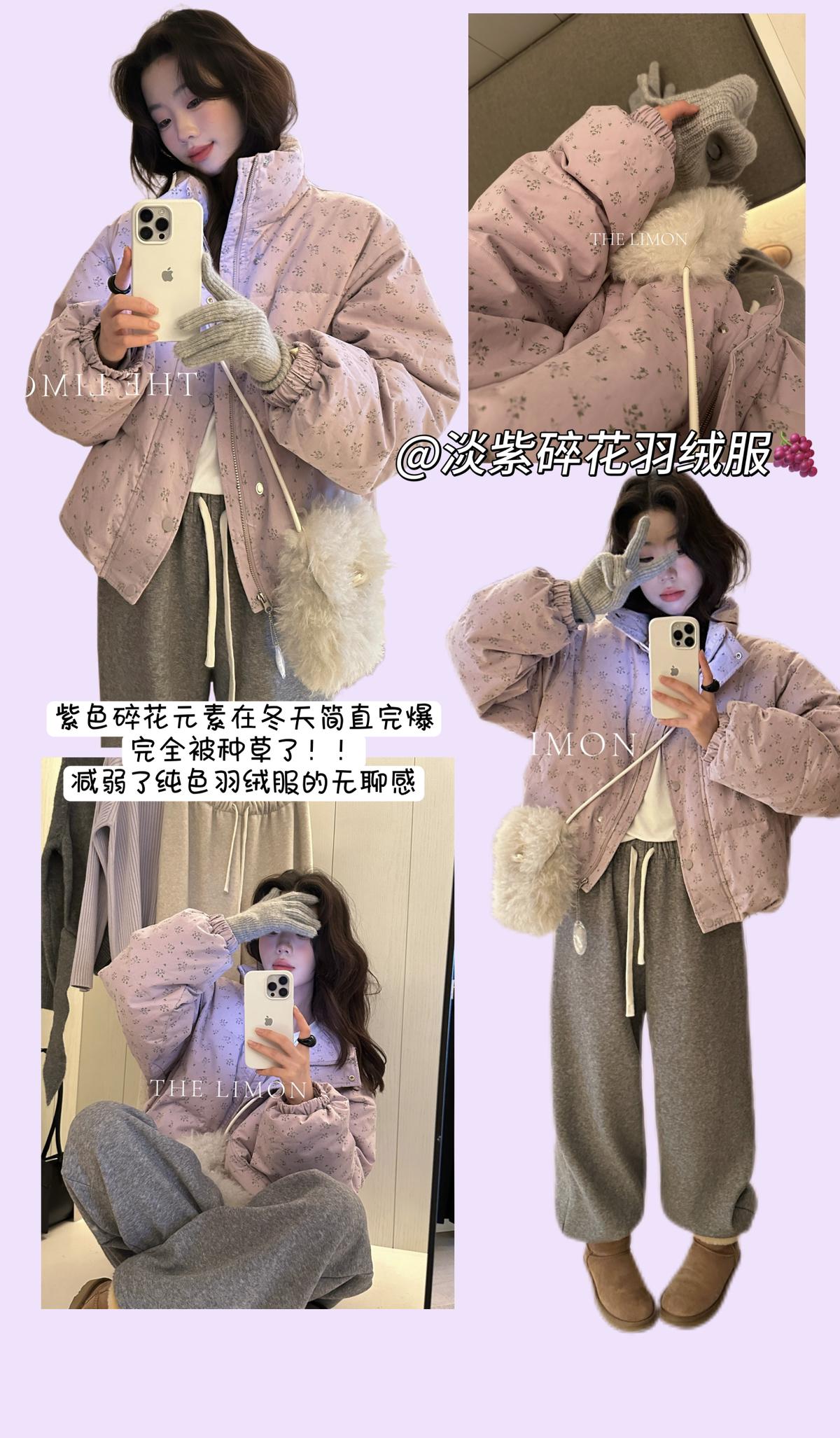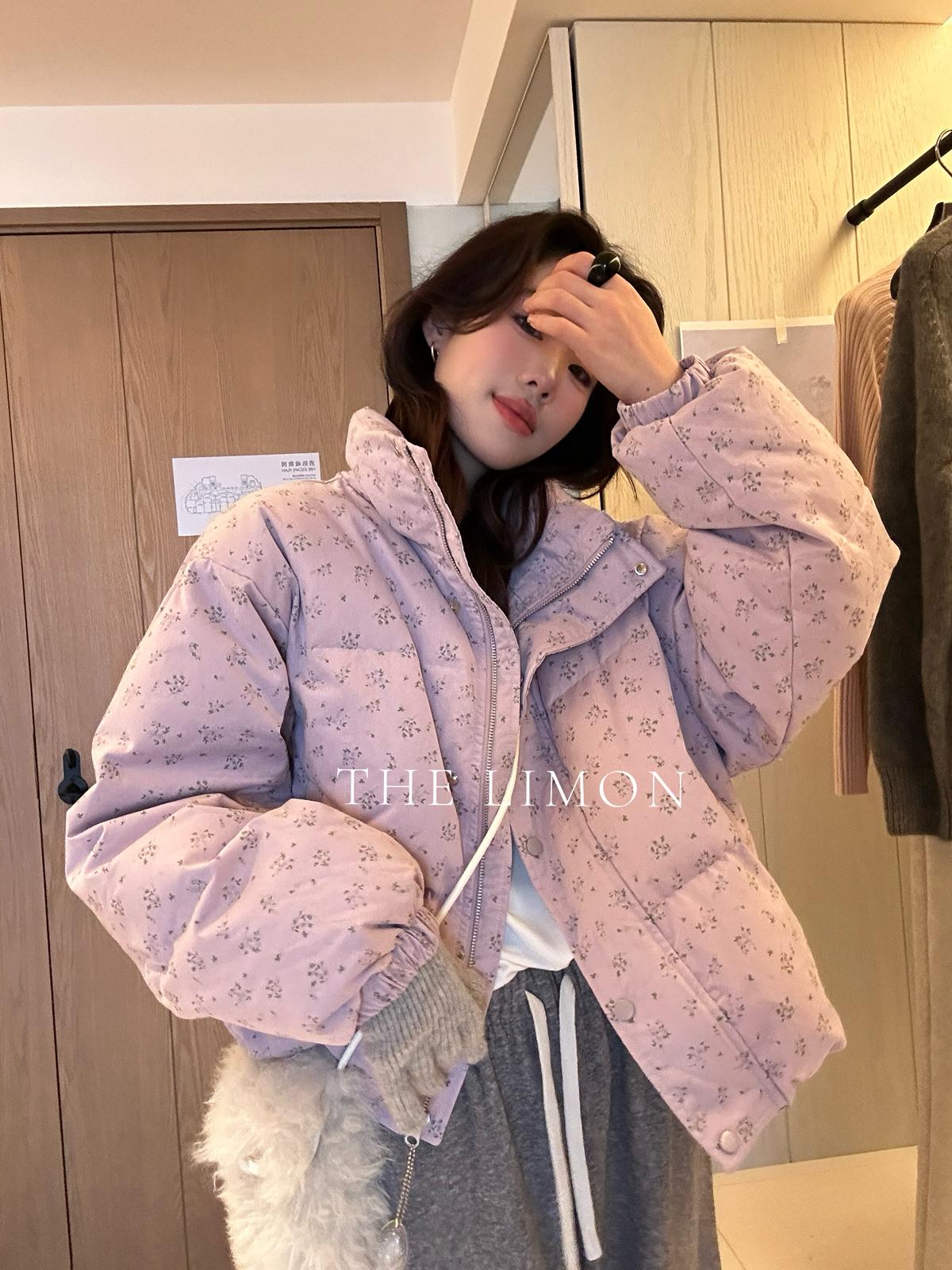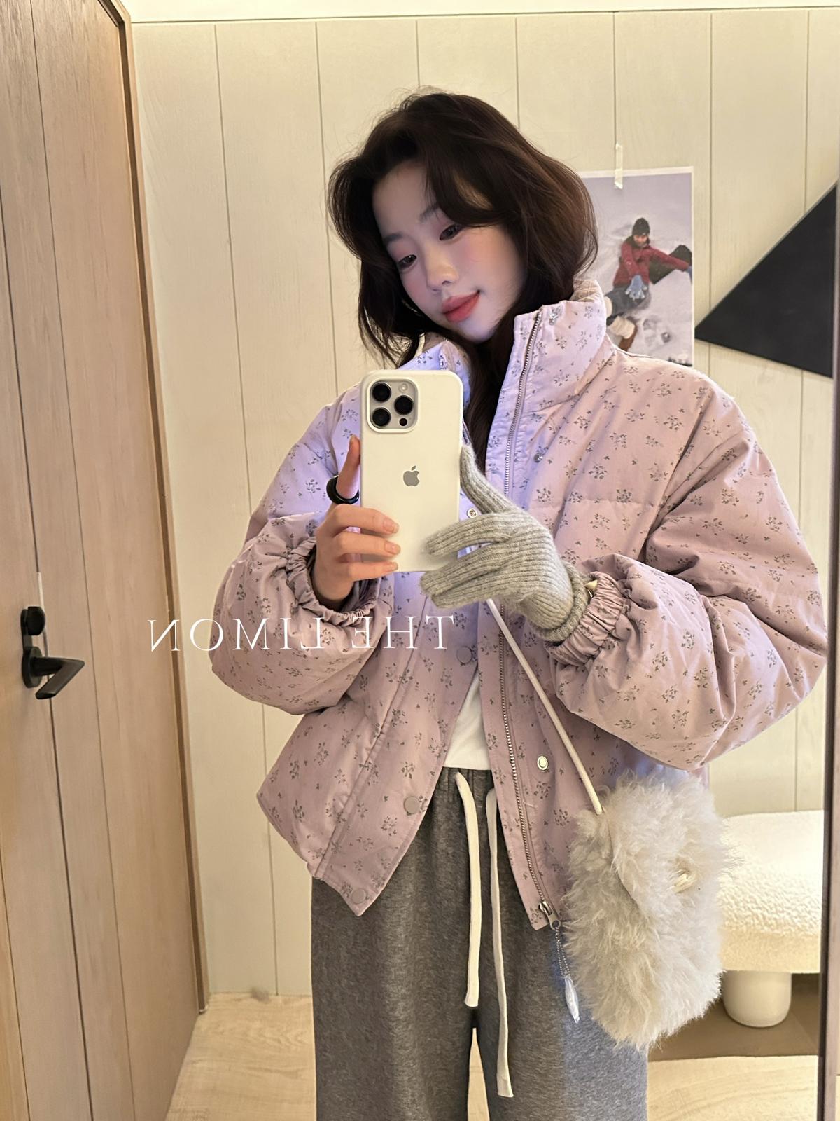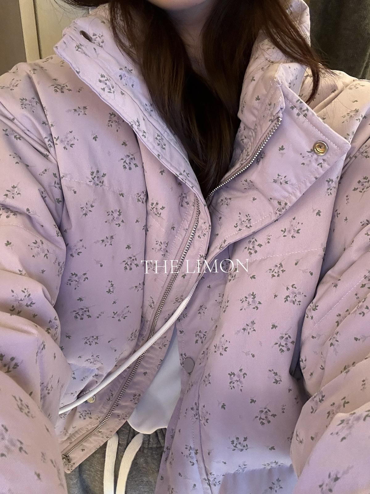 【C7910】清新立領紫色小花保暖羽絨服外套