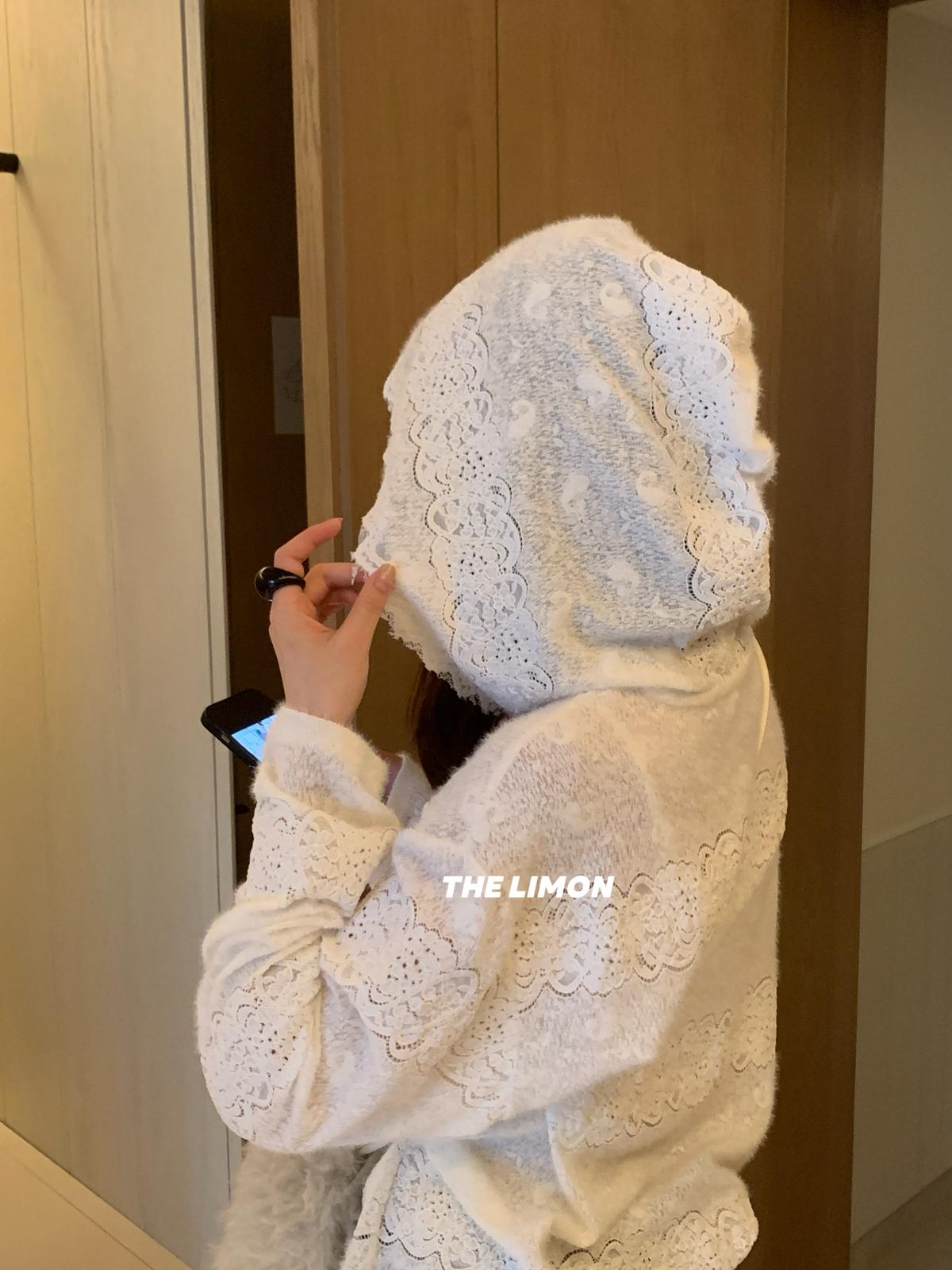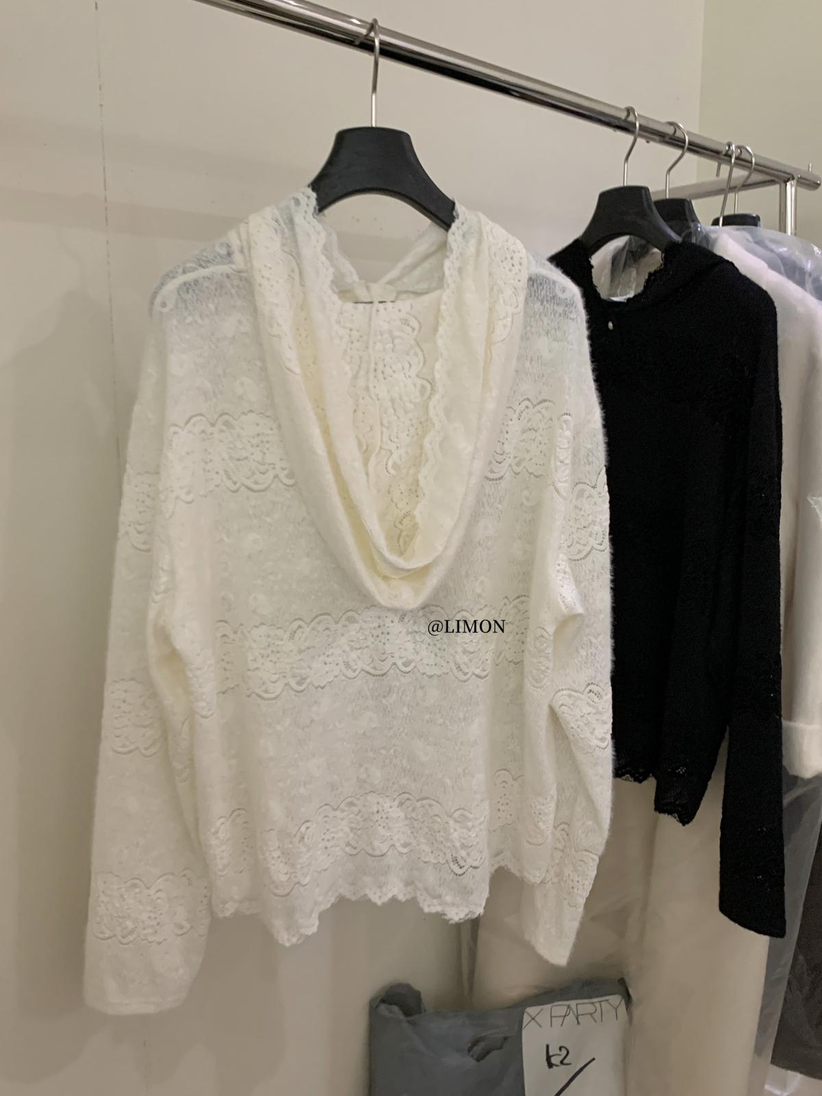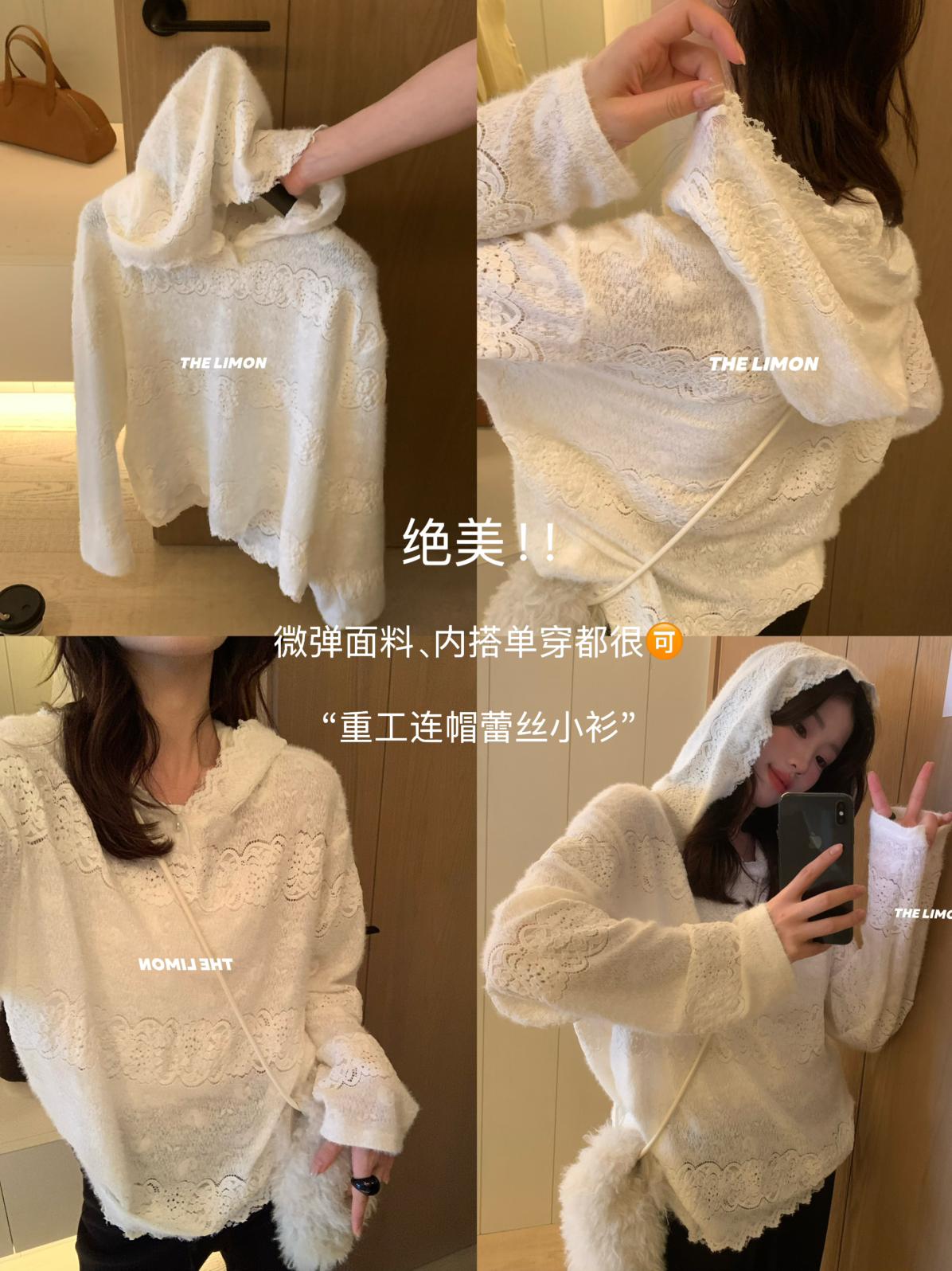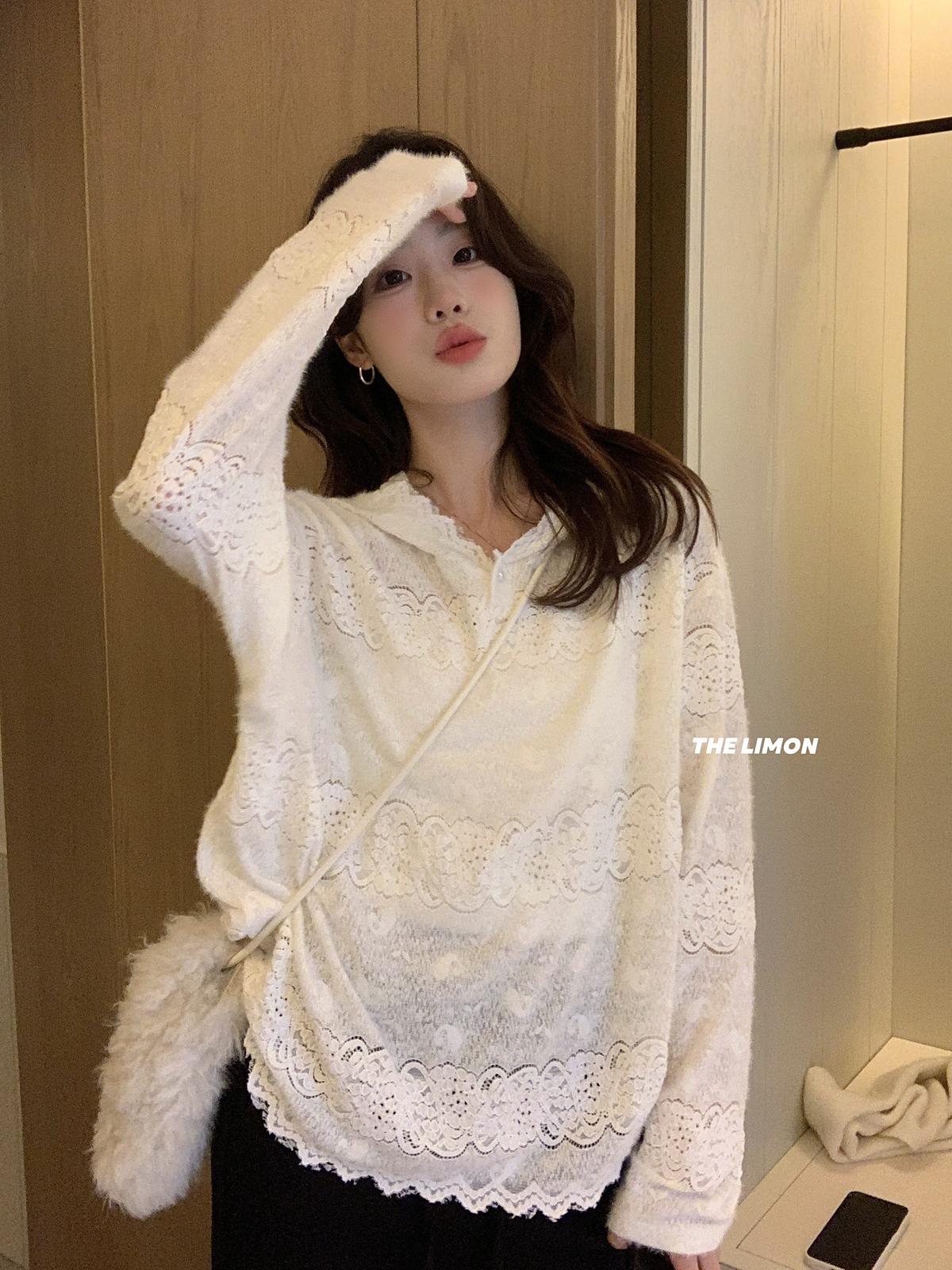 【C7911】重工鉤花蕾絲拼接連帽微彈小衫