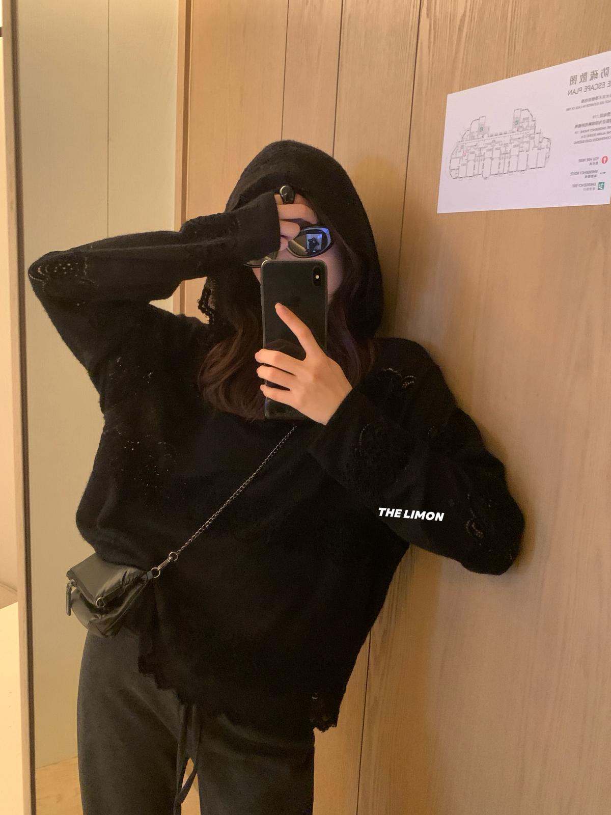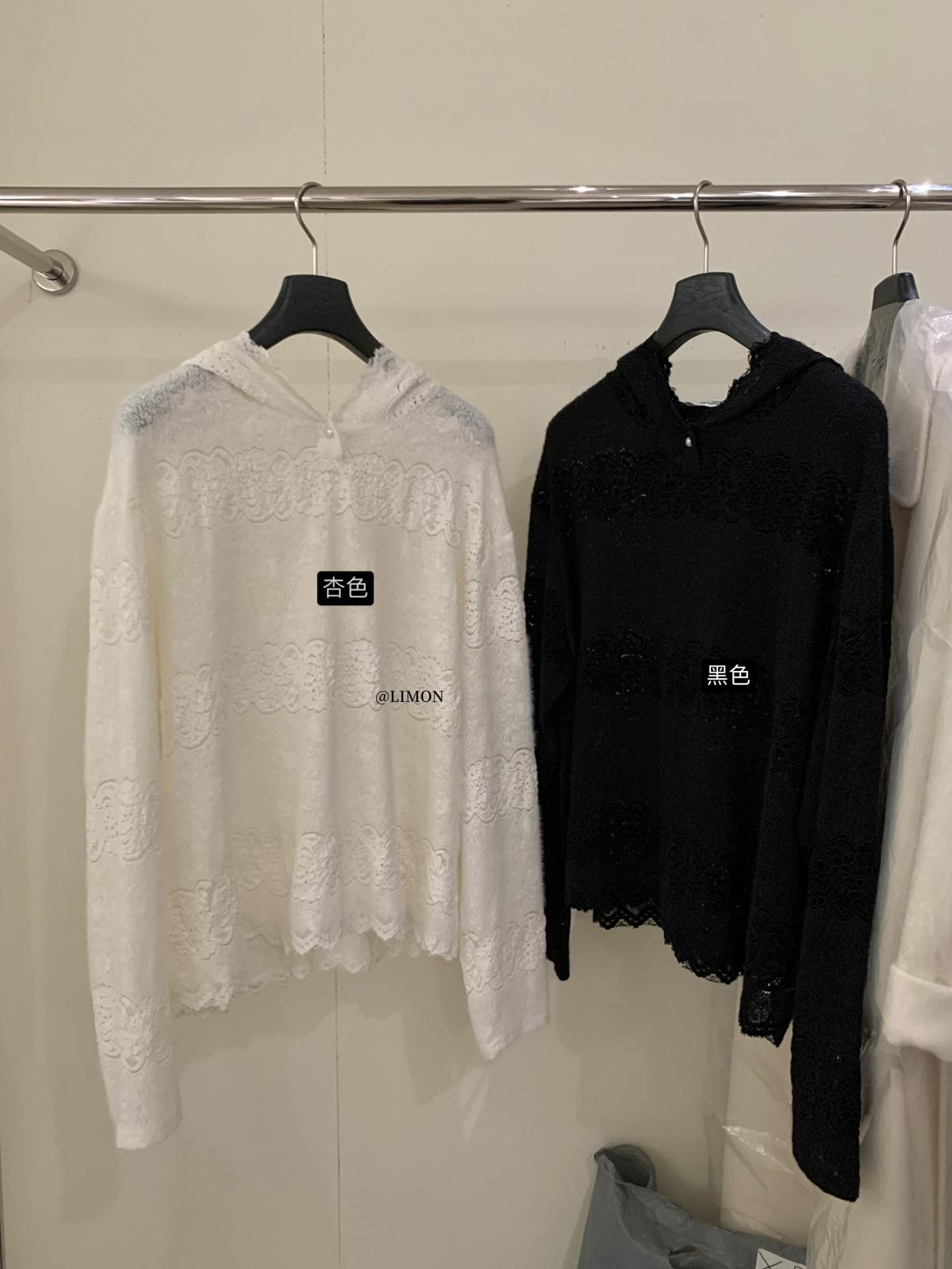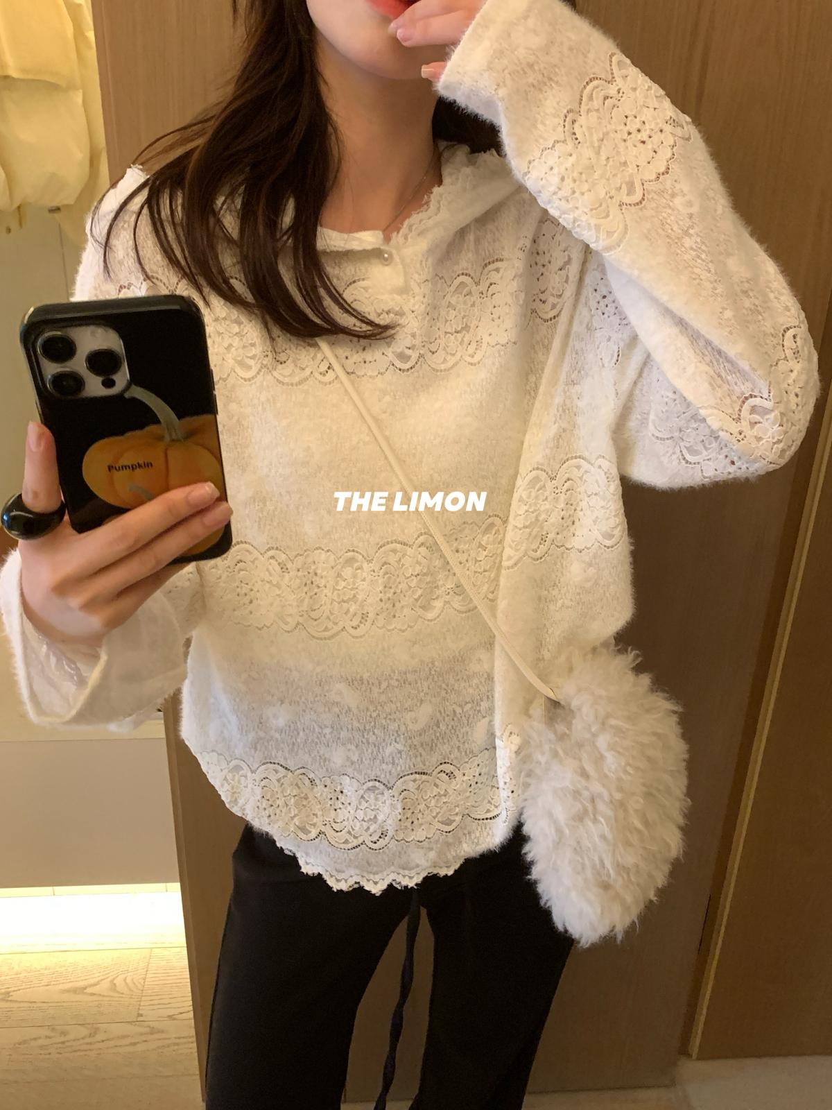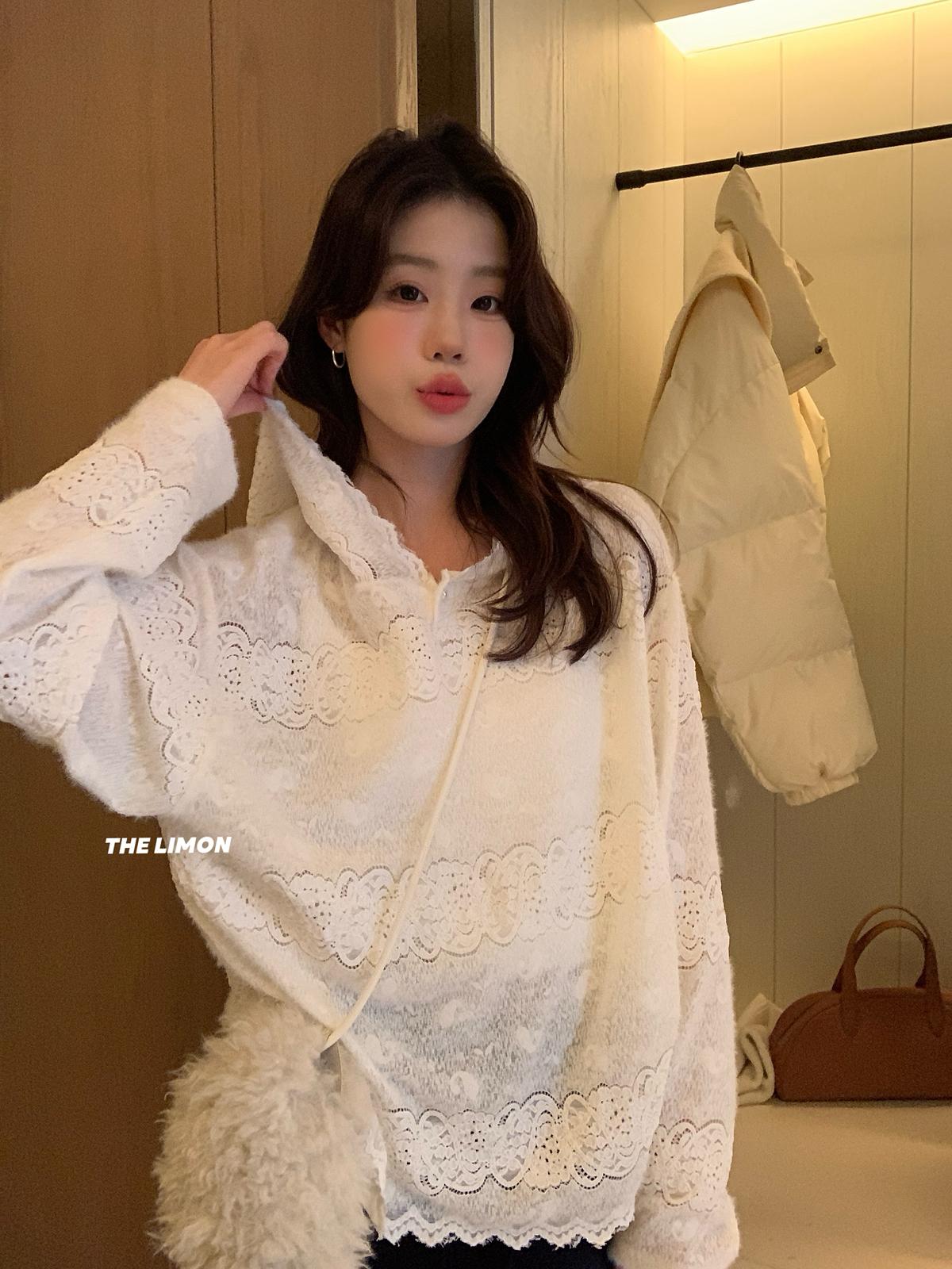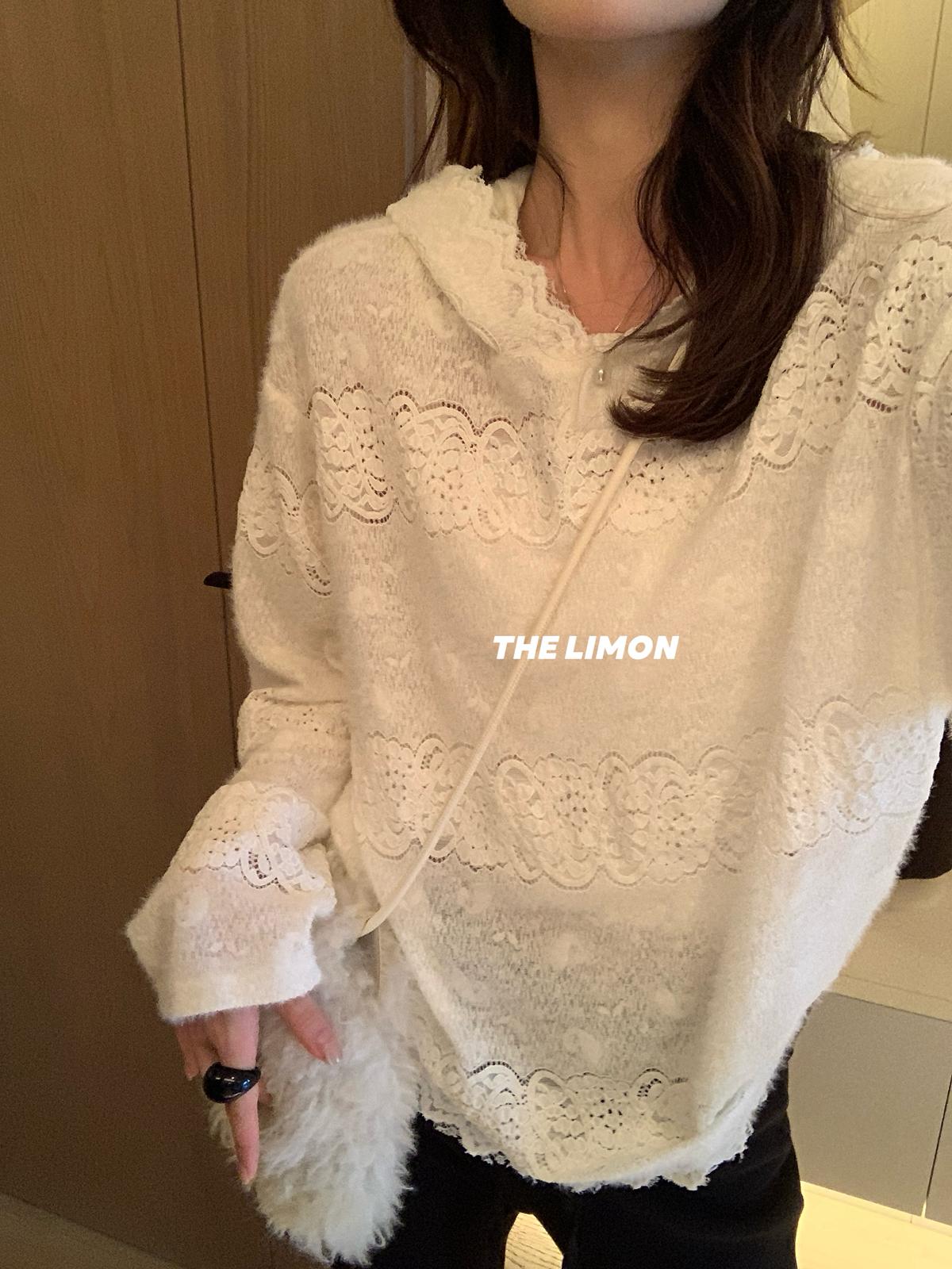 【C7911】重工鉤花蕾絲拼接連帽微彈小衫