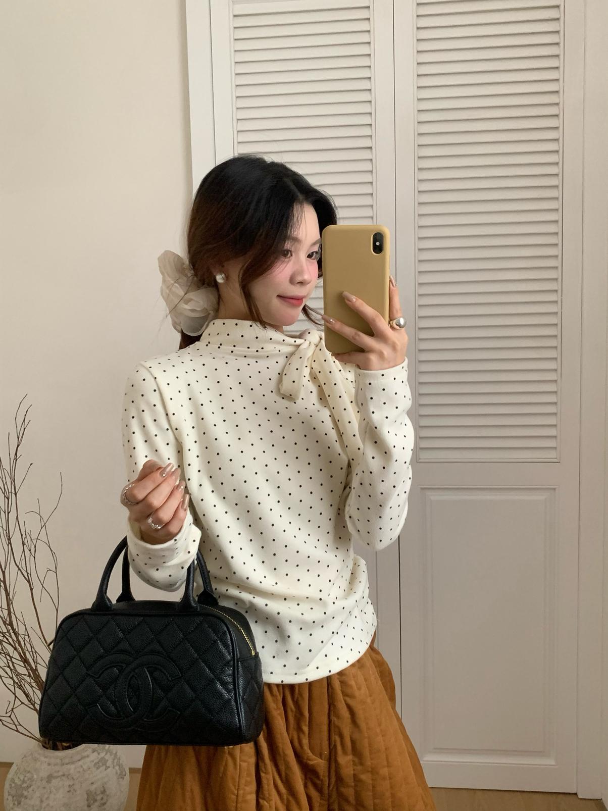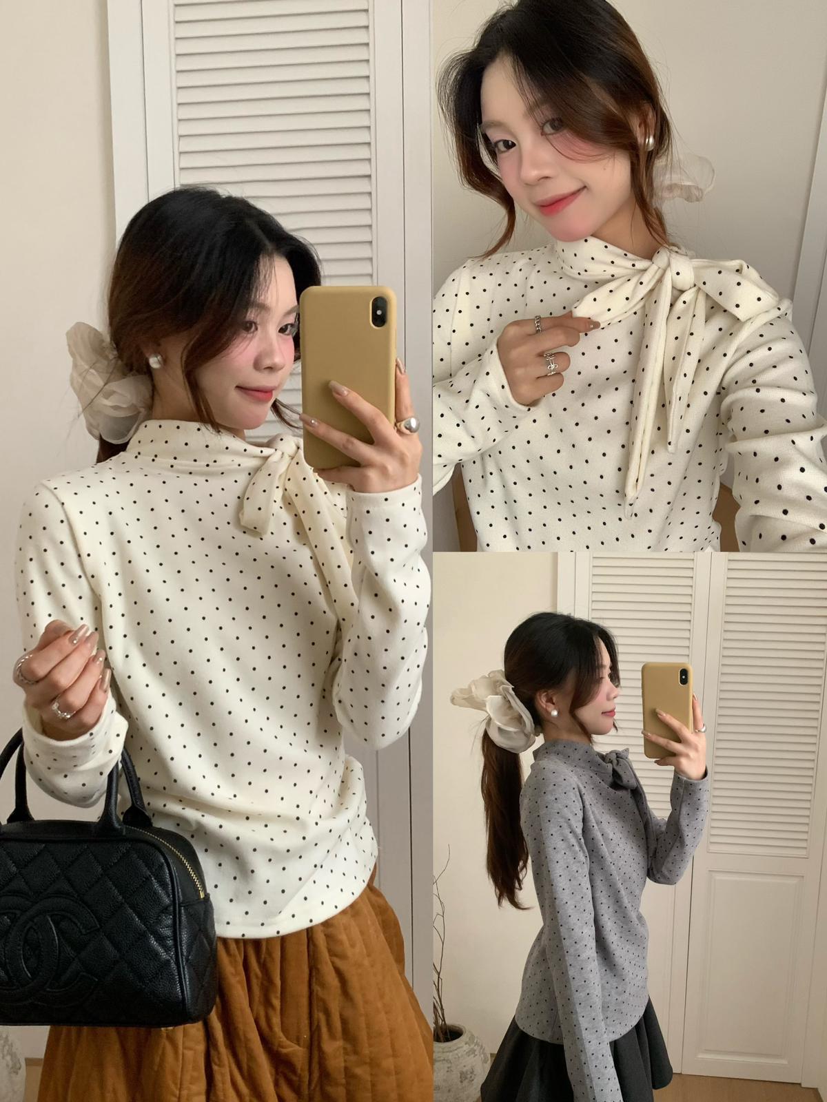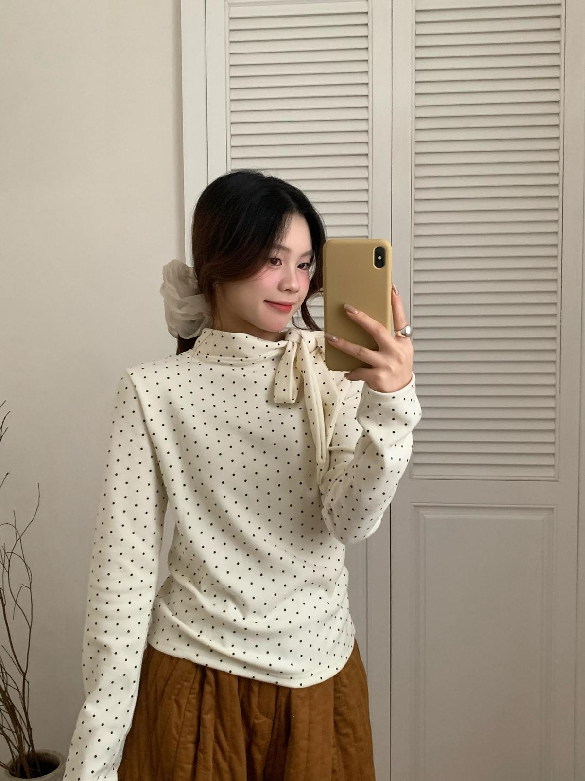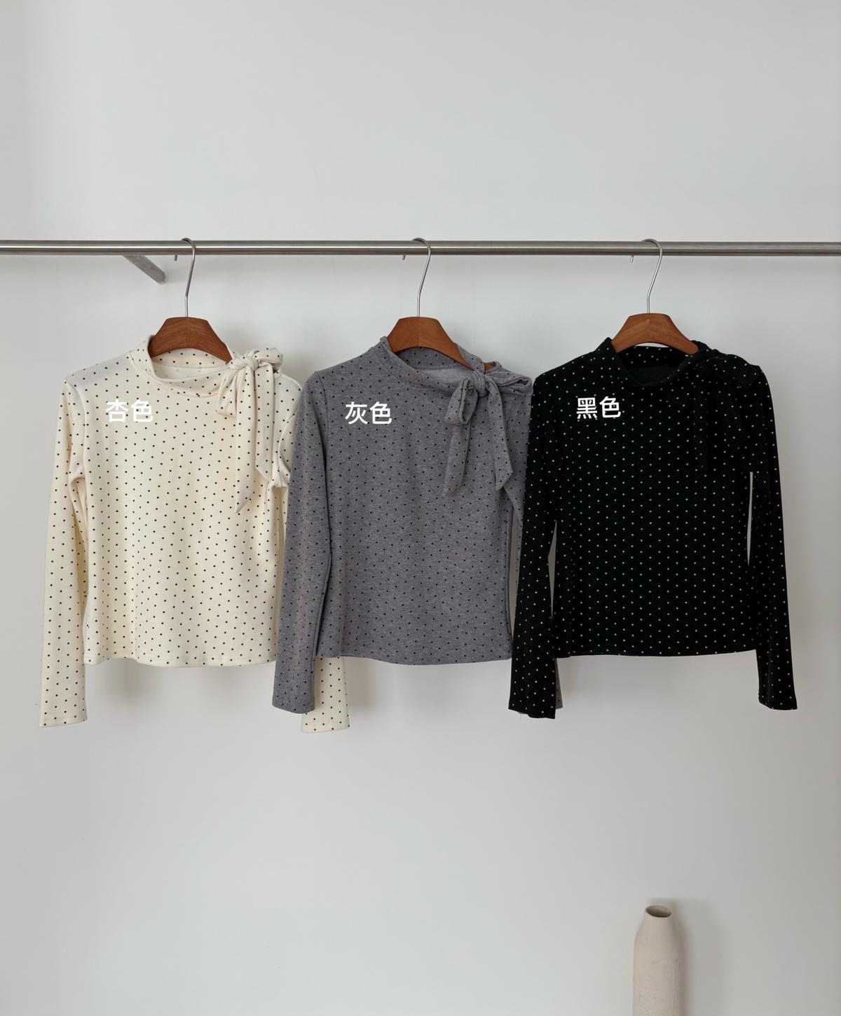 【C7914】韓系波點綁帶氣質休閒上衣女冬季新款顯瘦簡約設計感疊穿打底衫