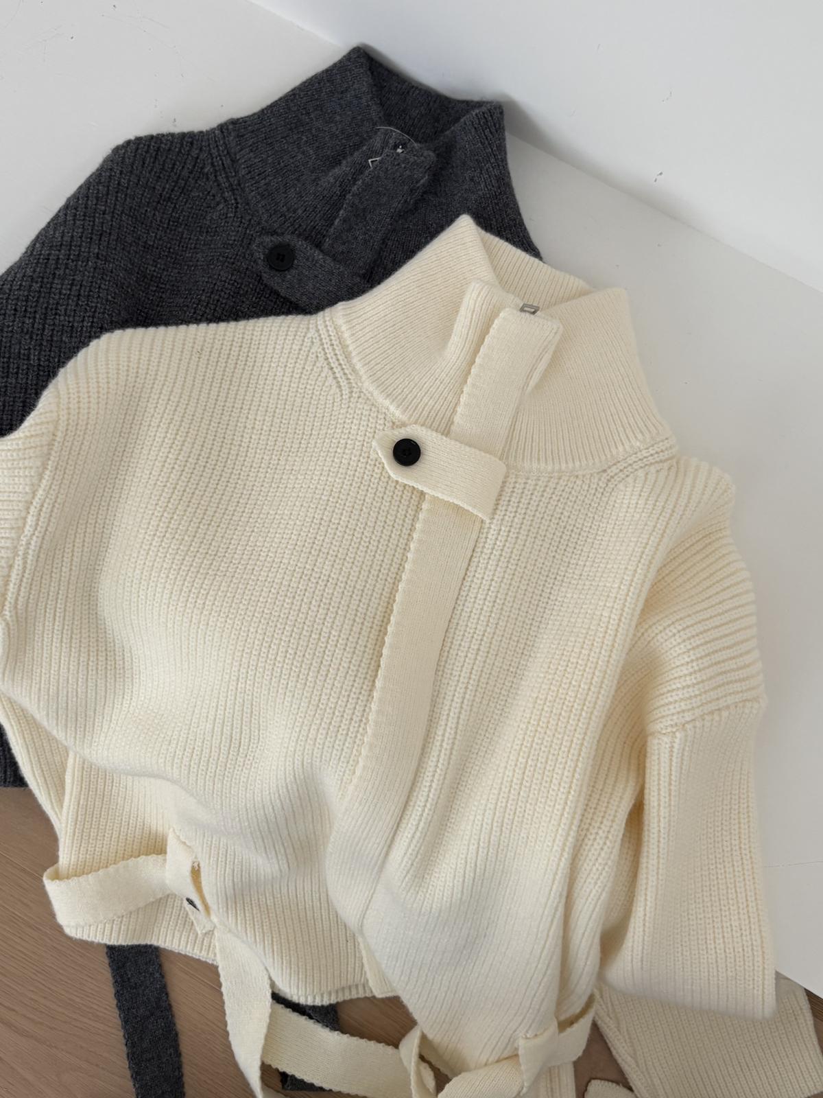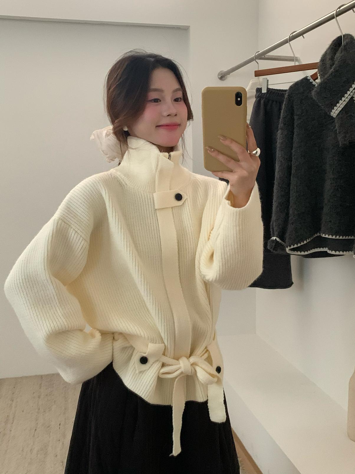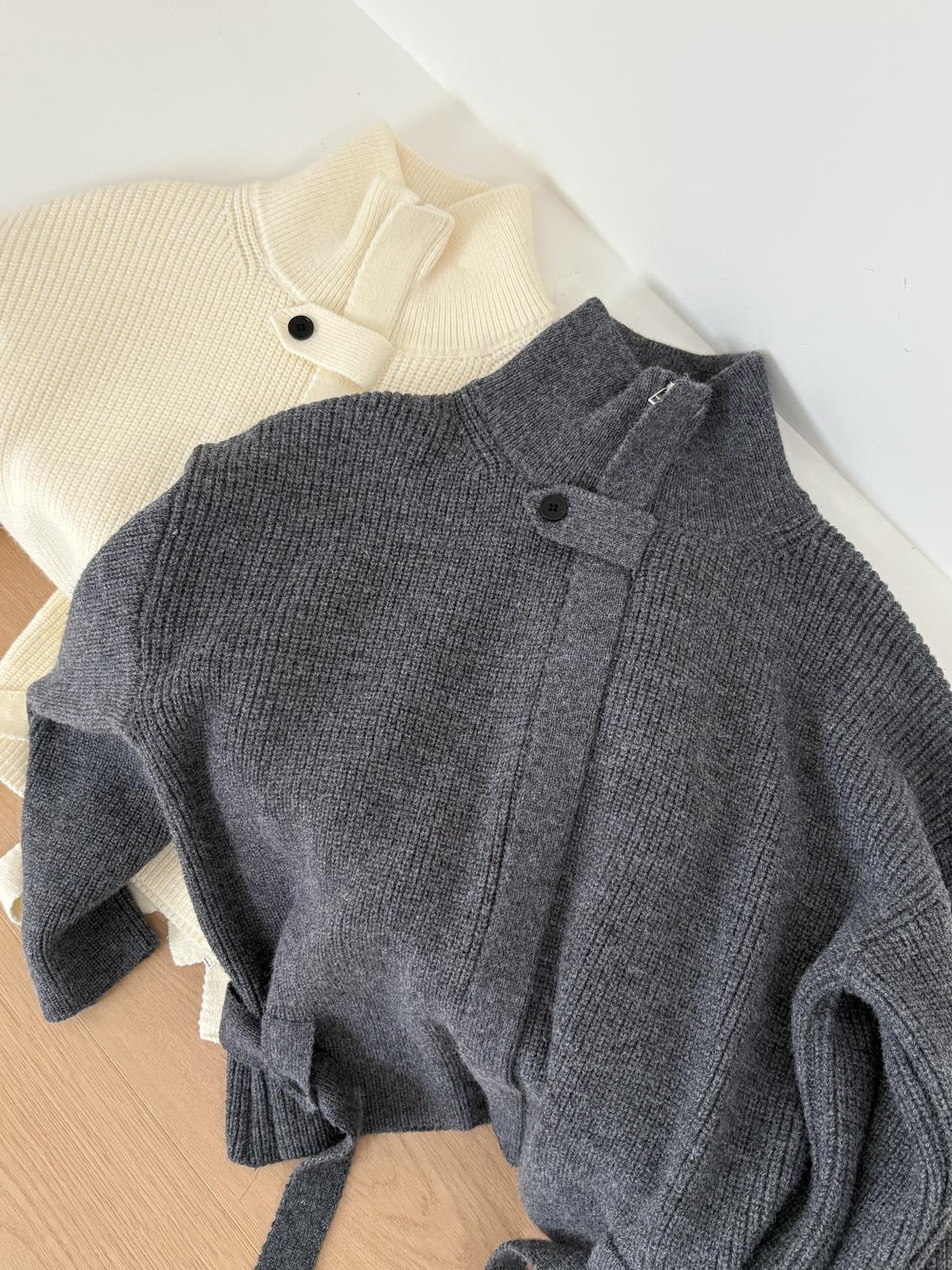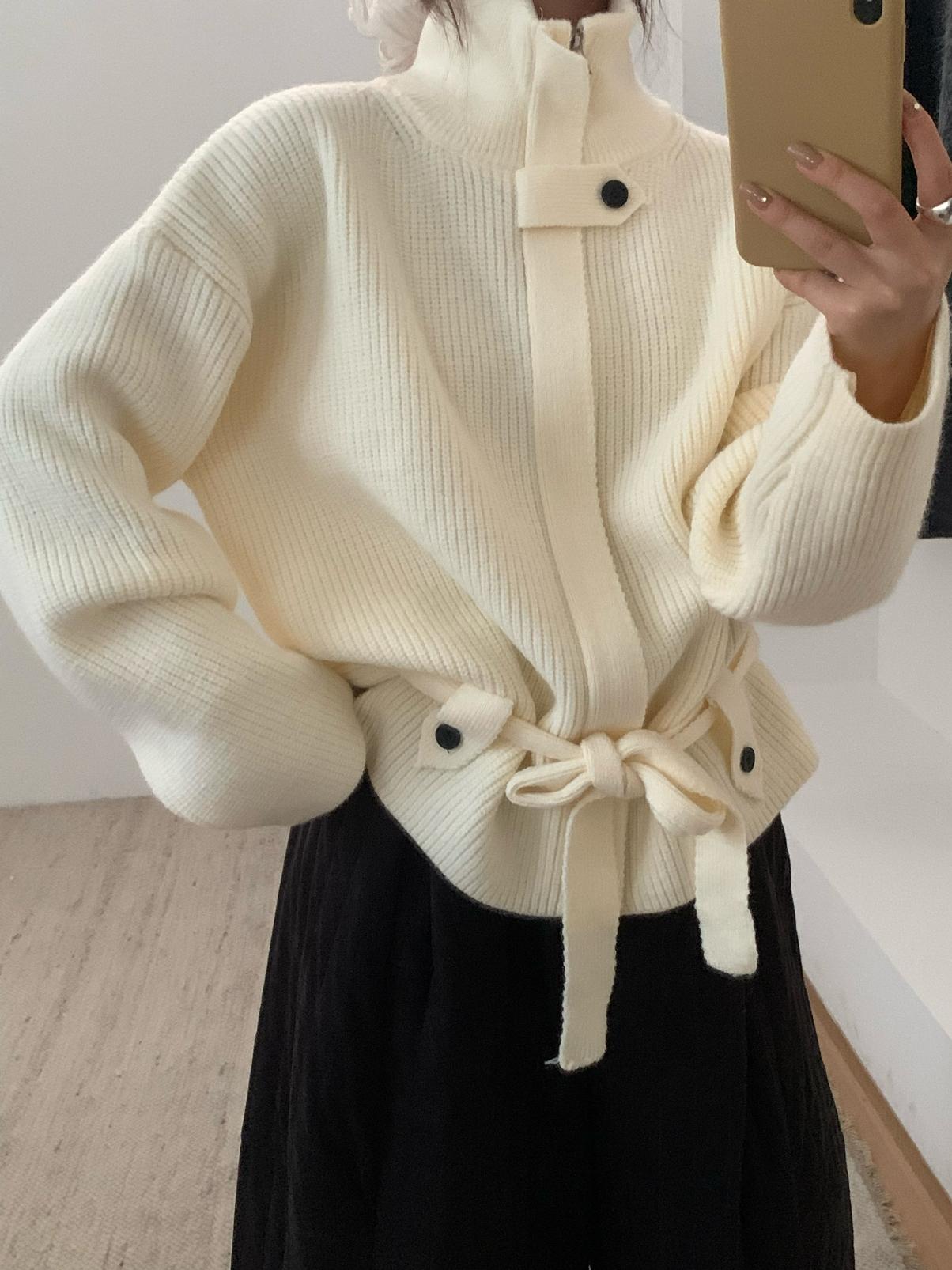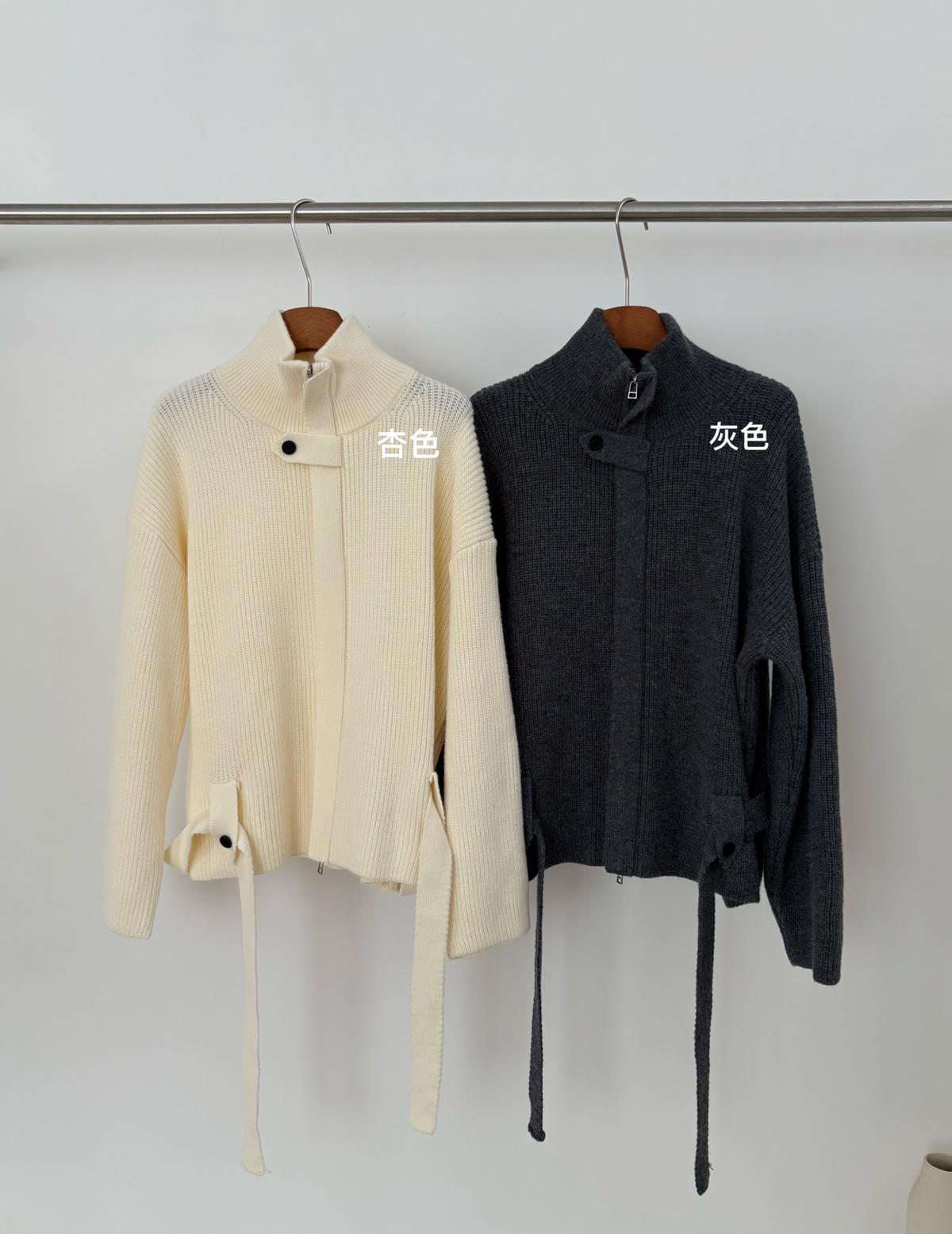 【C7915】韓系立領拉鍊針織開衫女秋冬新款2025百搭顯瘦設計感收腰綁帶保暖毛衣(配腰繩)