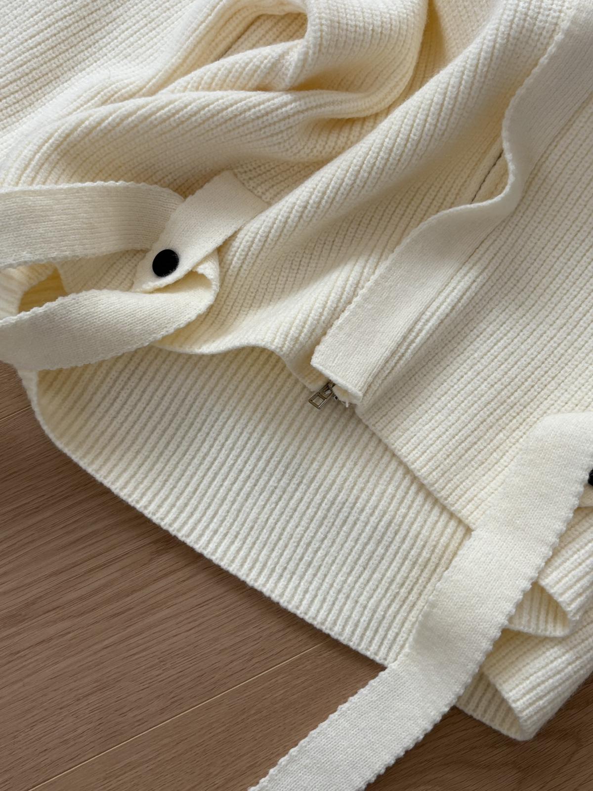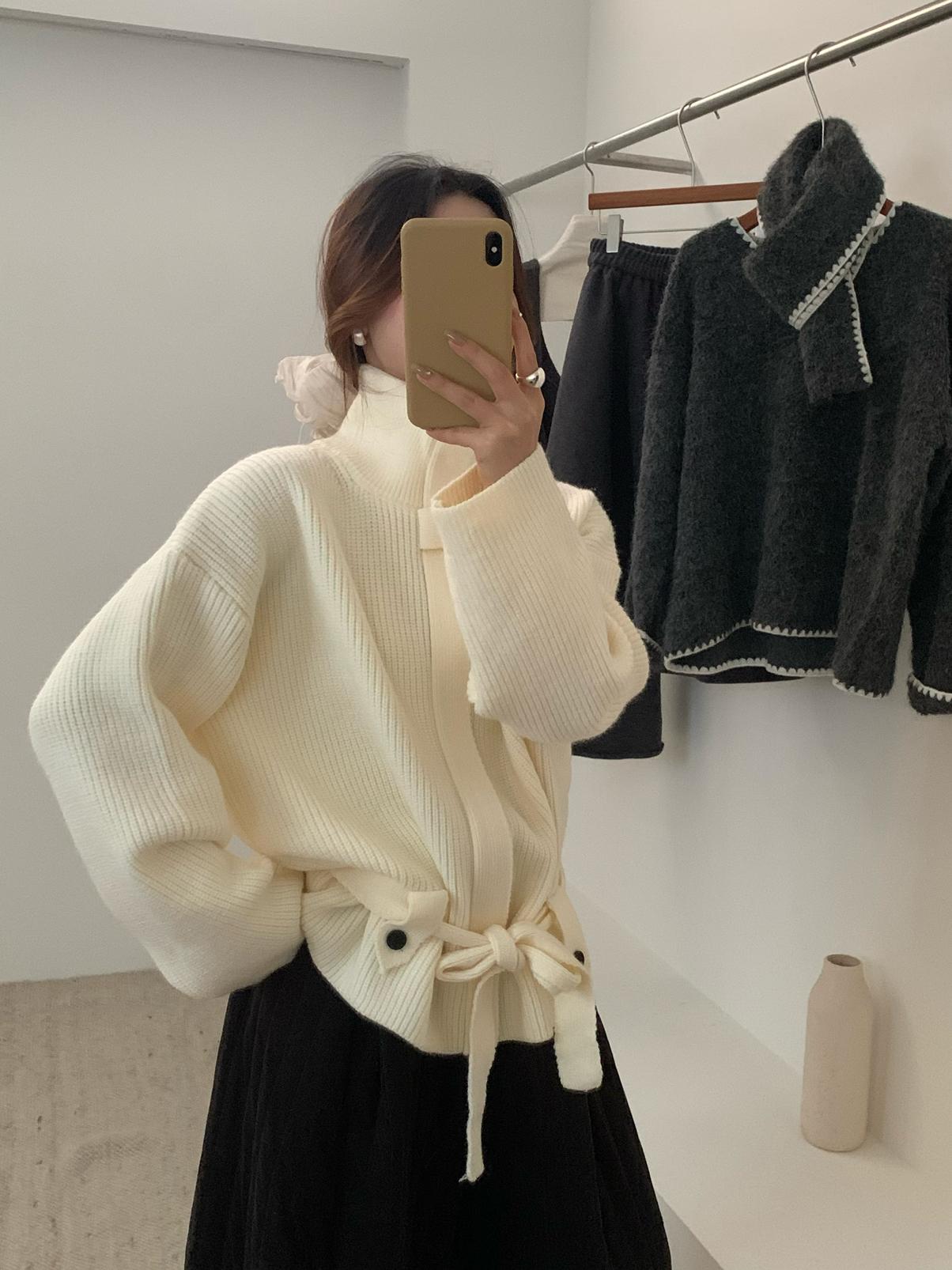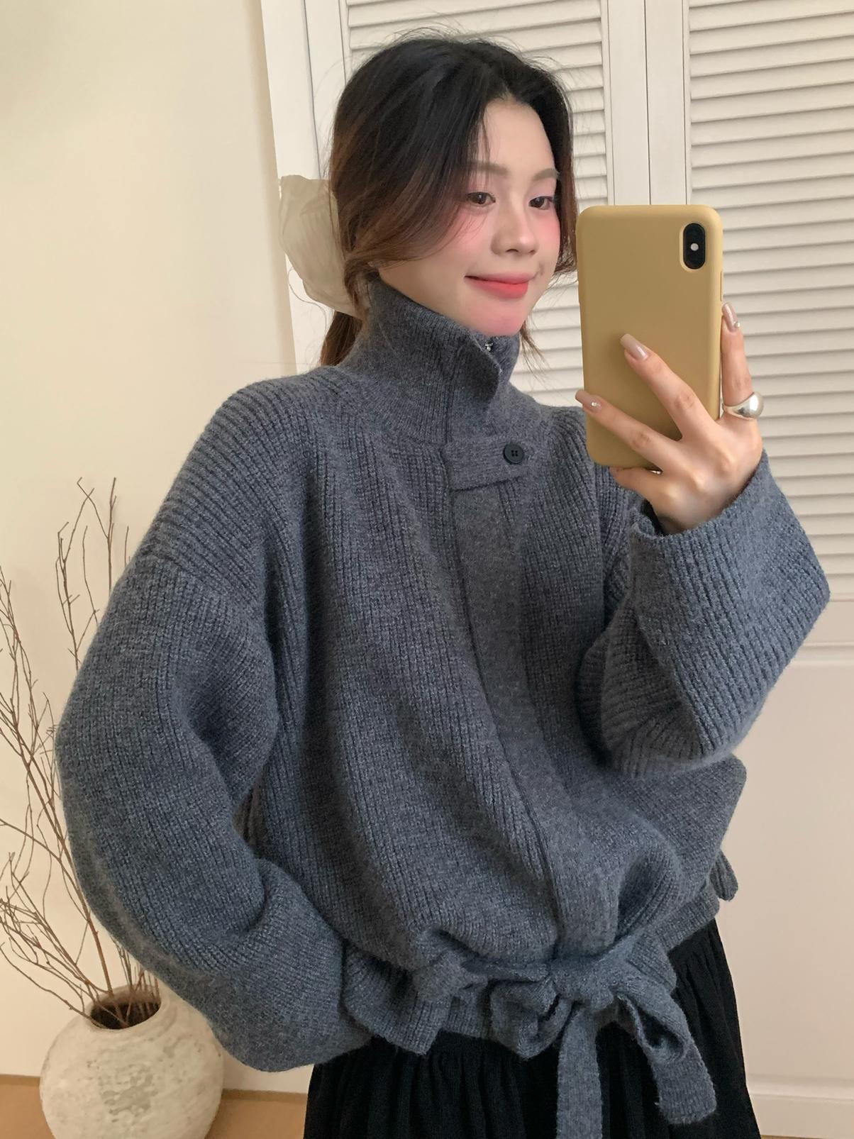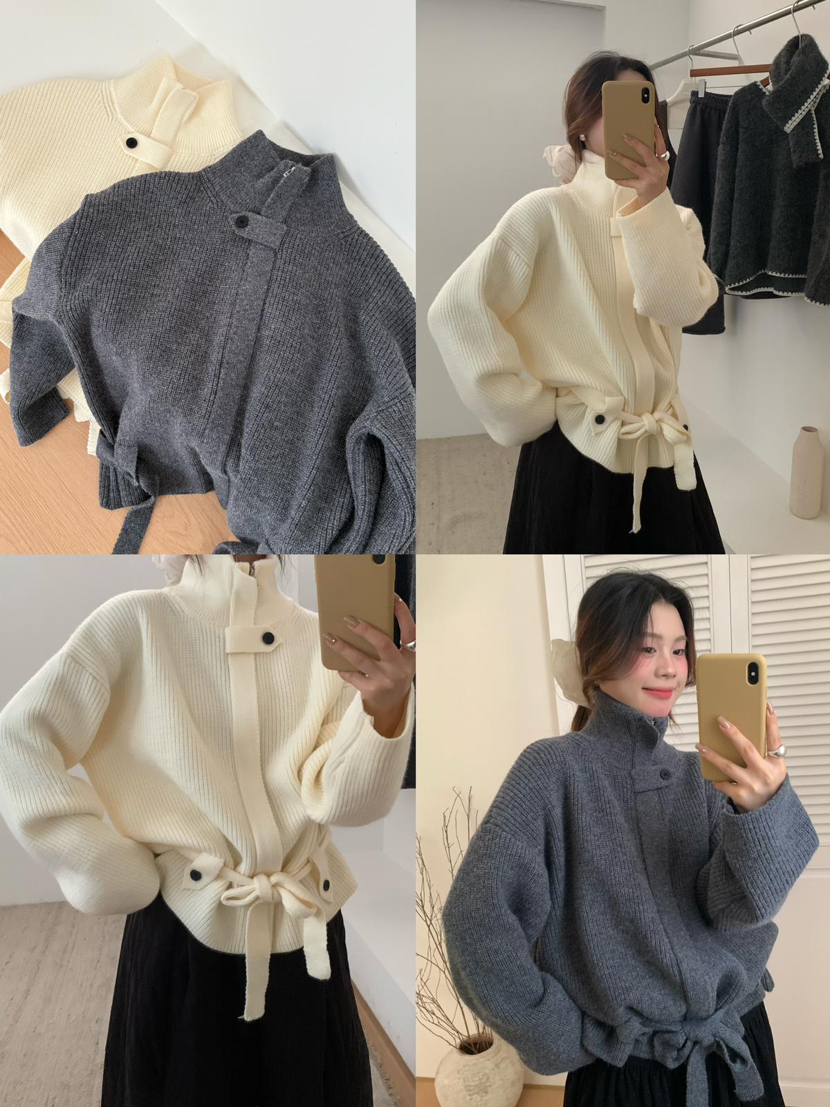 【C7915】韓系立領拉鍊針織開衫女秋冬新款2025百搭顯瘦設計感收腰綁帶保暖毛衣(配腰繩)