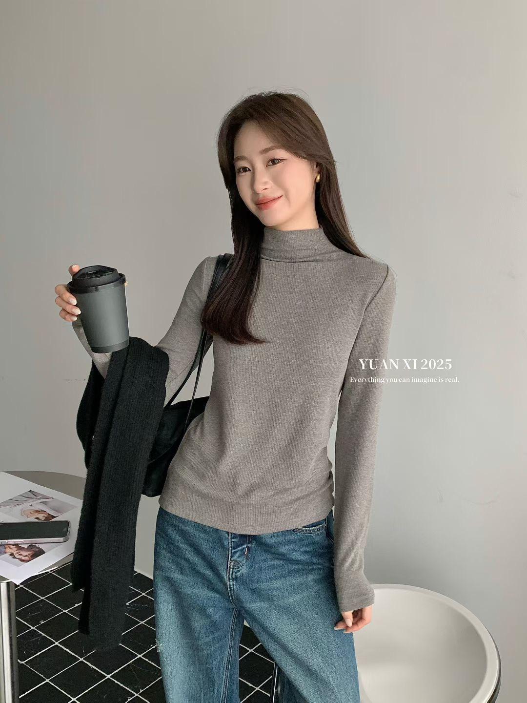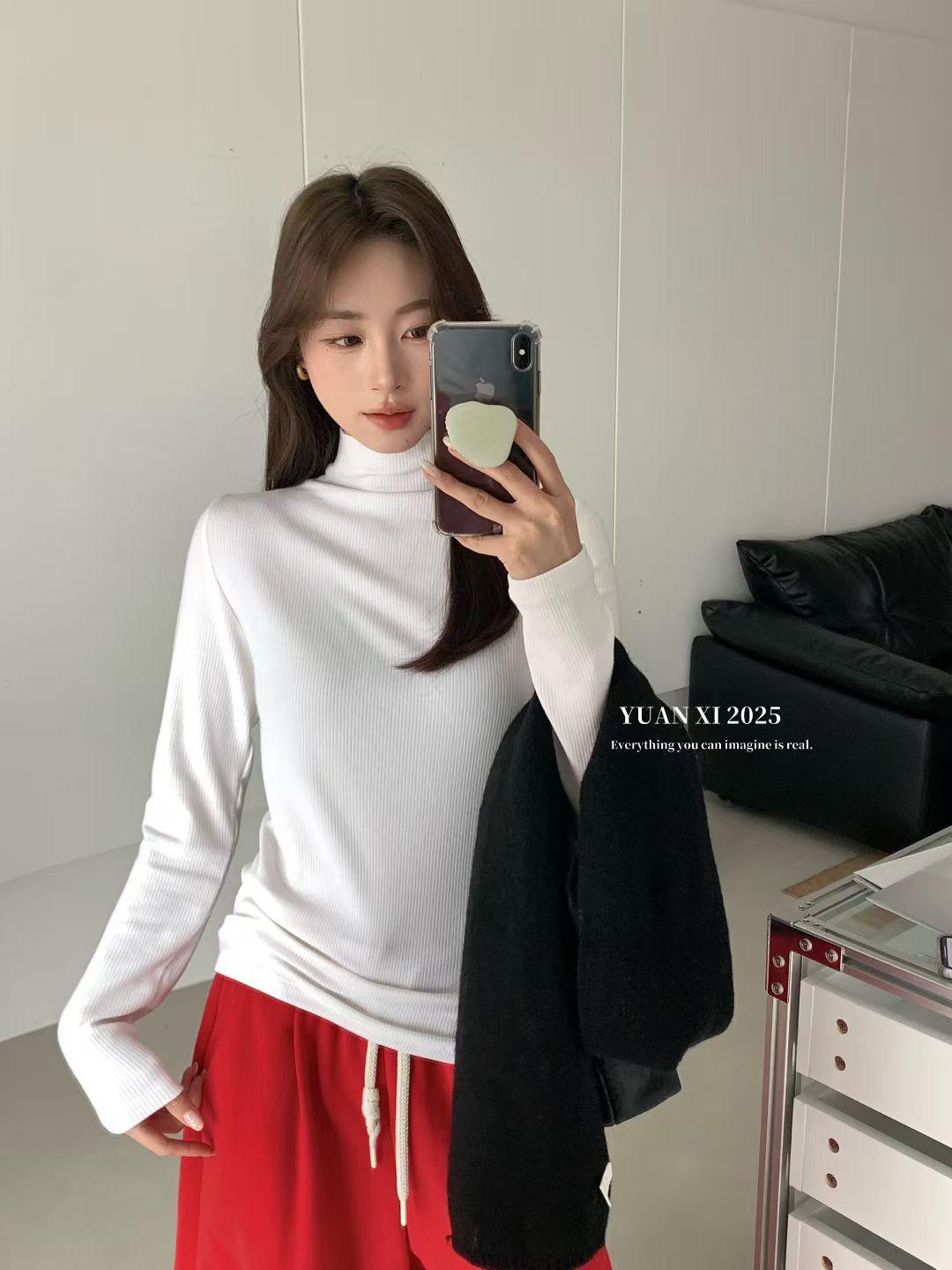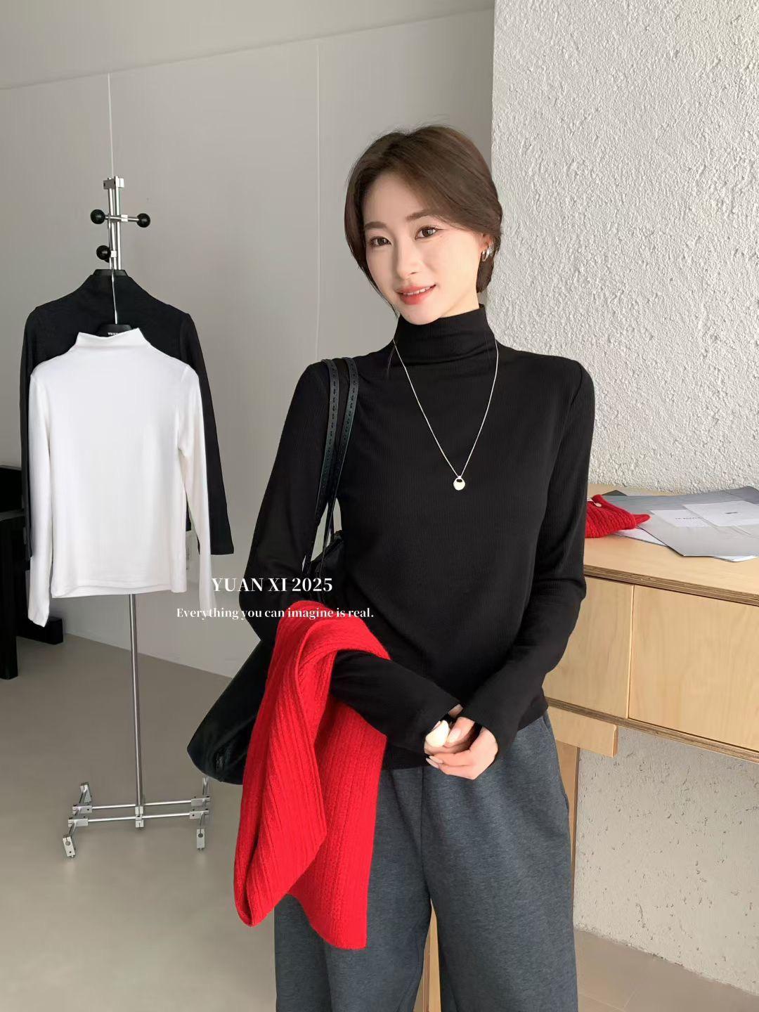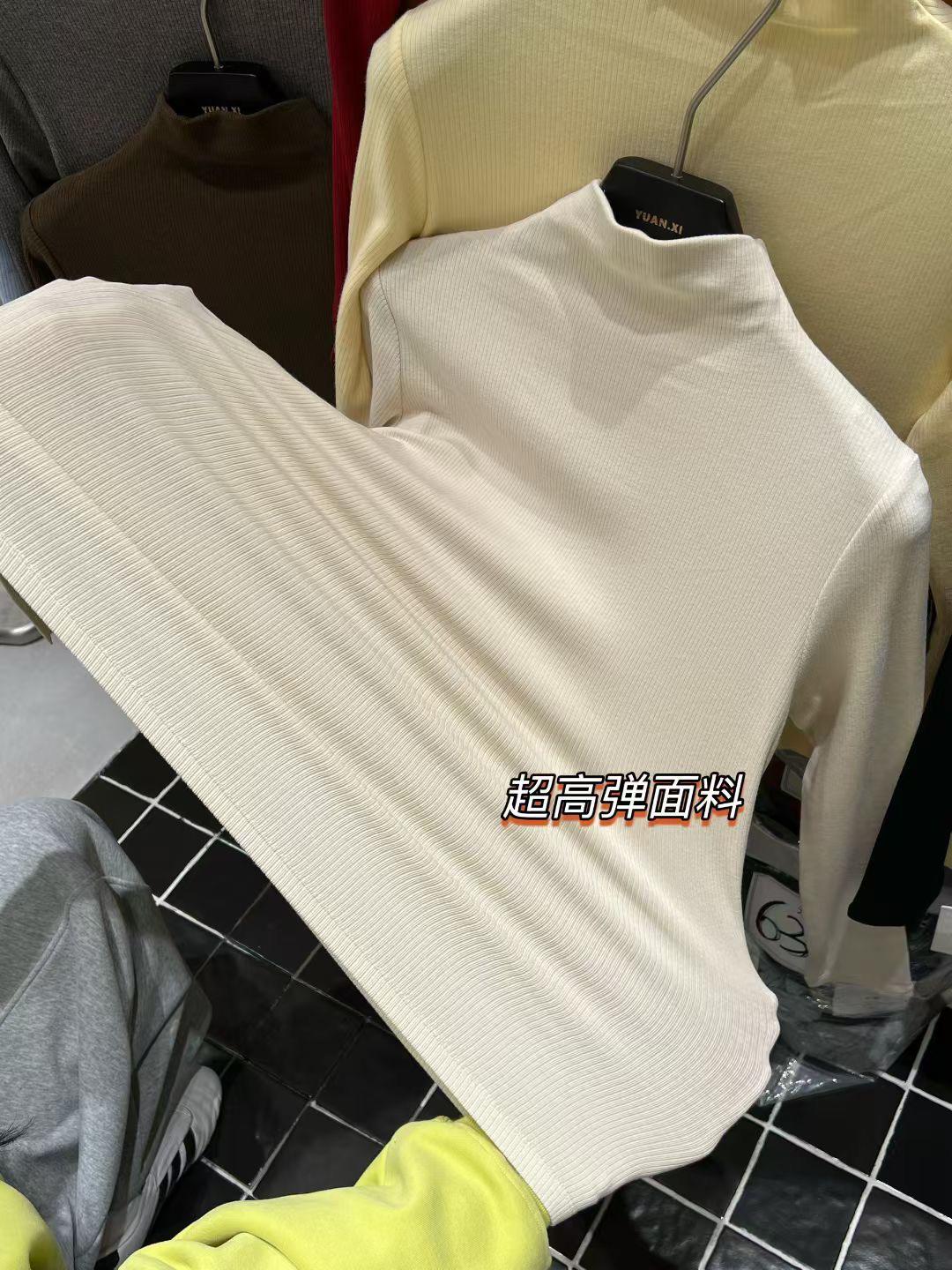 【C7922】螺紋高彈半高領加絨長袖打底衫