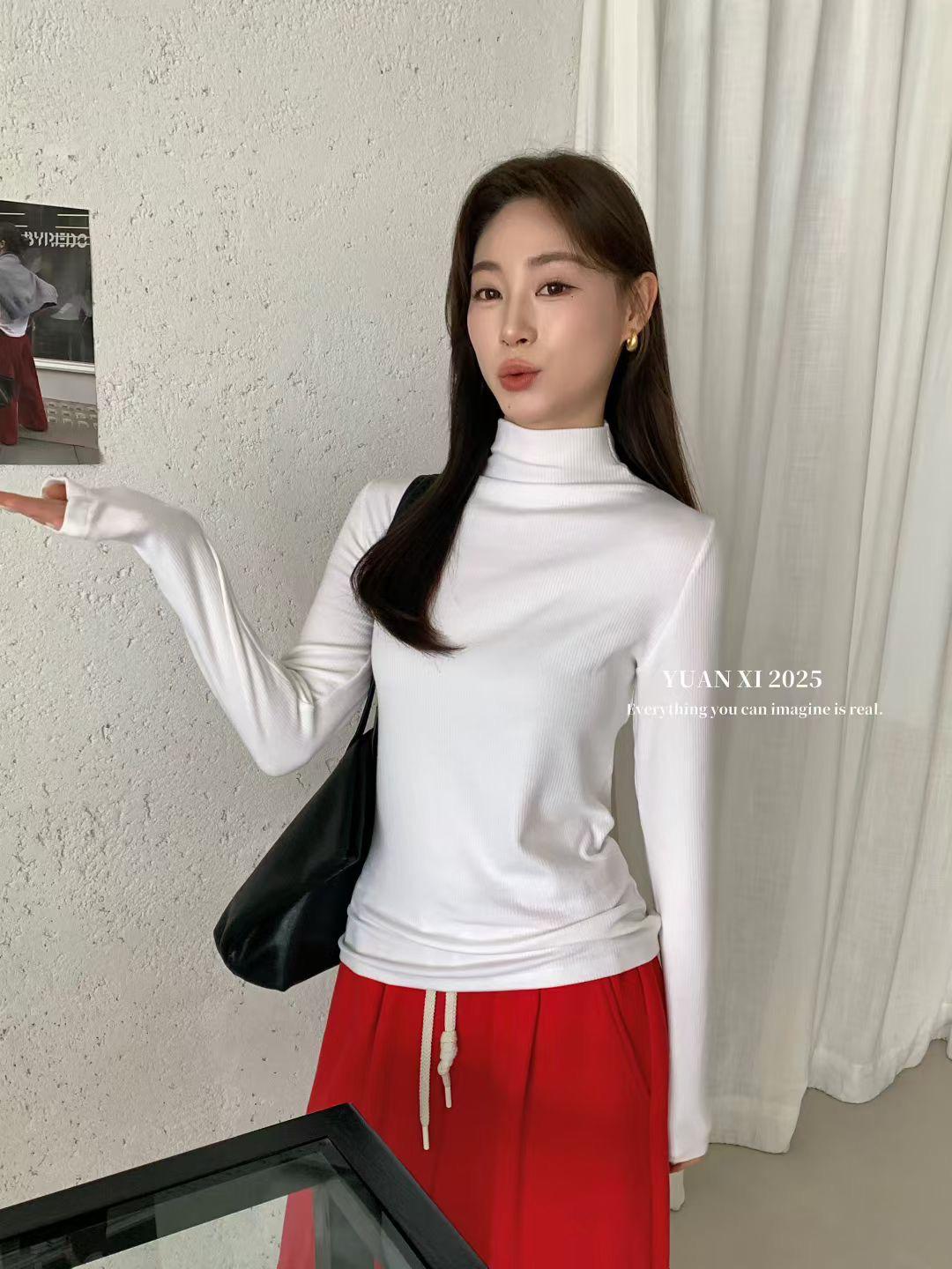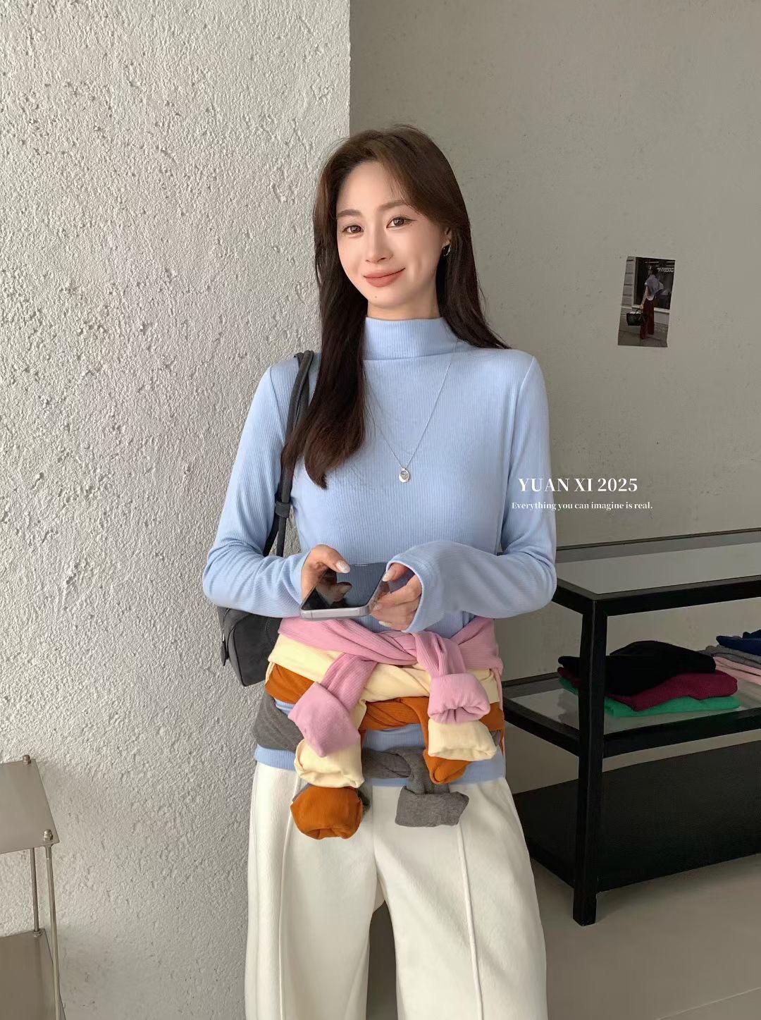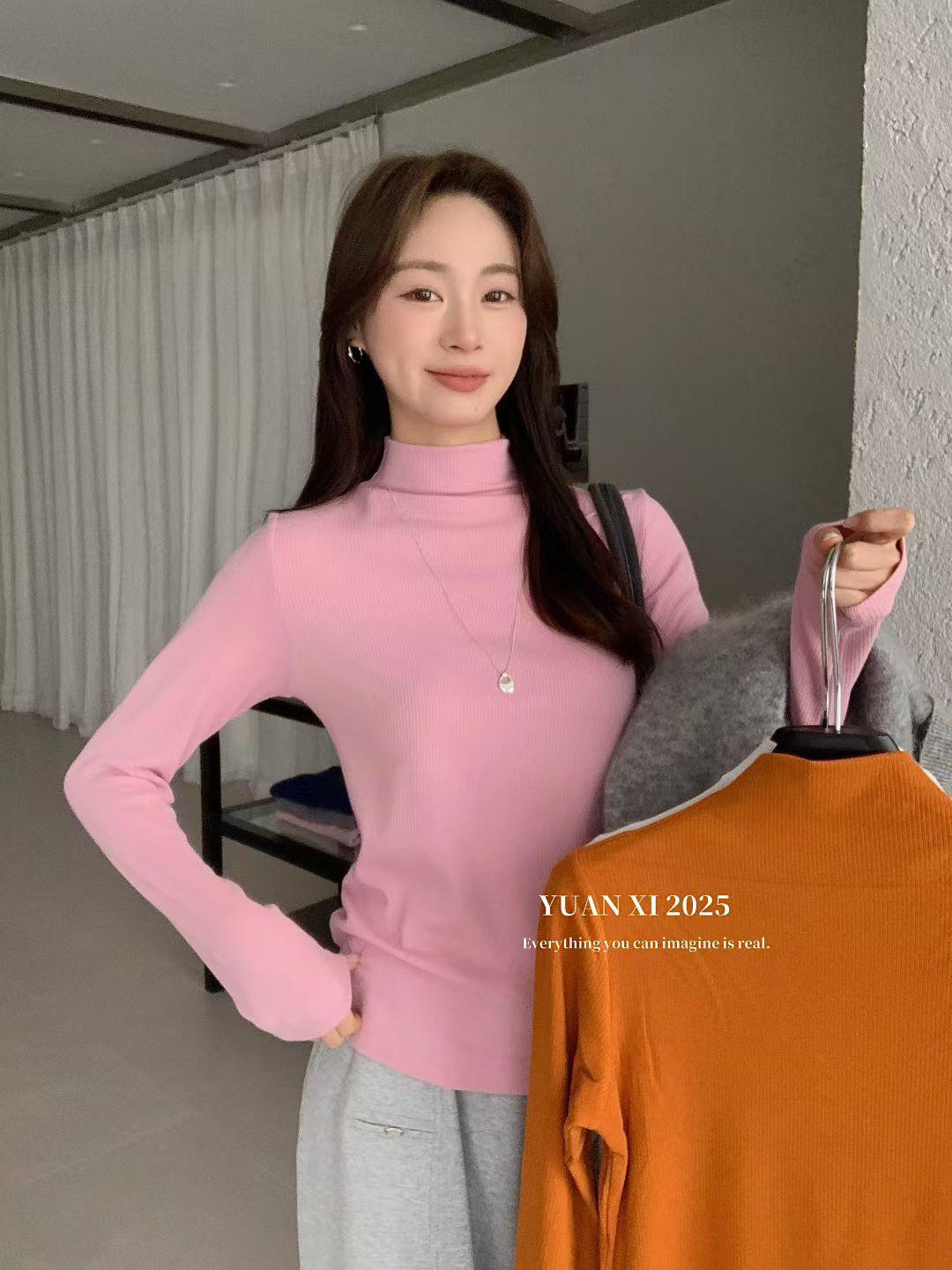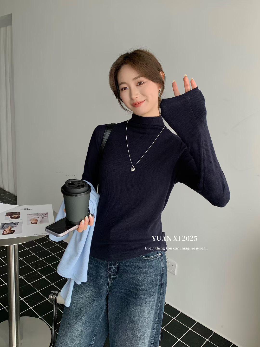 【C7922】螺紋高彈半高領加絨長袖打底衫