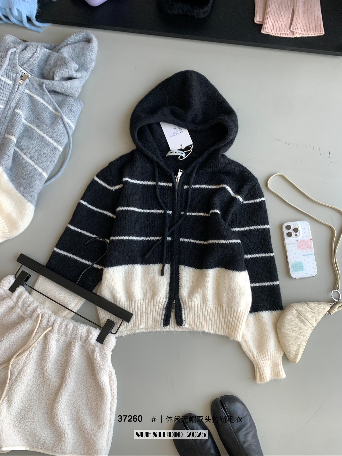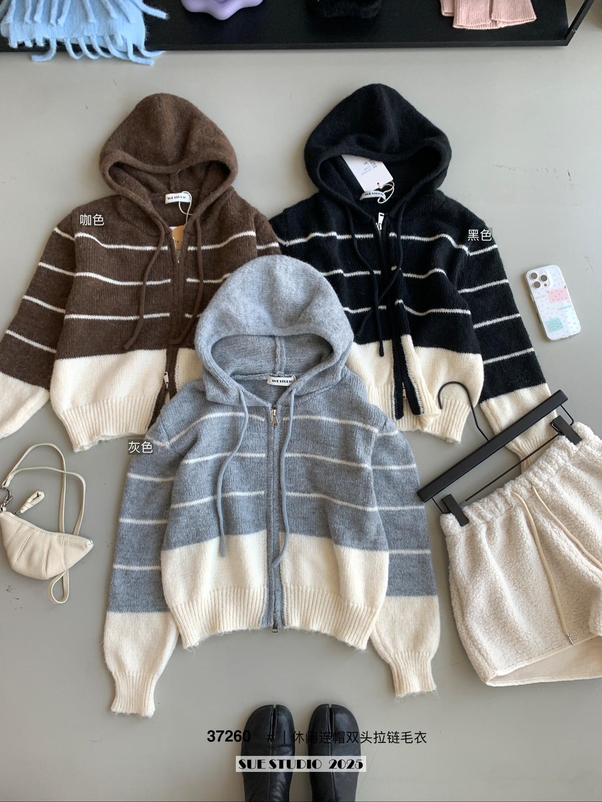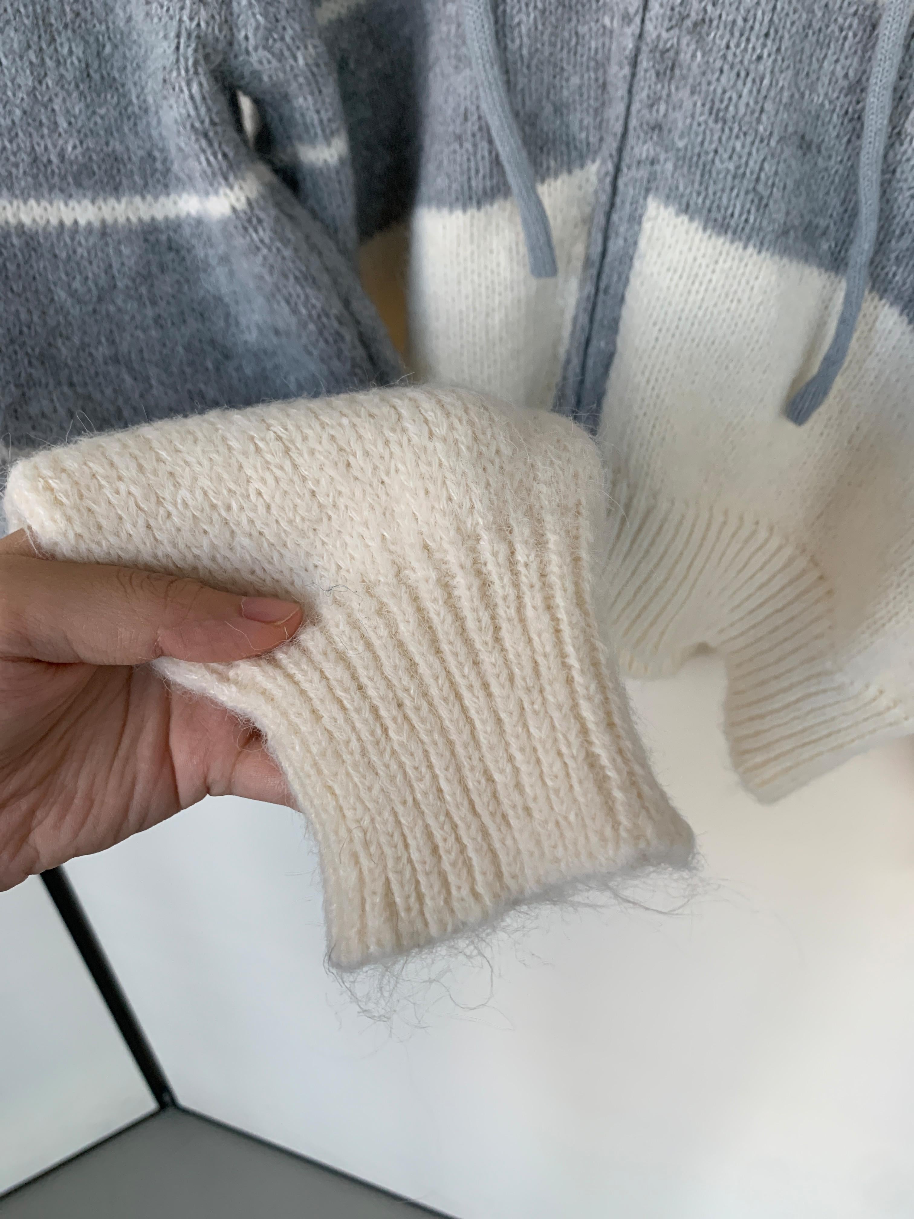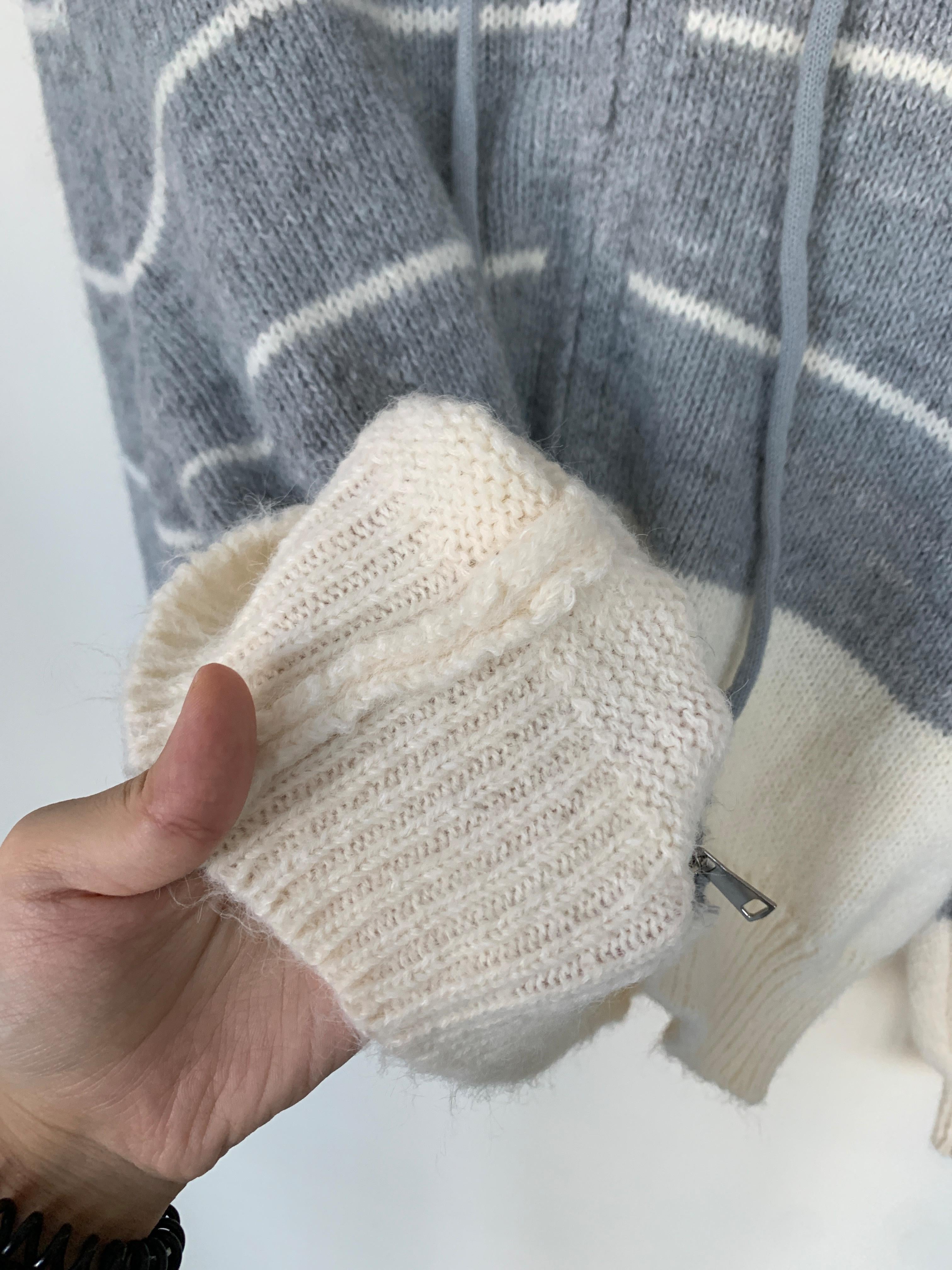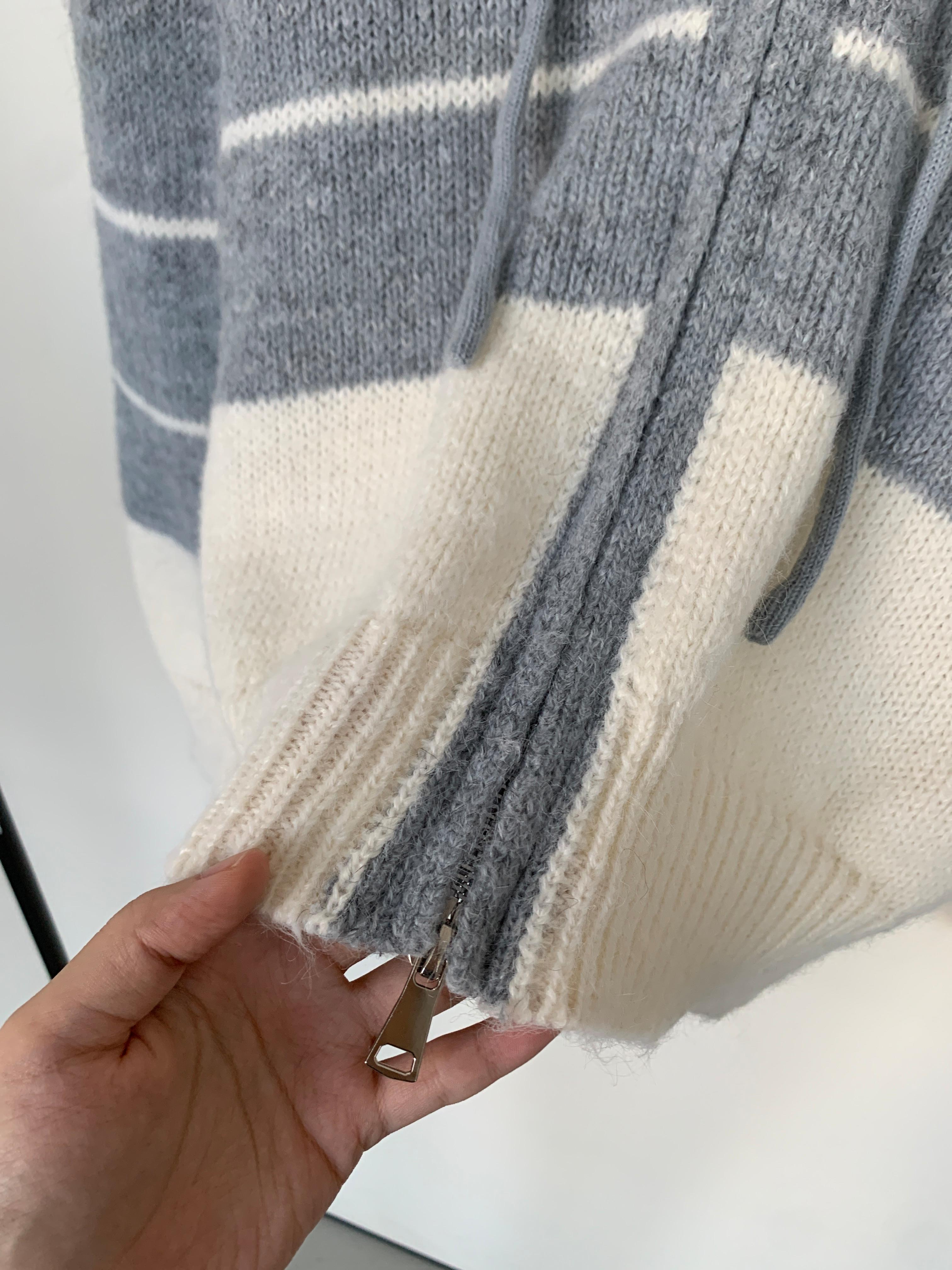 【C7929】條紋拼色連帽抽繩寬鬆毛衣
