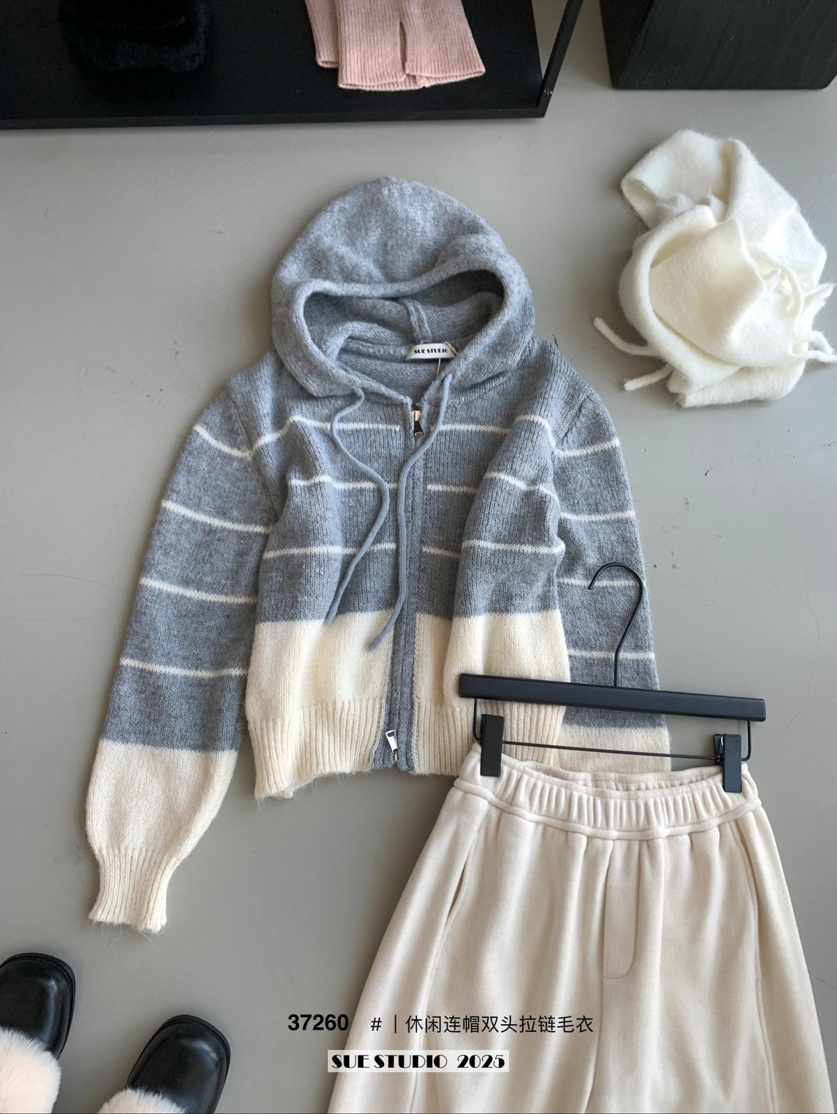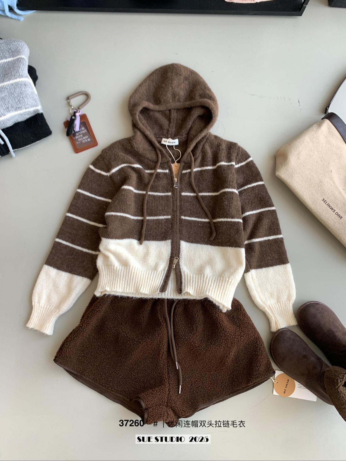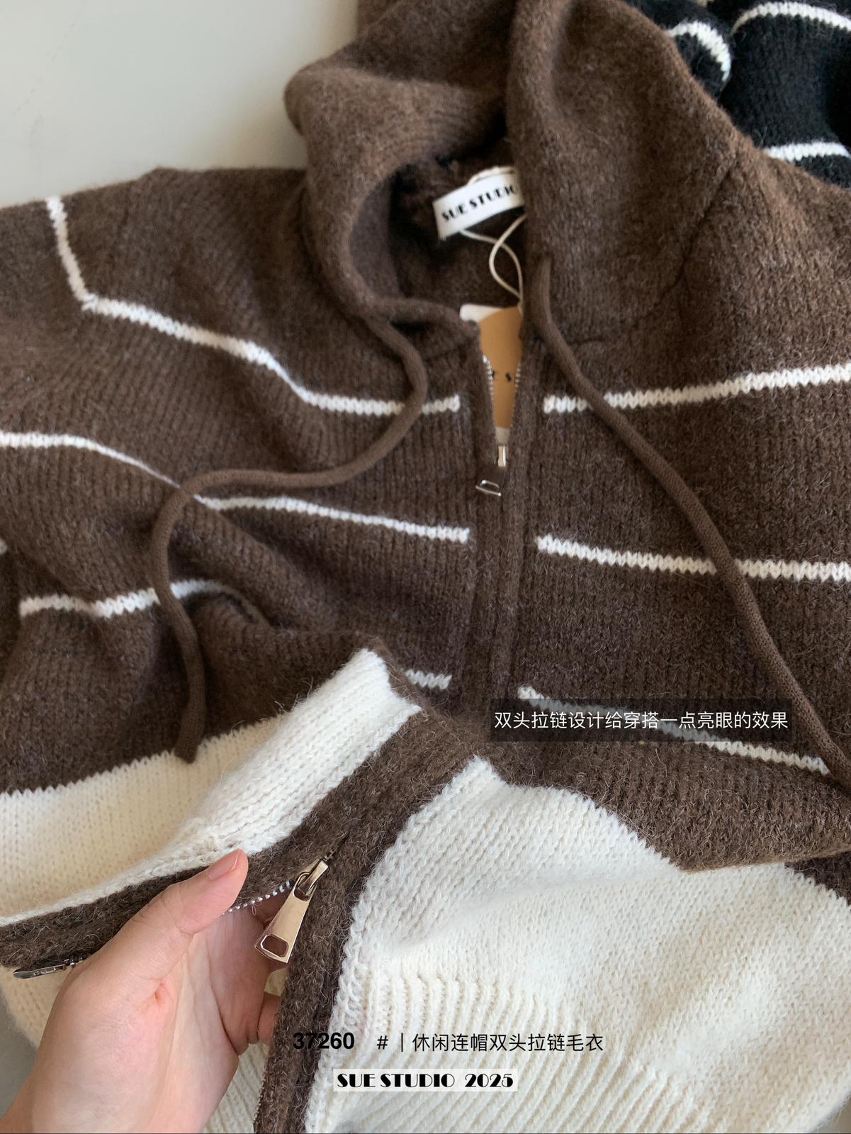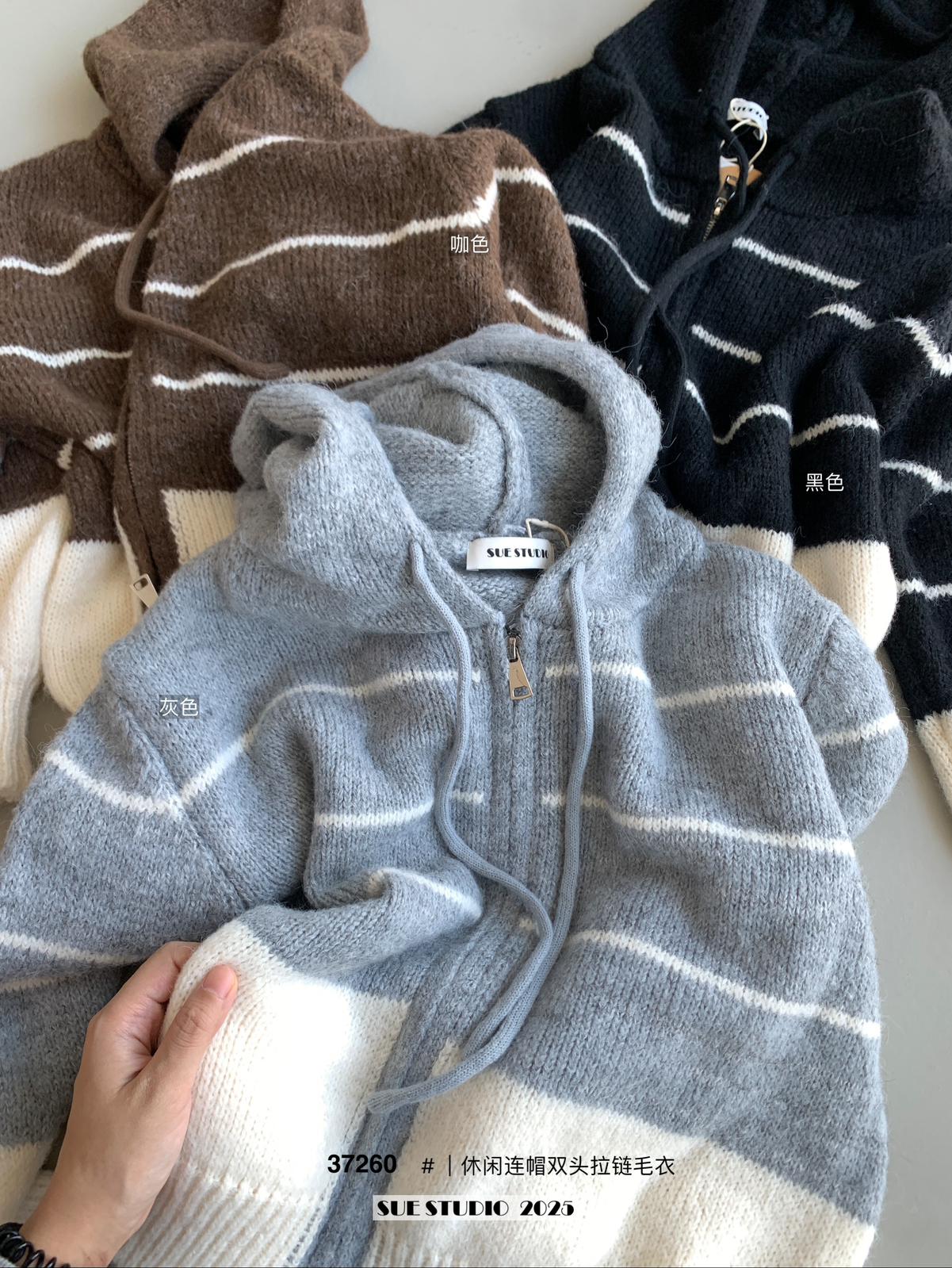 【C7929】條紋拼色連帽抽繩寬鬆毛衣