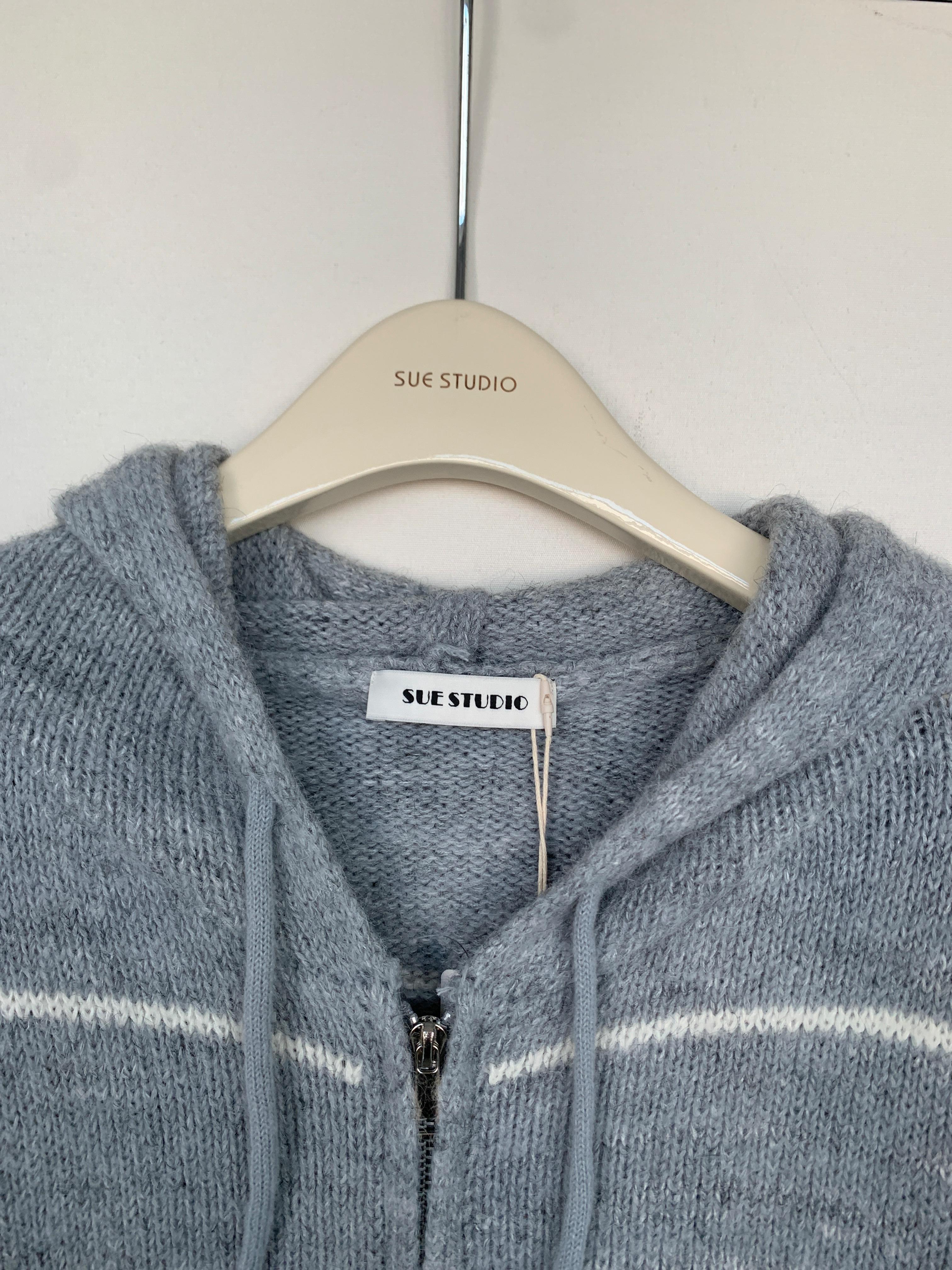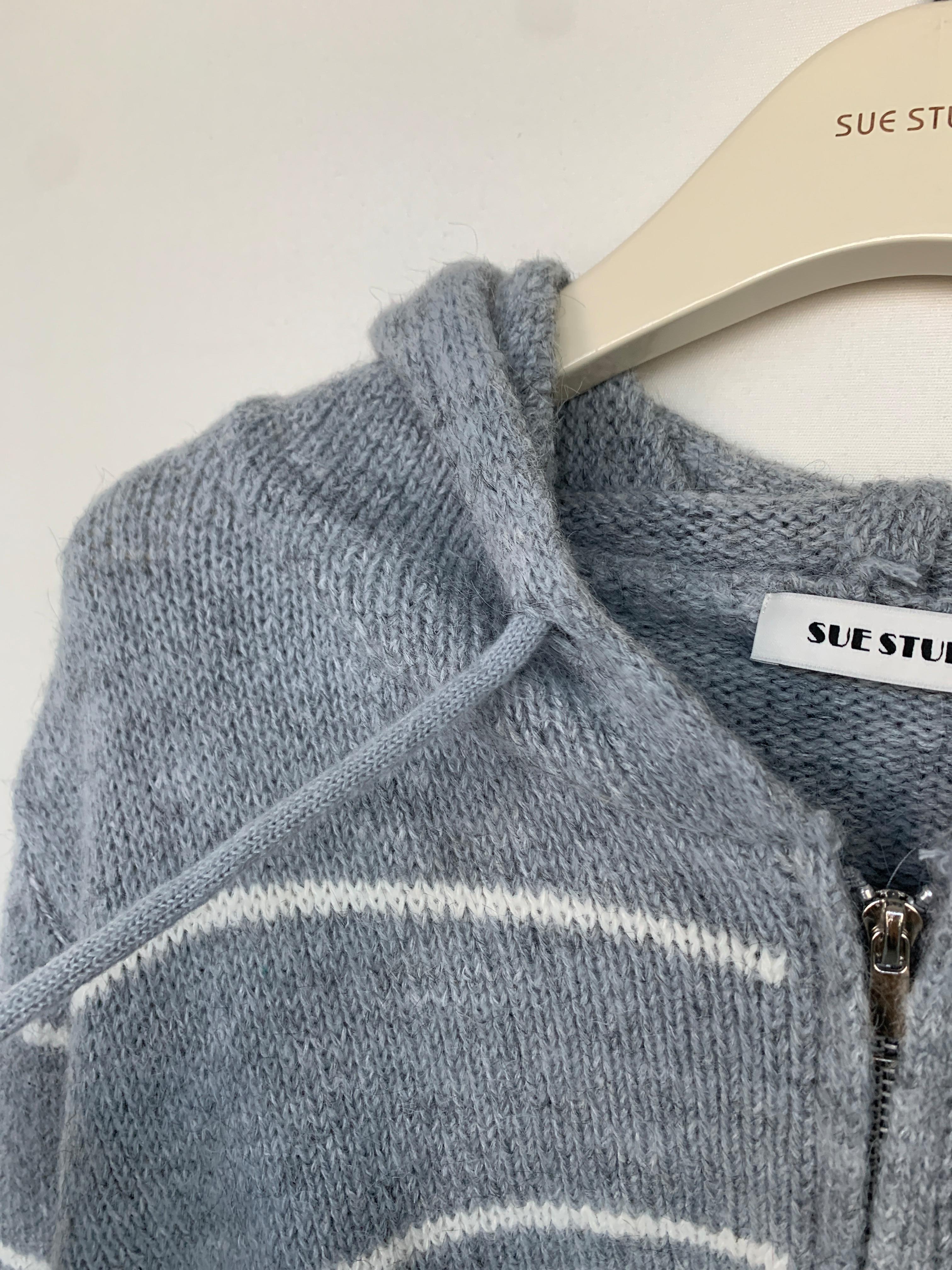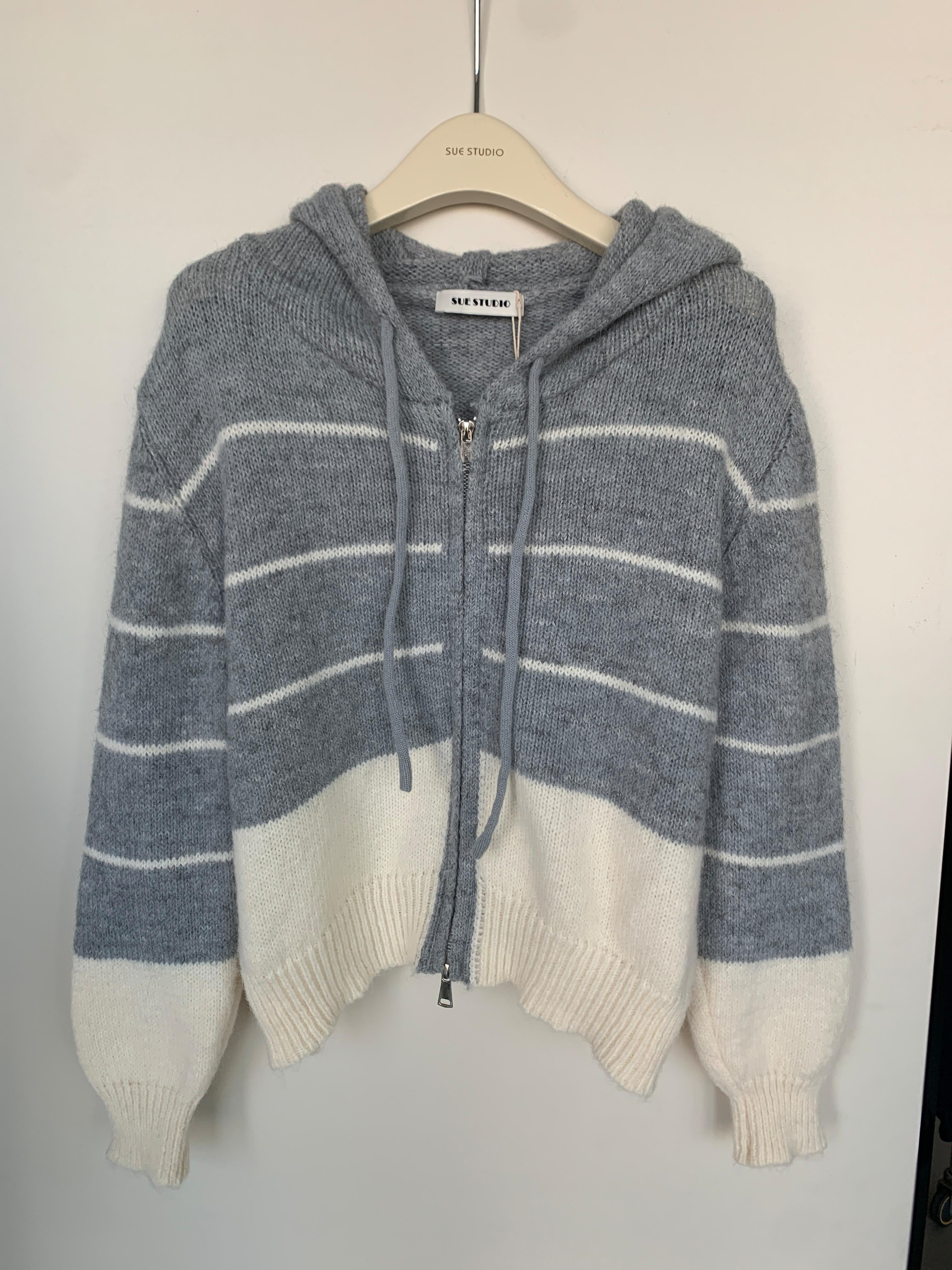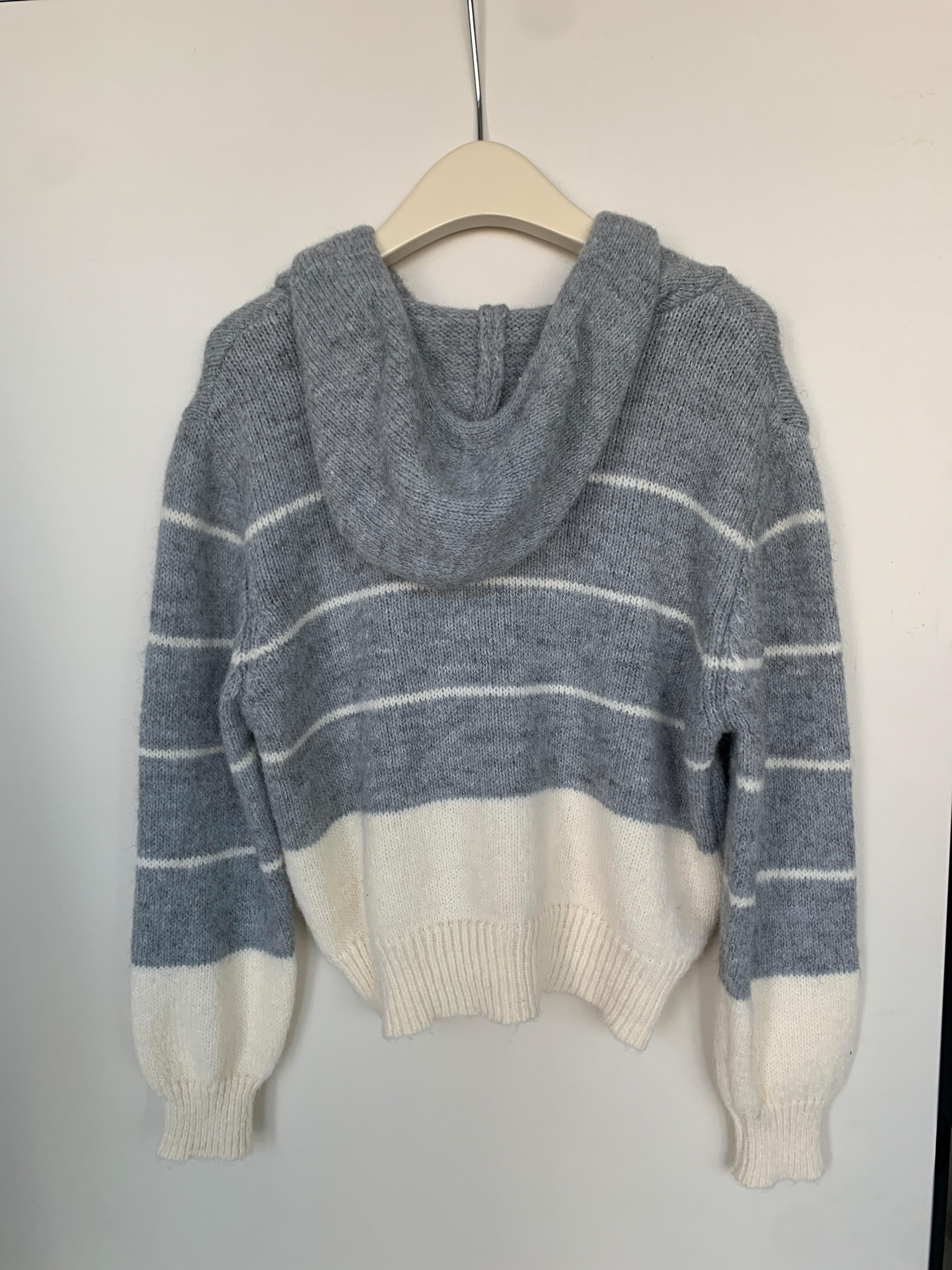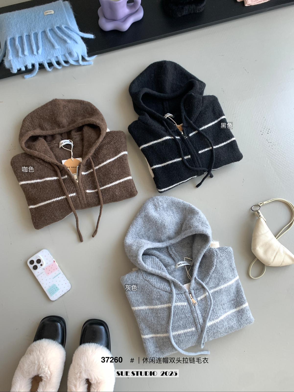 【C7929】條紋拼色連帽抽繩寬鬆毛衣