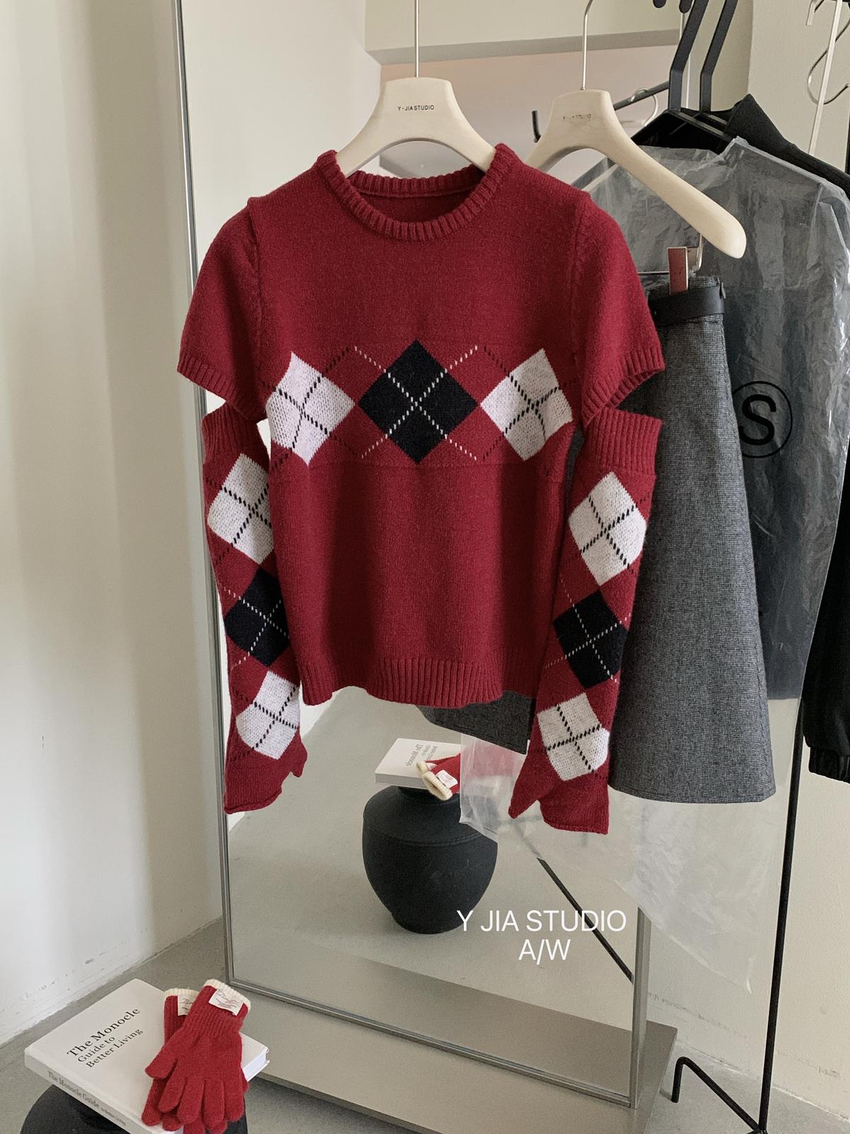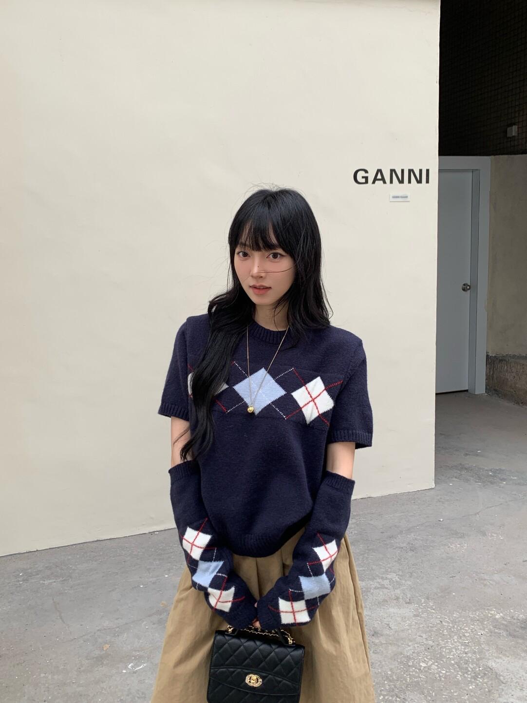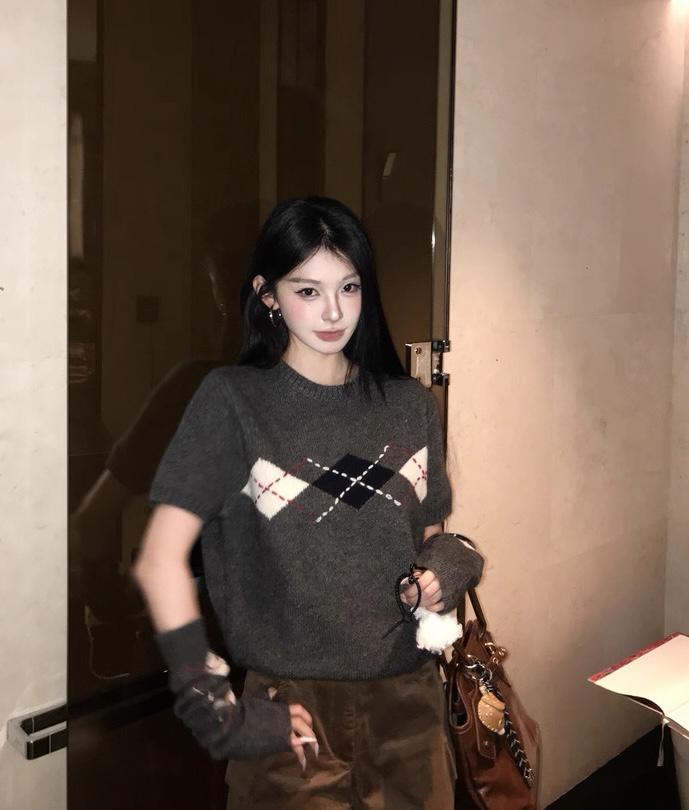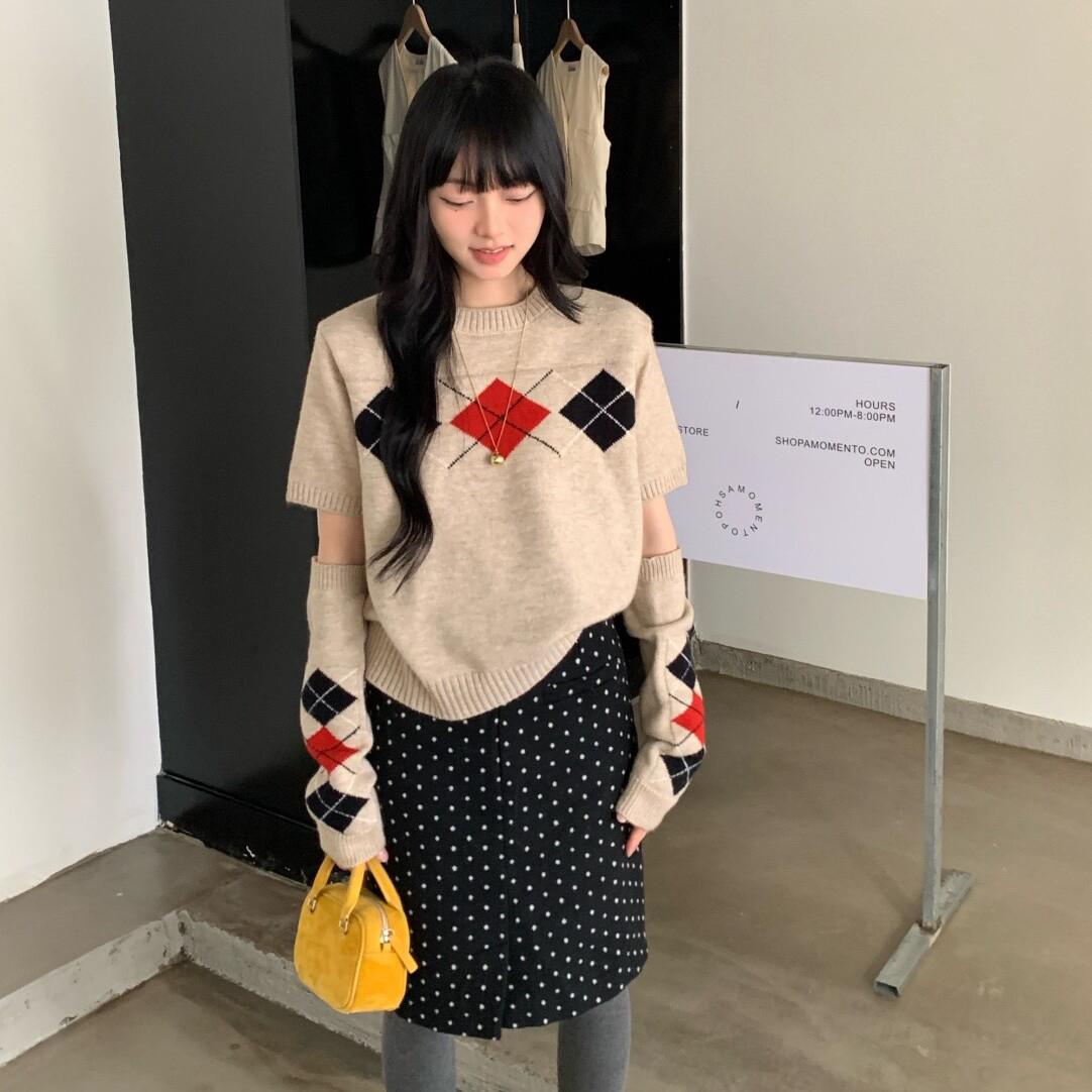 【C8095】元氣歐尼~復古菱格設計感圓領短袖保暖毛衣(配袖套)