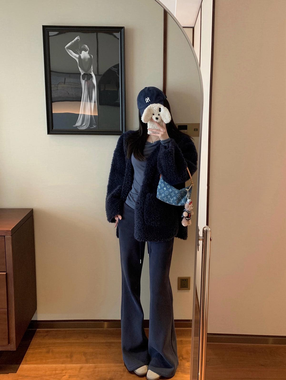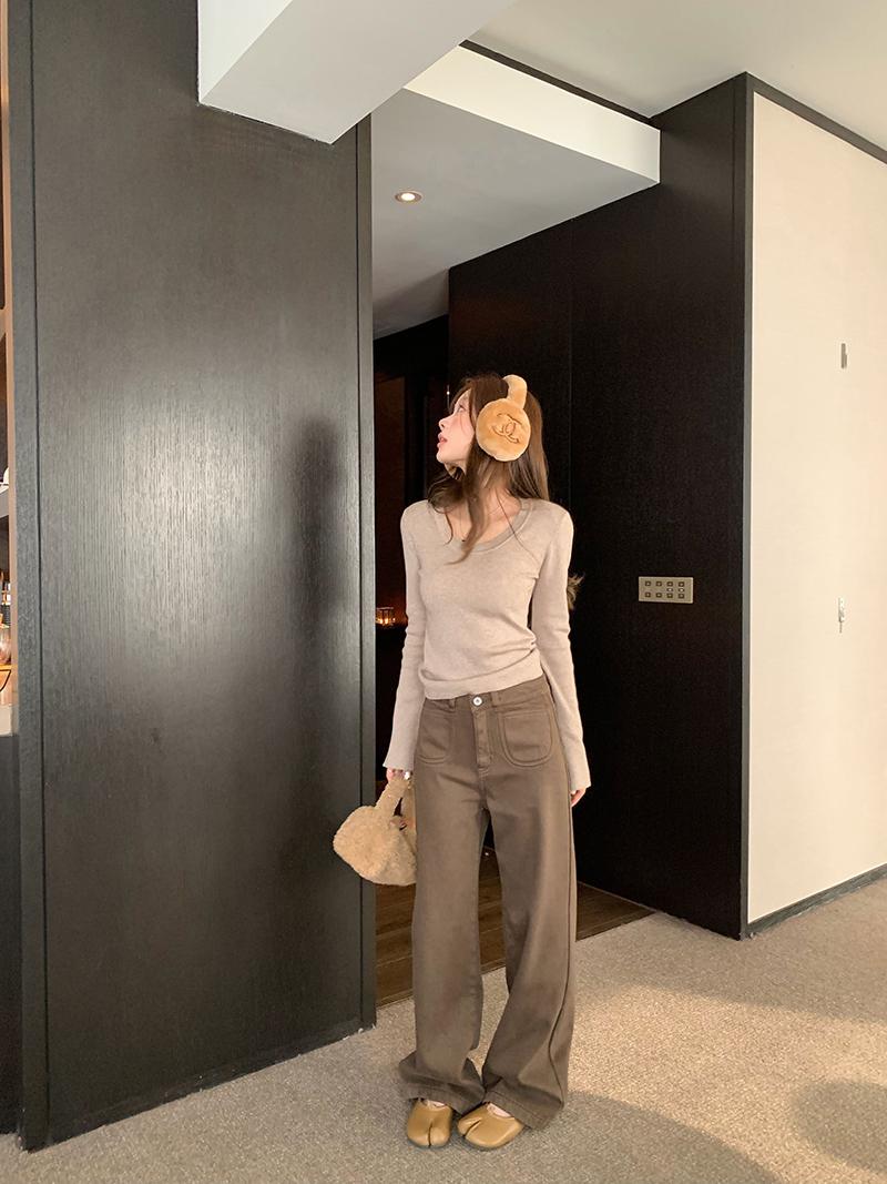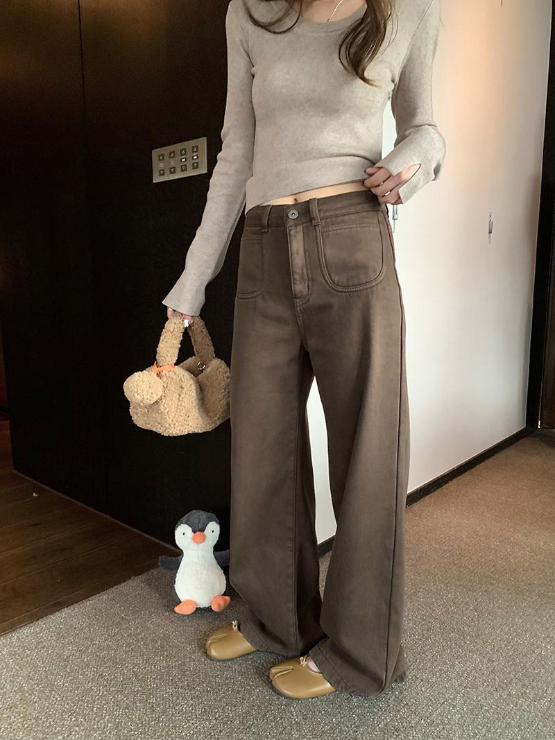 【C8146】複合絨百搭寬鬆闊腿褲牛仔褲(配腰帶、聖誕帽小熊掛件)