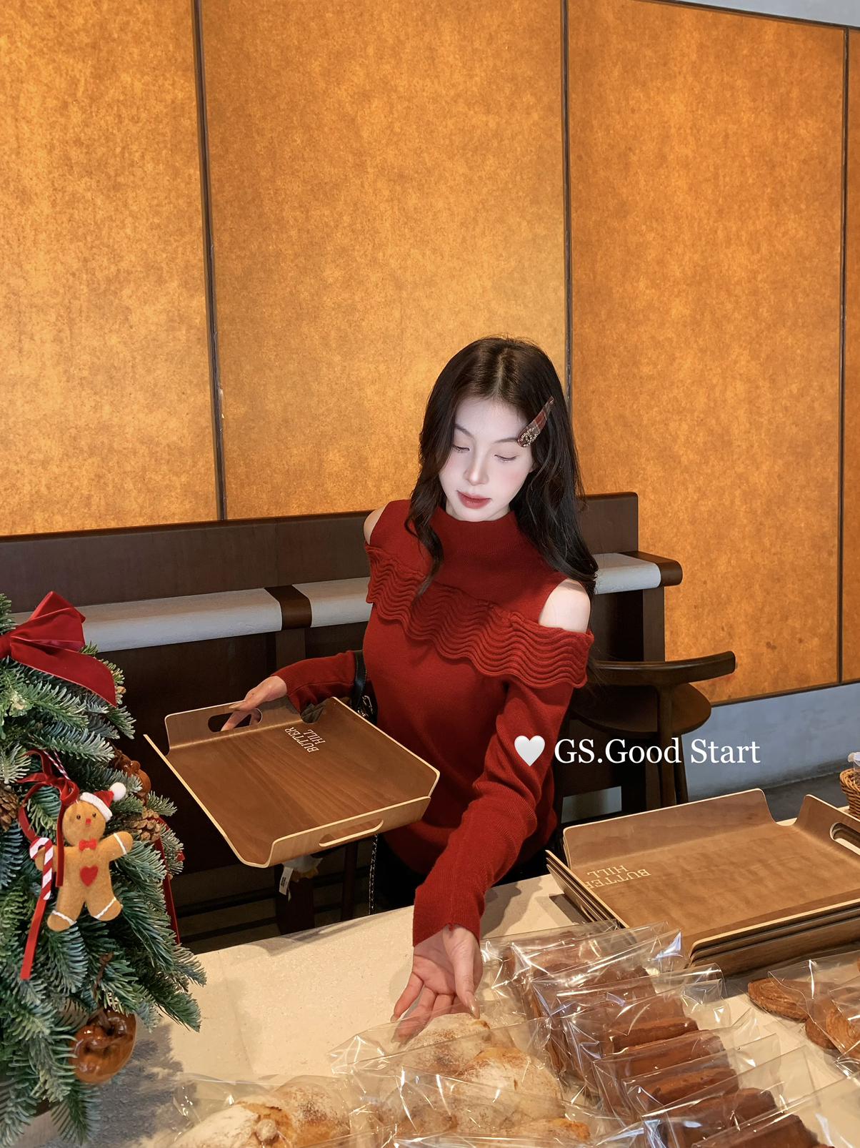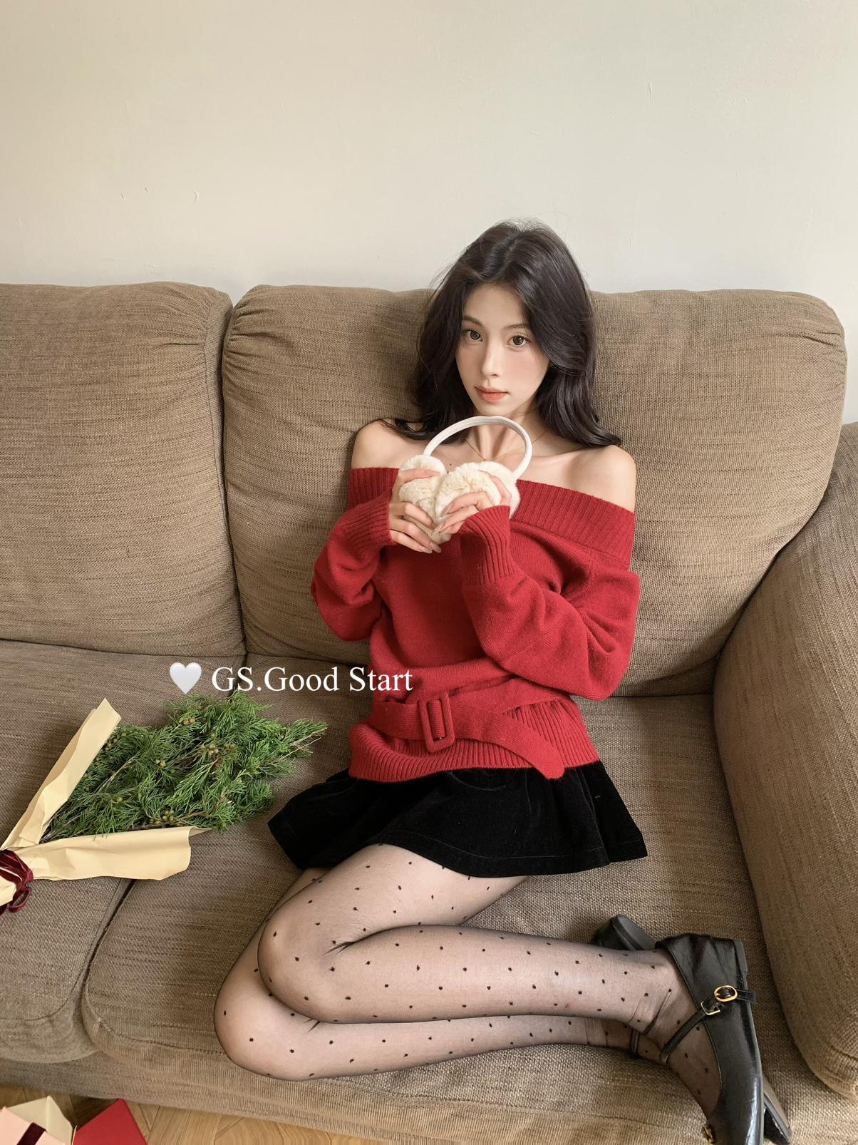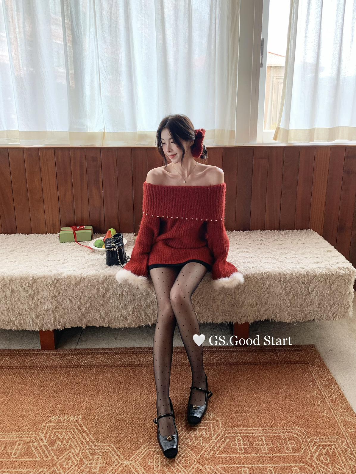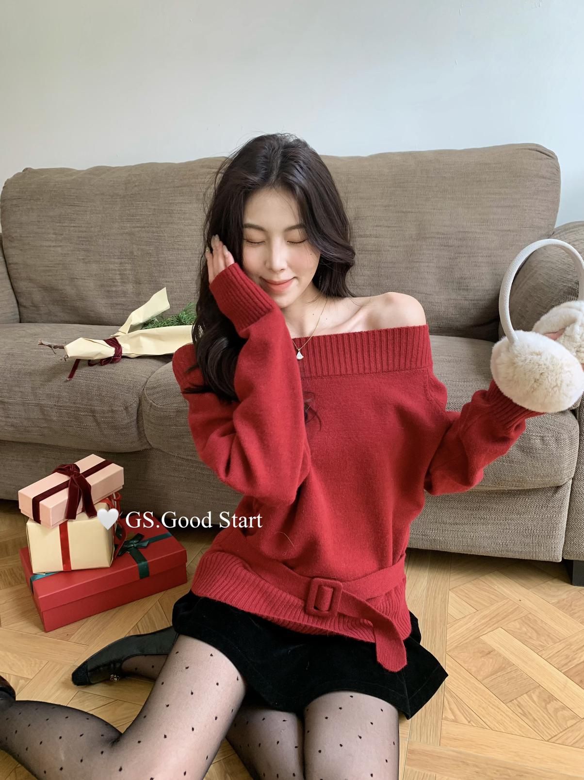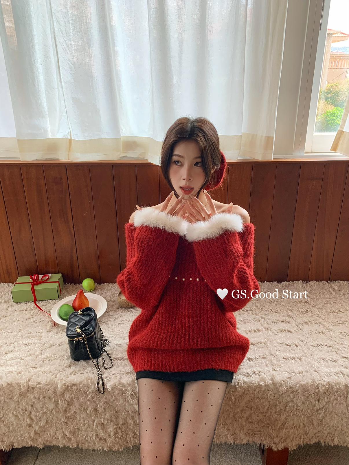 【C8167】紅色太顯白了!強推!心動一萬次~冬季浪漫氣質氛圍感一字肩寬鬆保暖毛衣(配可拆卸髮圈)