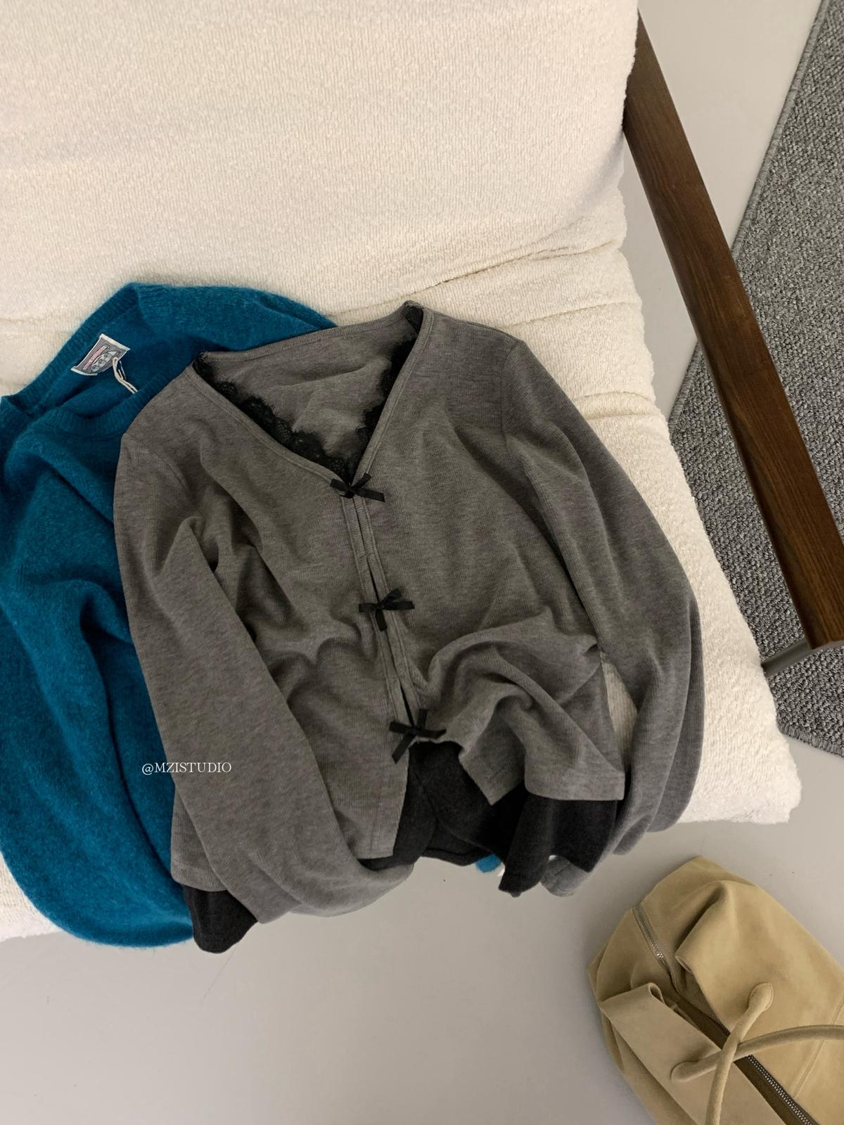 【C8152】網感爆款韓系冬季磨毛v領蕾絲拼接假兩件少女感減齡長袖T恤