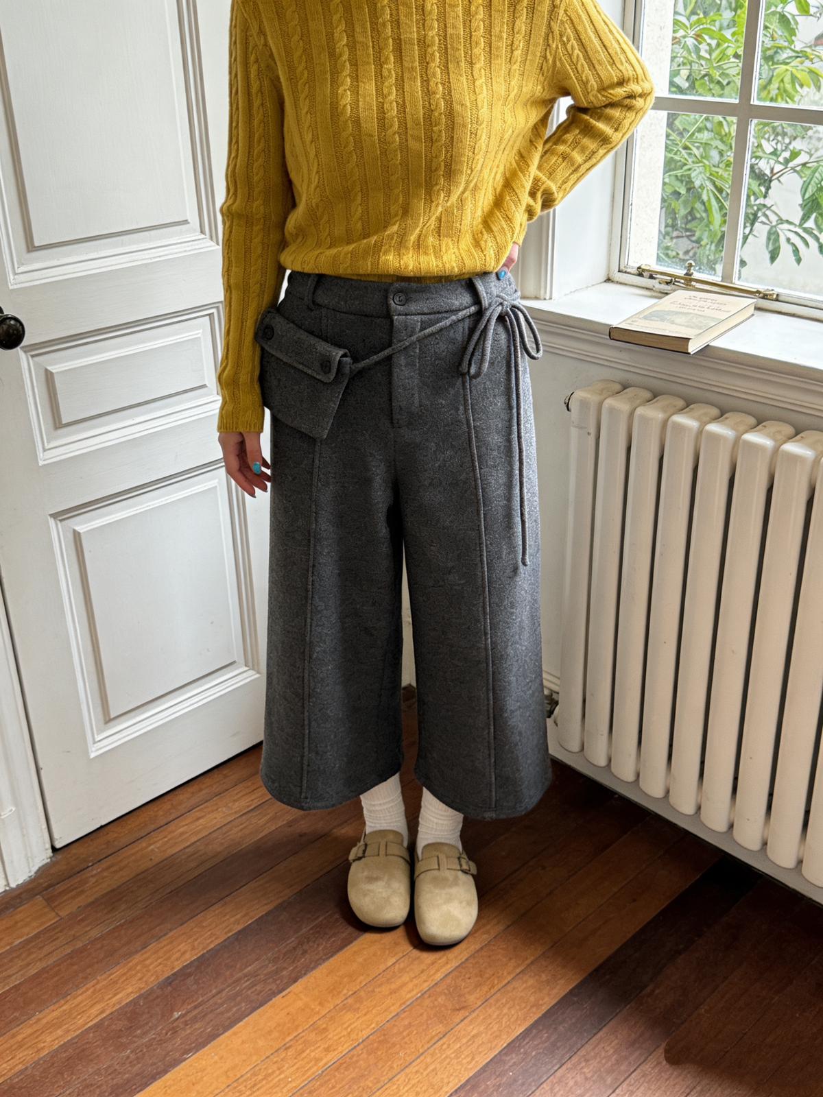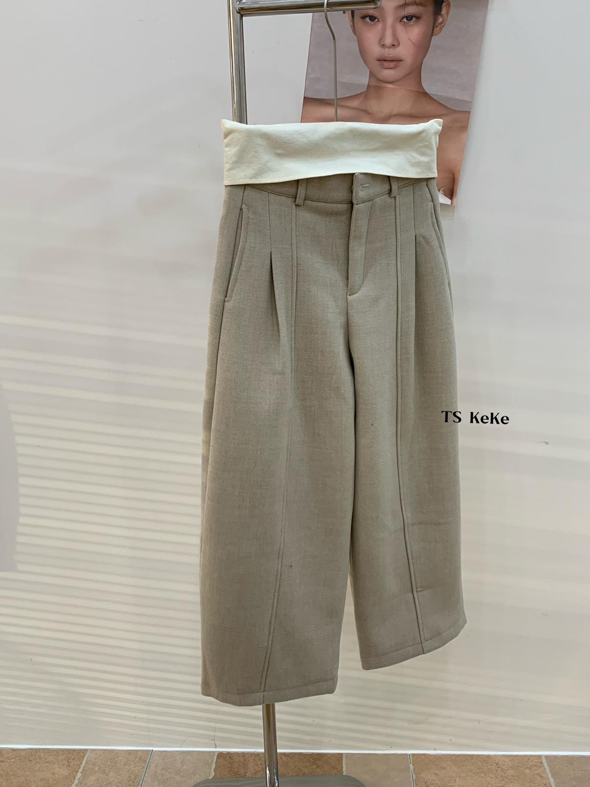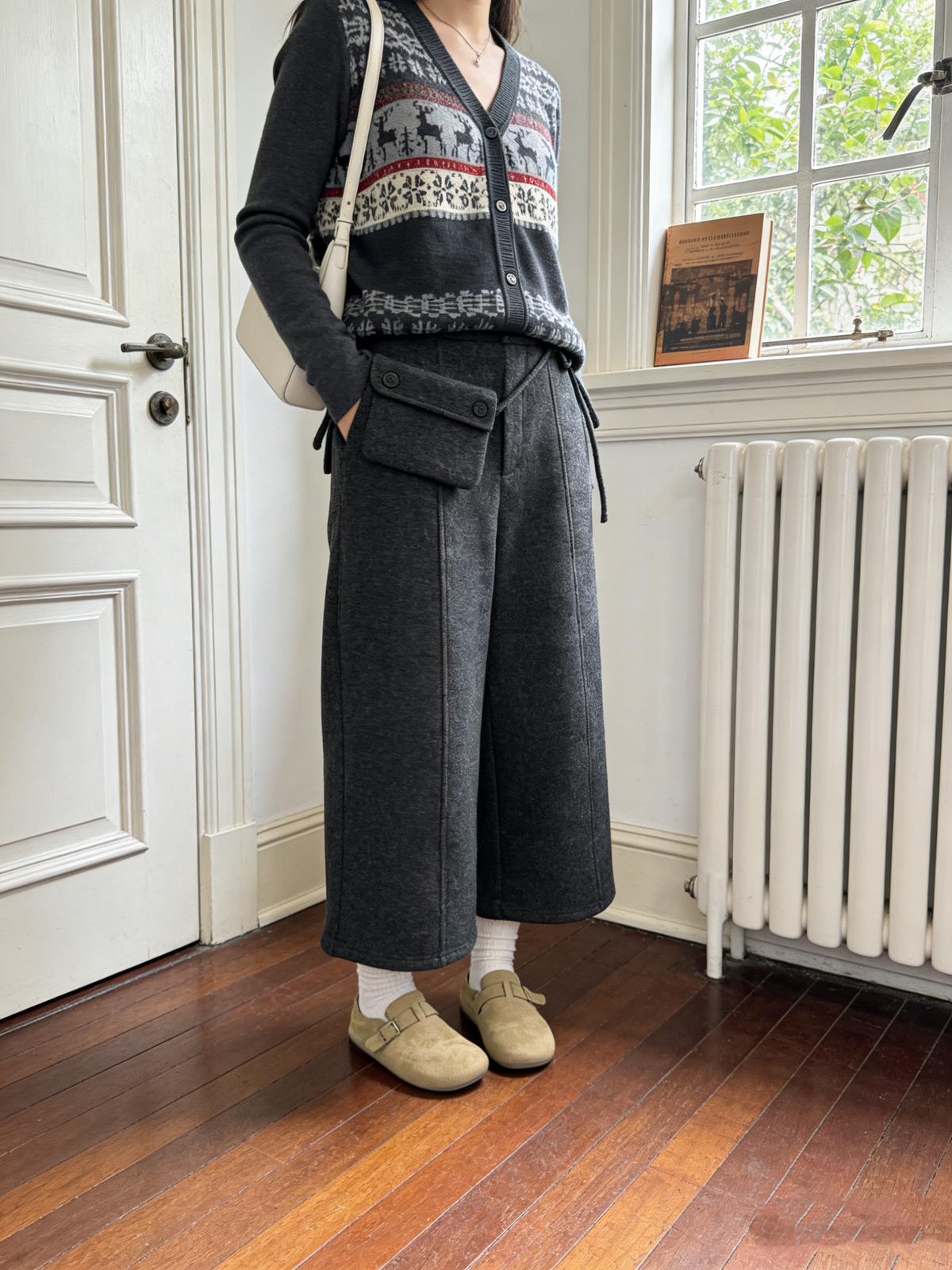 【C8159】2025高腰韓版寬鬆顯瘦百搭毛呢加絨休閒闊腿7分褲休閒褲(配腰包)