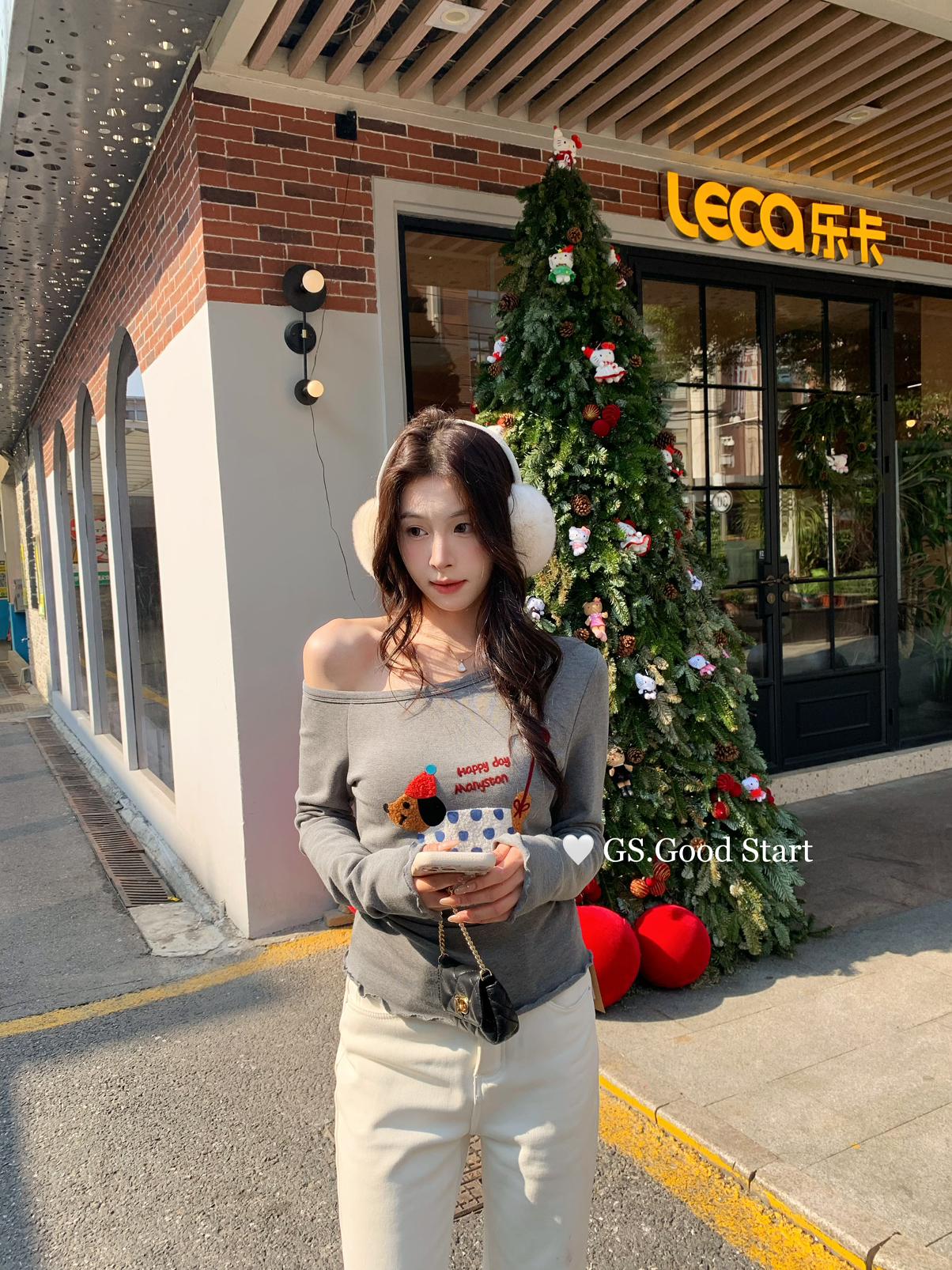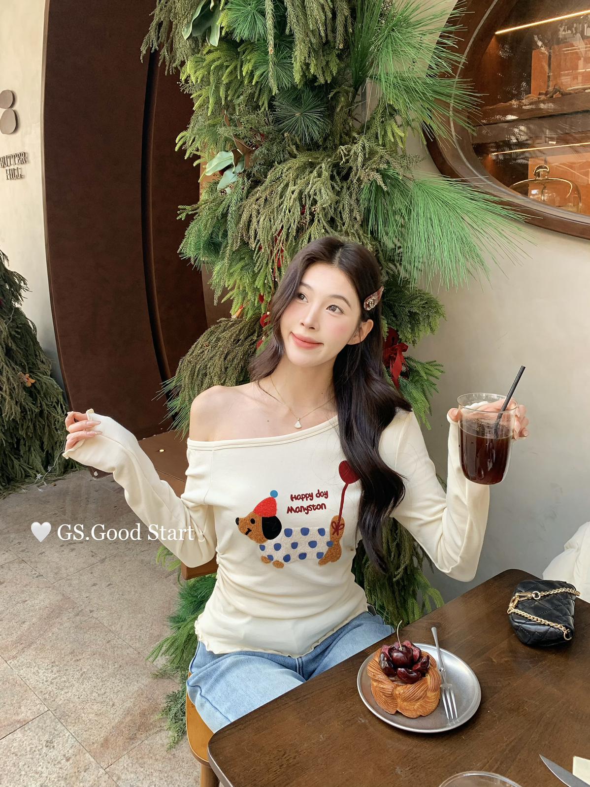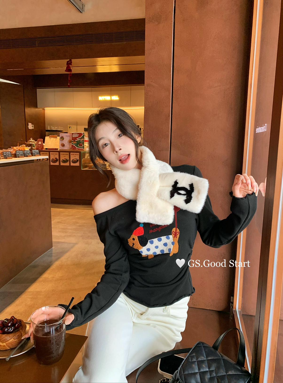 【C8168】植絨小狗好Q~內里加厚磨毛*鎖定溫暖!純欲減齡可愛印花斜肩小衫