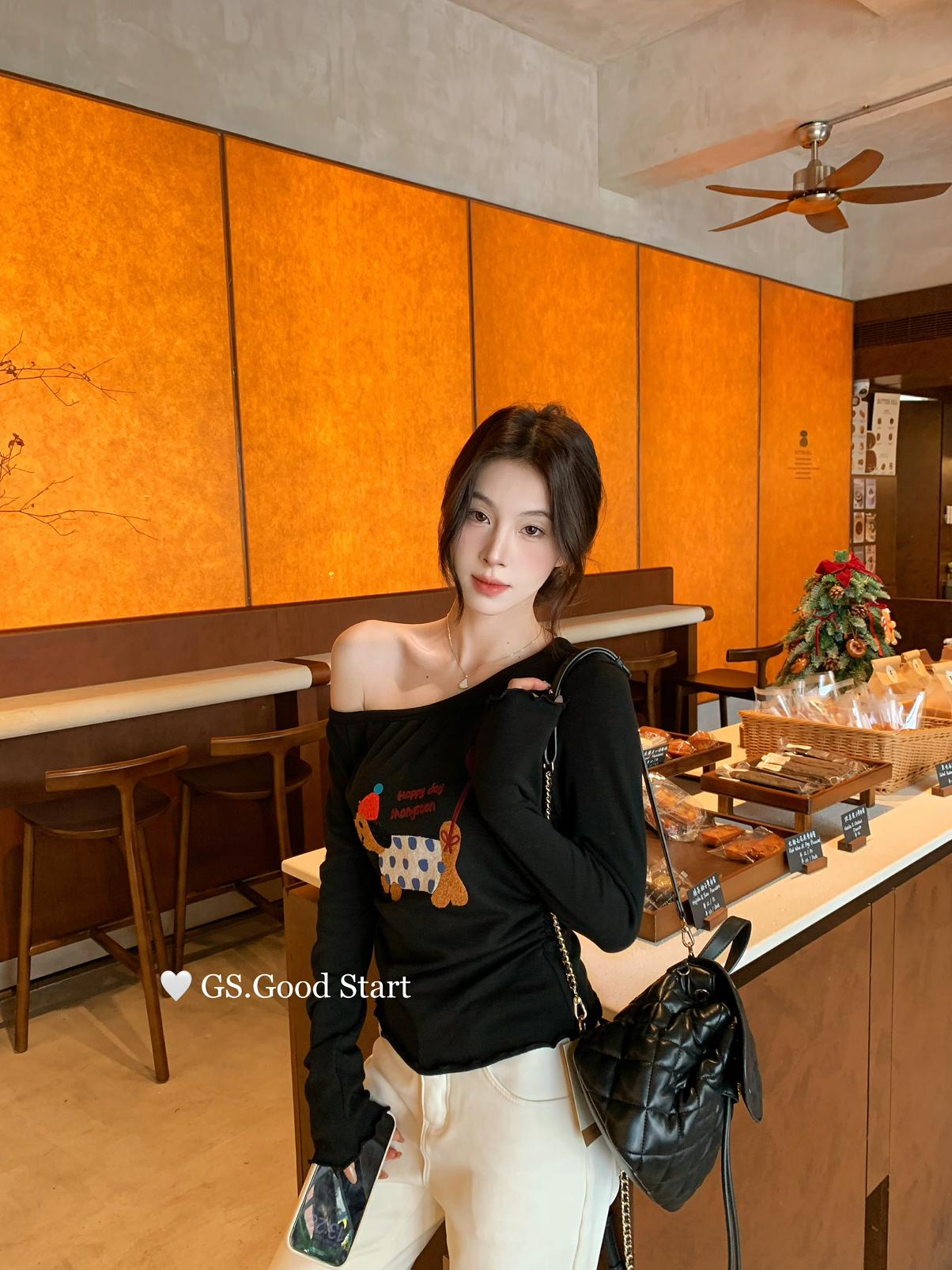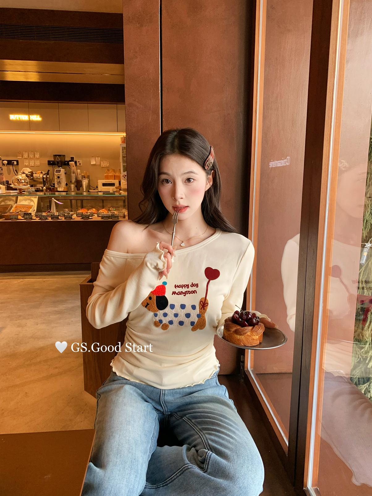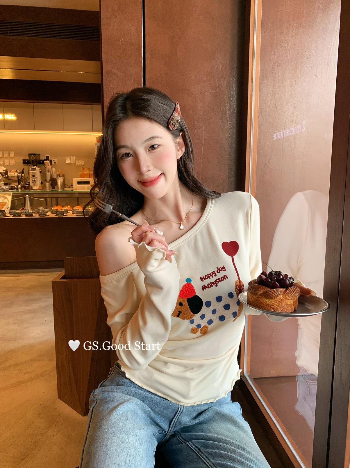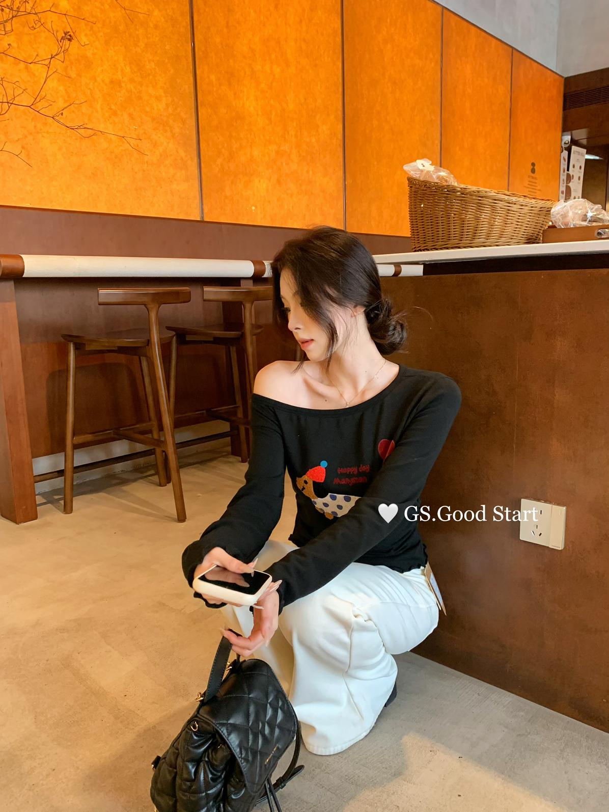 【C8168】植絨小狗好Q~內里加厚磨毛*鎖定溫暖!純欲減齡可愛印花斜肩小衫