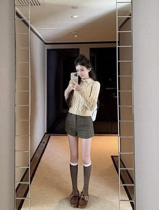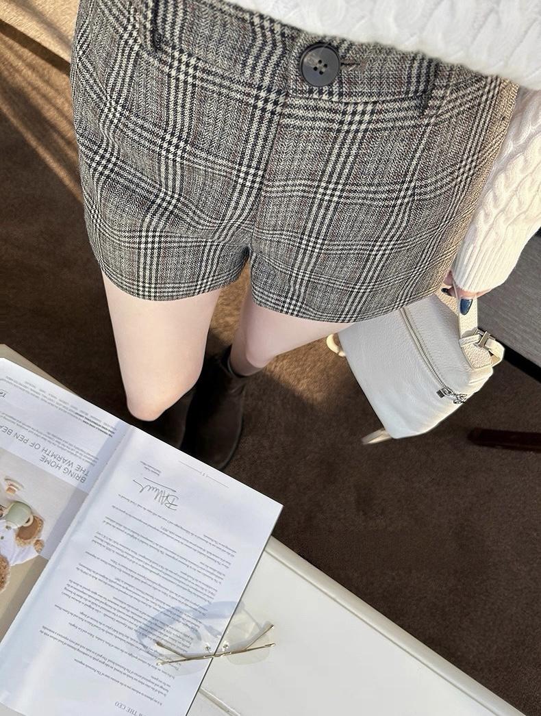 【C8017】韓系復古百搭高腰格紋條約寬鬆休閒短褲
