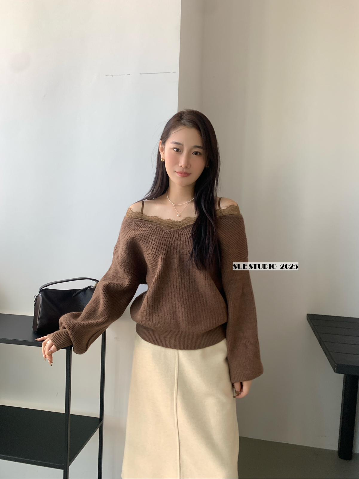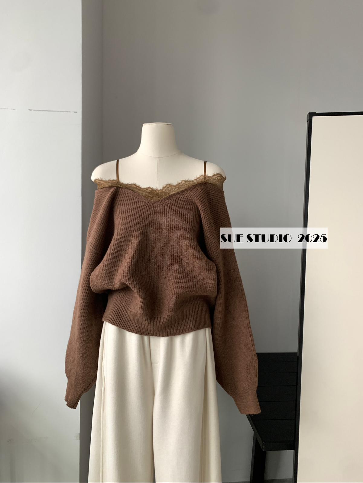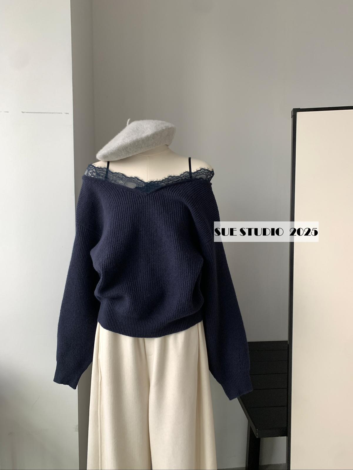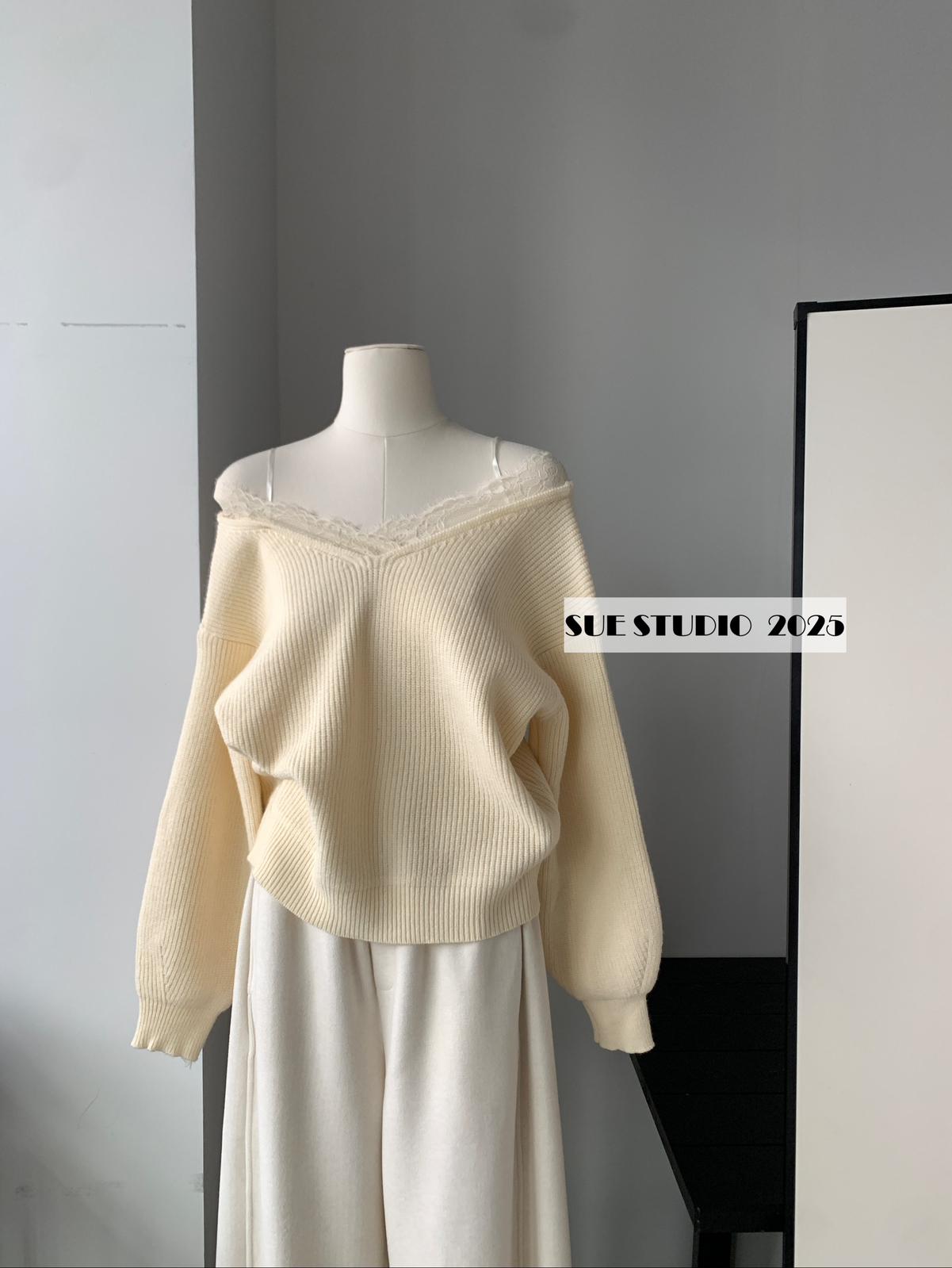 【C8020】韓系蕾絲小設計感一字領毛衣