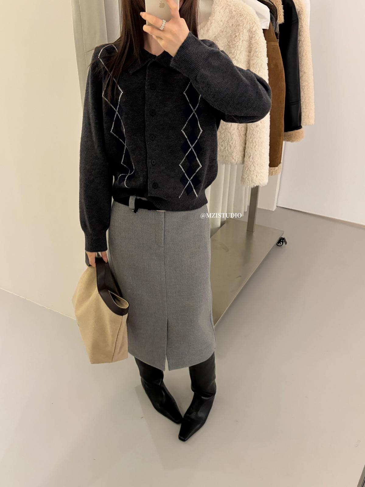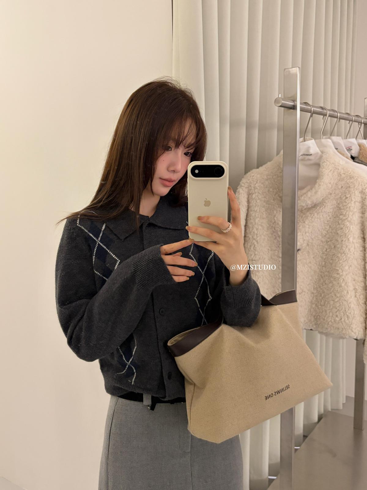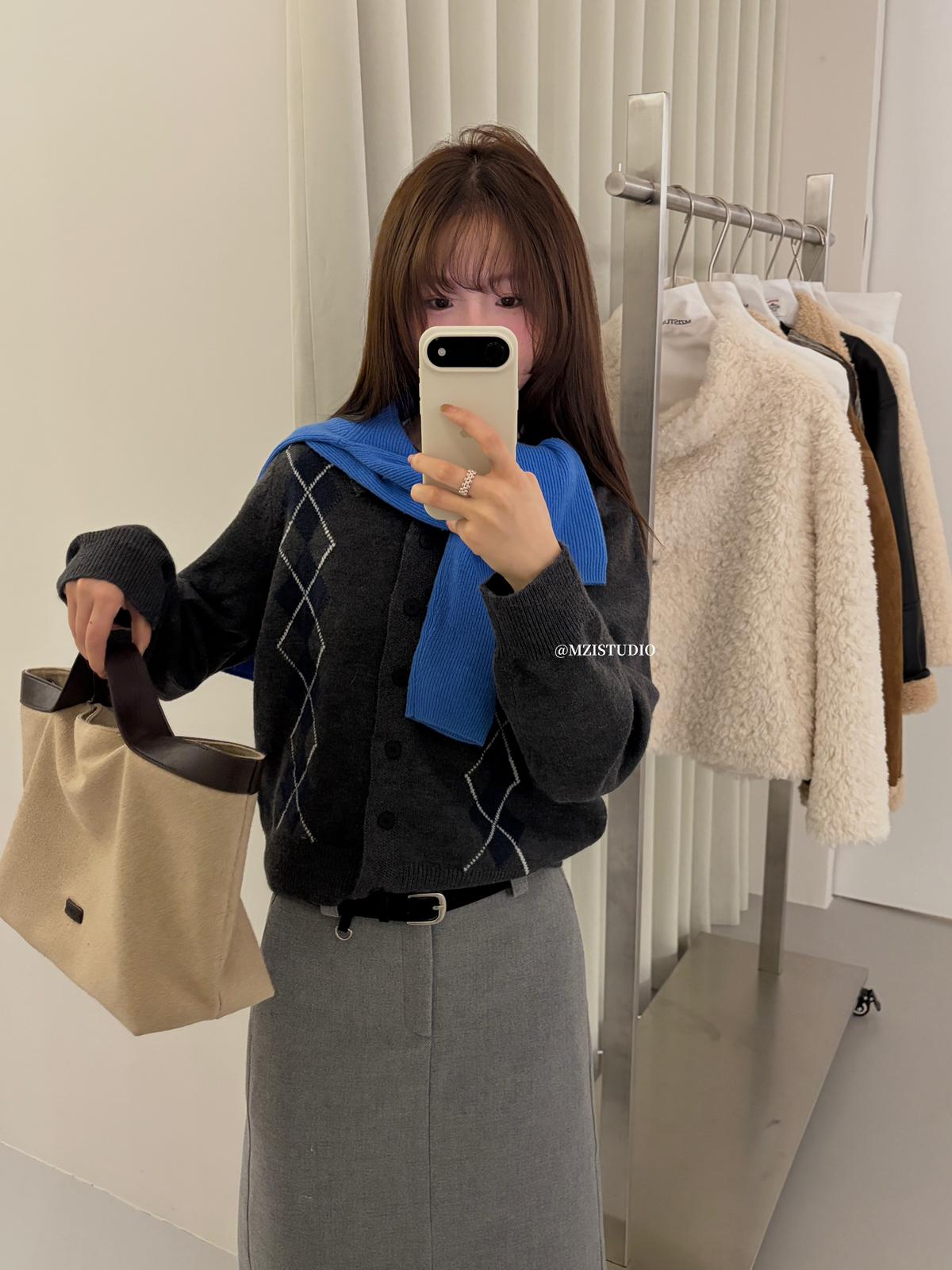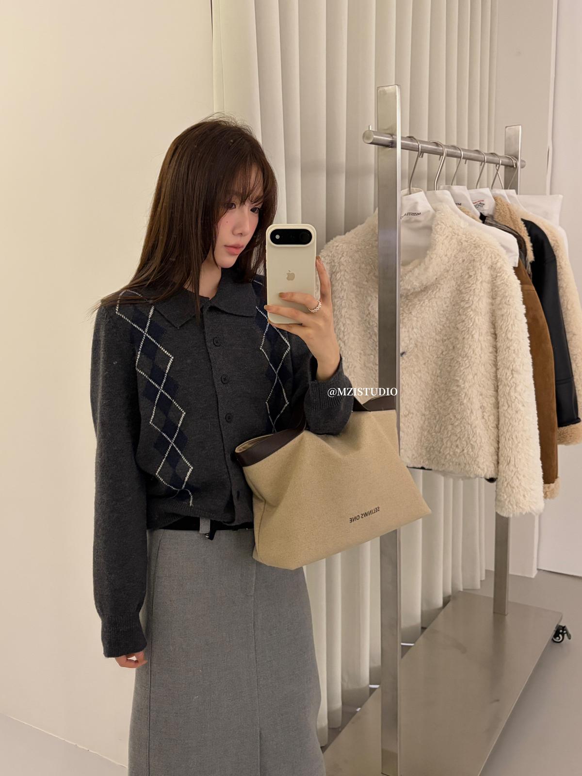 【C8028】英倫學院風秋冬巴恩風棱形提花絨感輕盈中性色調翻領開衫外套毛衣(含6%羊毛)
