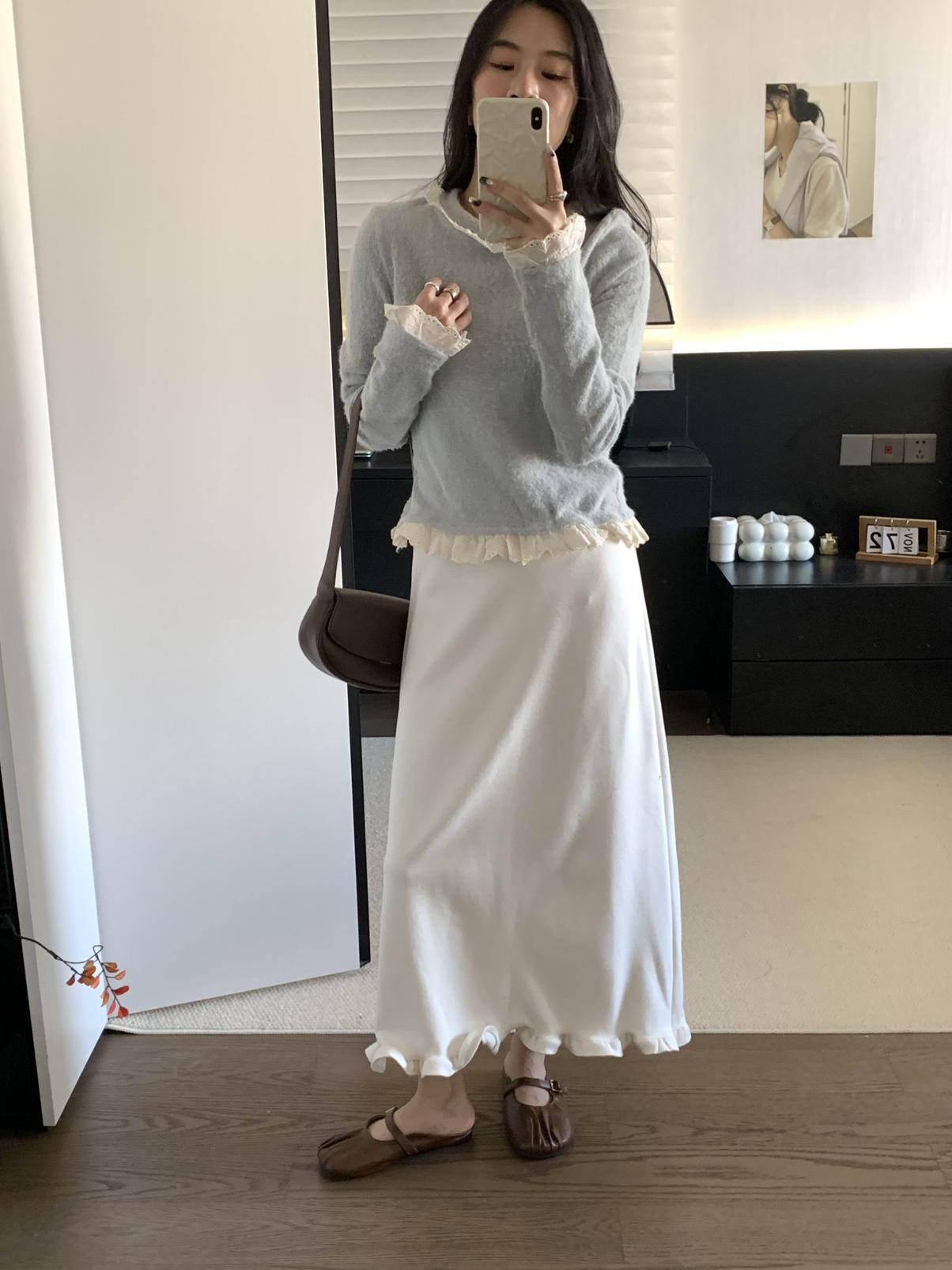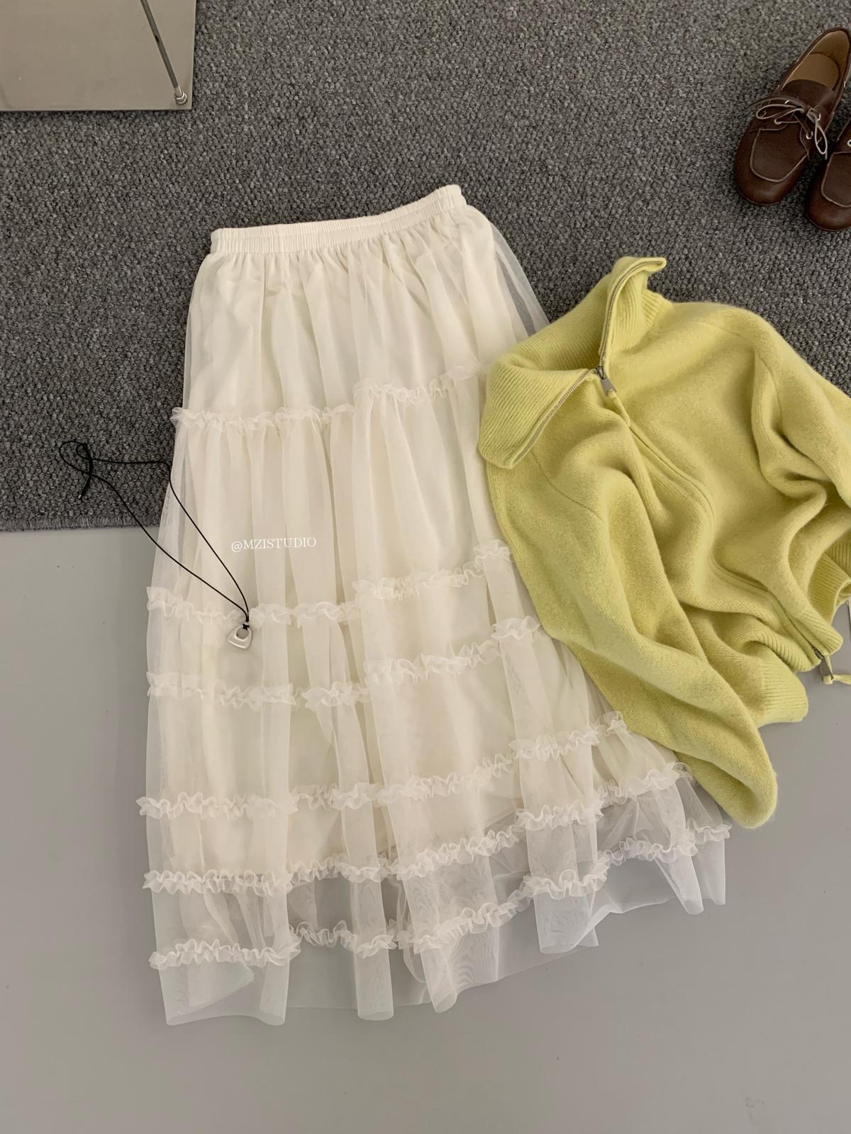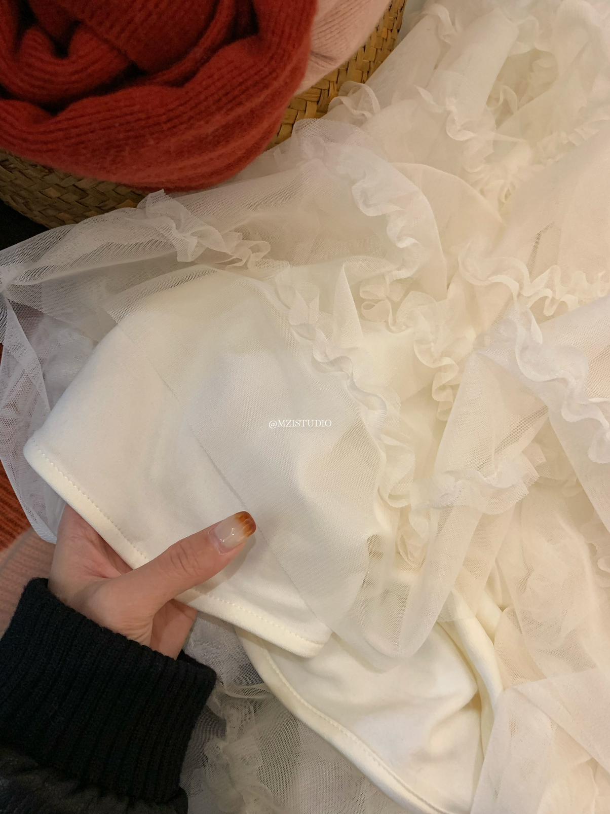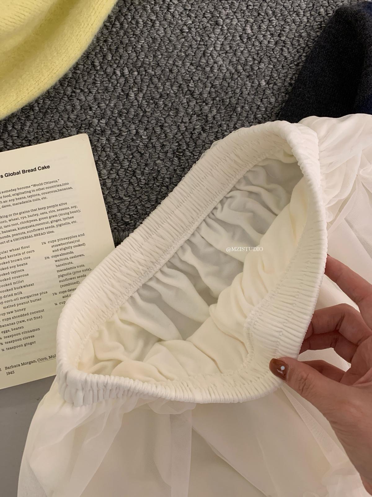 【C8064】智性優雅韓系冬季木耳邊拼接網紗清新少女感鬆緊腰半身裙