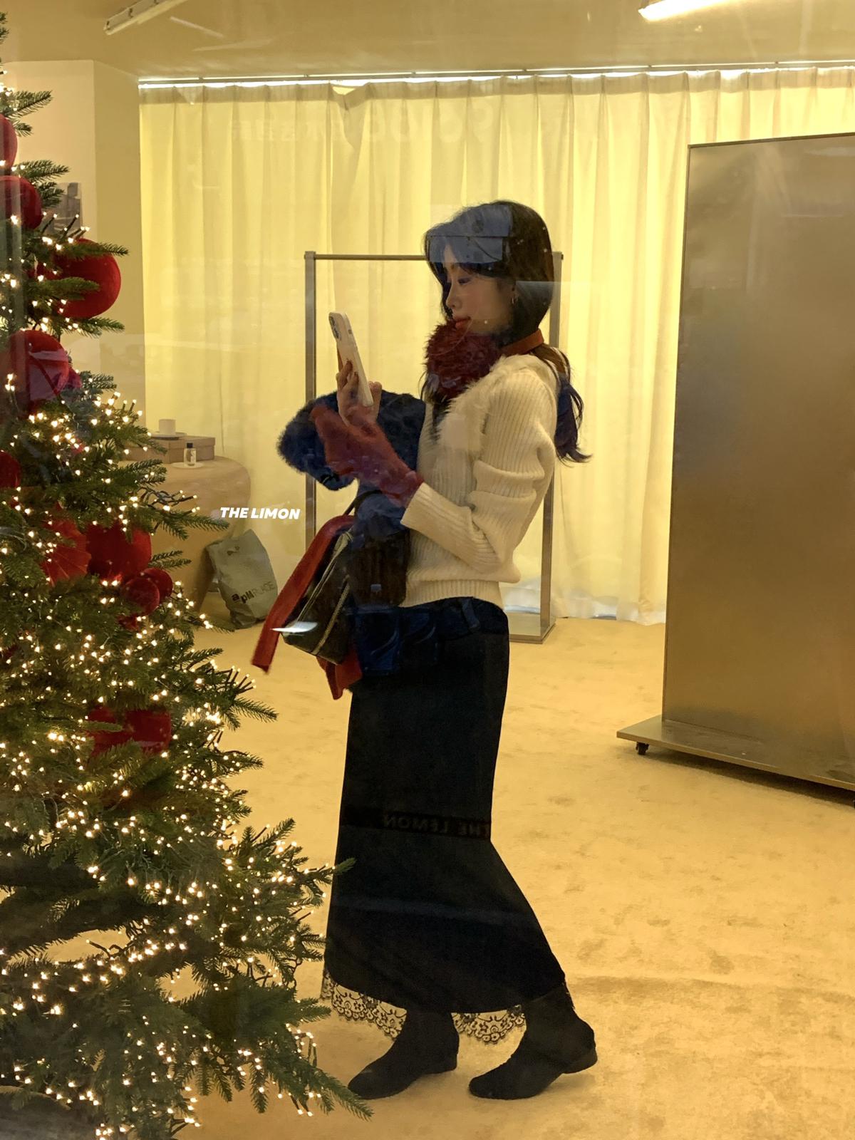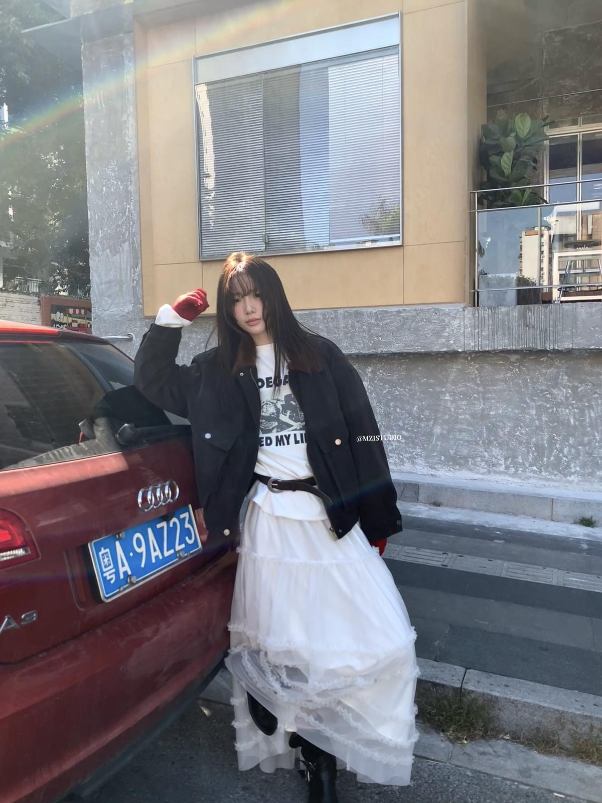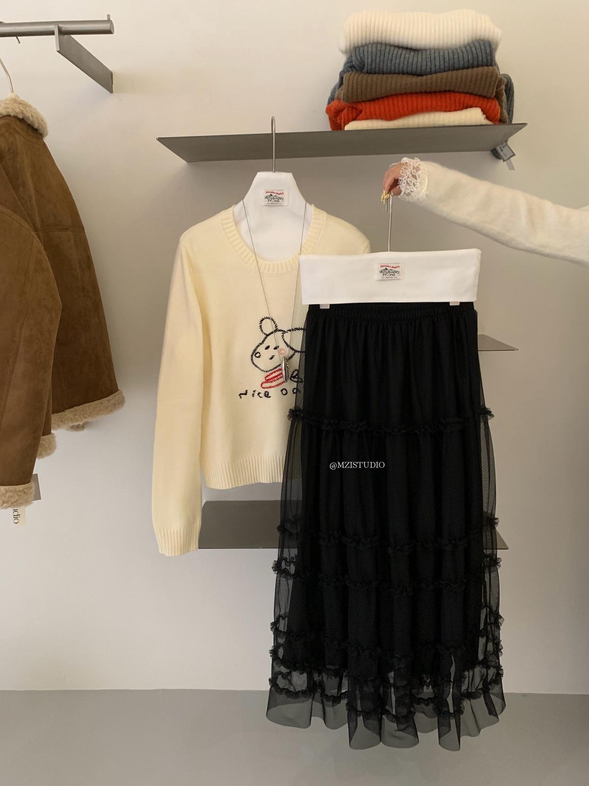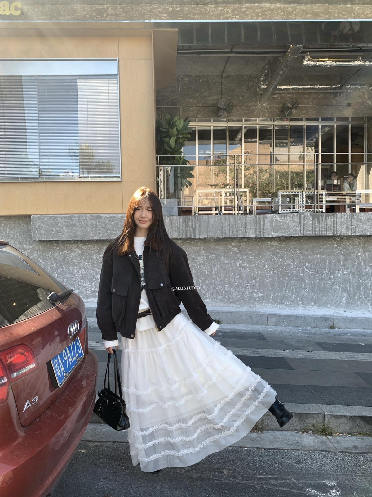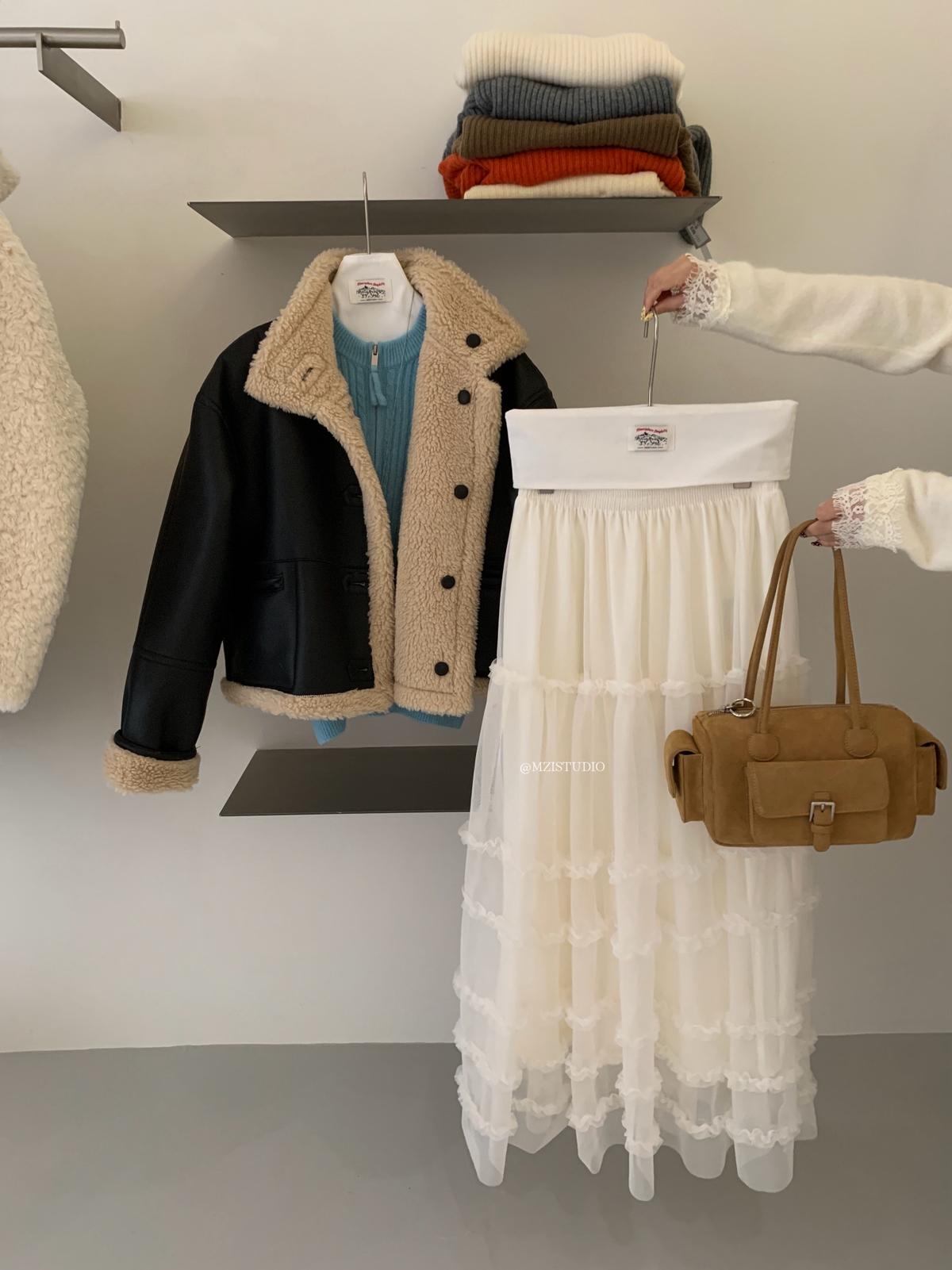 【C8064】智性優雅韓系冬季木耳邊拼接網紗清新少女感鬆緊腰半身裙