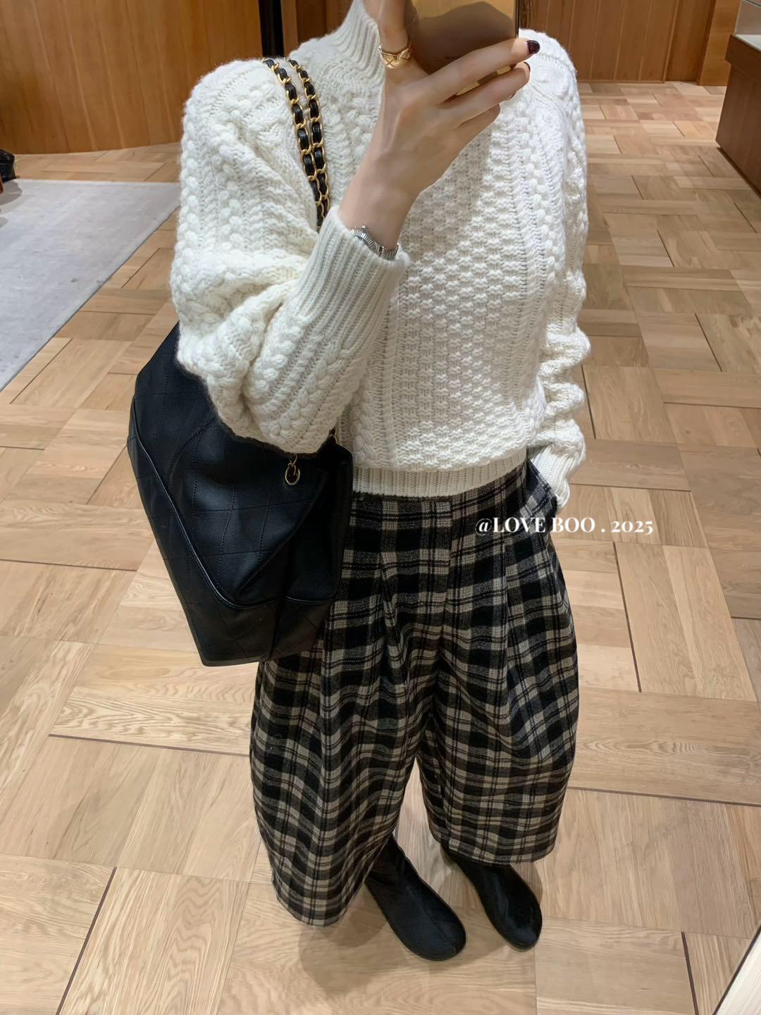 【YS2603】加絨毛呢直筒寬鬆格子加厚休閒褲
