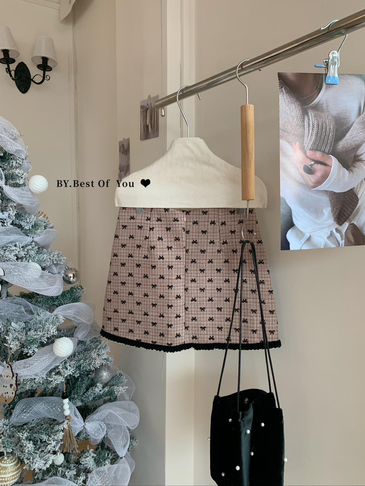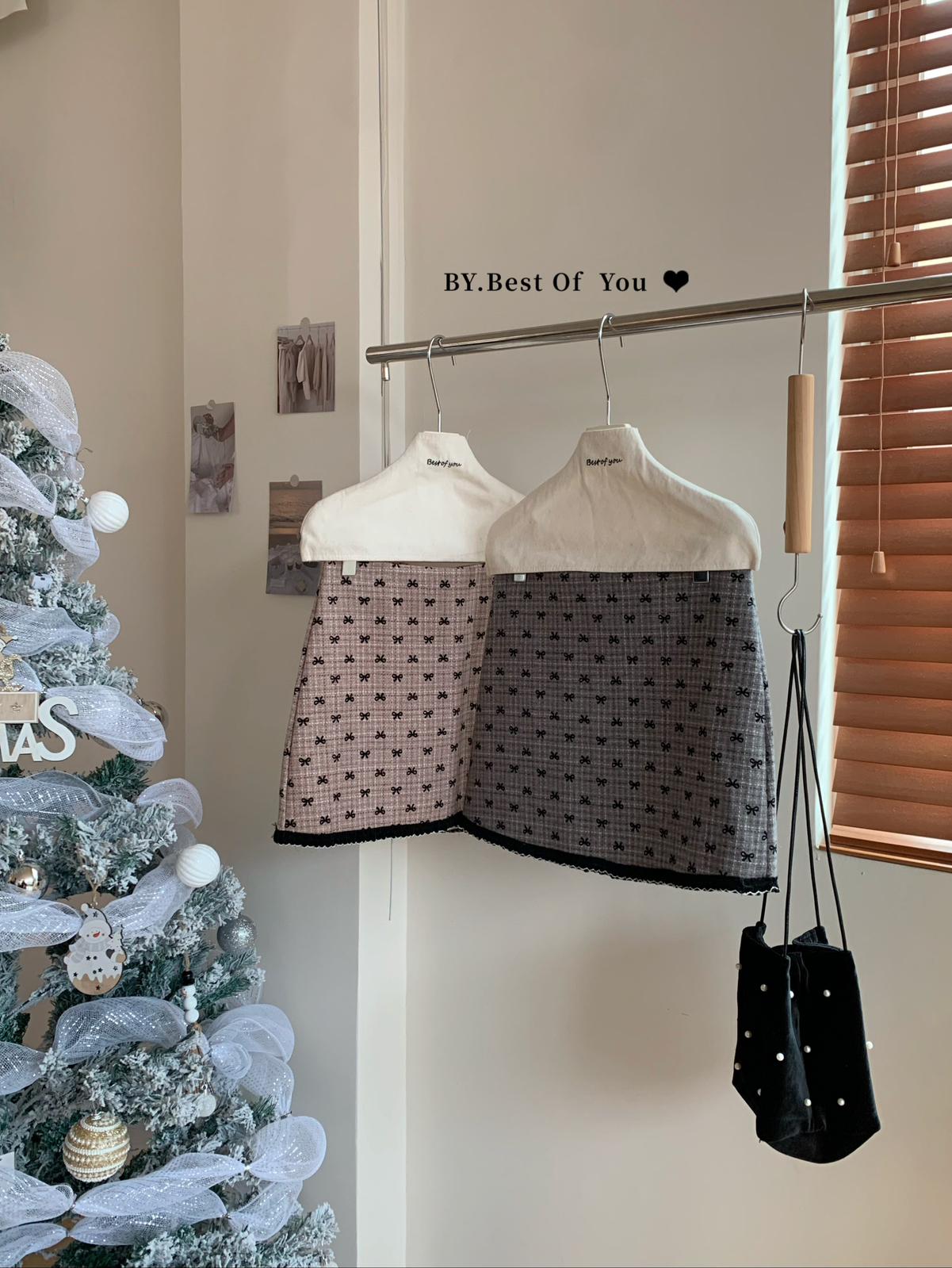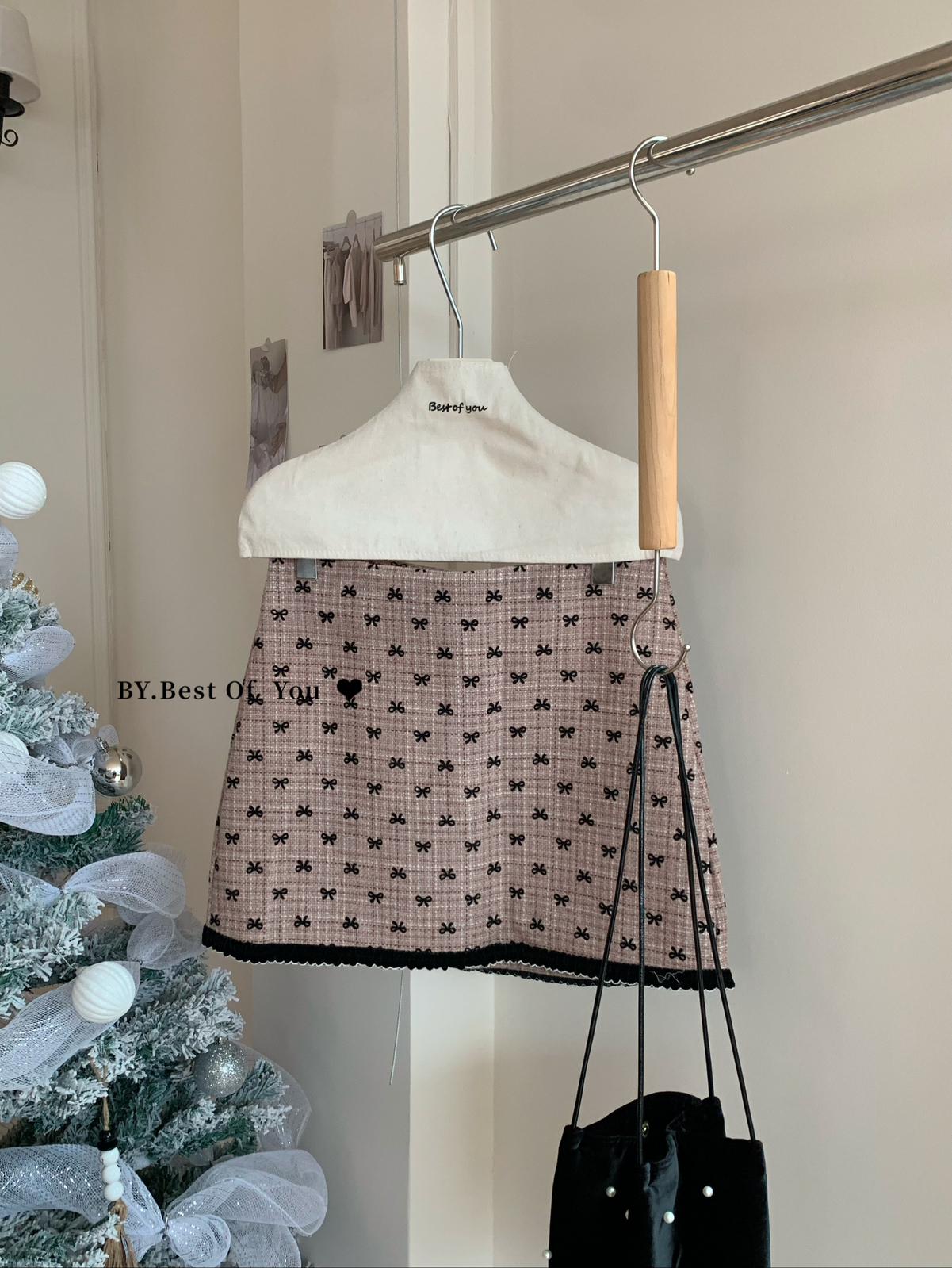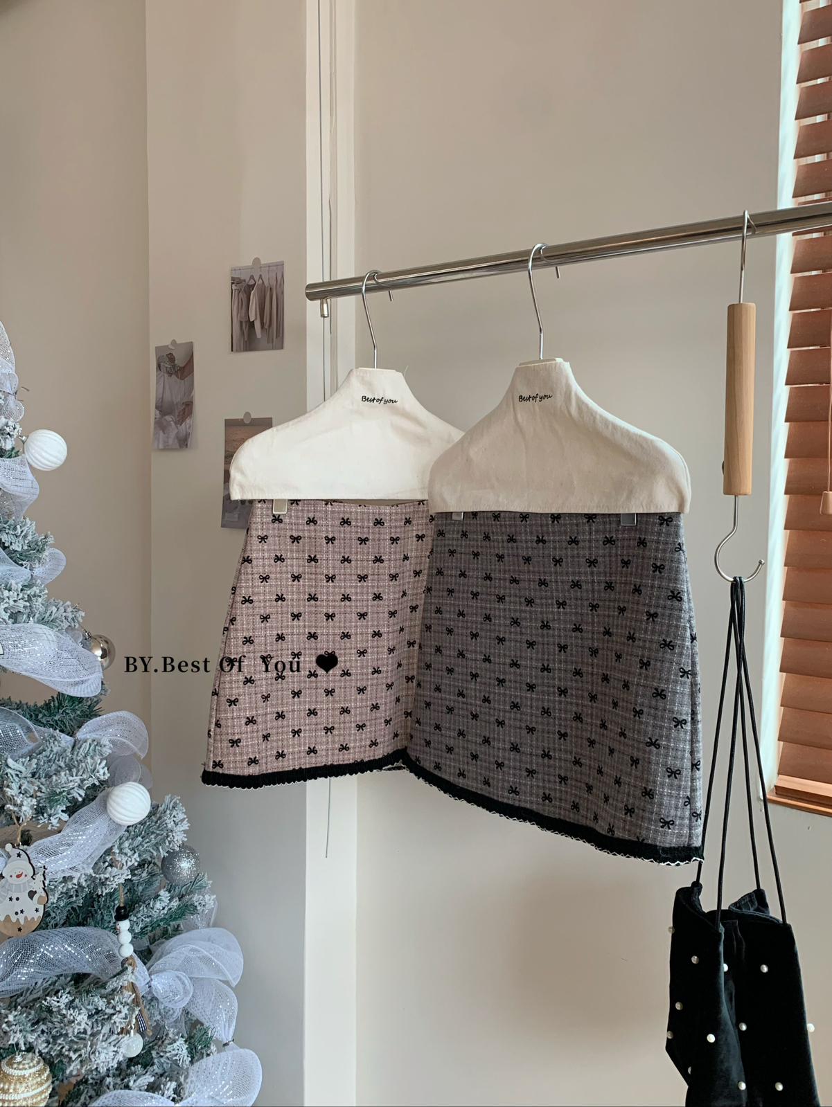 【C7977】復古風植絨蝴蝶結設計感半身裙