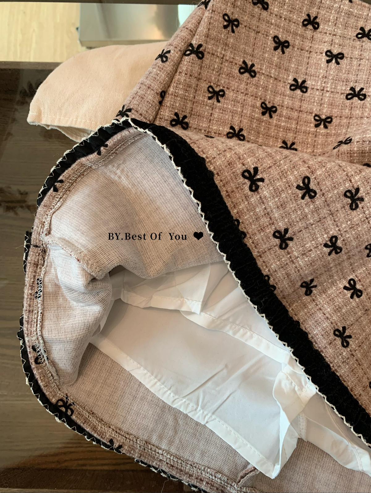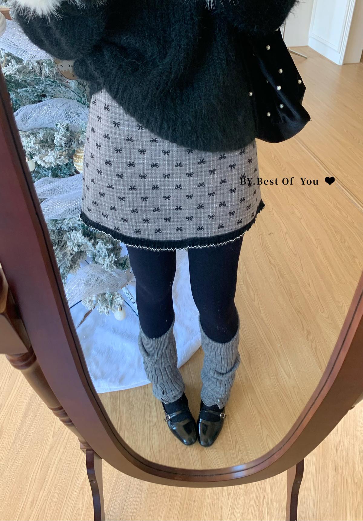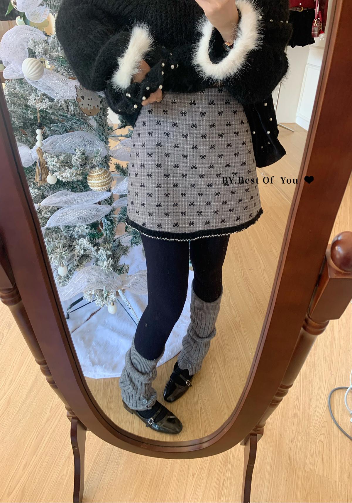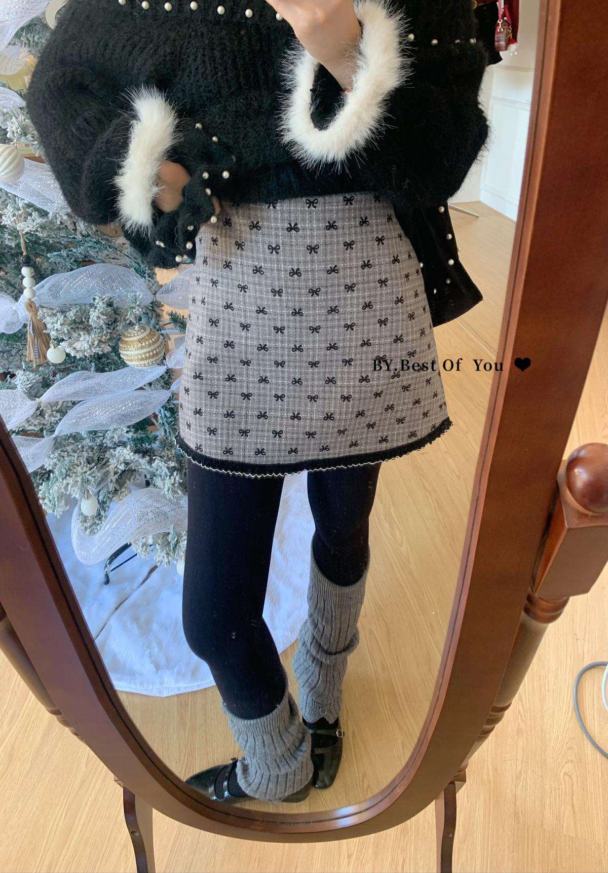 【C7977】復古風植絨蝴蝶結設計感半身裙