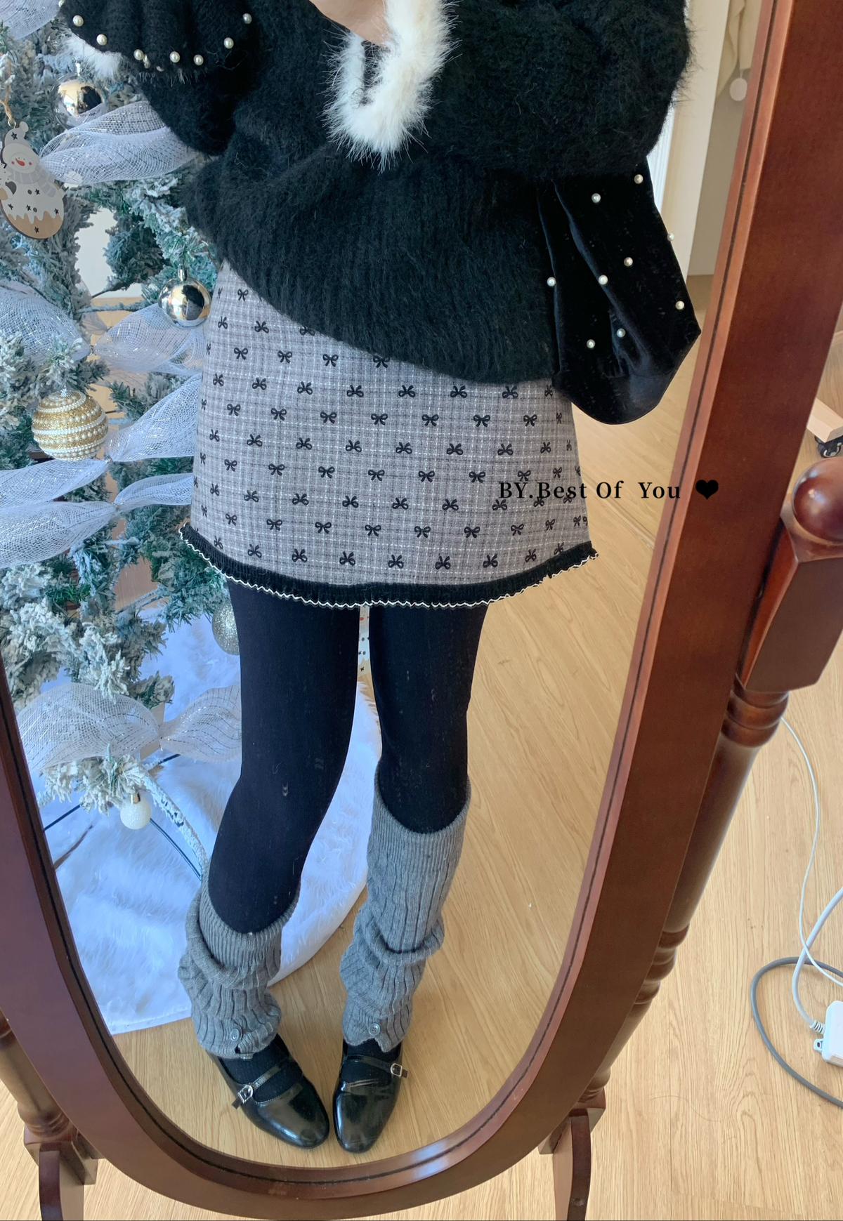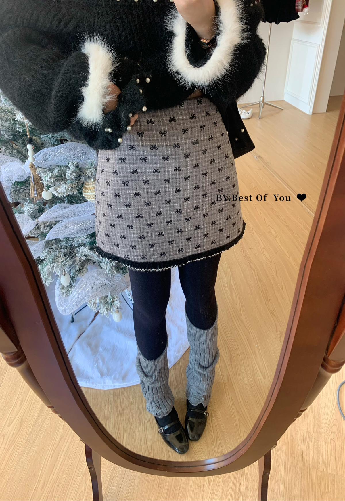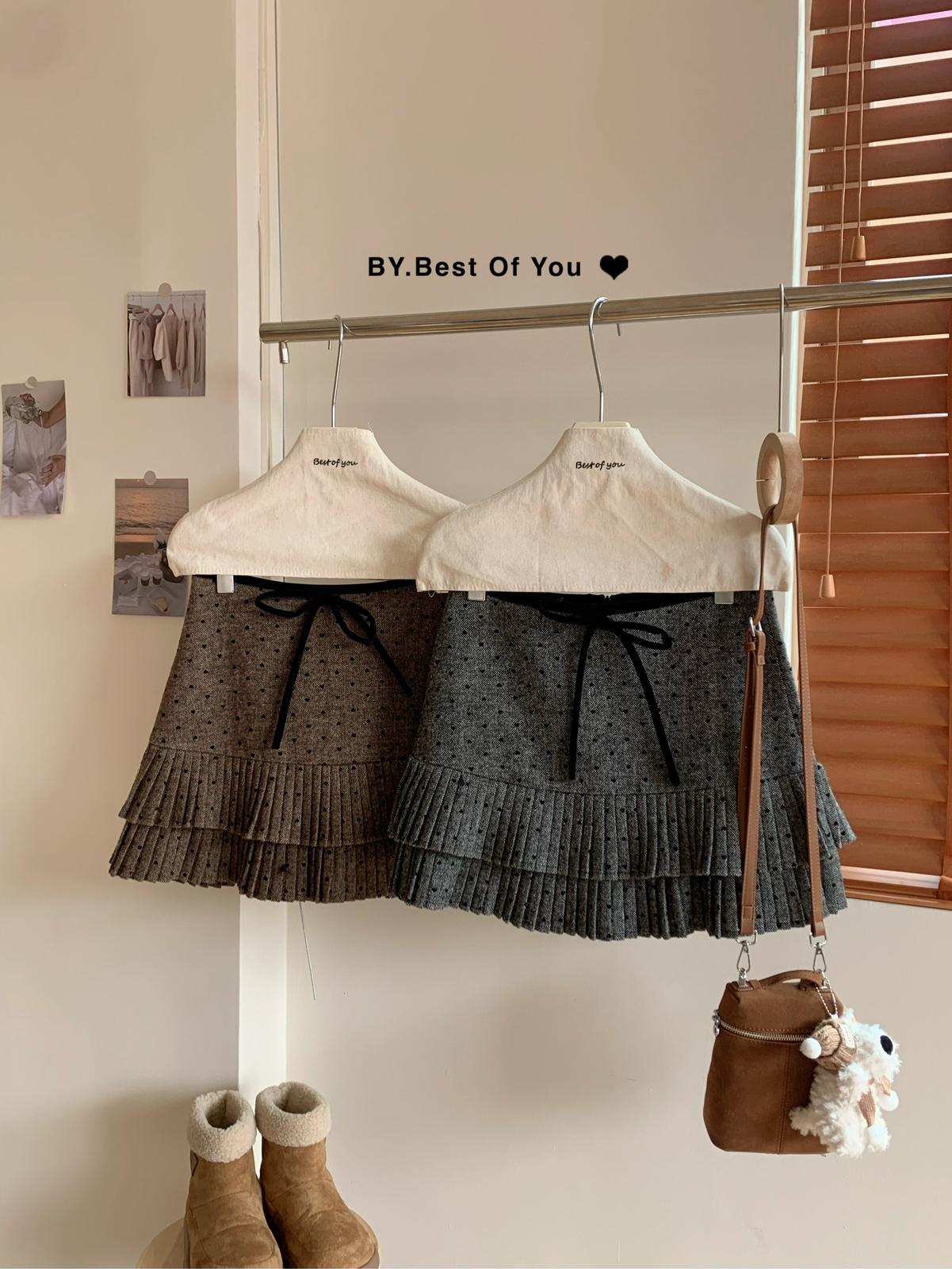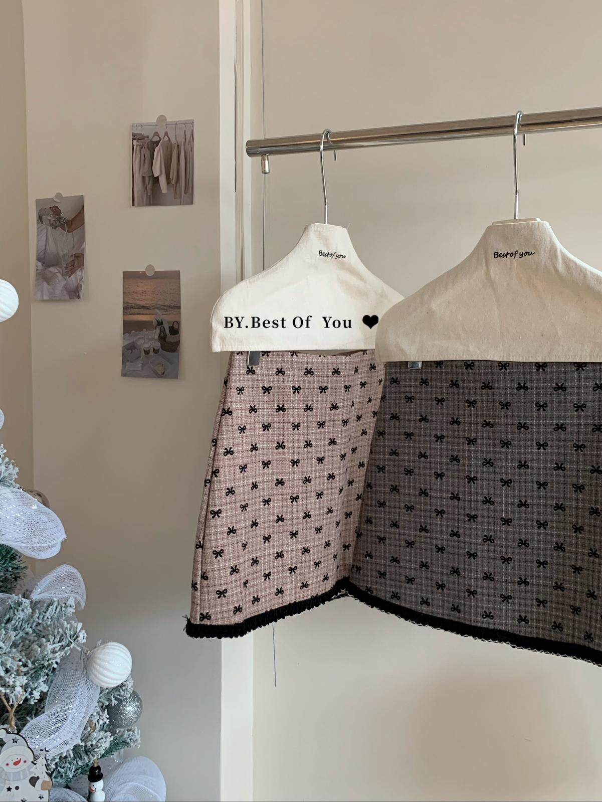 【C7977】復古風植絨蝴蝶結設計感半身裙