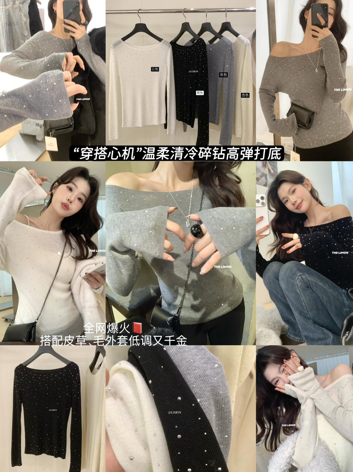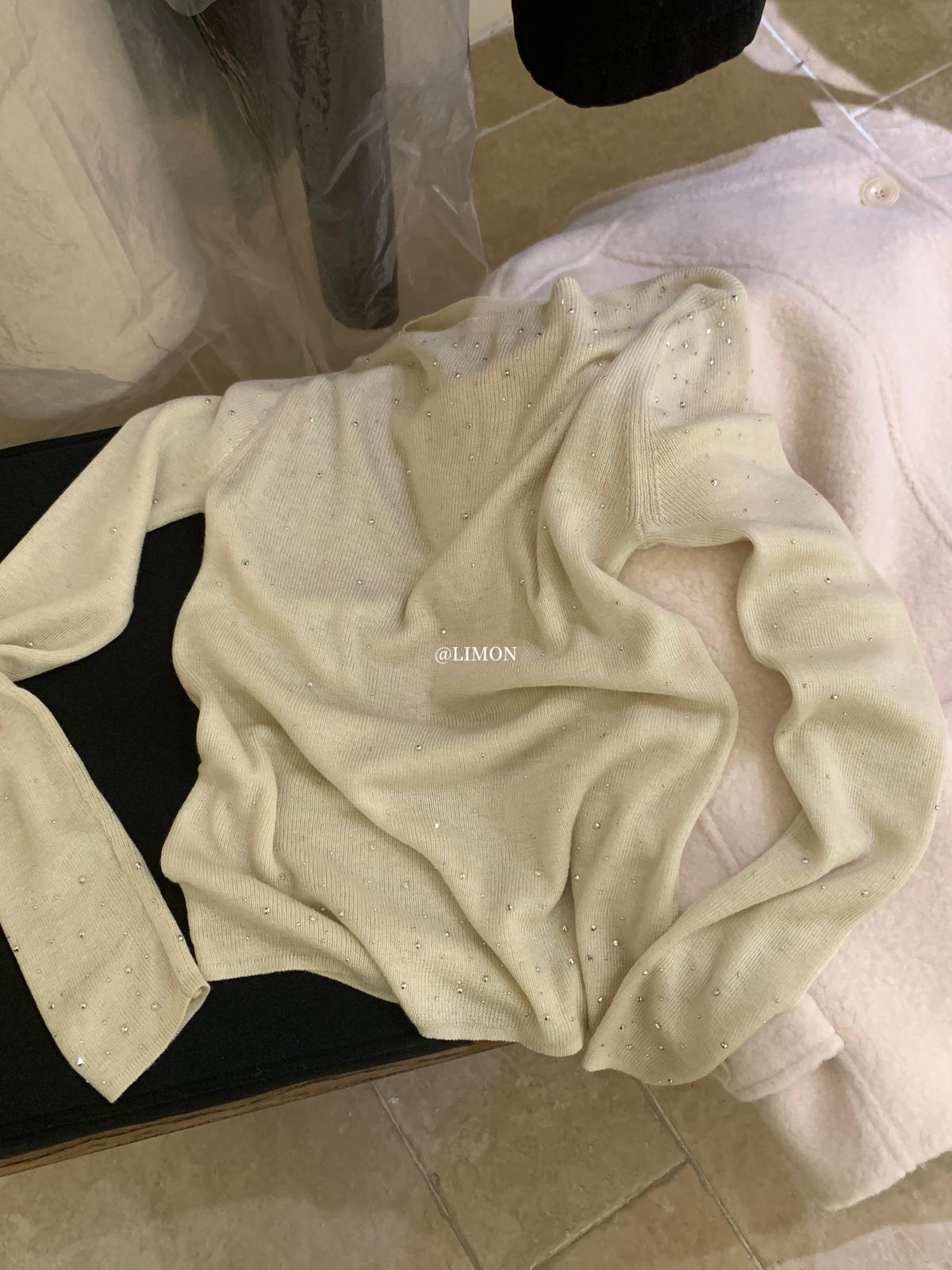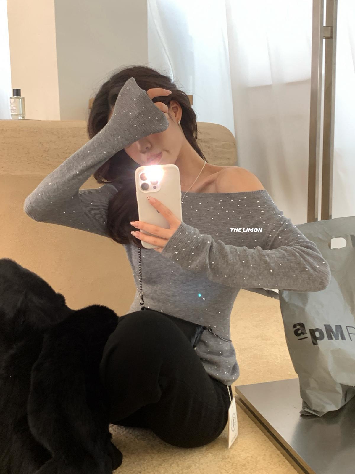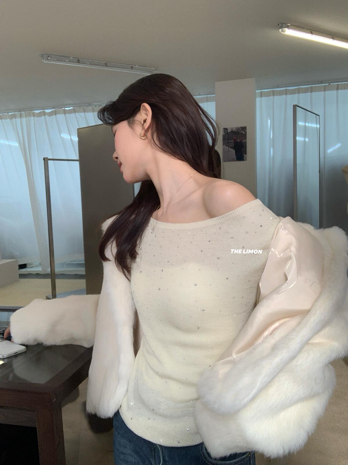 【C8052】溫柔設計感燙鑽一字肩針織衫(含8%羊毛)