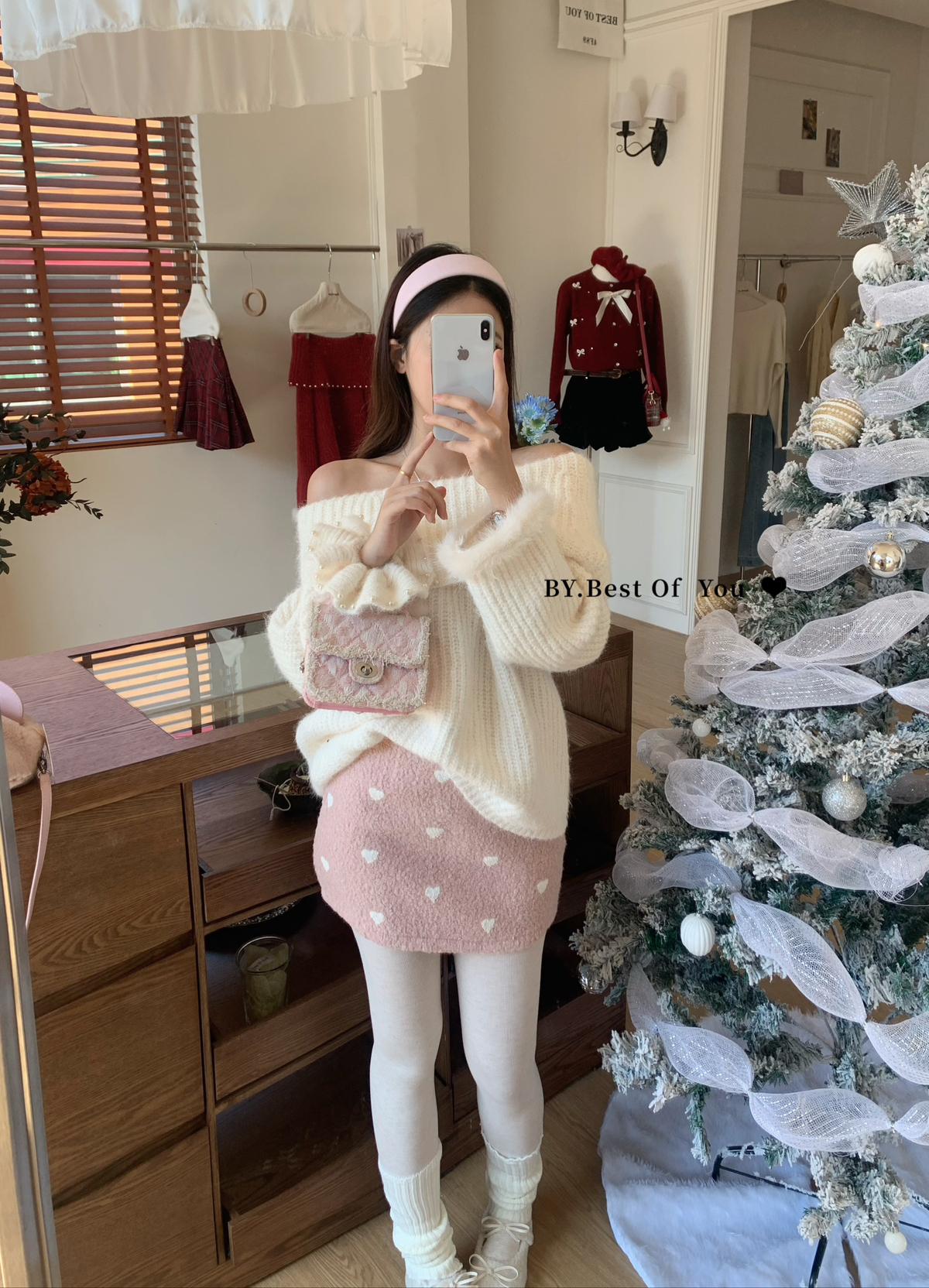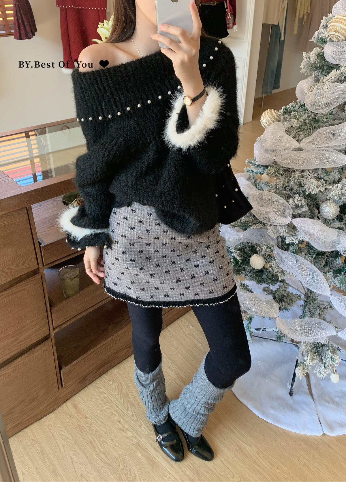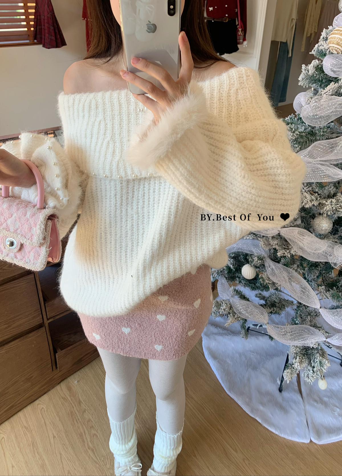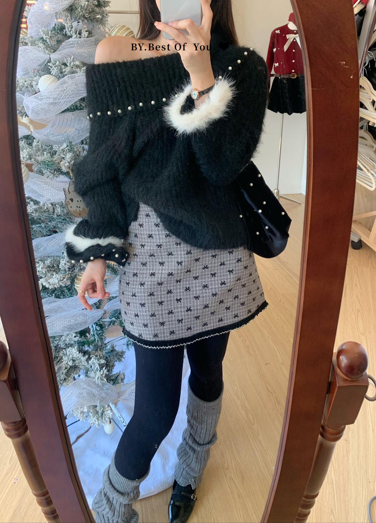 【C8052】溫柔設計感燙鑽一字肩針織衫(含8%羊毛)