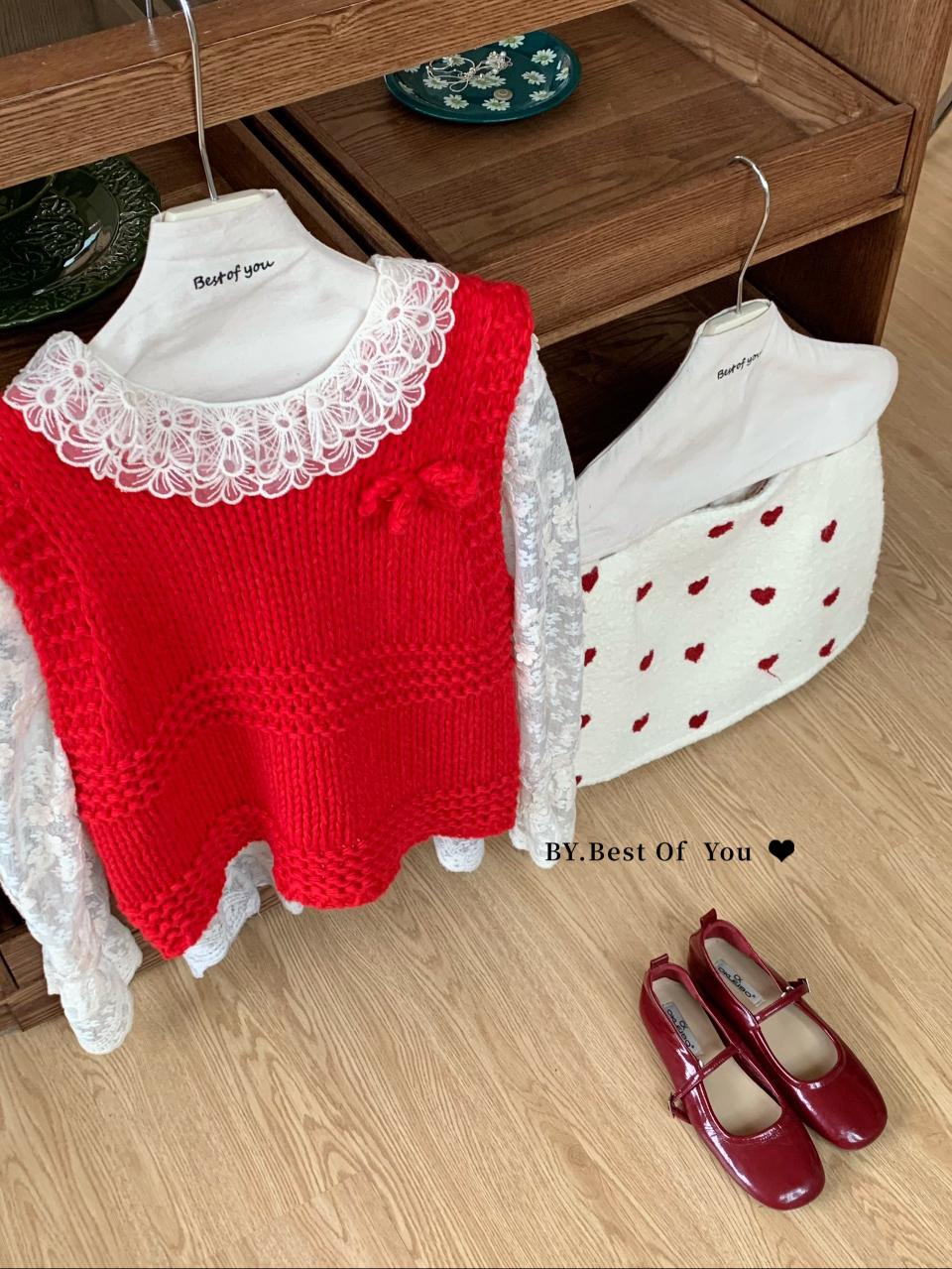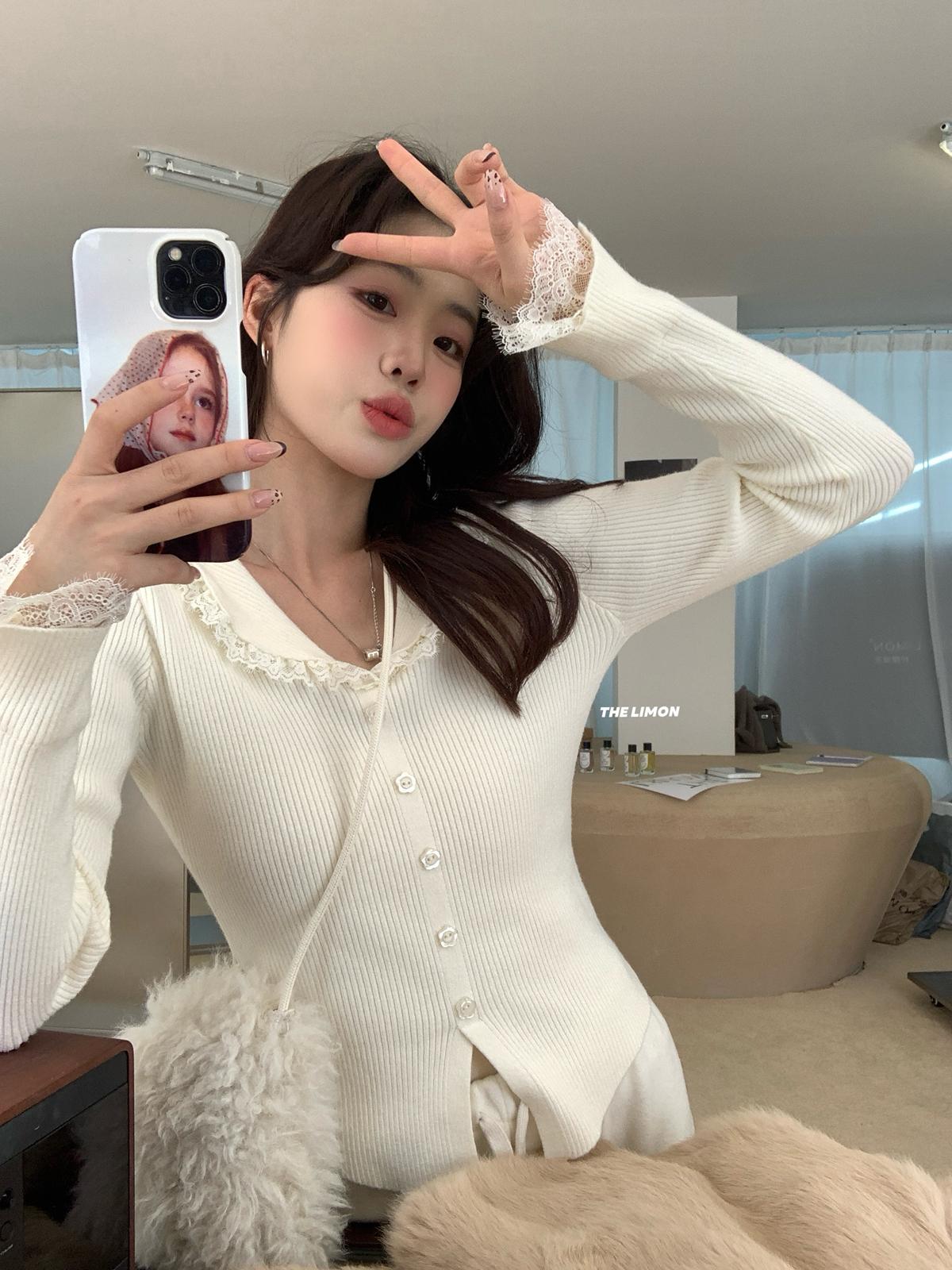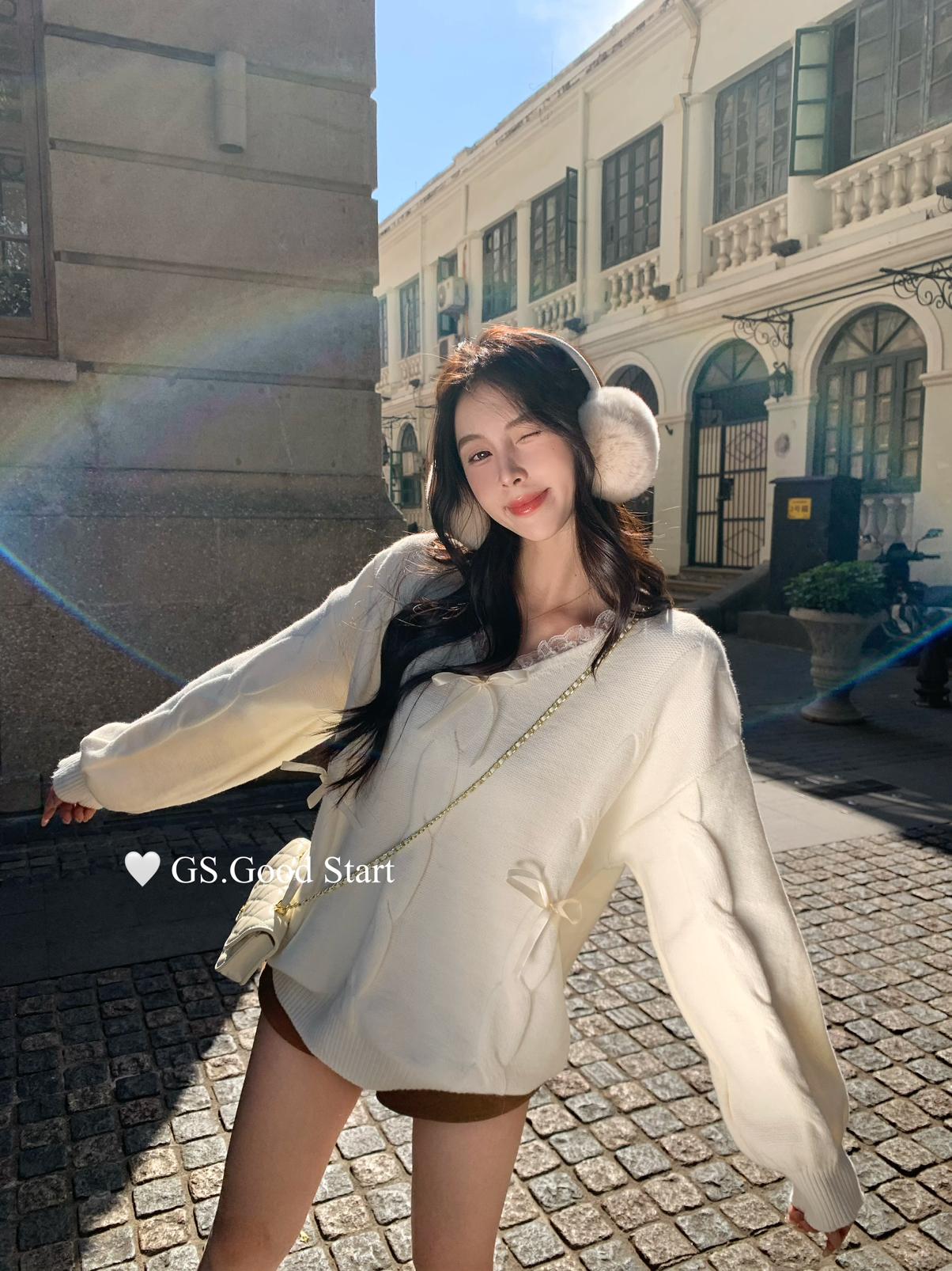 【C8039】甜系韓女*好乖~寬鬆版型超遮肉!秋冬甜美少女感蕾絲v領蝴蝶結保暖毛衣