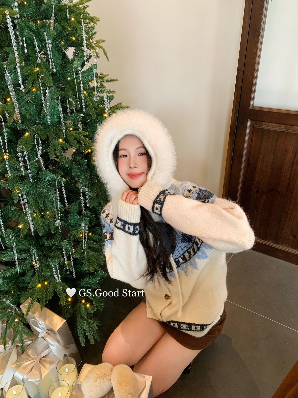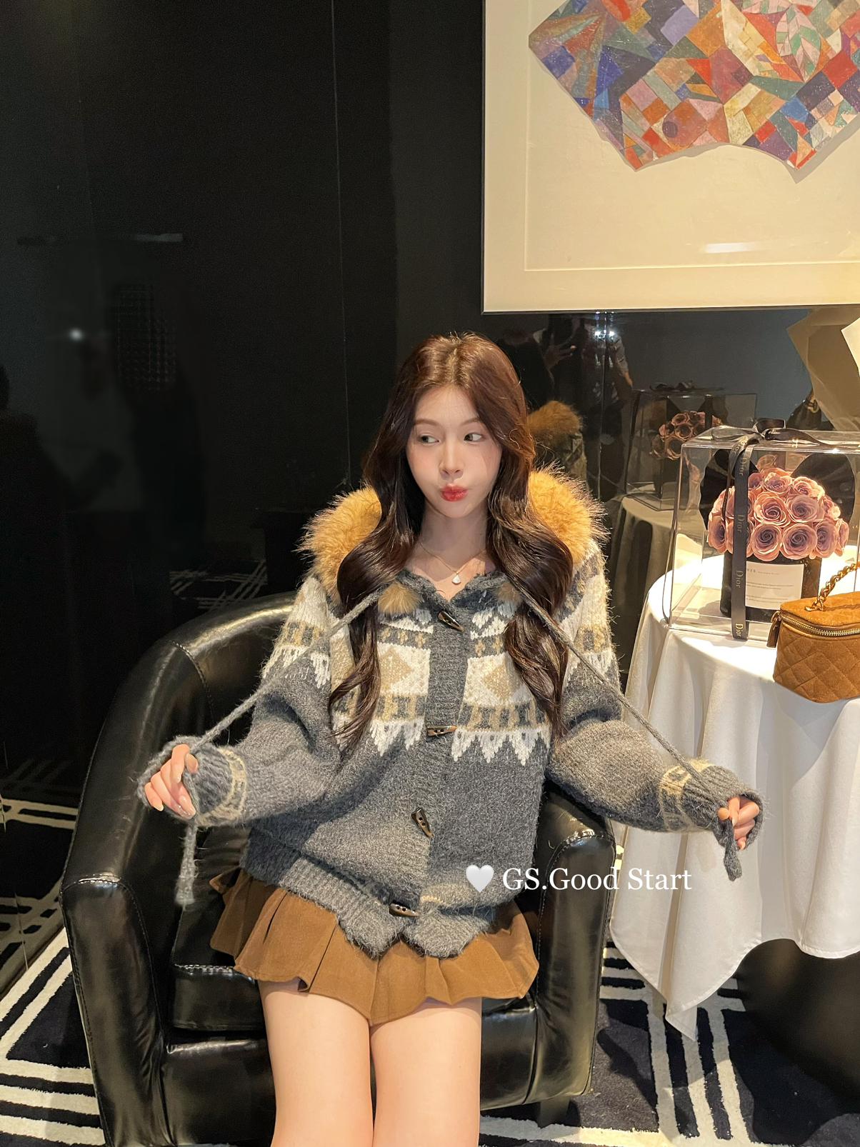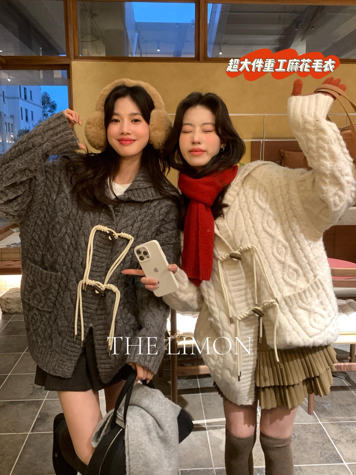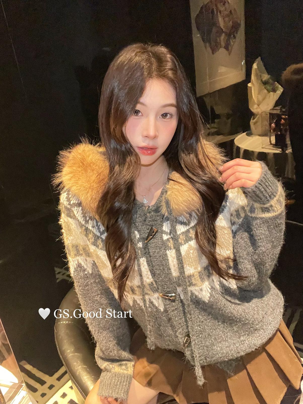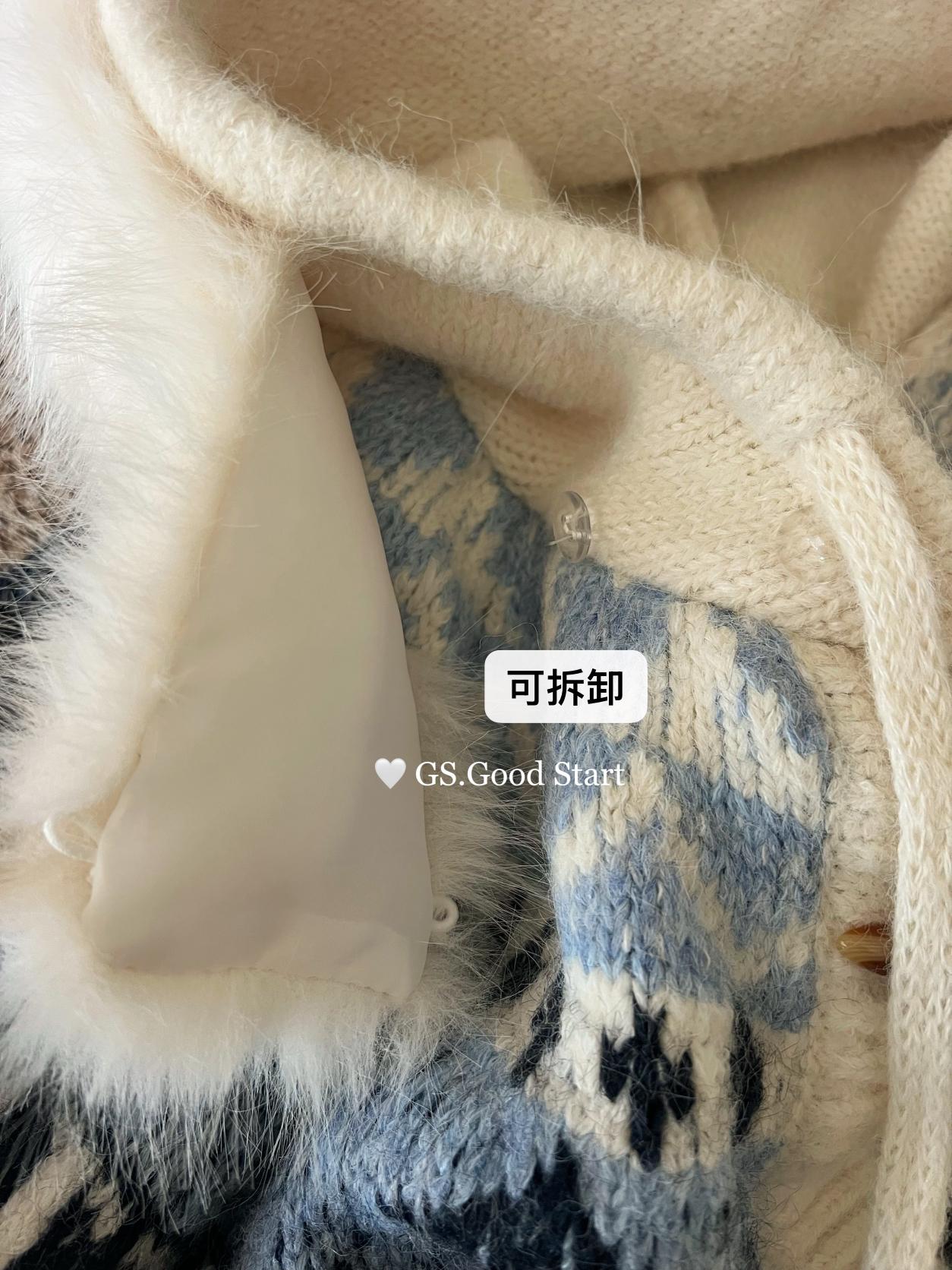 【C8038】超級火!冬季氛圍感拉滿!韓系甜美復古提花牛角扣寬鬆連帽保暖毛衣(配可拆卸毛領)