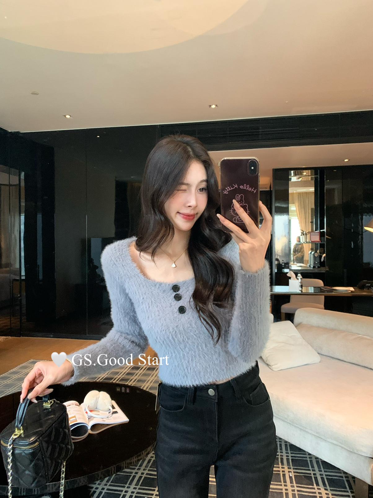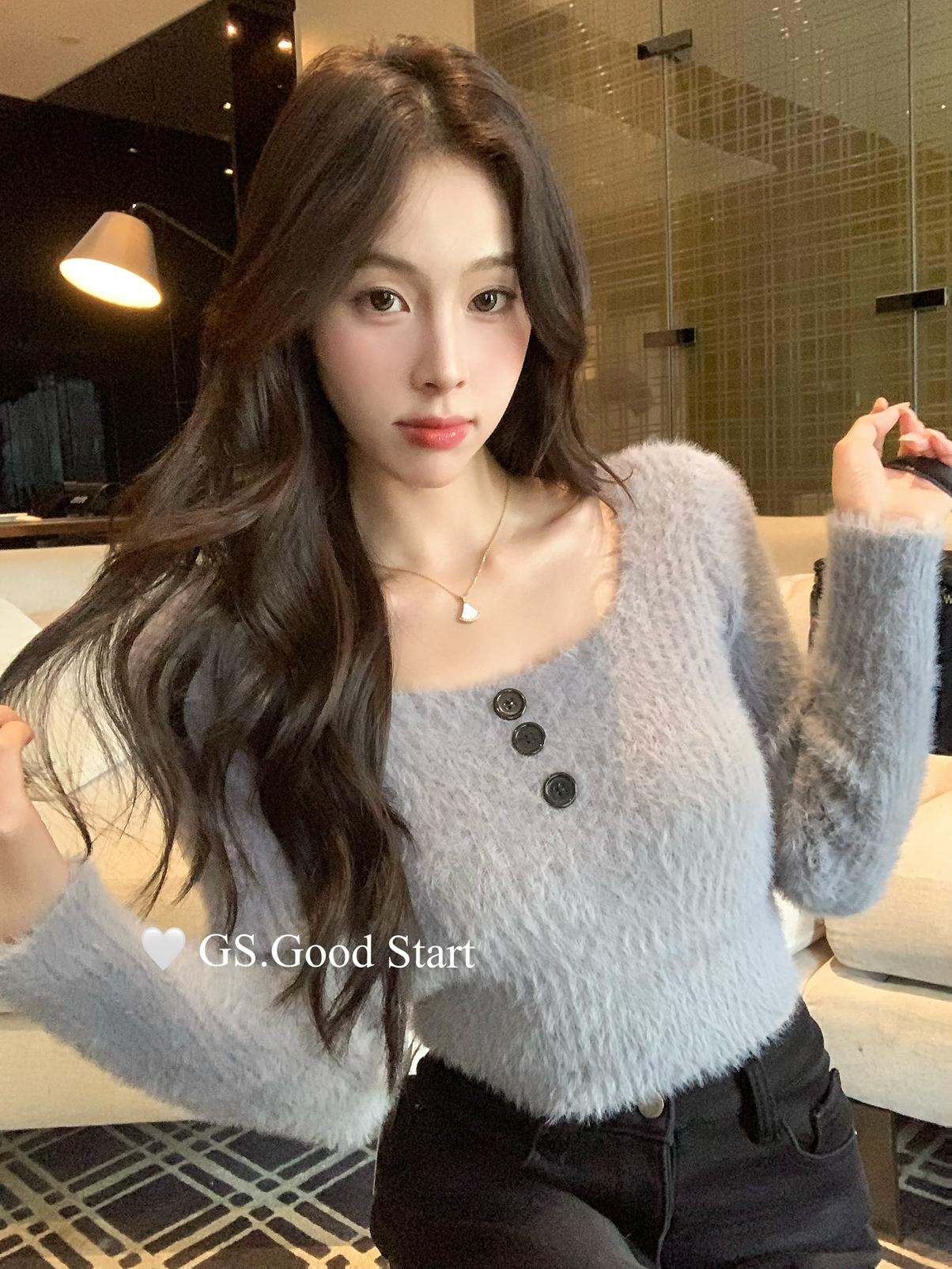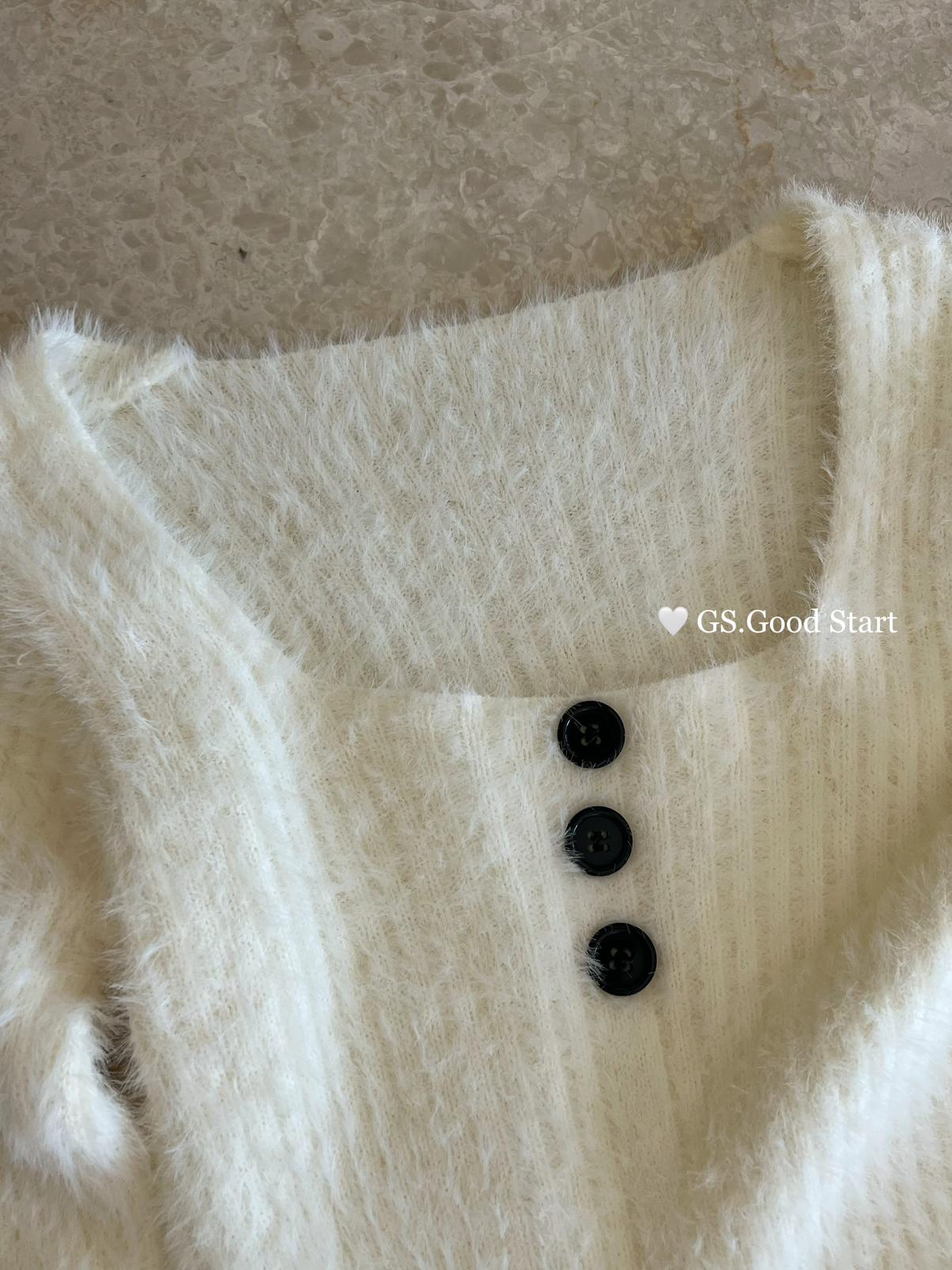 【C8040】超軟糯!修身短款版型*有點小sexy~秋冬純欲方領休閒針織小衫