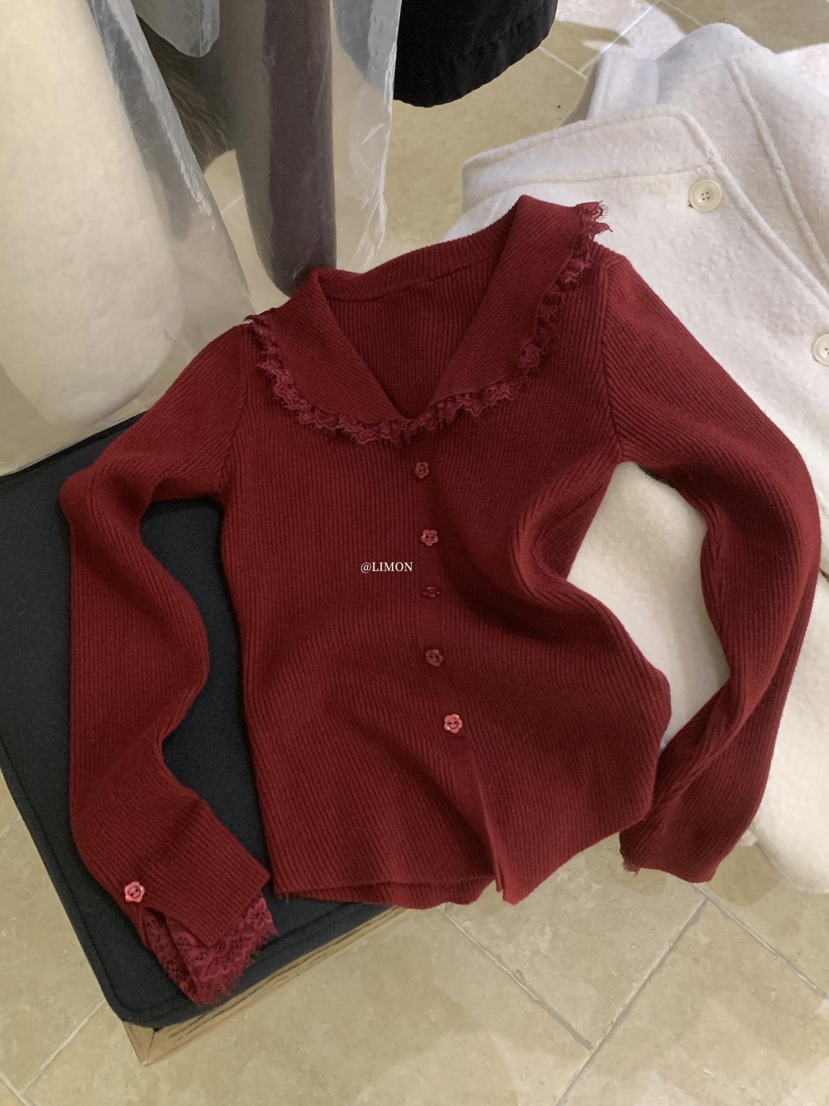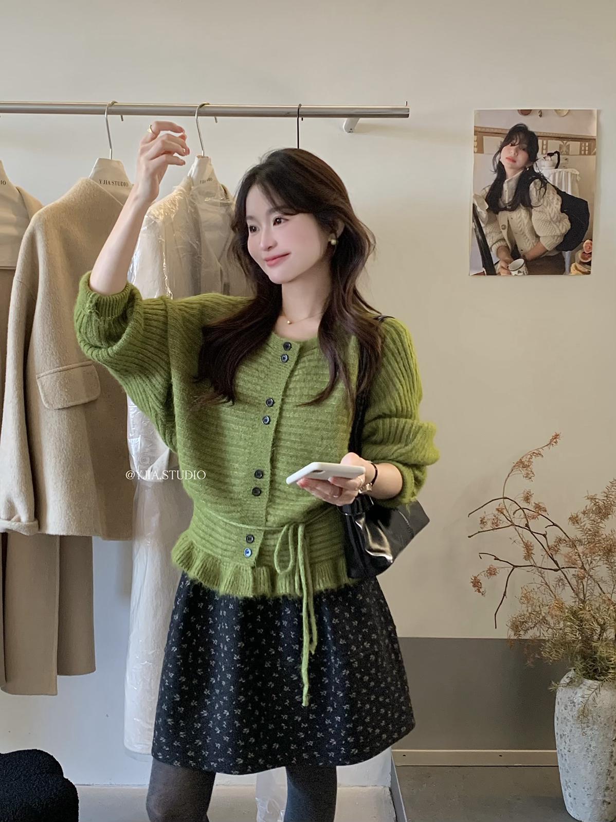 【C8033】韓系復古甜美花邊開衫毛衣+高腰半身裙套裝