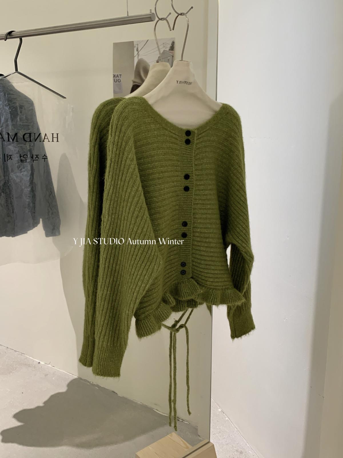 【C8043】韓版溫柔大圓領木耳邊下襬綁帶收腰針織衫毛衣