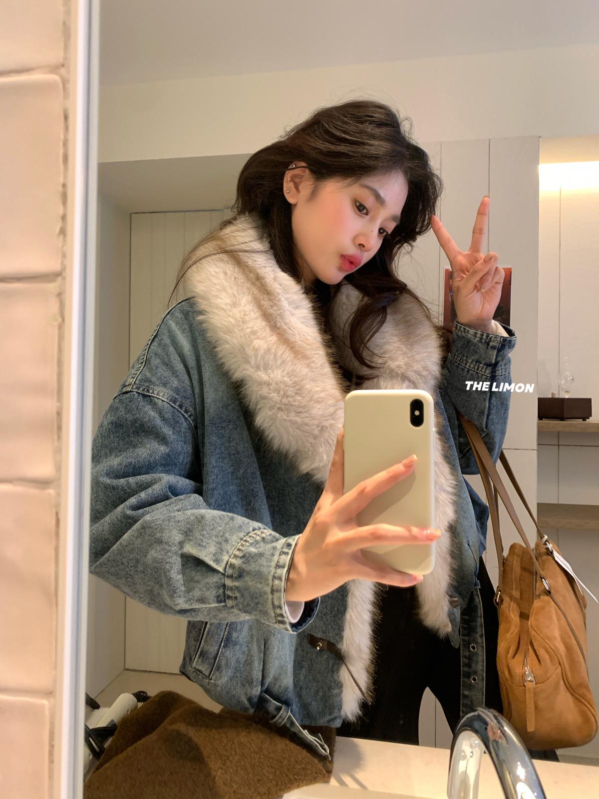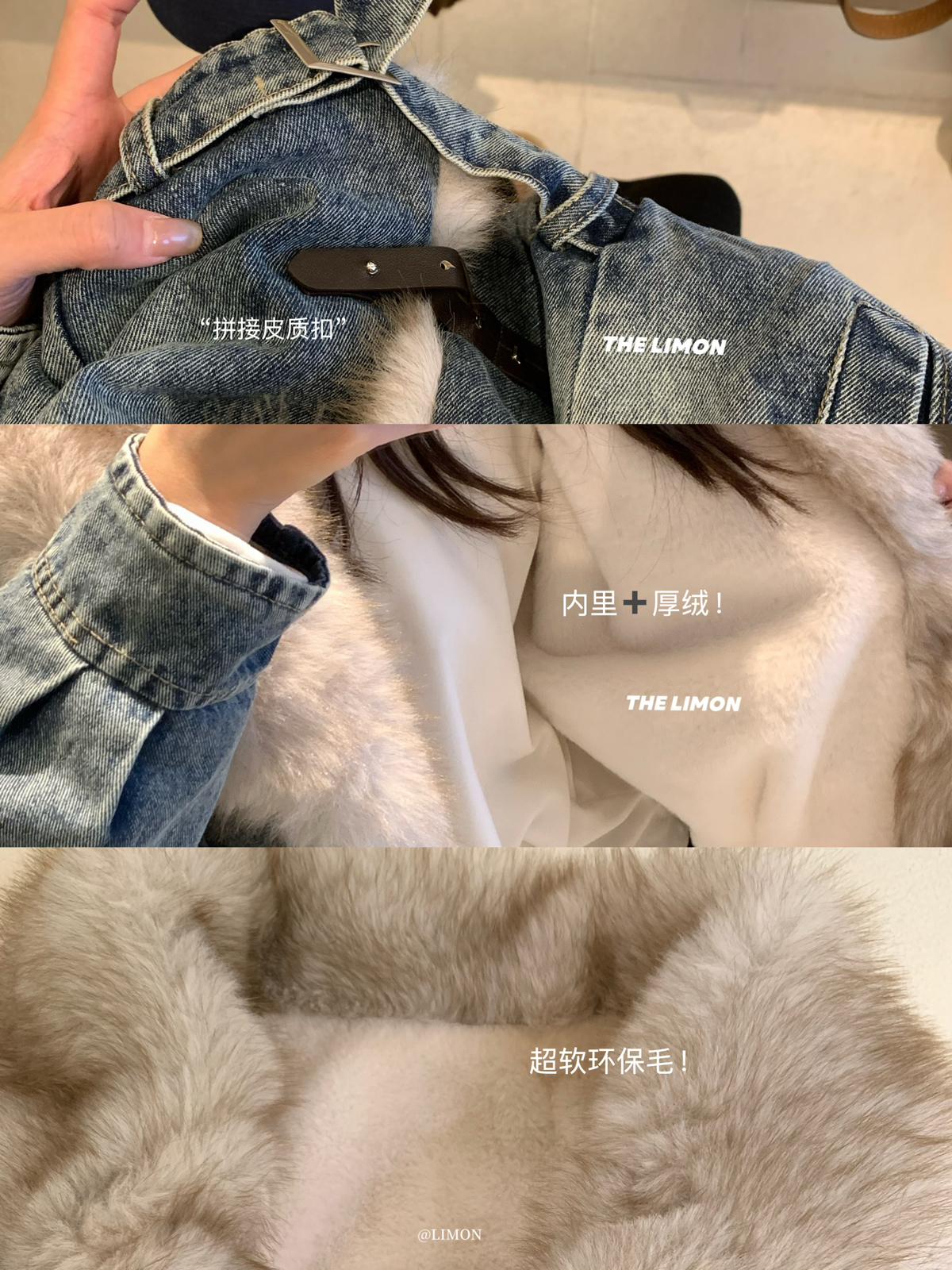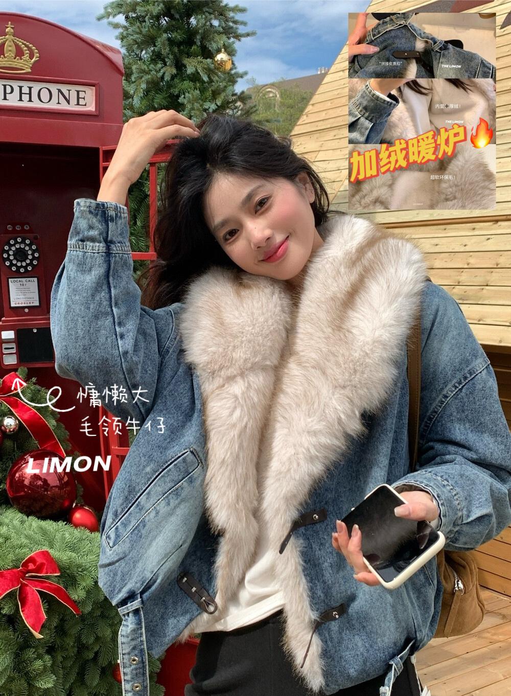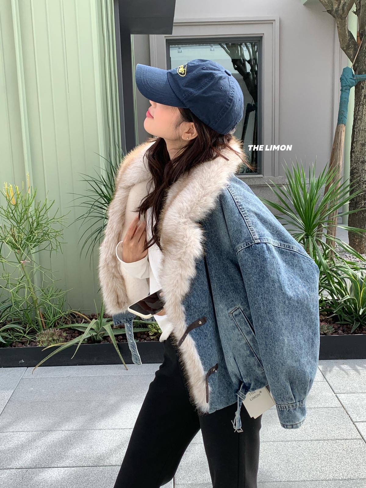 【C8046】設計感重工拼接大毛領加絨牛仔外套