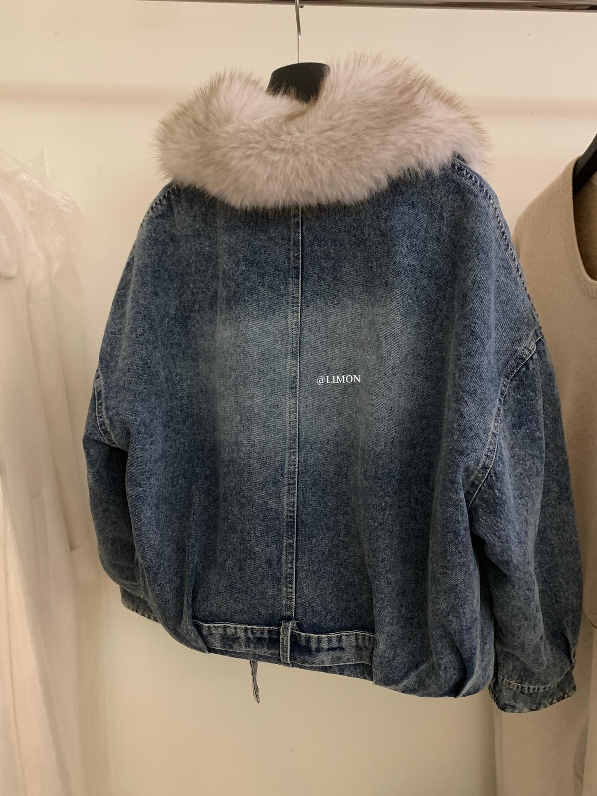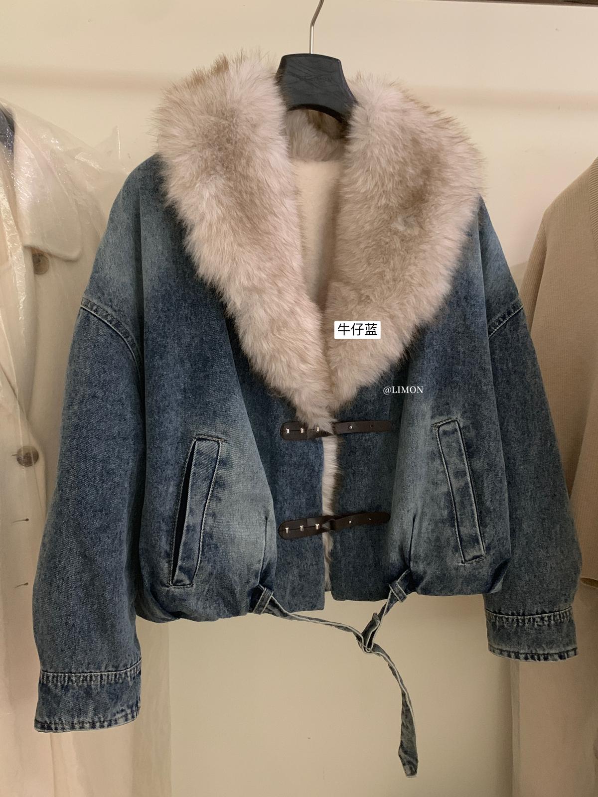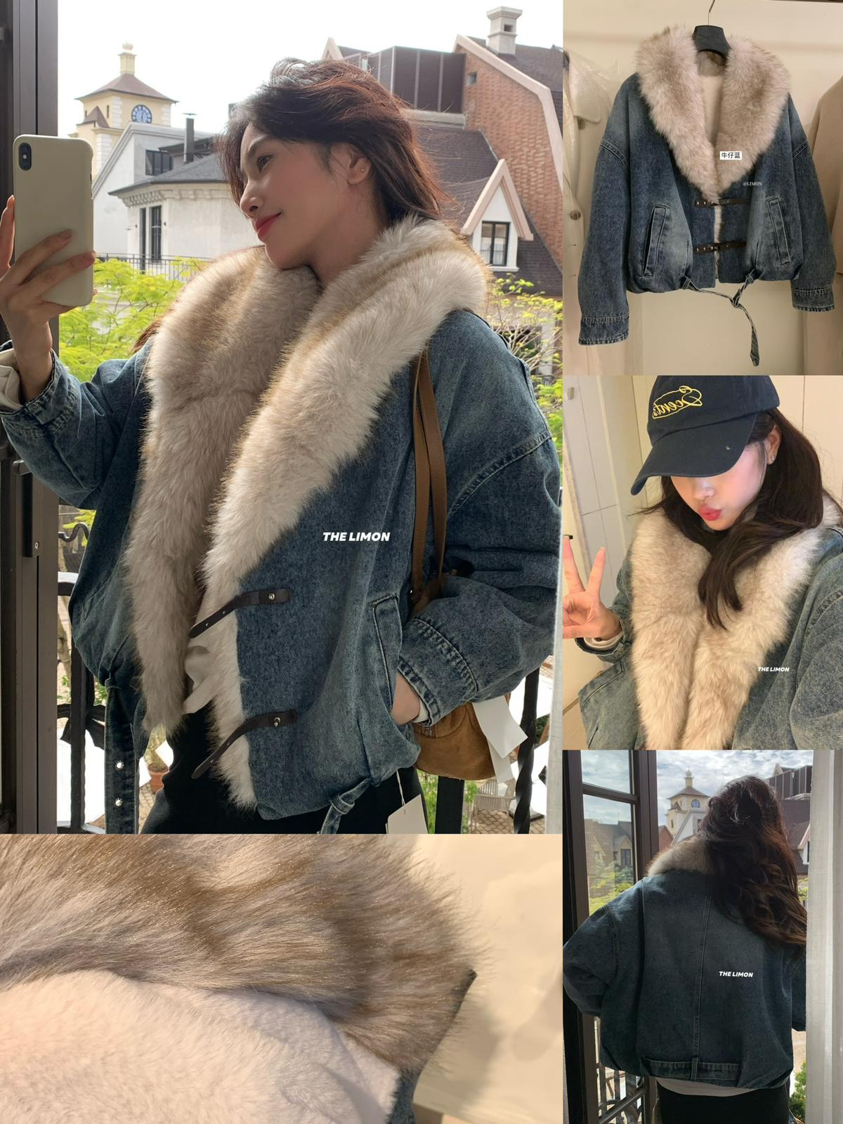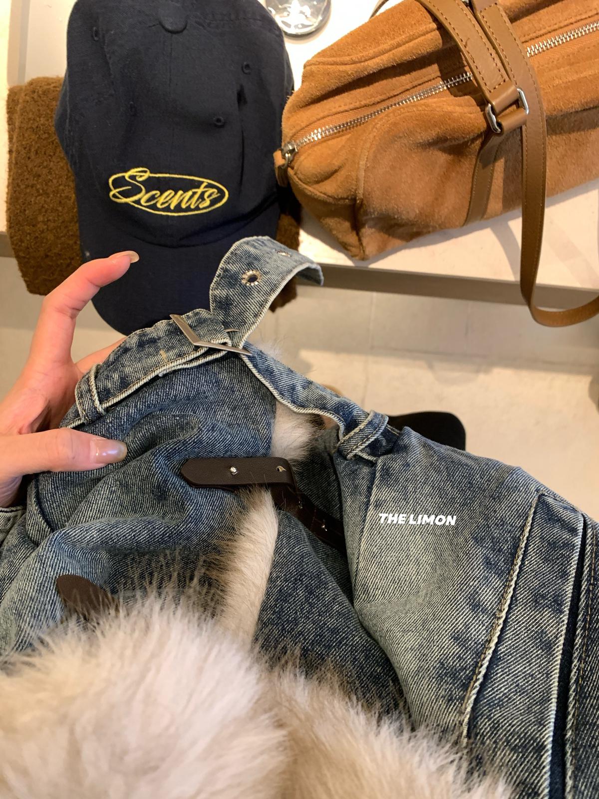 【C8046】設計感重工拼接大毛領加絨牛仔外套