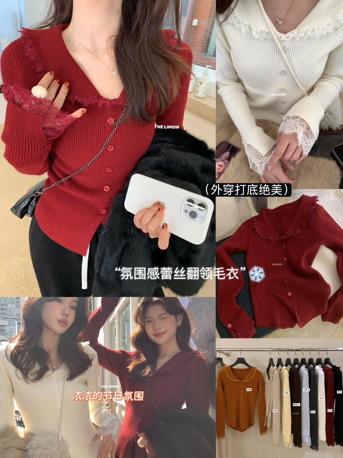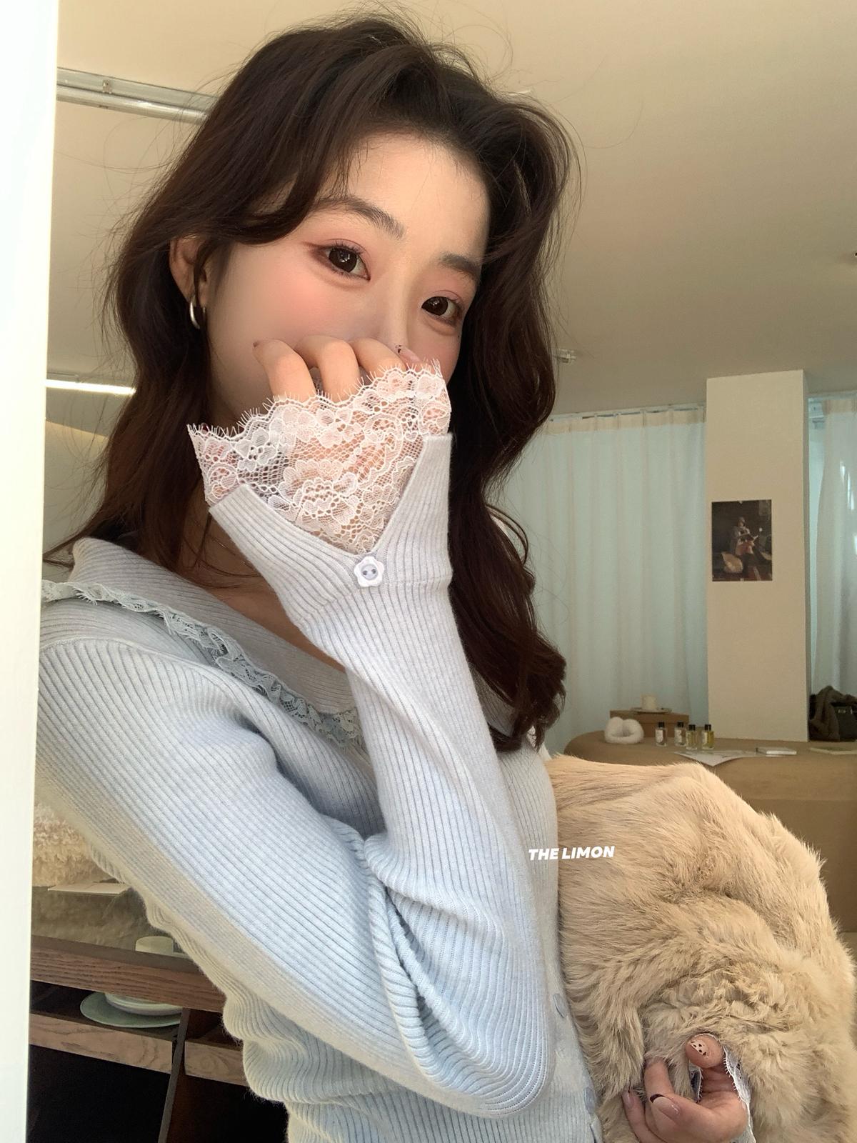 【C8053】法式拼蕾絲領修身氣質顯瘦針織衫