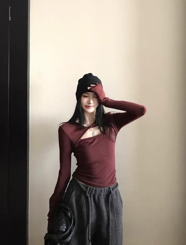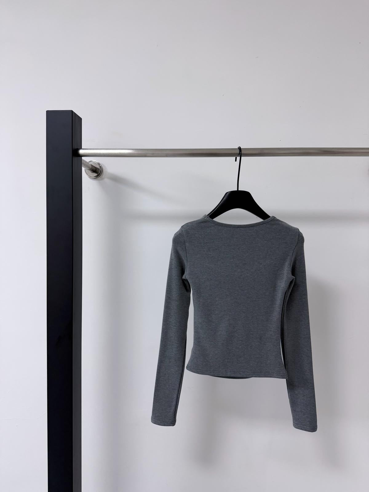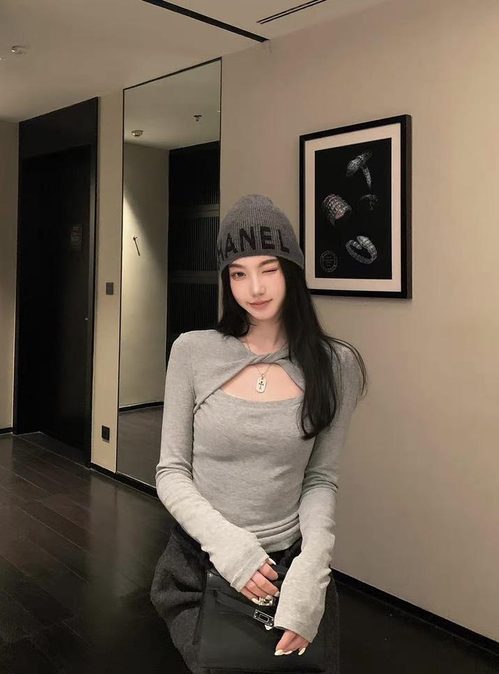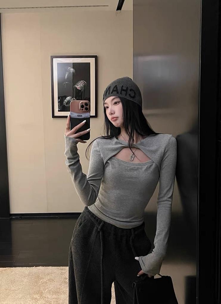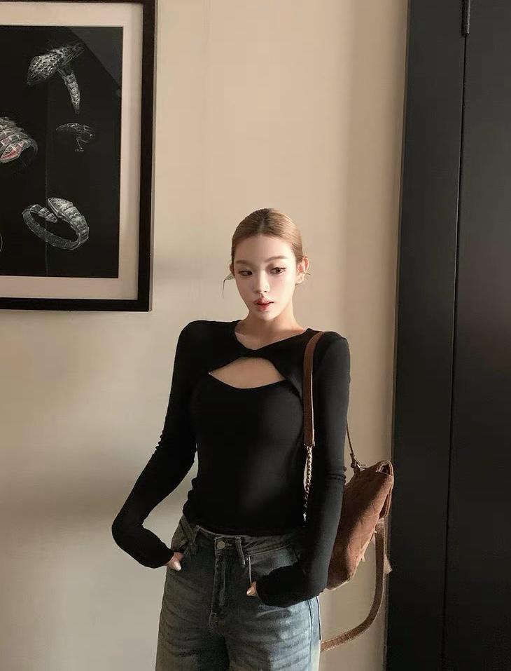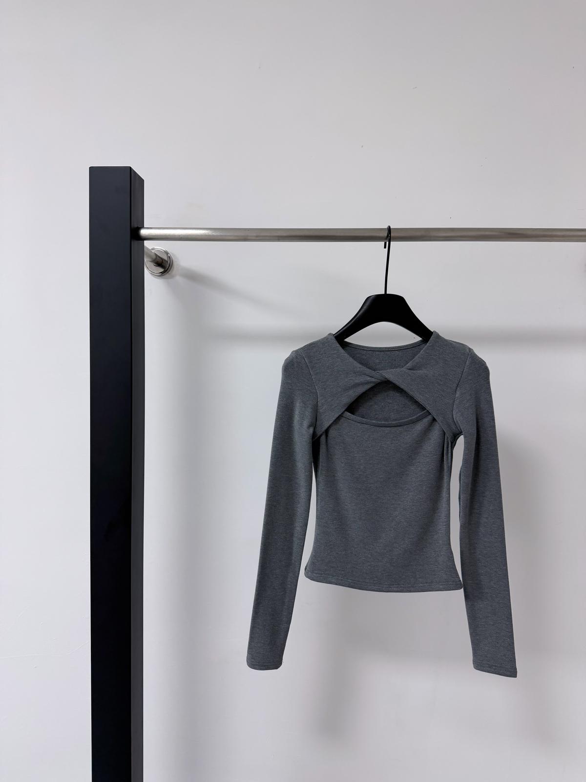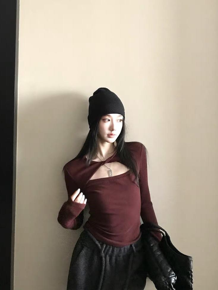 【C7993】韓系小衆設計感鏤空扭結解構設計加絨修身顯瘦長袖小衫