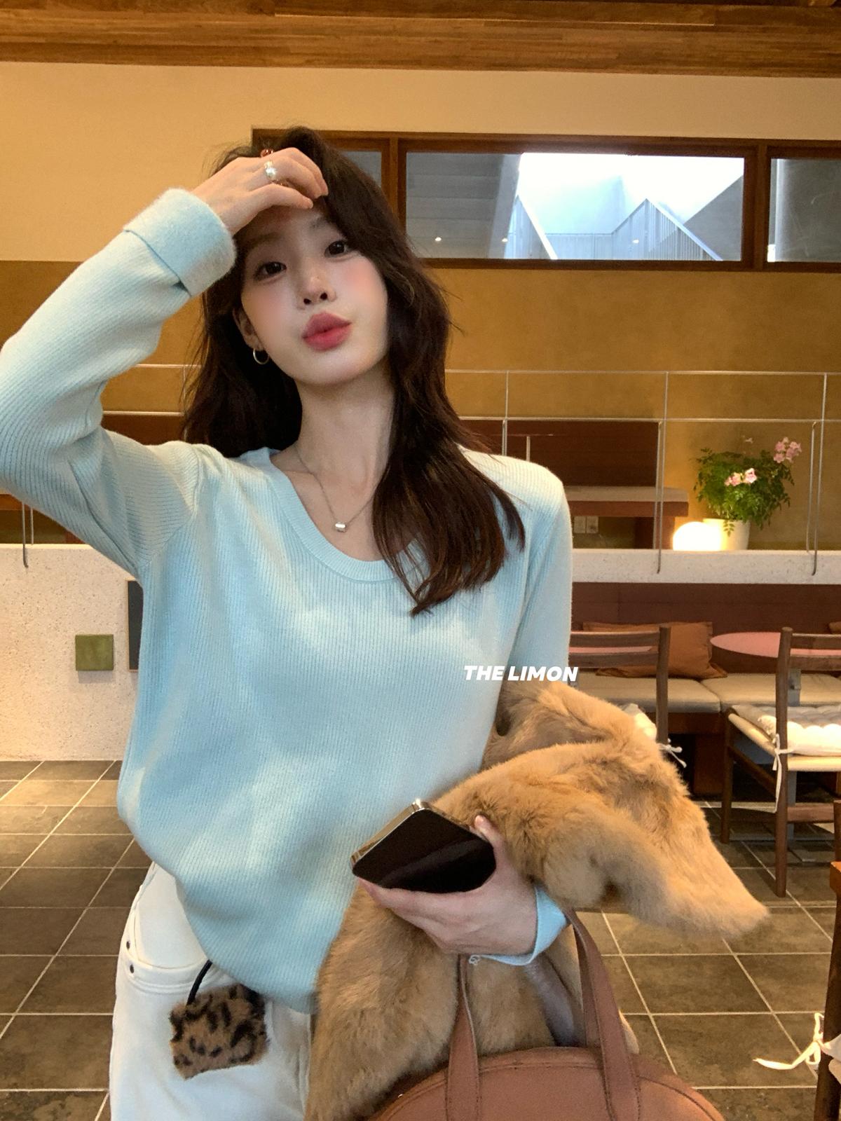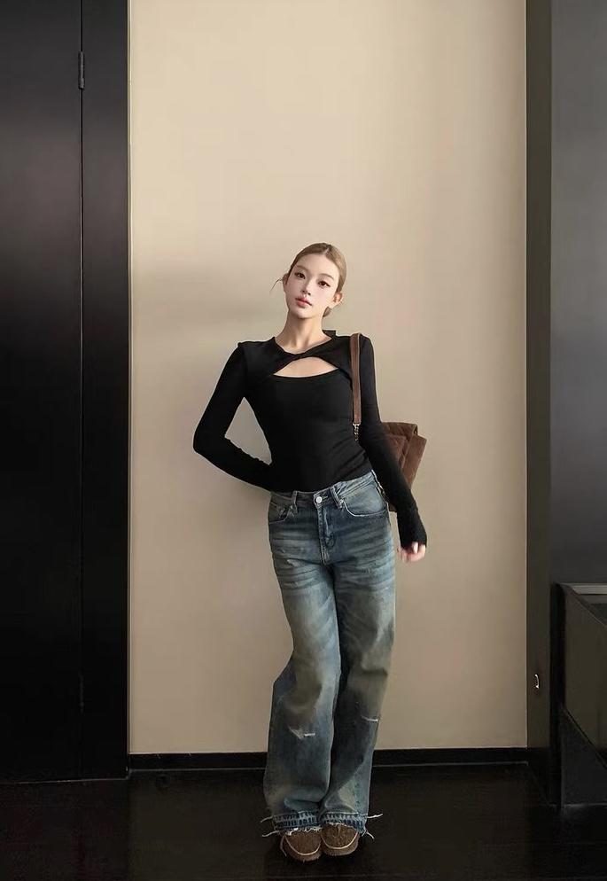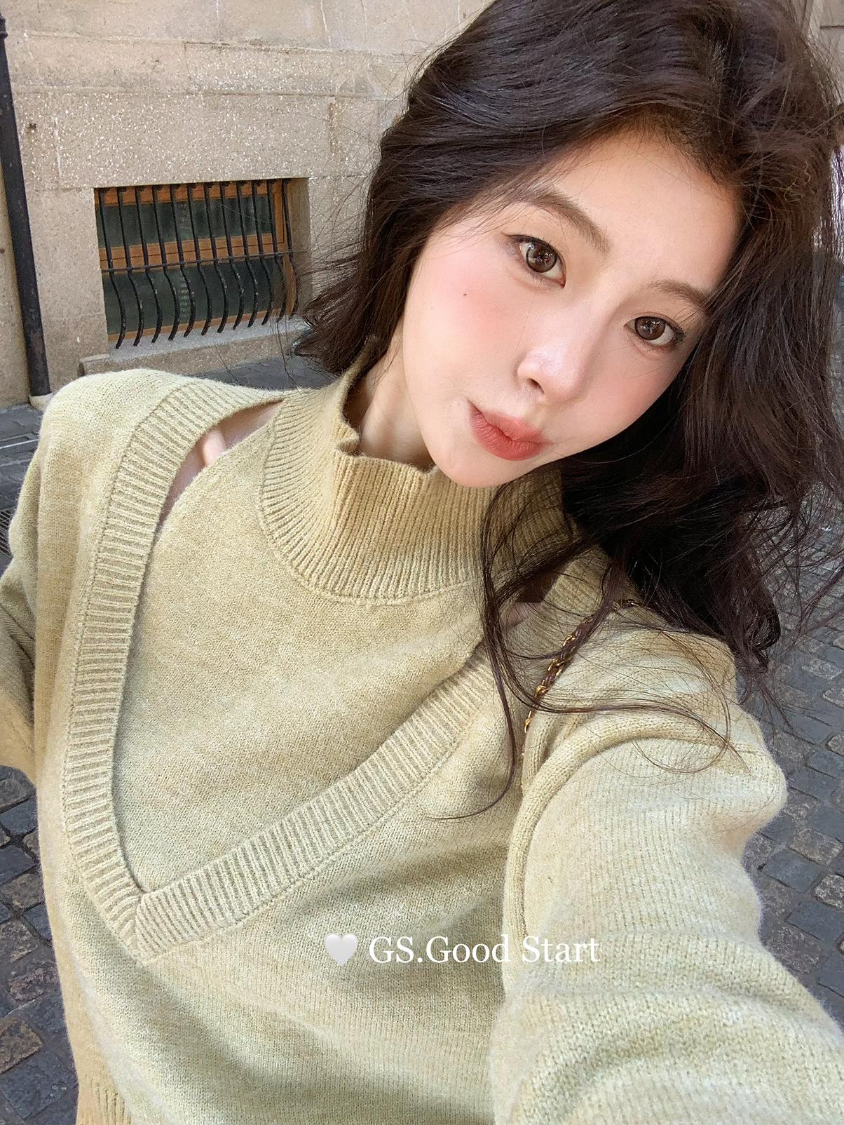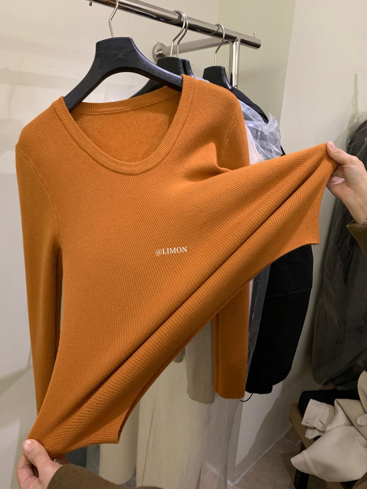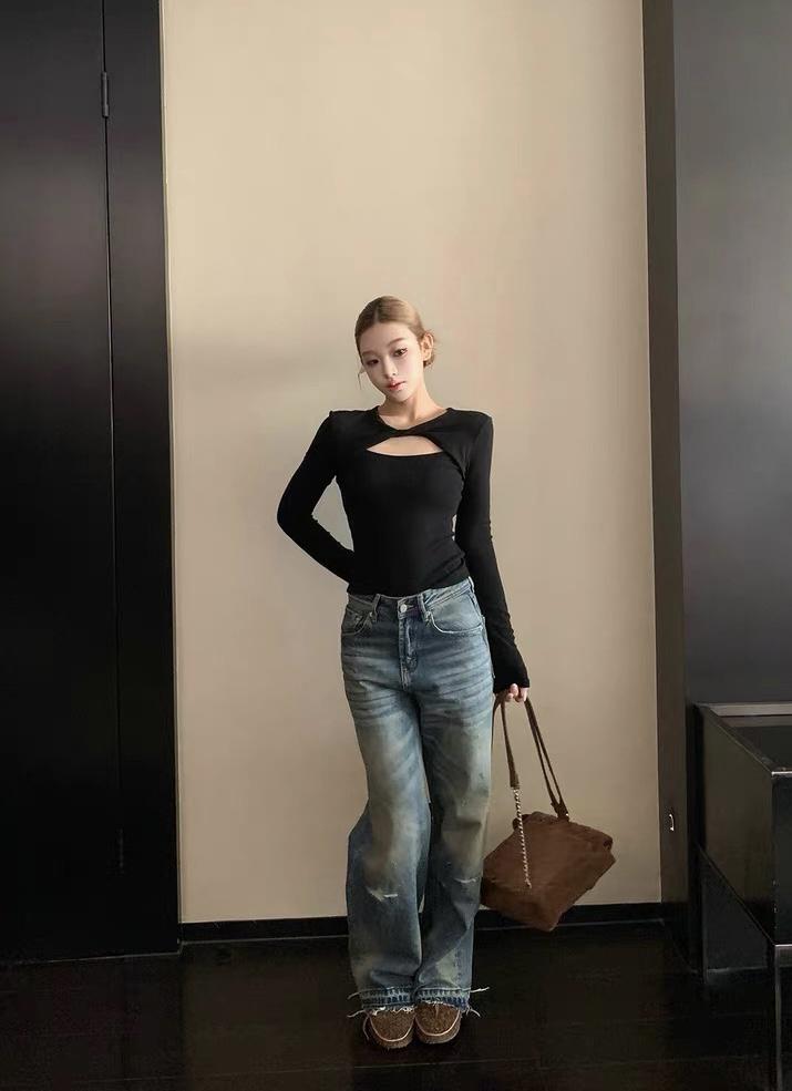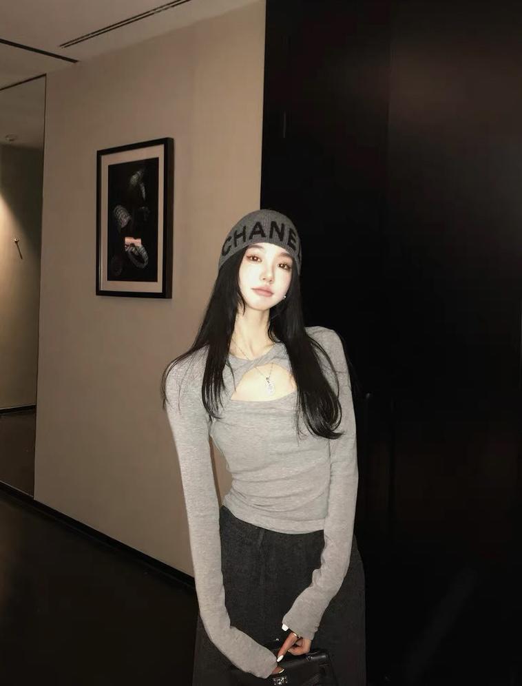 【C7993】韓系小衆設計感鏤空扭結解構設計加絨修身顯瘦長袖小衫