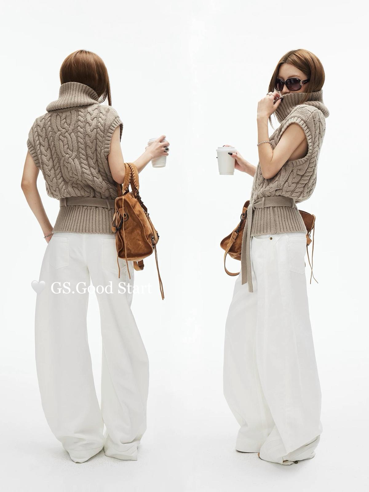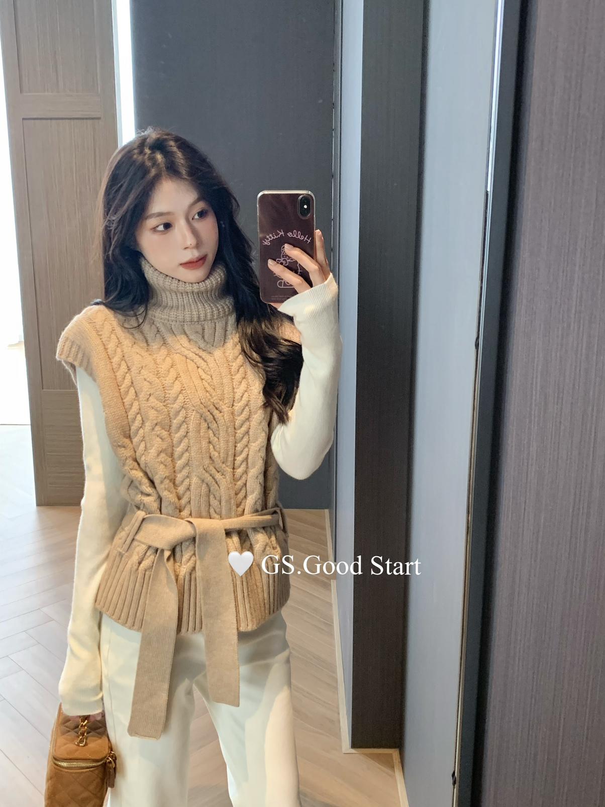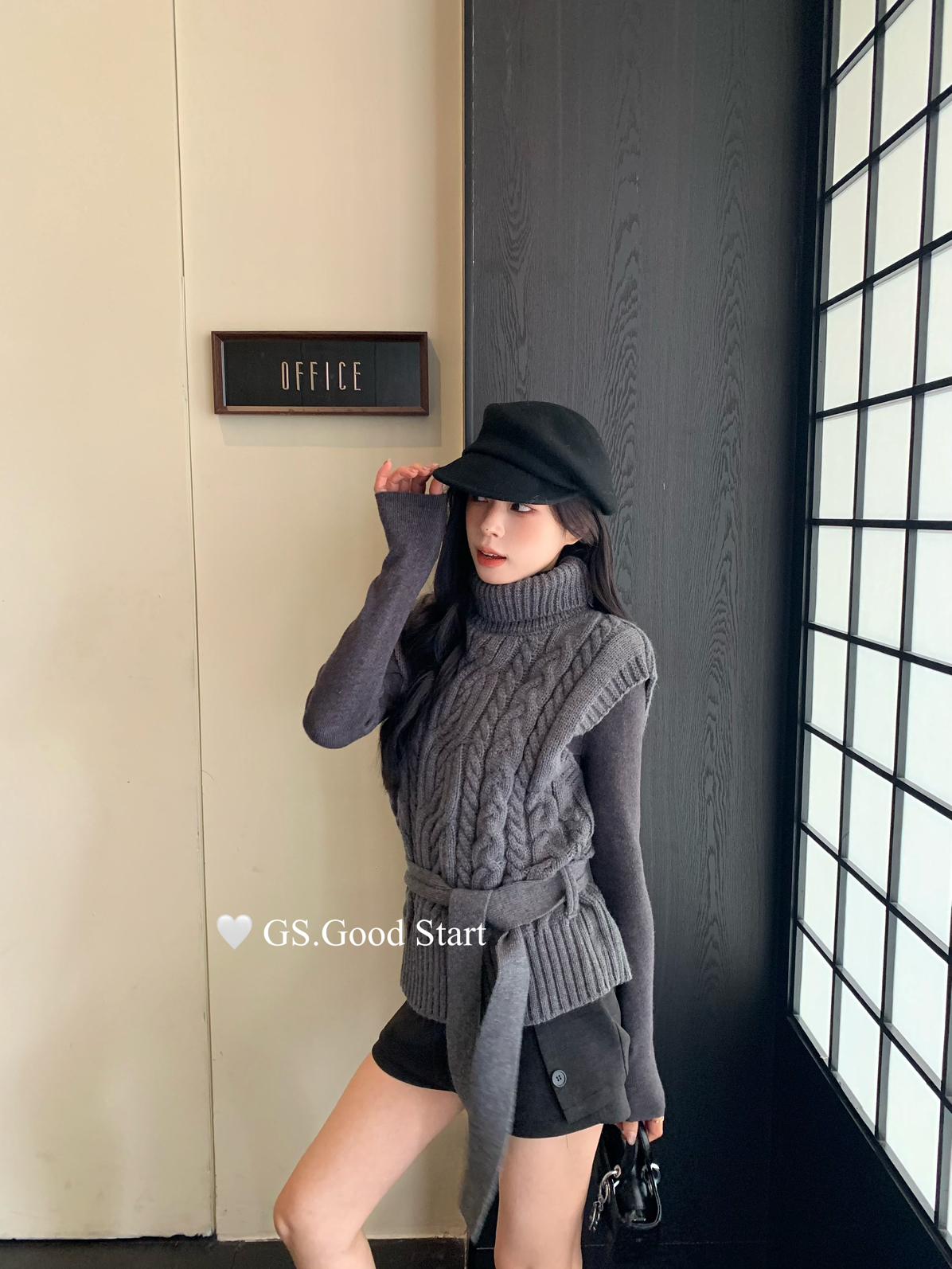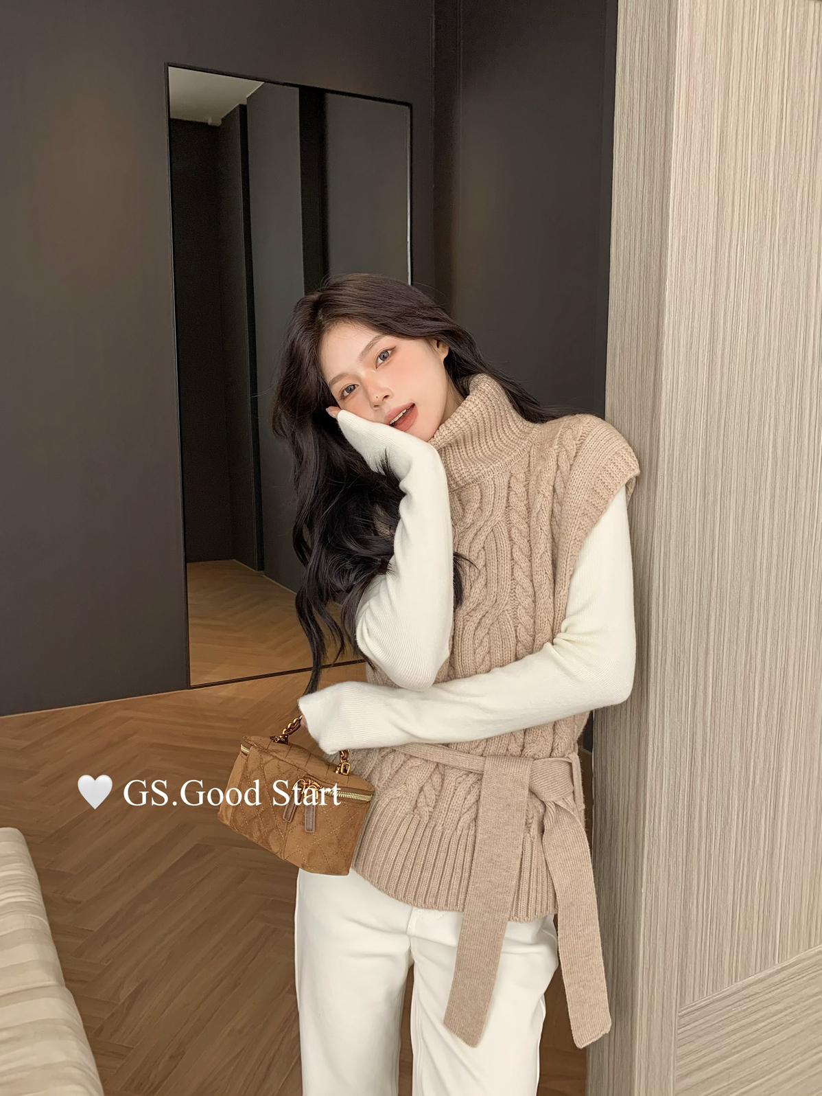 【C7941】自帶復古慵懶感~很藏肉*自留強推!秋冬氣質高智感高領麻花針織背心(配可拆卸綁帶)