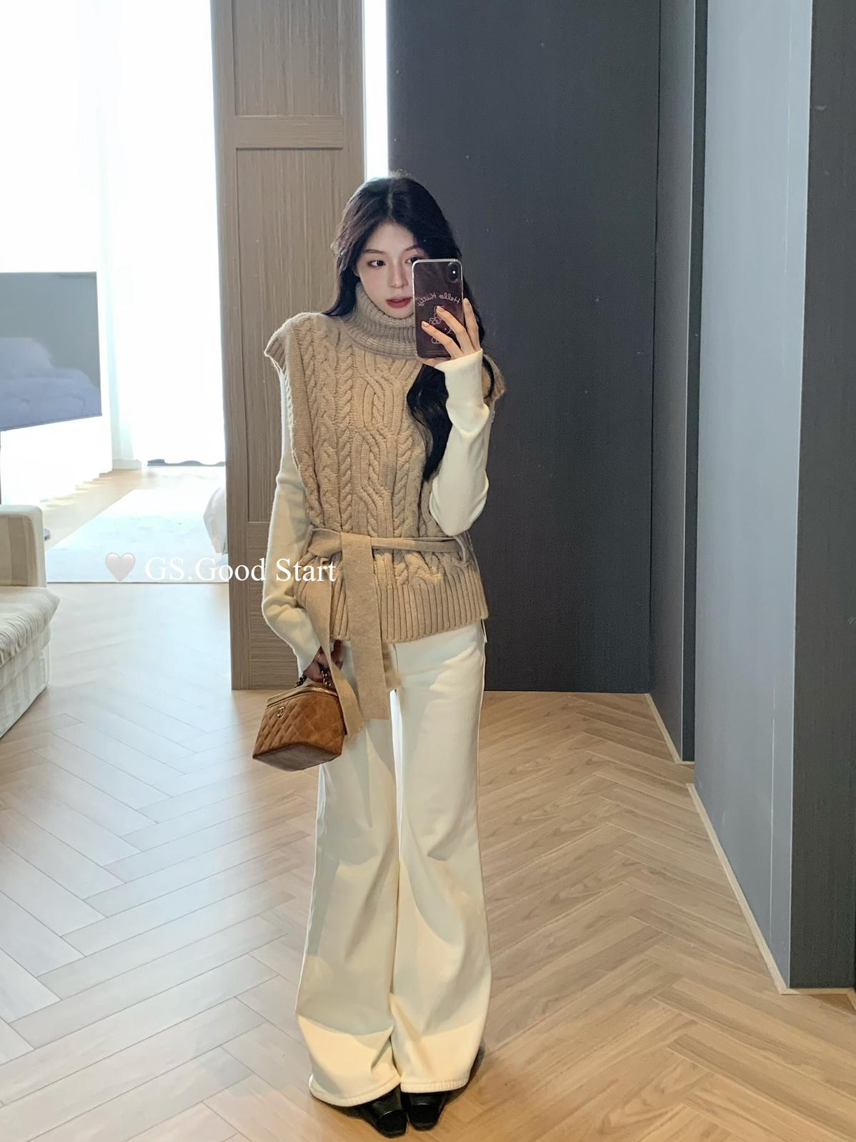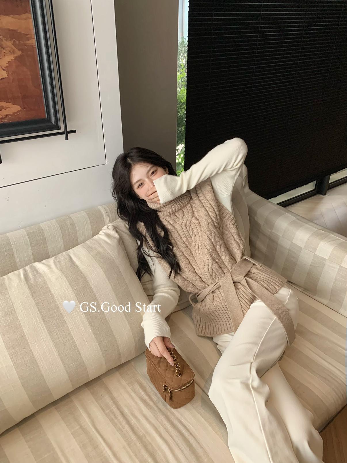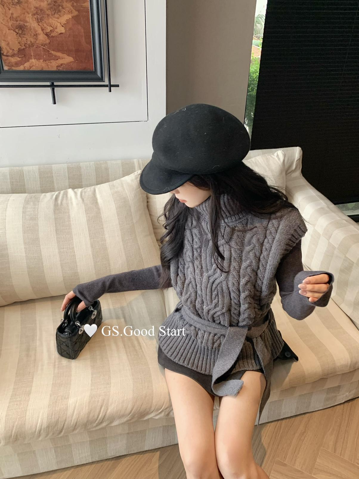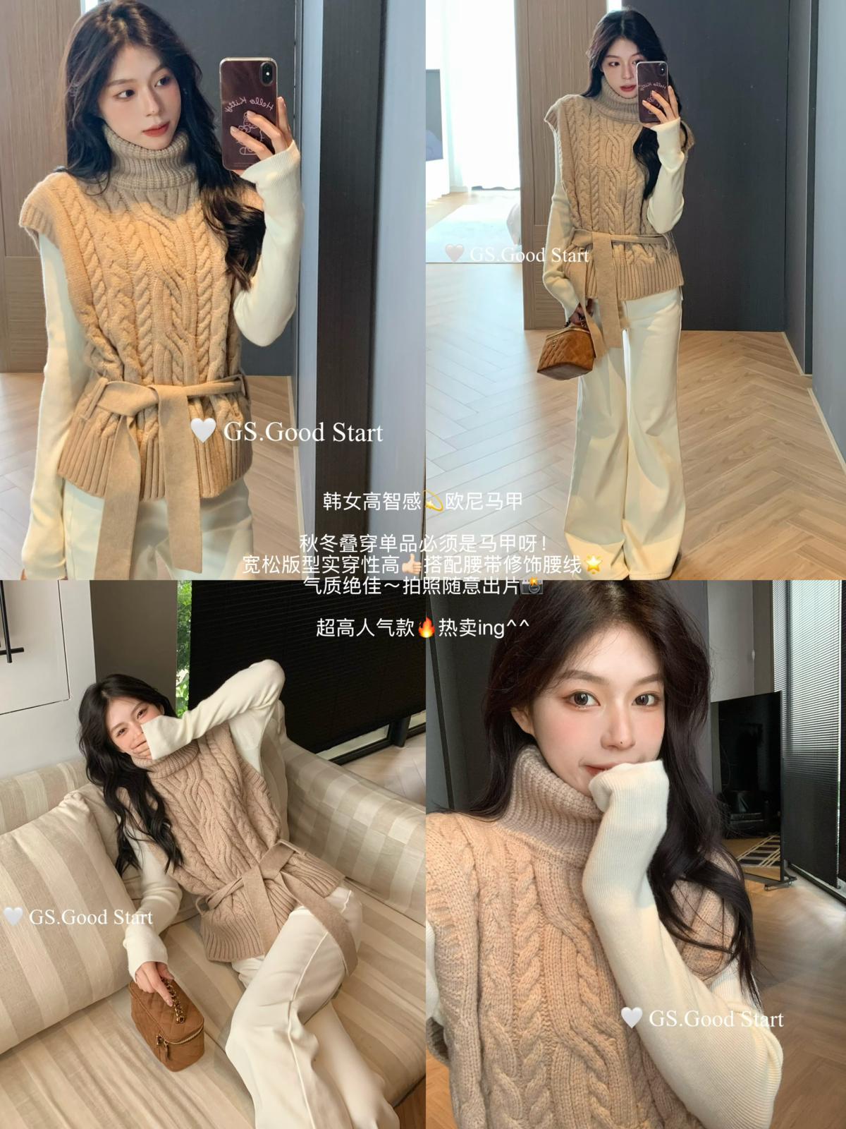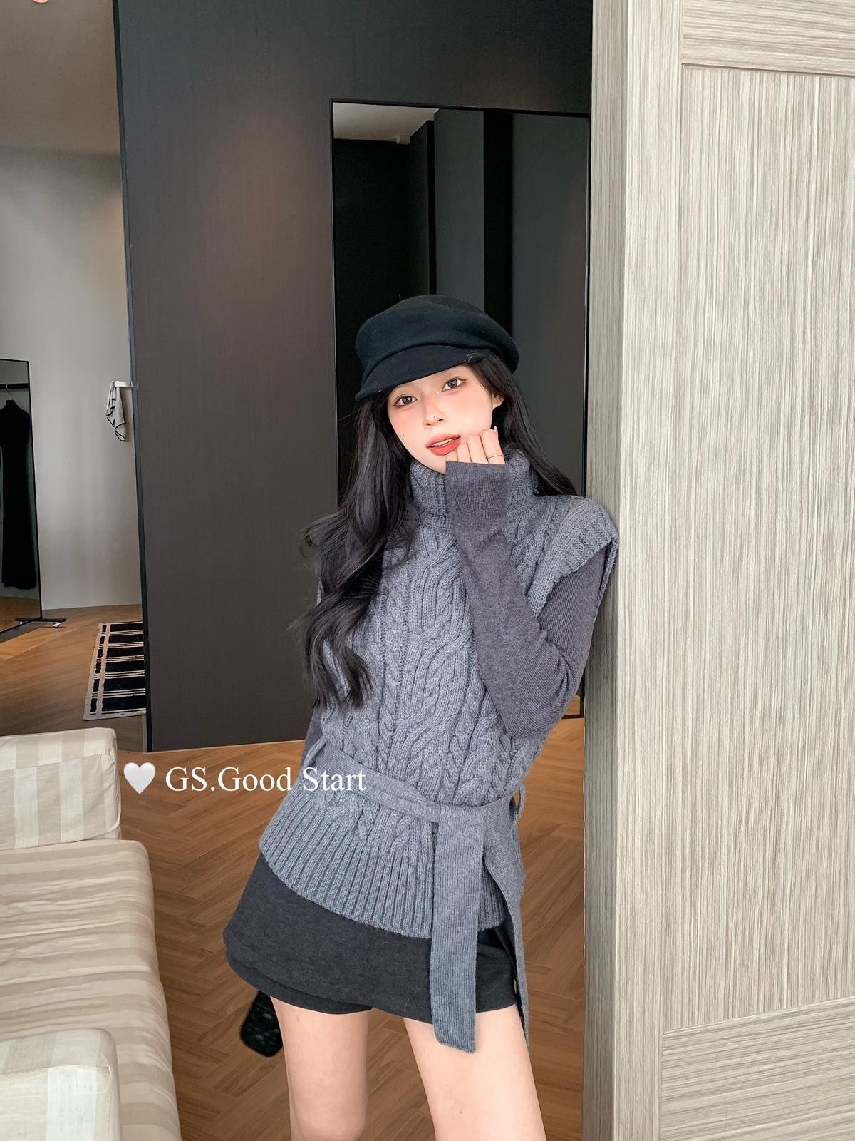 【C7941】自帶復古慵懶感~很藏肉*自留強推!秋冬氣質高智感高領麻花針織背心(配可拆卸綁帶)