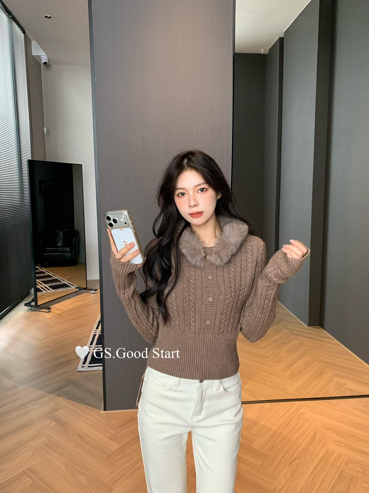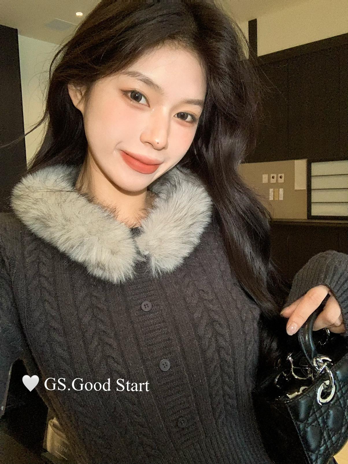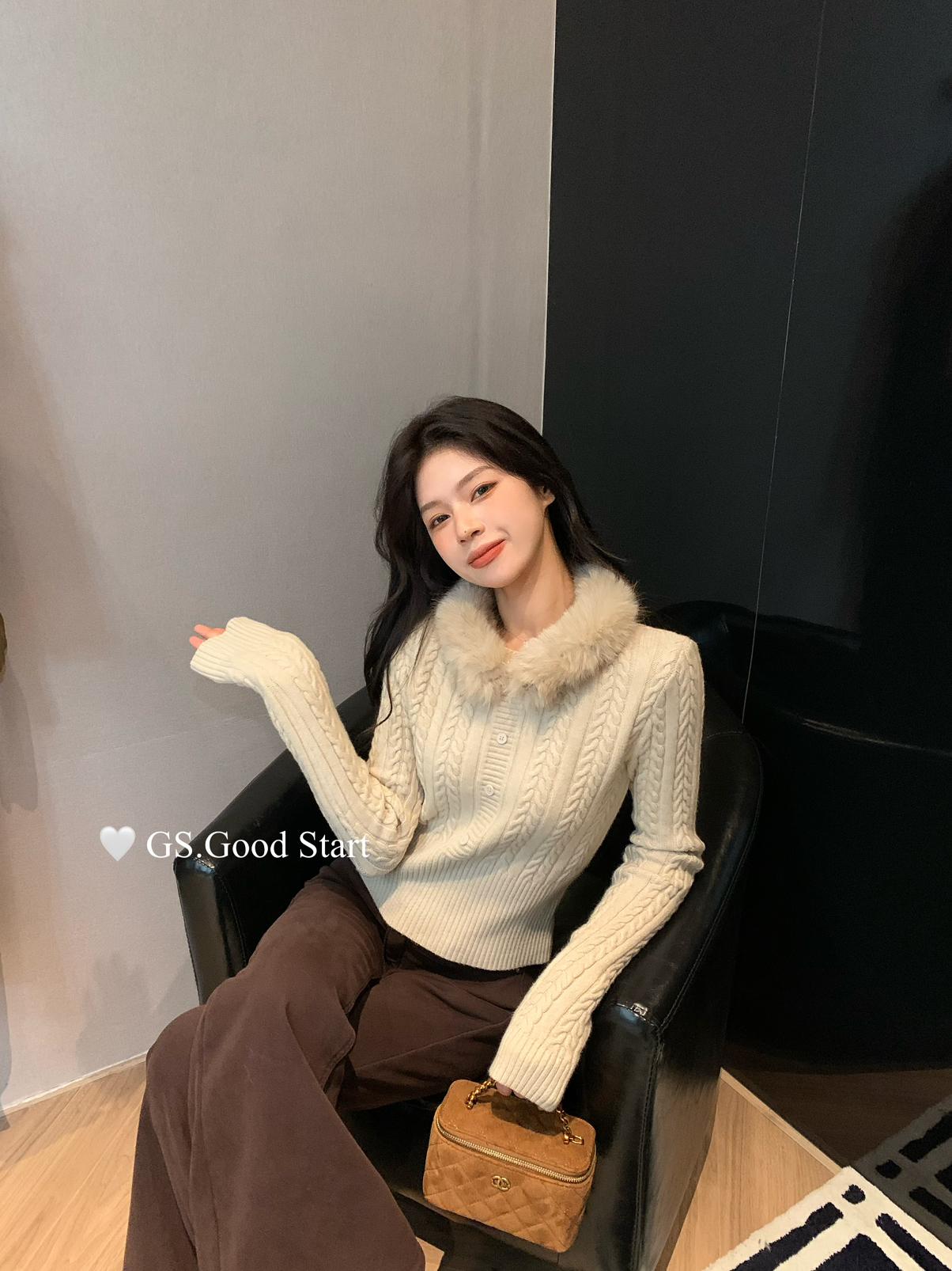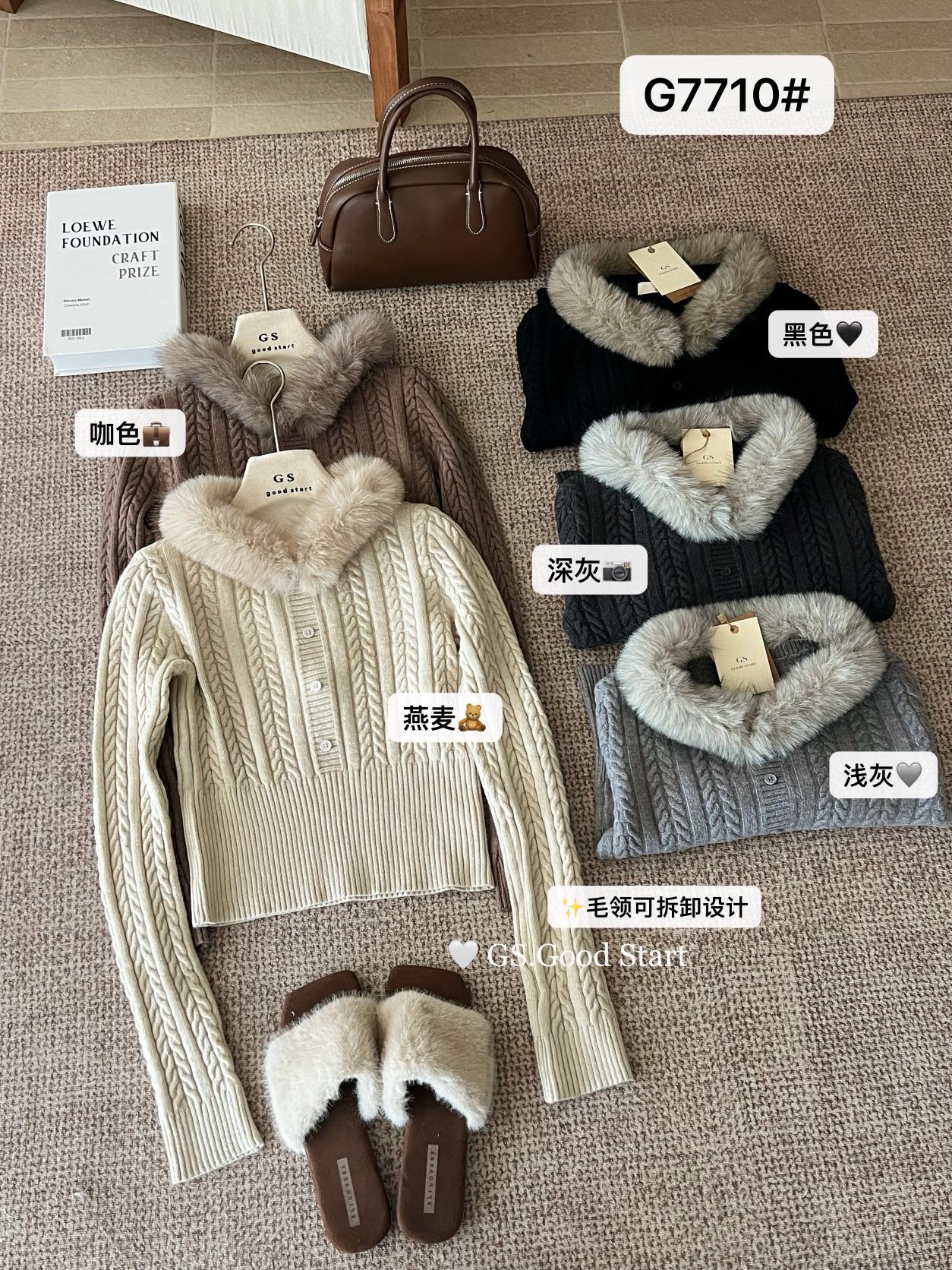 【C7942】被問爆啦~高顏時髦選手*全店自留!秋冬復古純欲毛毛領麻花針織小衫(配可拆卸毛領)